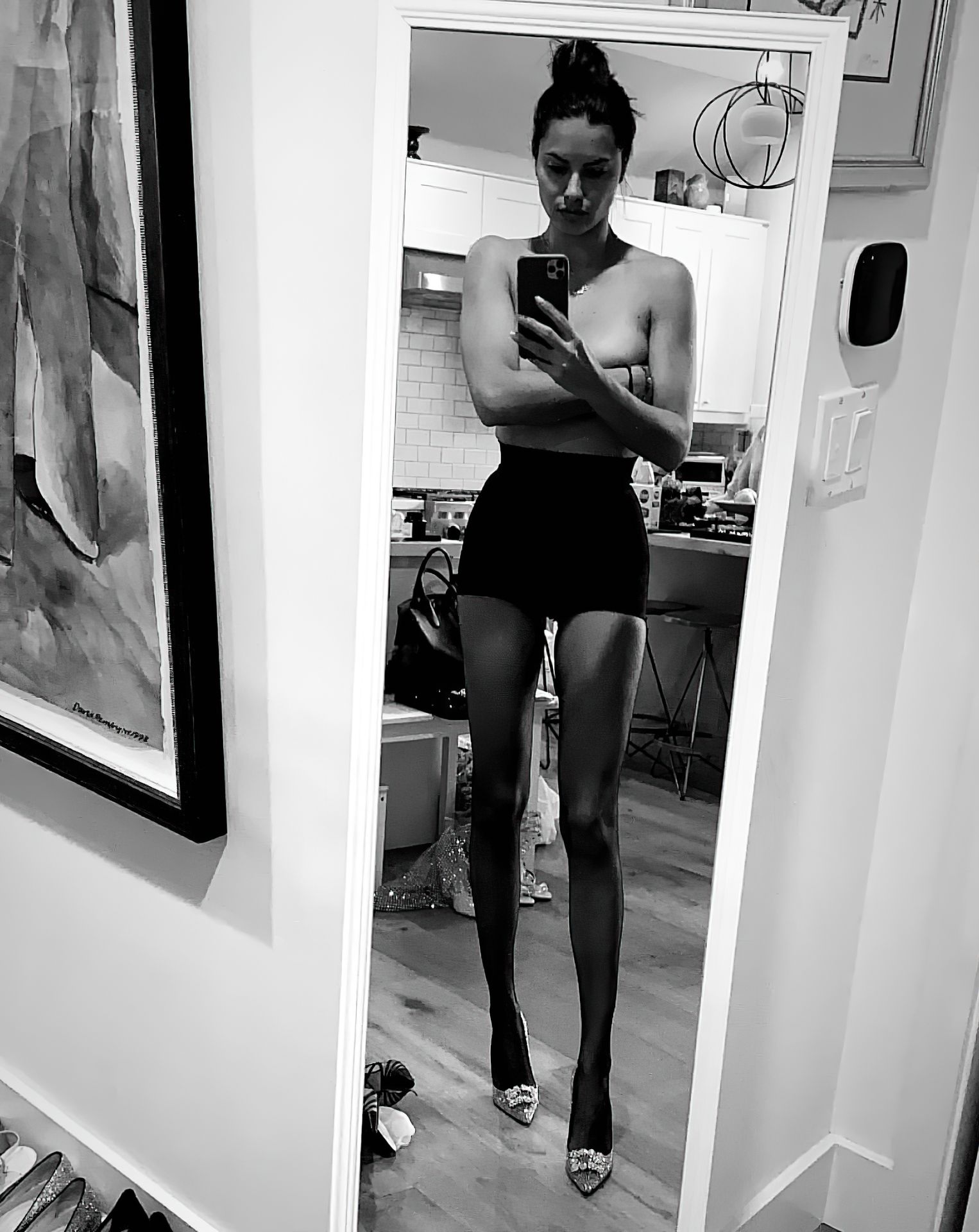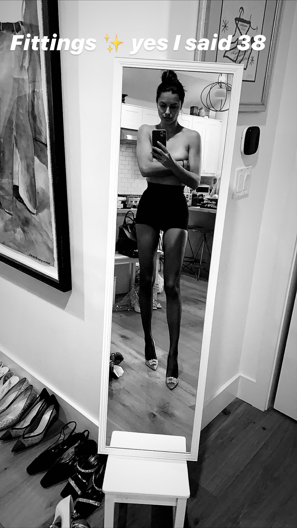 Former VS model Adriana Lima showed off her tits slightly covered with hand in front of mirror during fitting – Instagram, 02/08/2020.