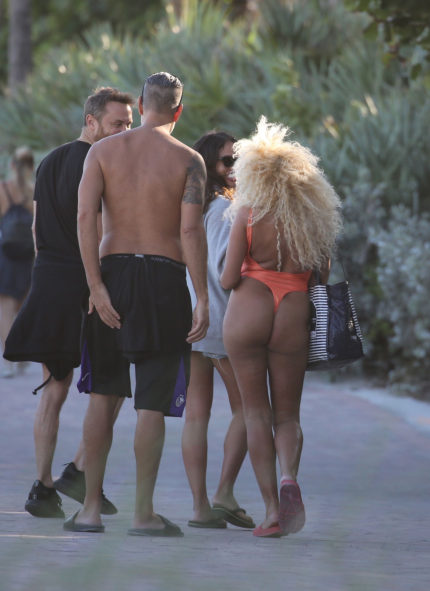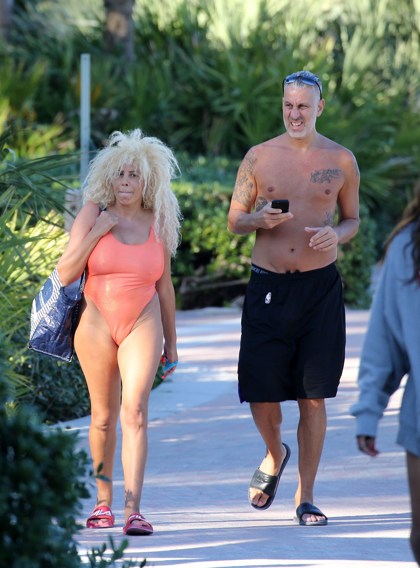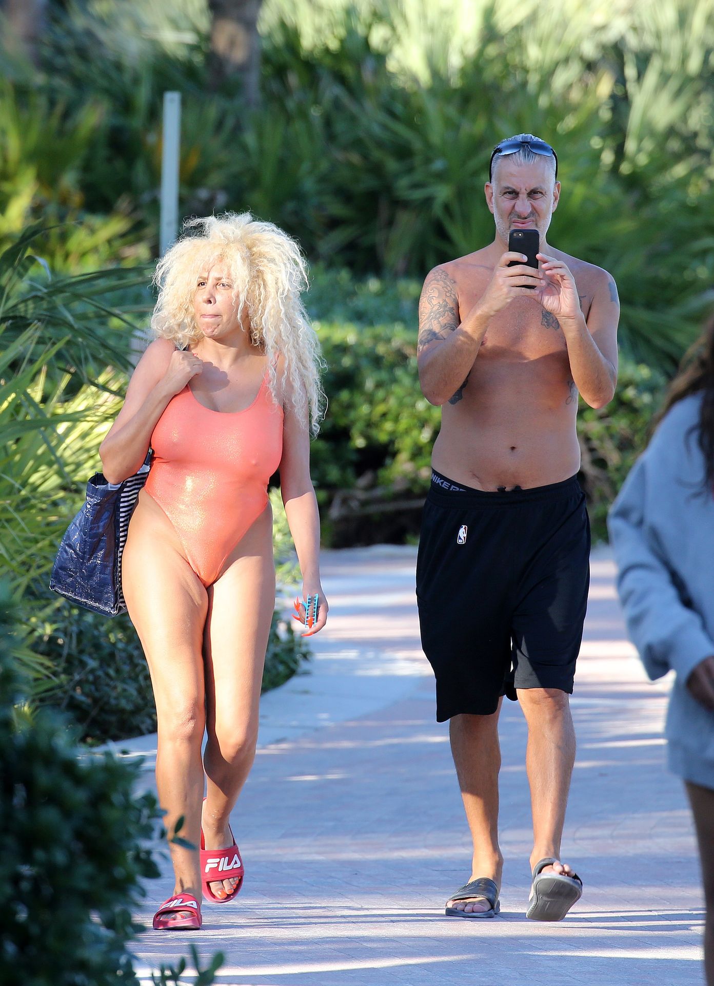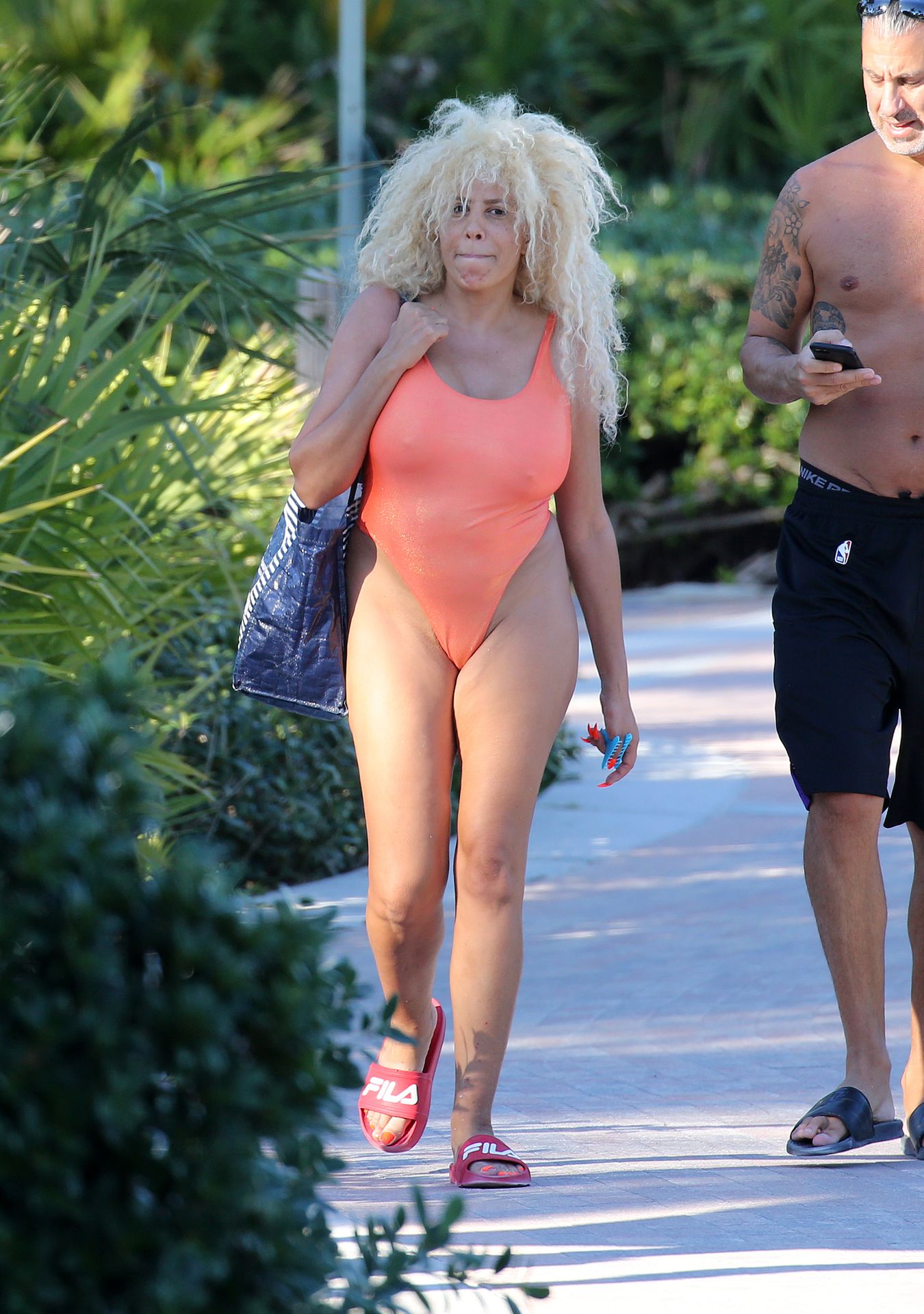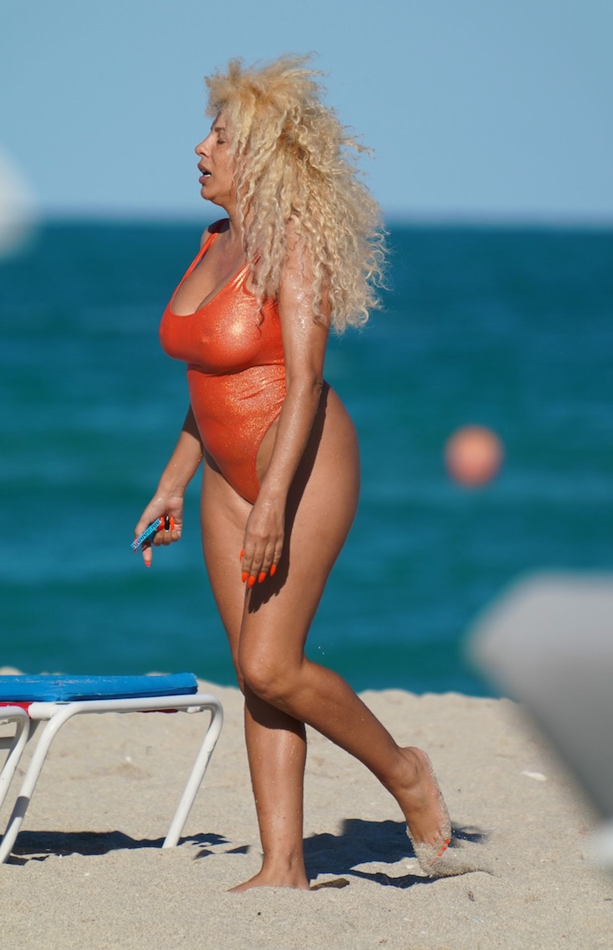 French/American singer and television host Afida Turner (42) wears a very revealing neon orange swimsuit as she takes a walk along the beach in Miami, 11/20/2019.