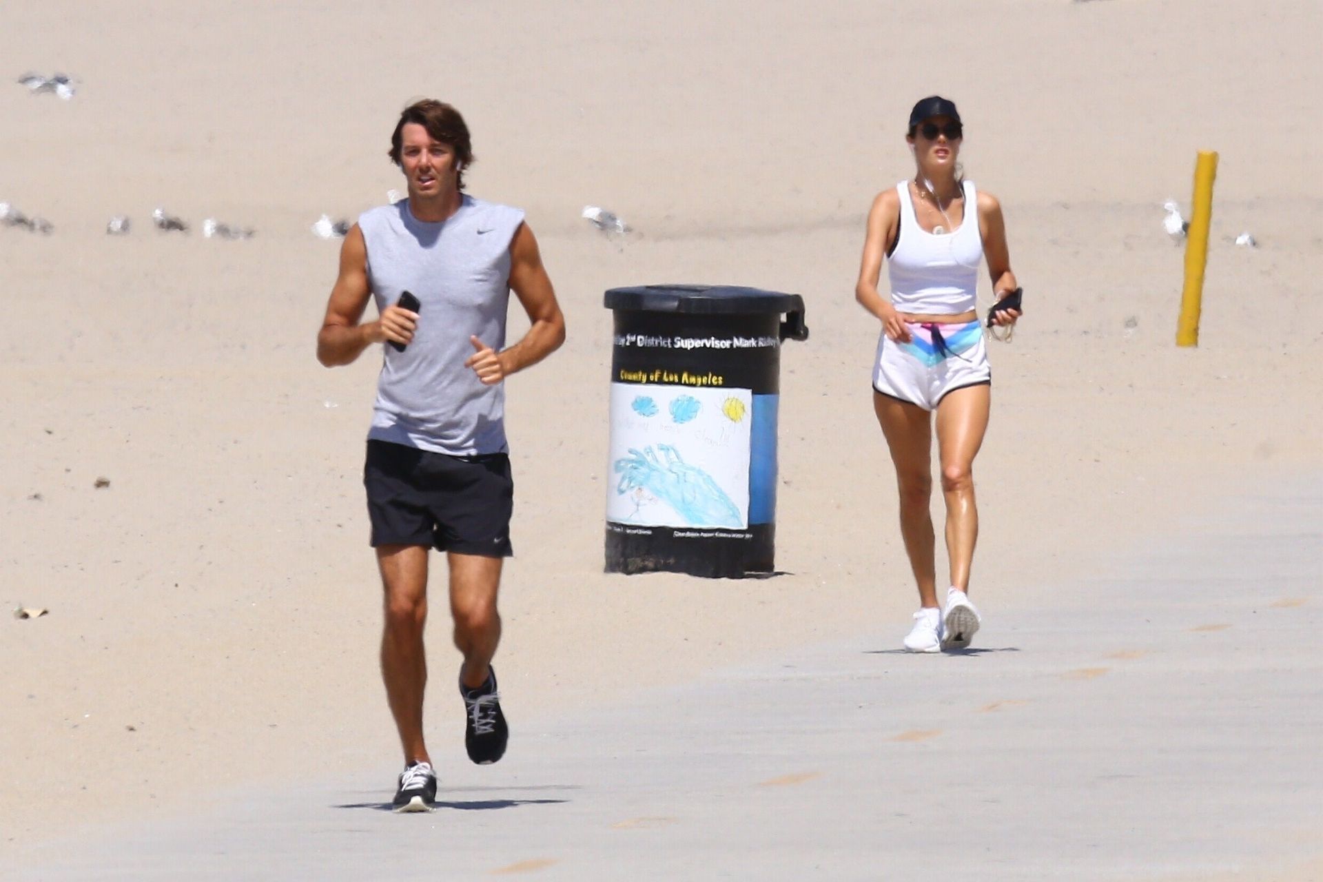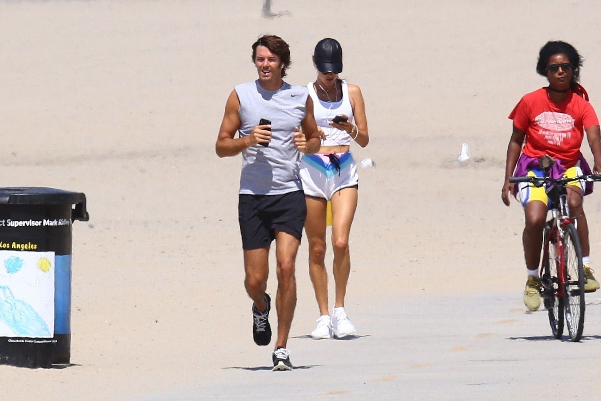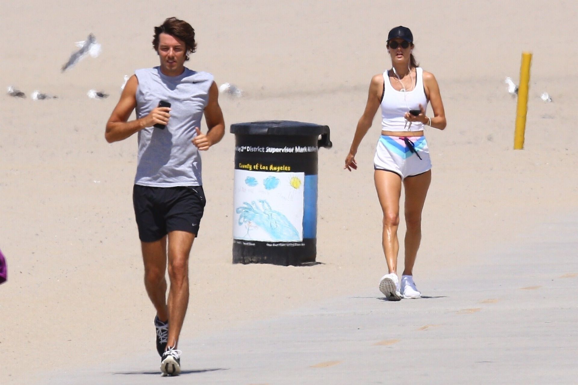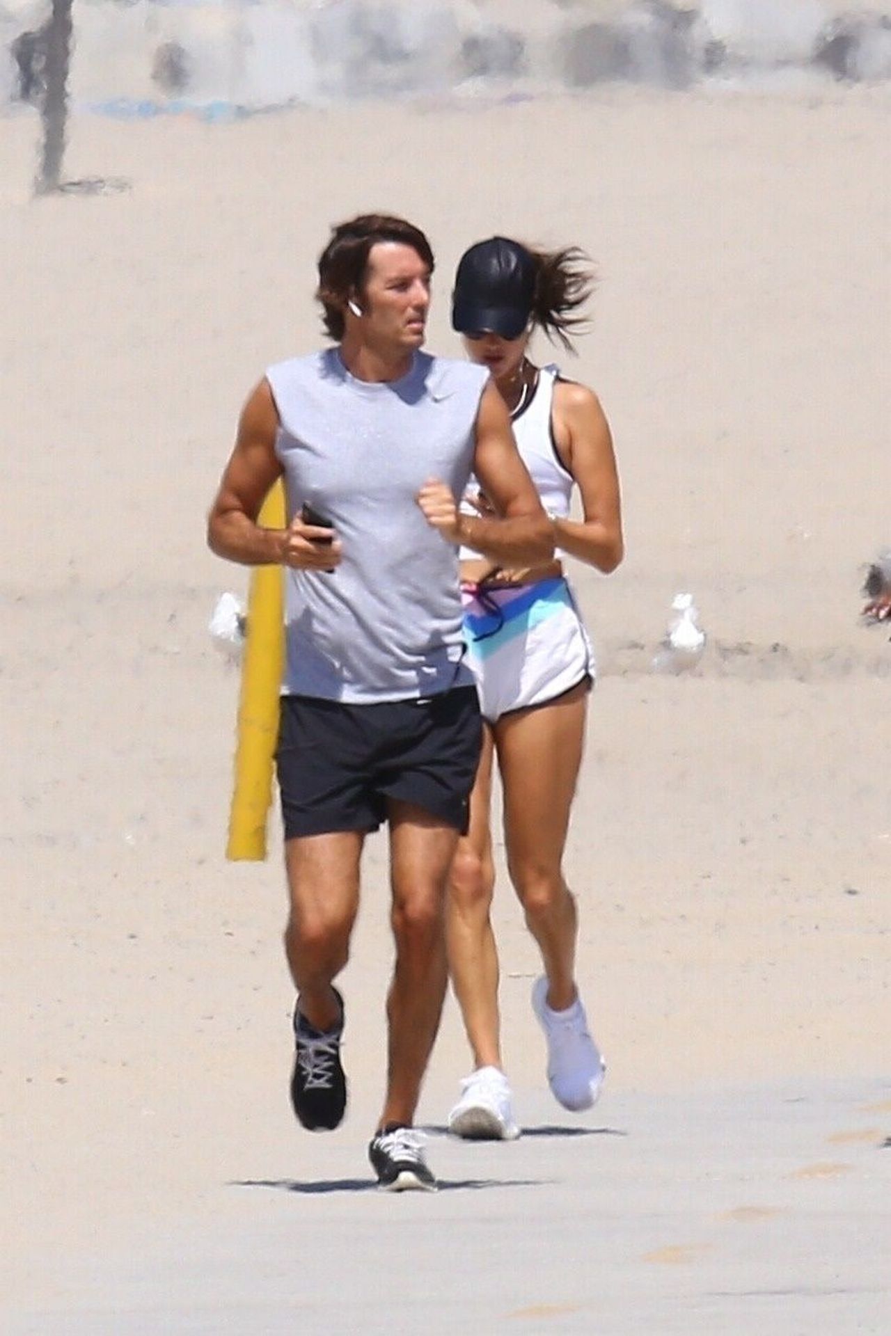Alessandra Ambrosio and her boyfriend Nicolo Oddi go for a jog on the beach together, 08/10/2019. The duo look casual as they enjoy their scenic exercise.