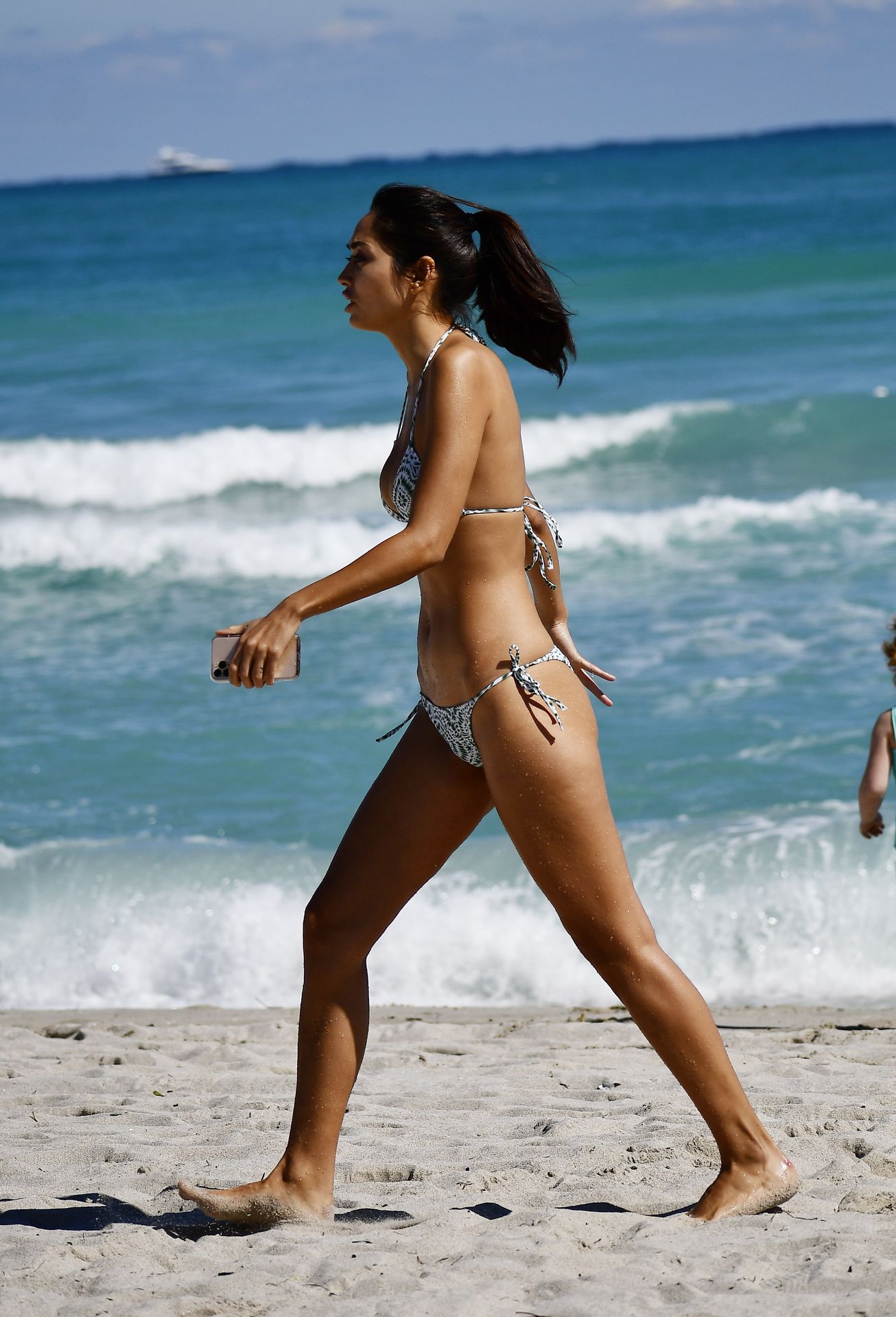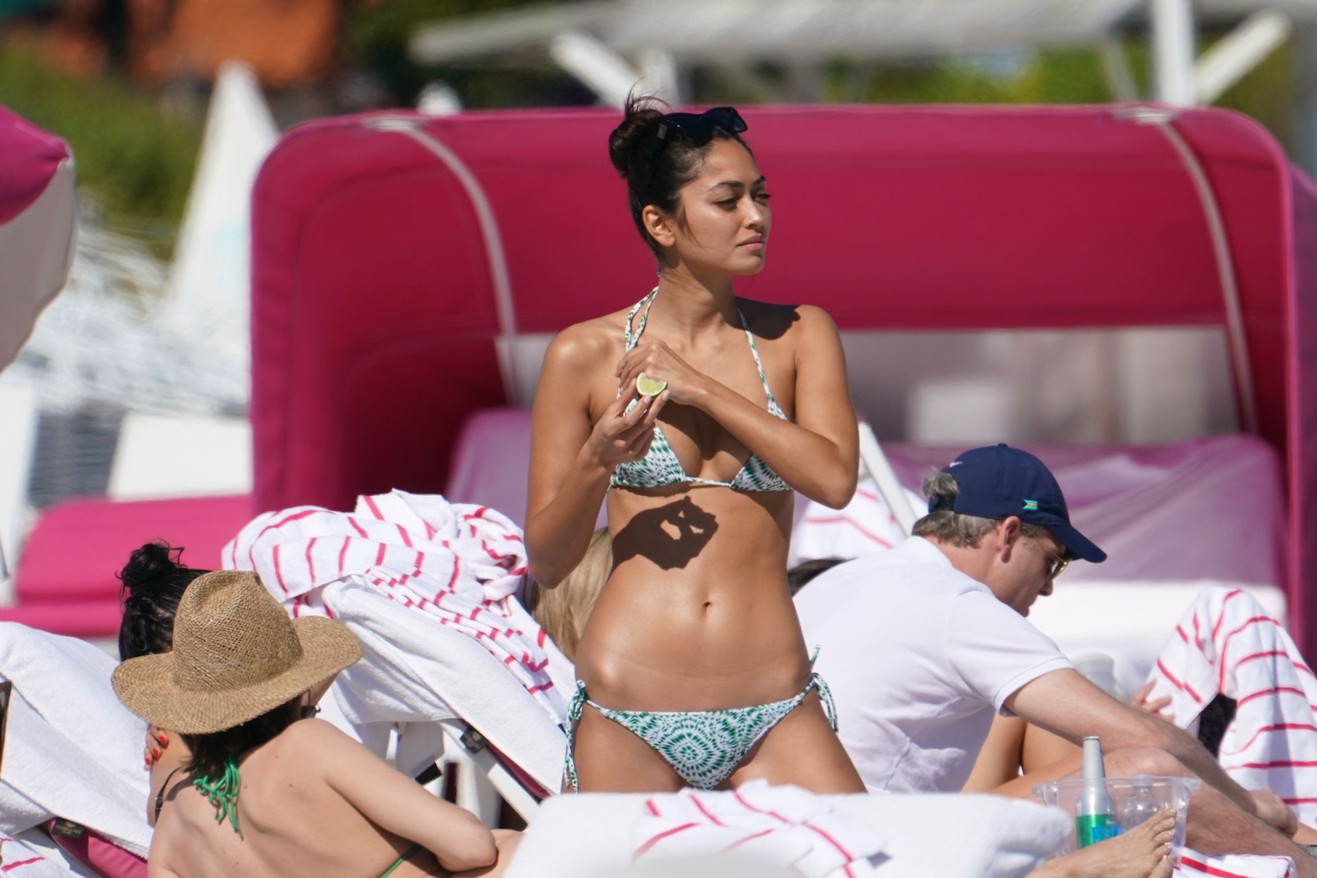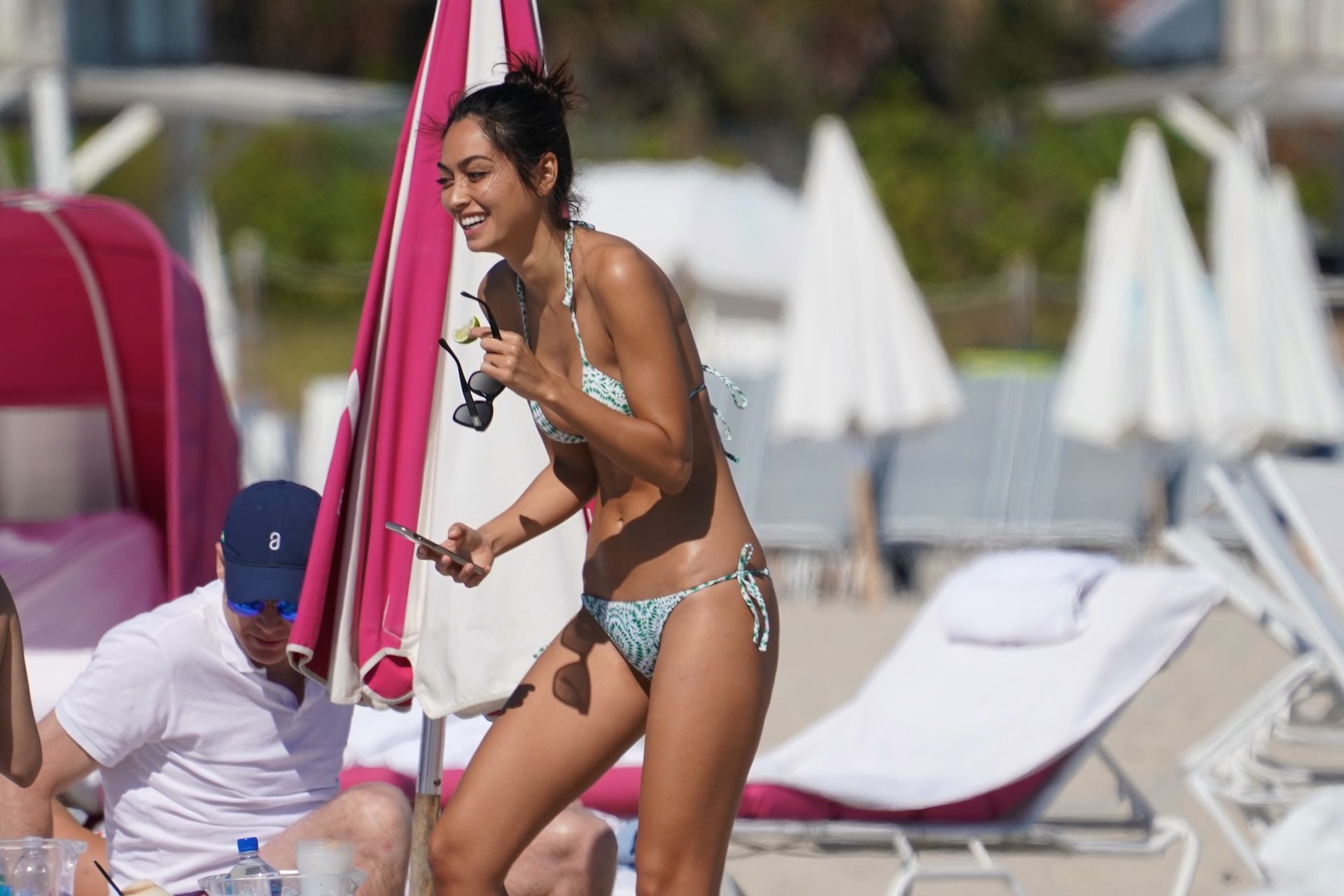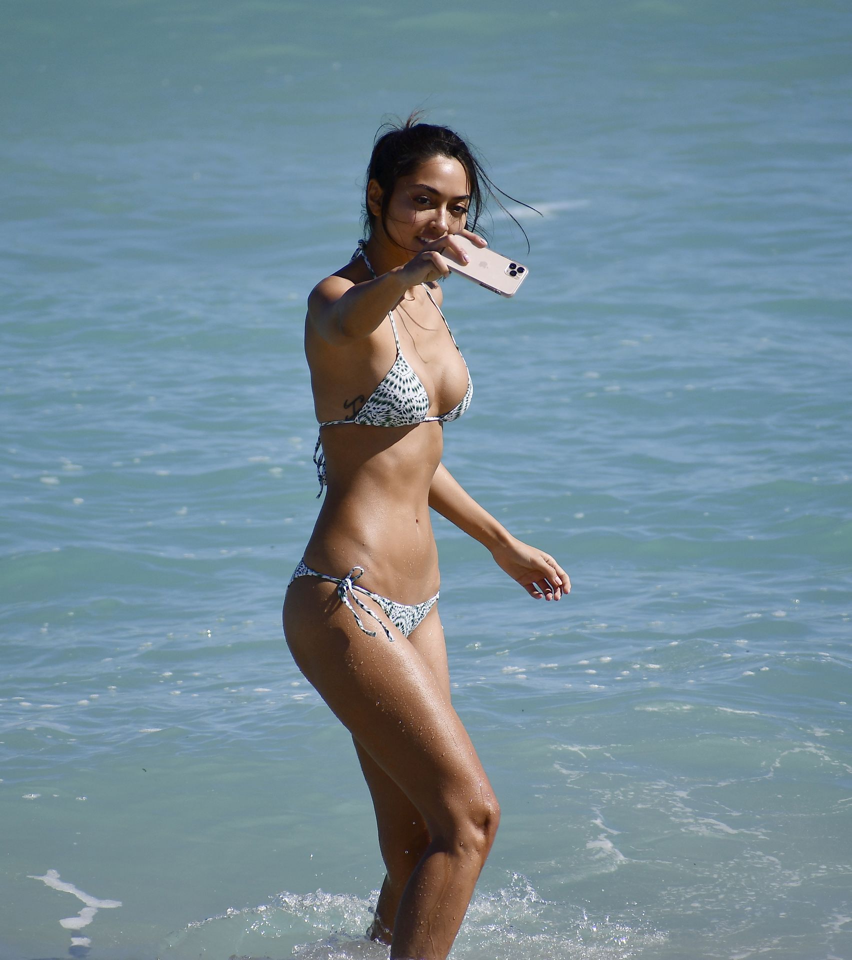 Ambra Gutierrez is spotted frolicking in water with a friend in Miami, 02/02/2020. The 27-year-old Italian model was spotted taking pictures and posing whilst wearing a tiny green and white pattern bikini on Super bowl Sunday.