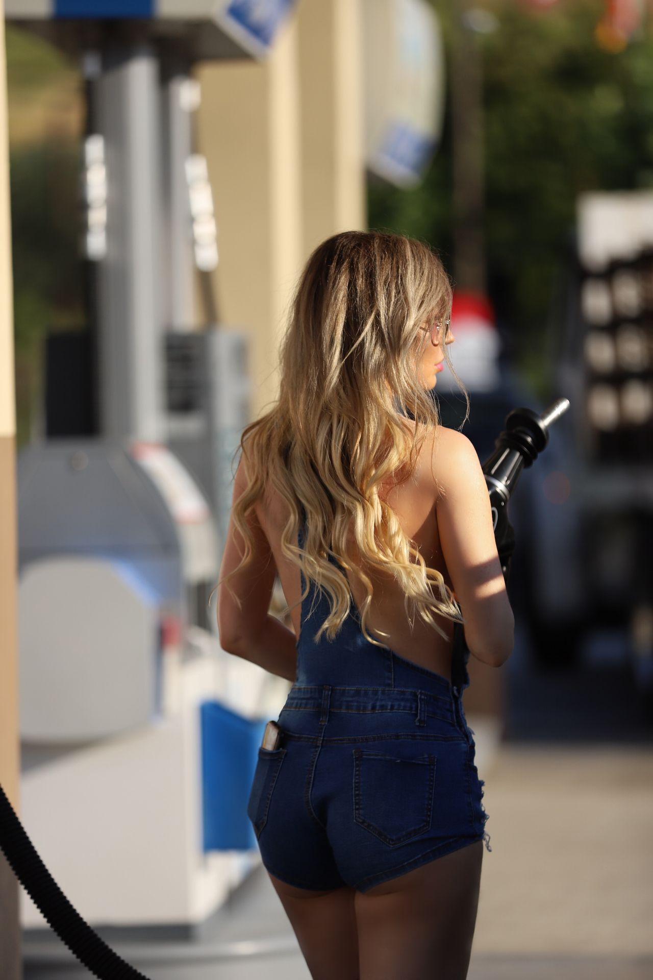 Brazilian Playmate Ana Braga is spotted wearing overalls and nothing else as she fuels up at a gas station in Calabasas, 09/10/2019.
