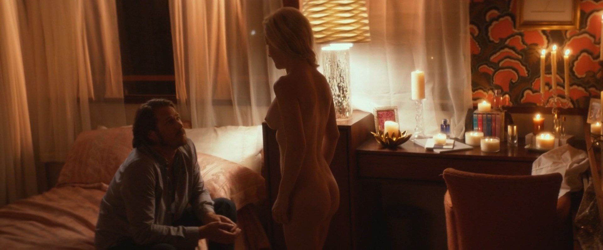 The blonde is undressing, so you first see her bare shoulders, followed by a naked look from the side as a man looks at her while she stands by a bed. You see her left tit and bare butt, and after a bit, the man stands up to kiss her before turning her and laying her down on the bed with him.