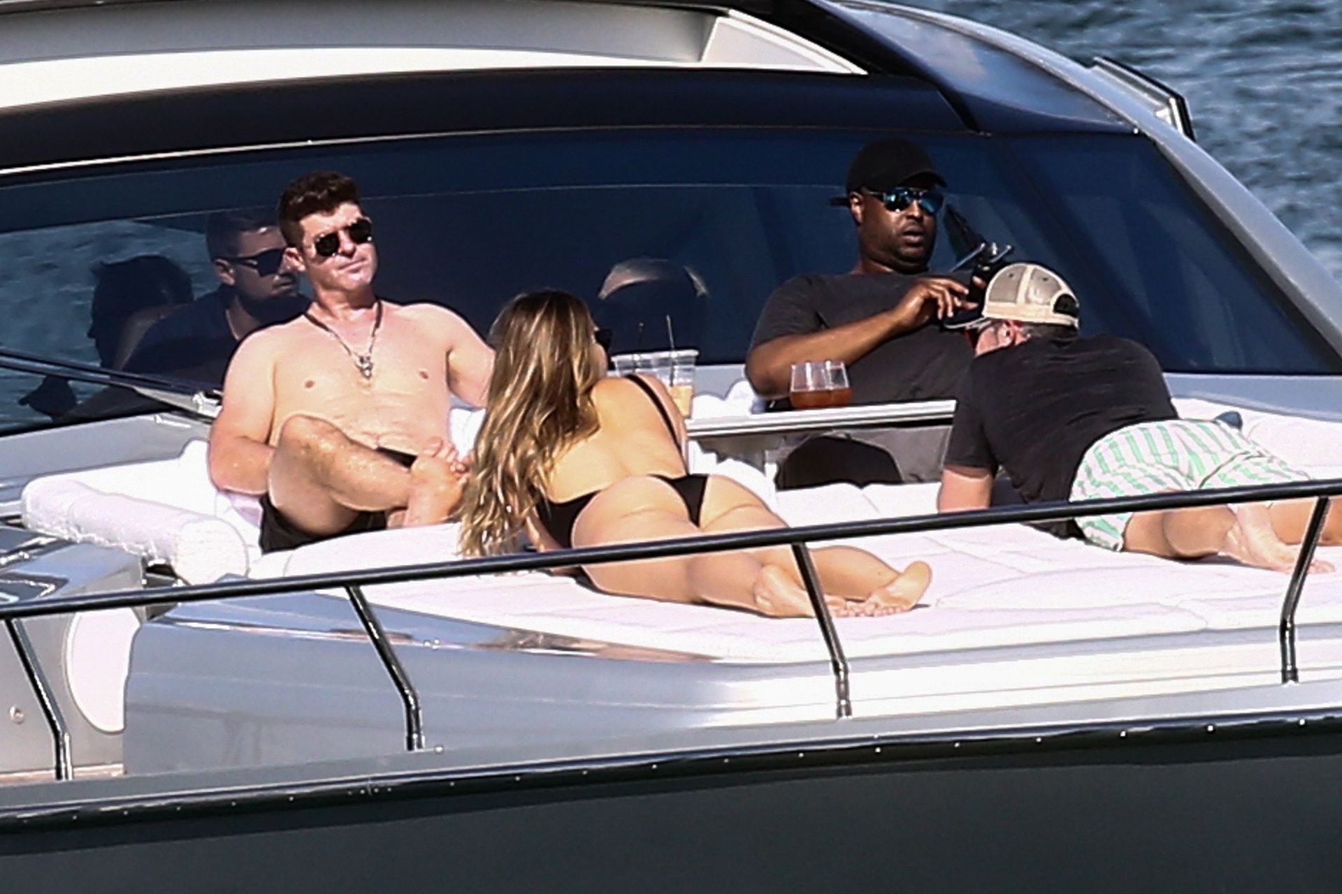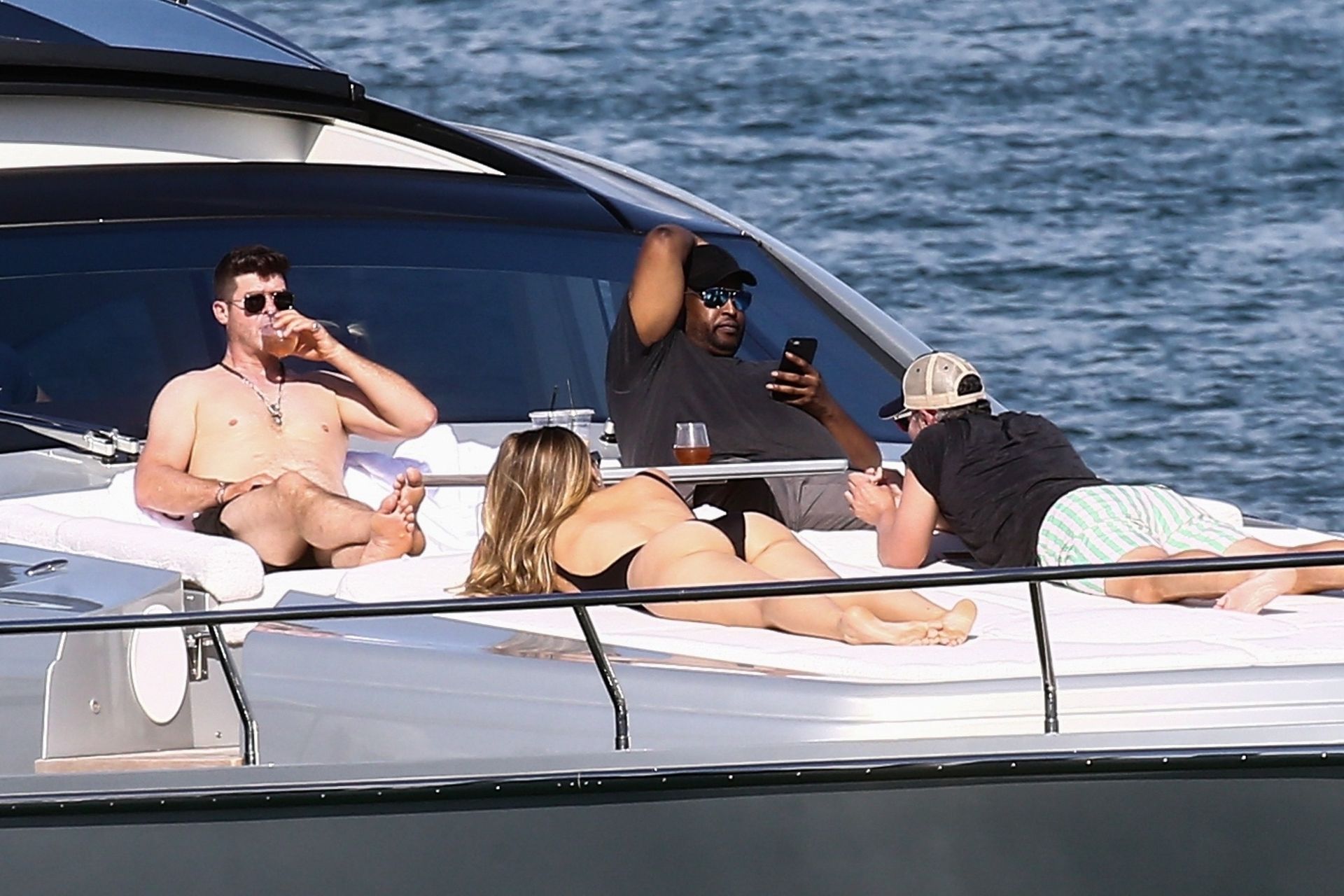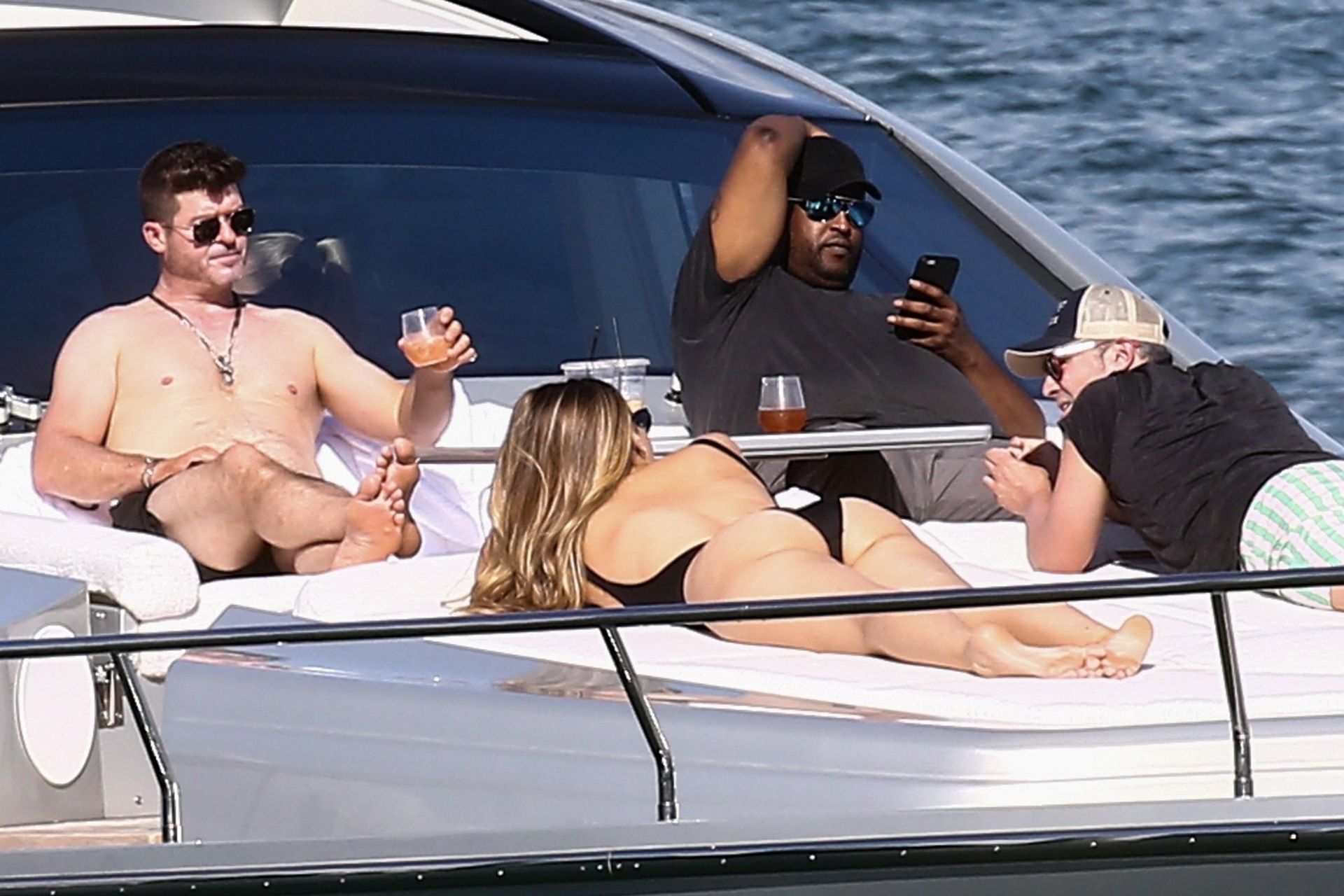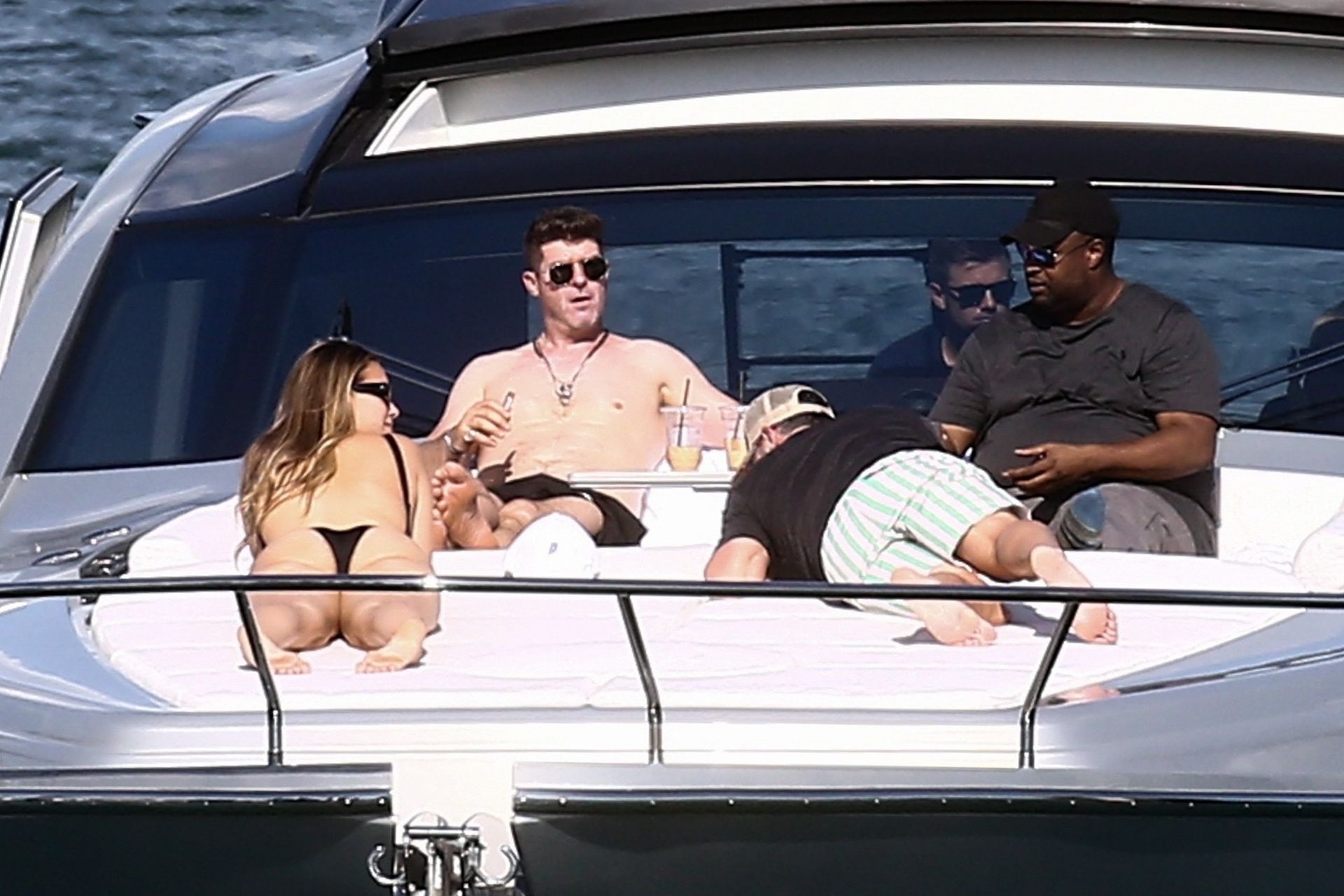 Crooner Robin Thicke and his sexy blonde, April Love Geary, are tanning it up on a yacht with friends while holidaying in Miami, 11/22/2019.