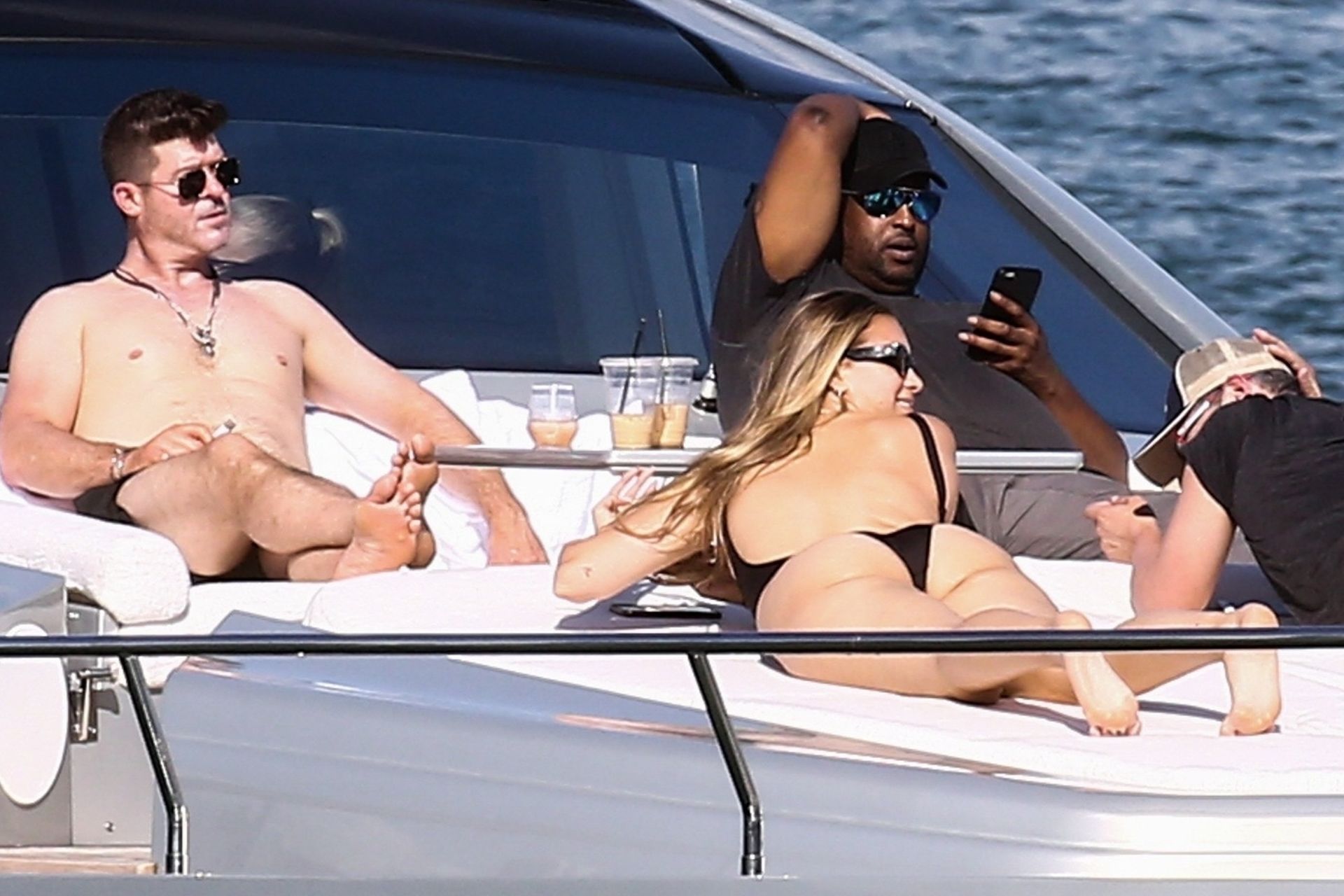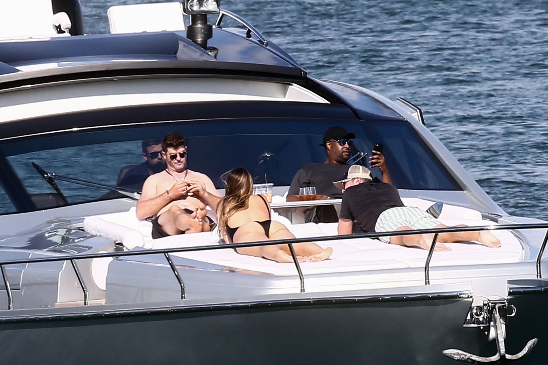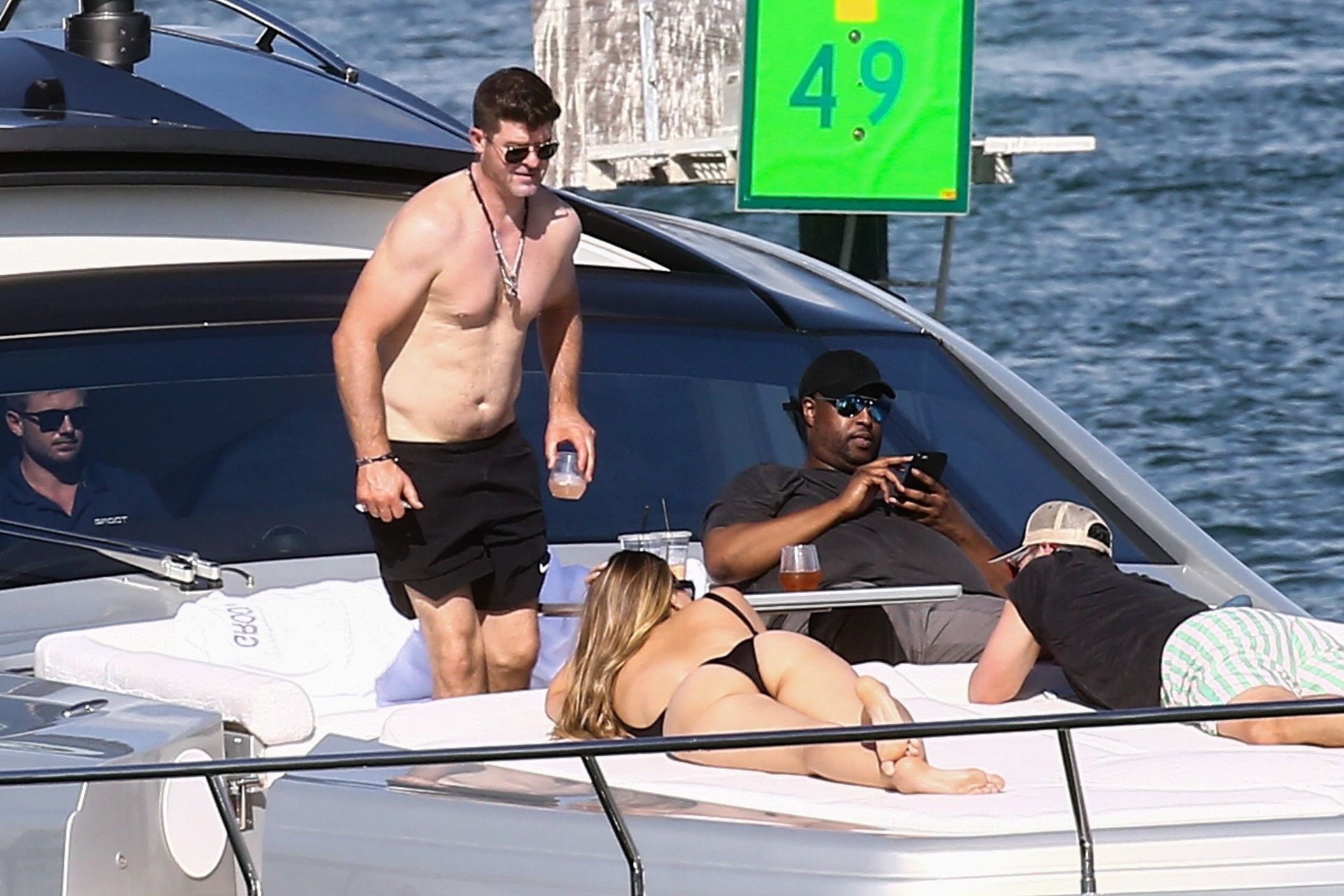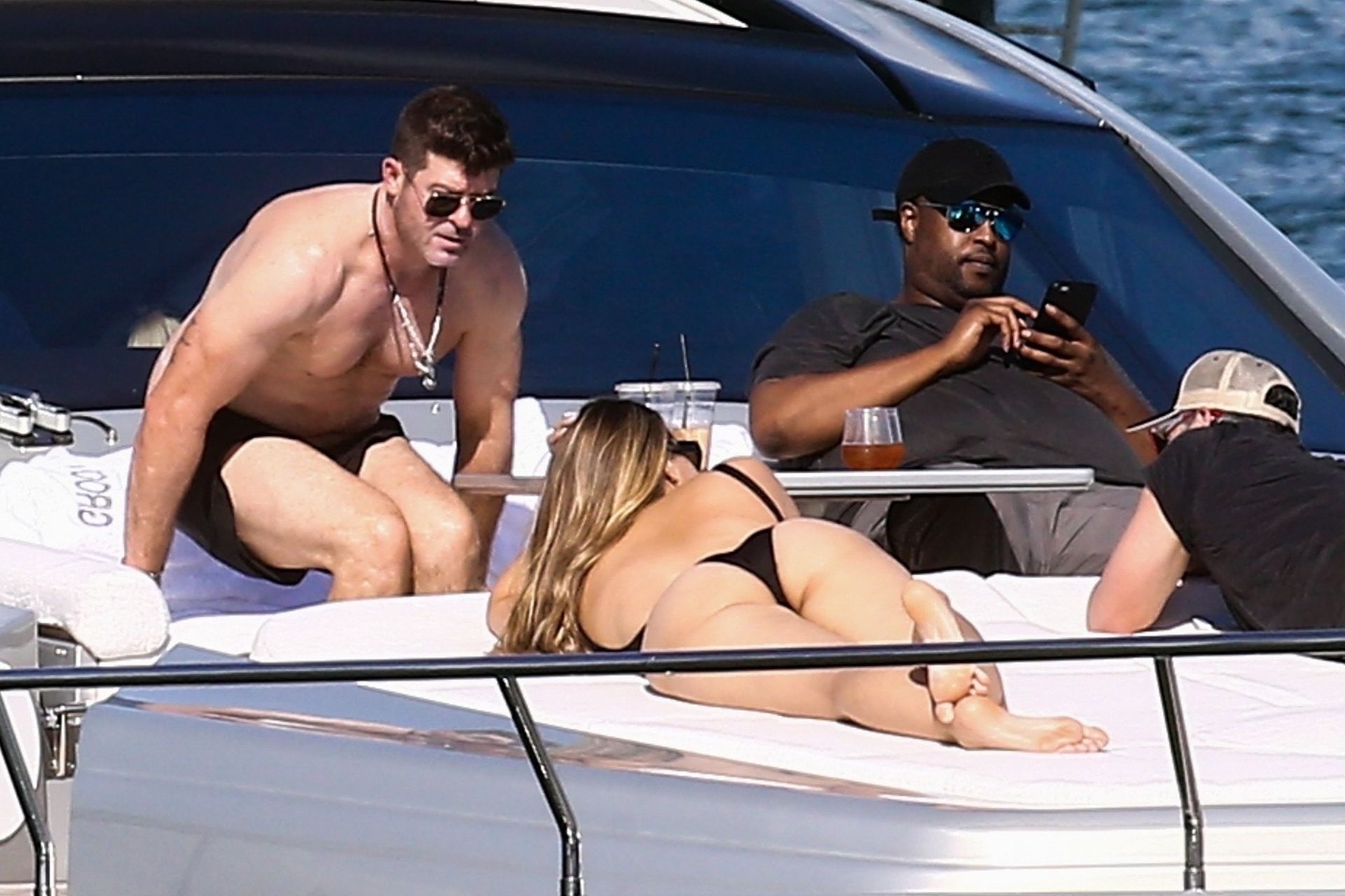 Crooner Robin Thicke and his sexy blonde, April Love Geary, are tanning it up on a yacht with friends while holidaying in Miami, 11/22/2019.