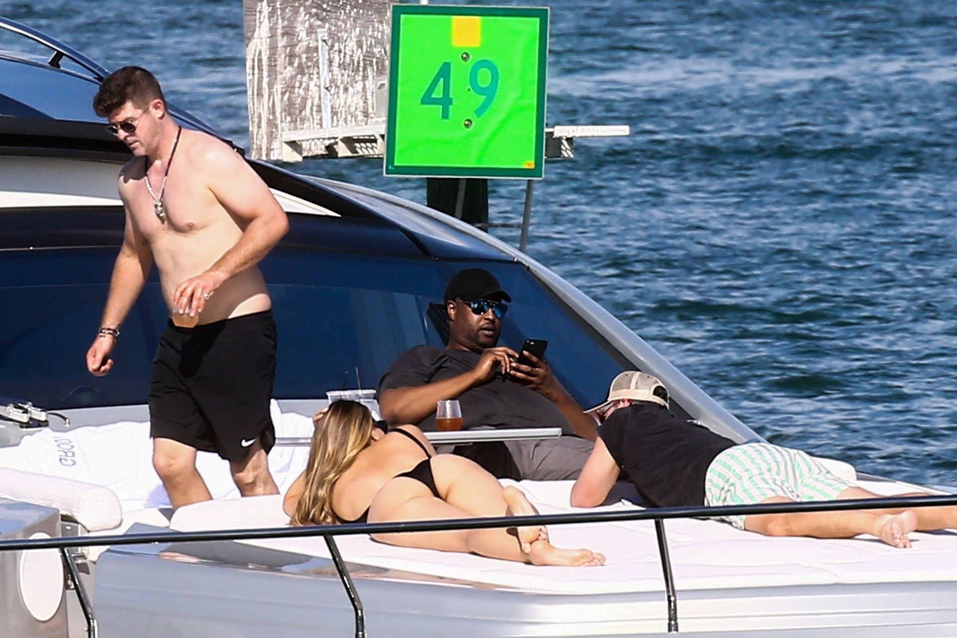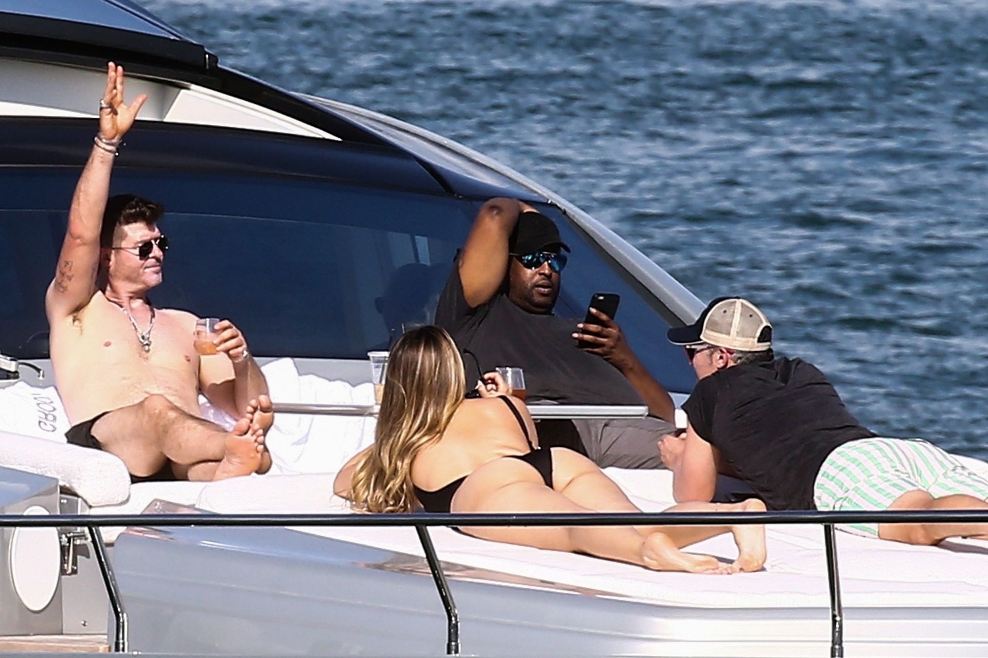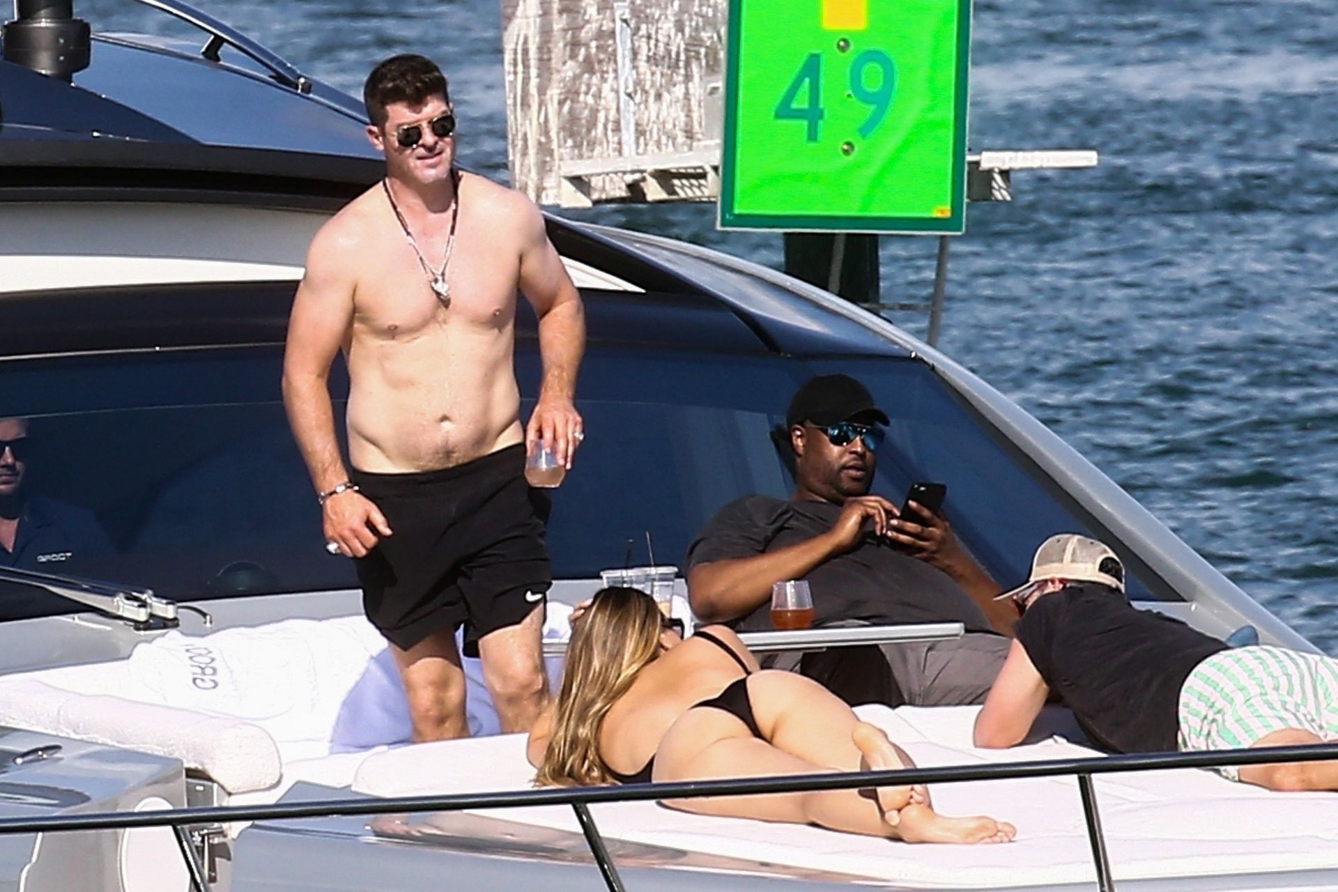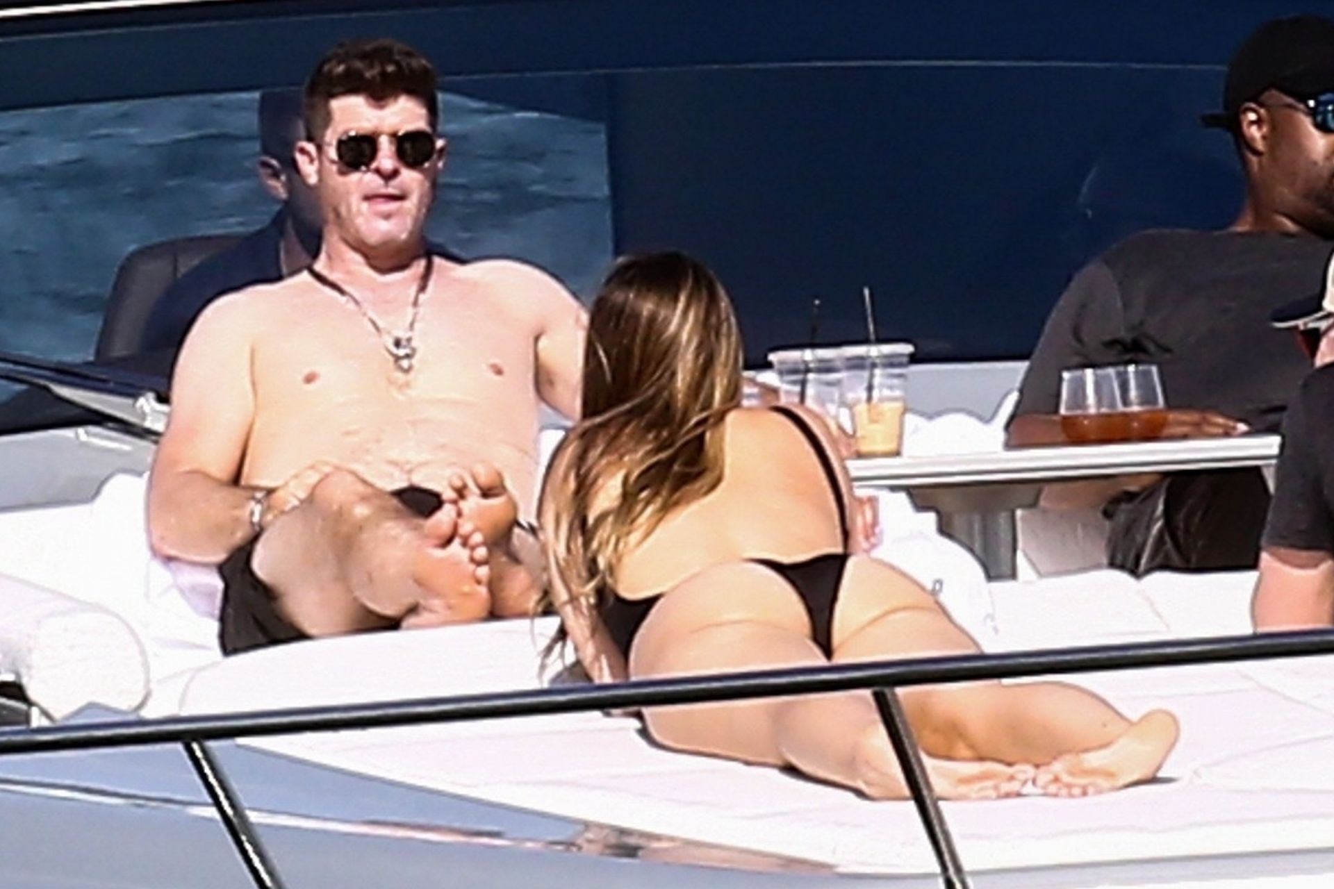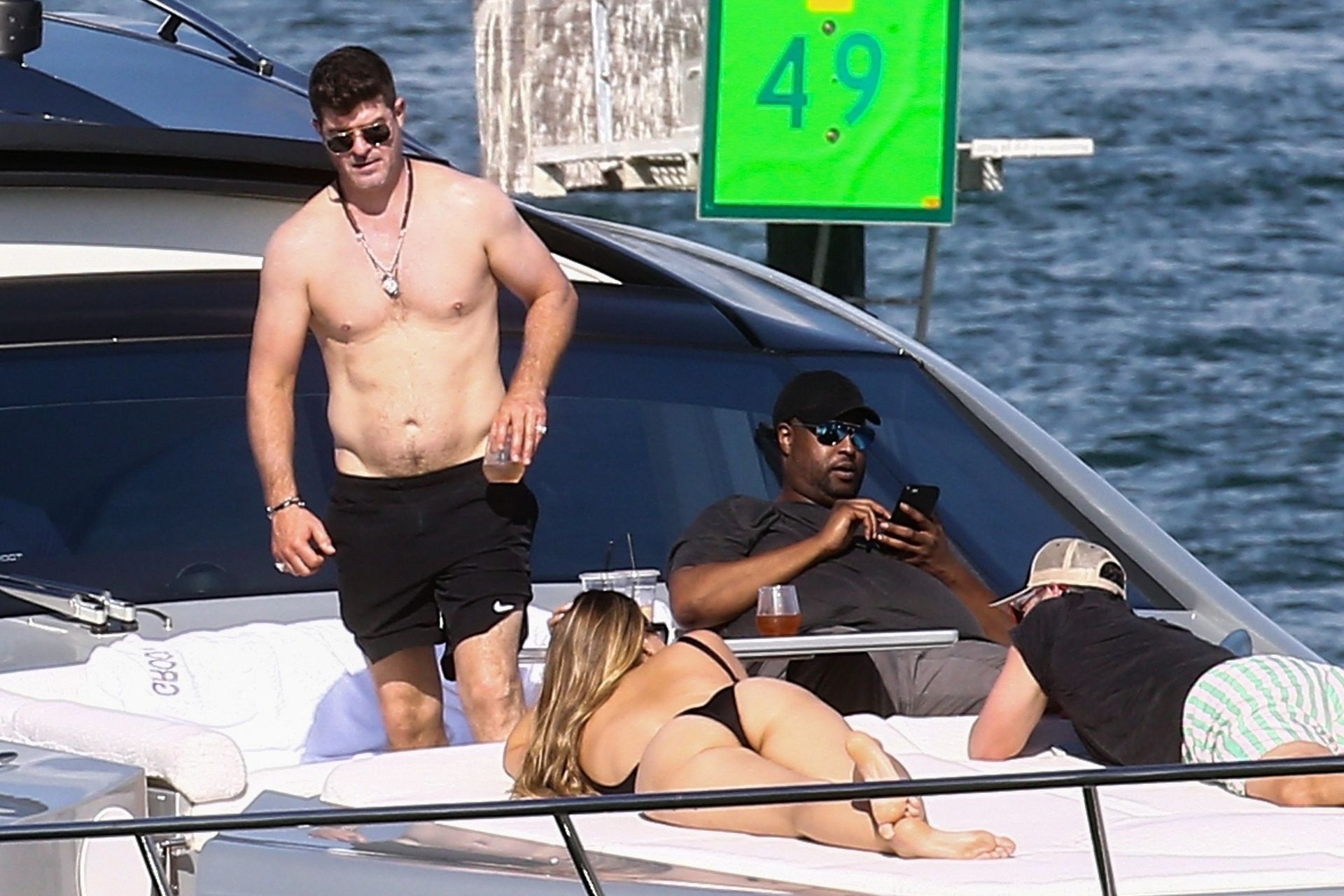 Crooner Robin Thicke and his sexy blonde, April Love Geary, are tanning it up on a yacht with friends while holidaying in Miami, 11/22/2019.
