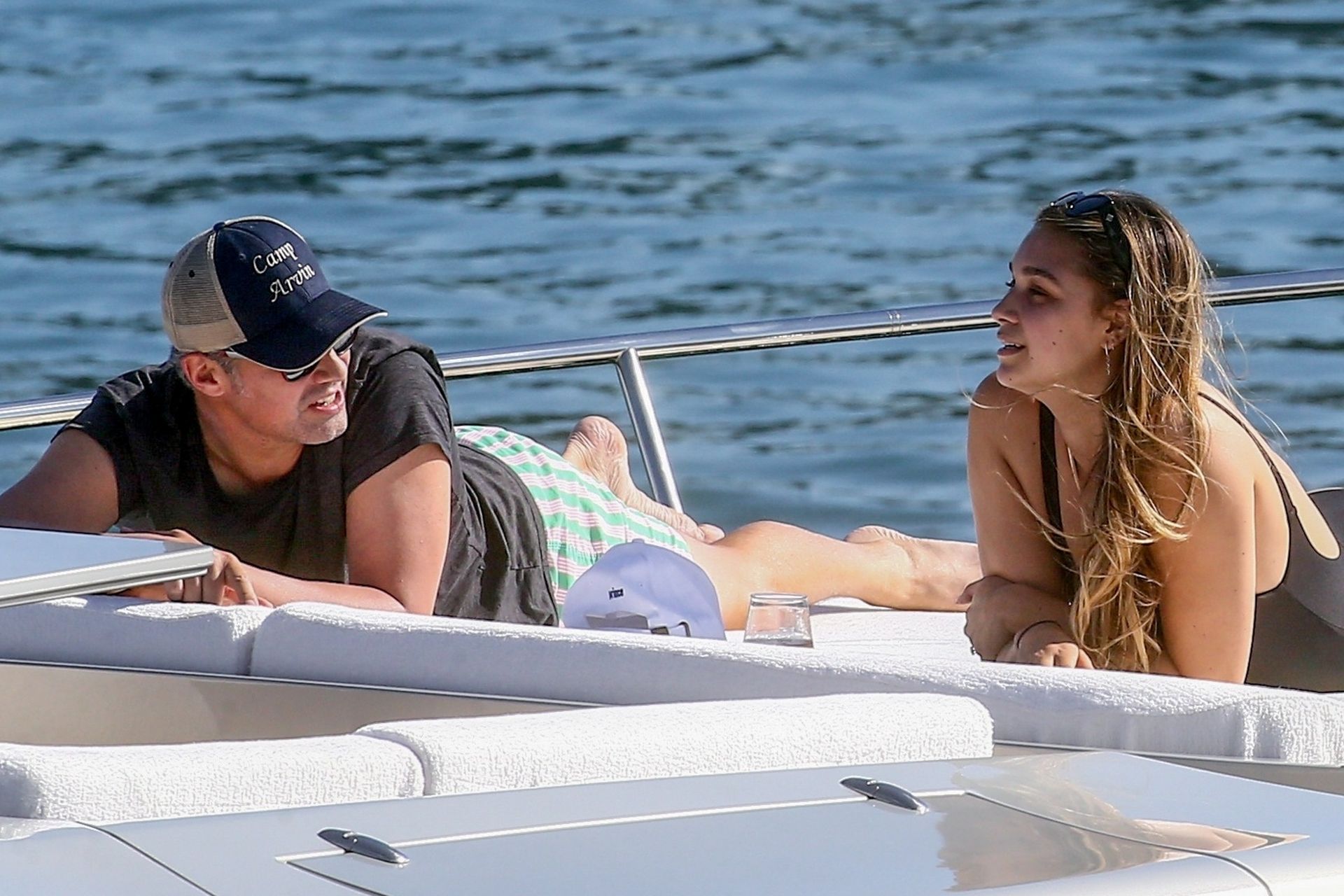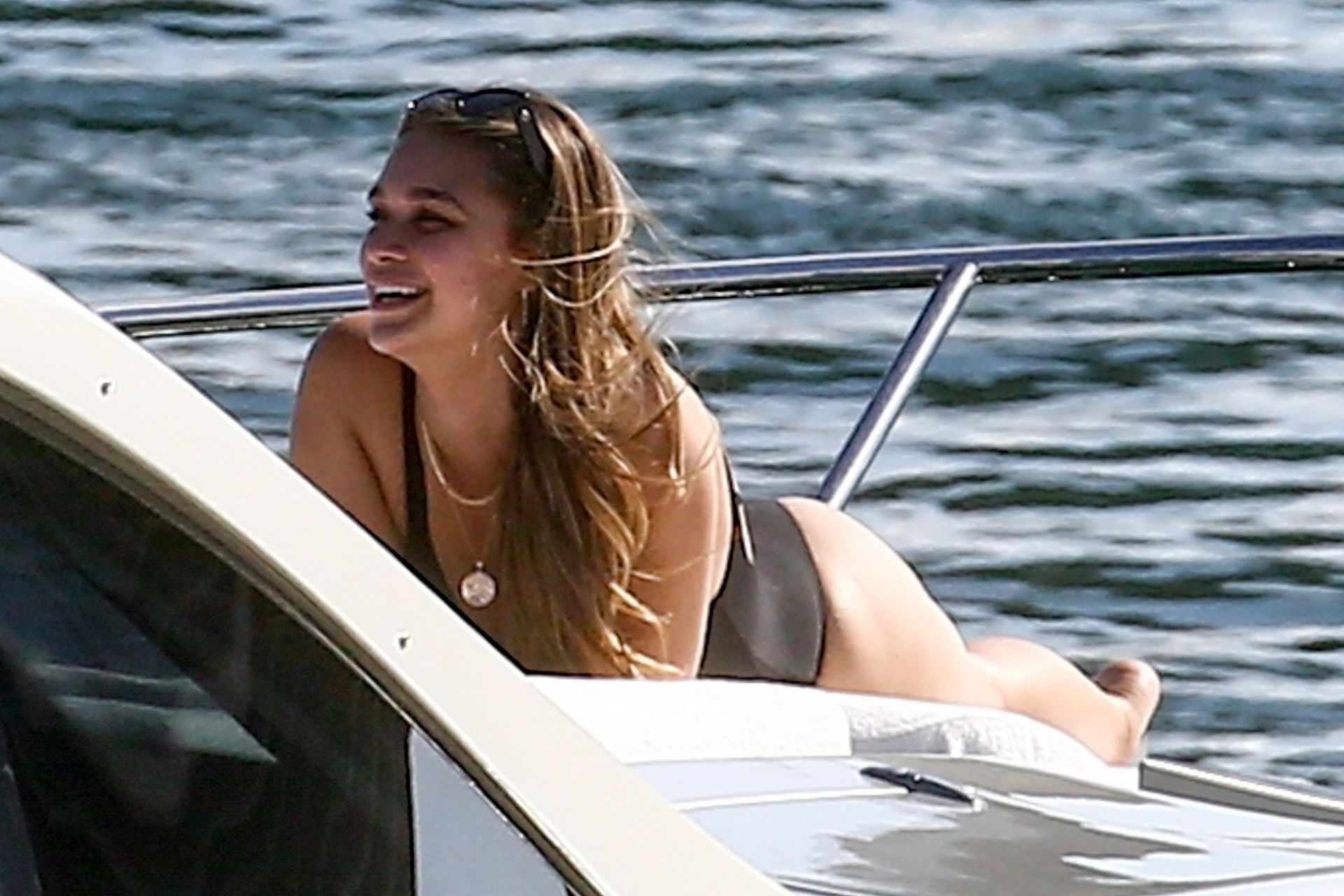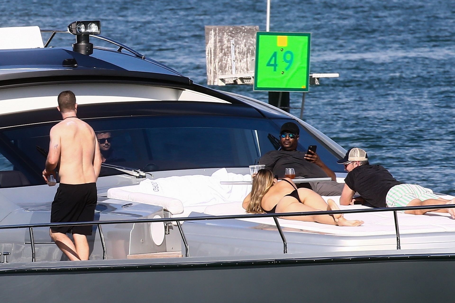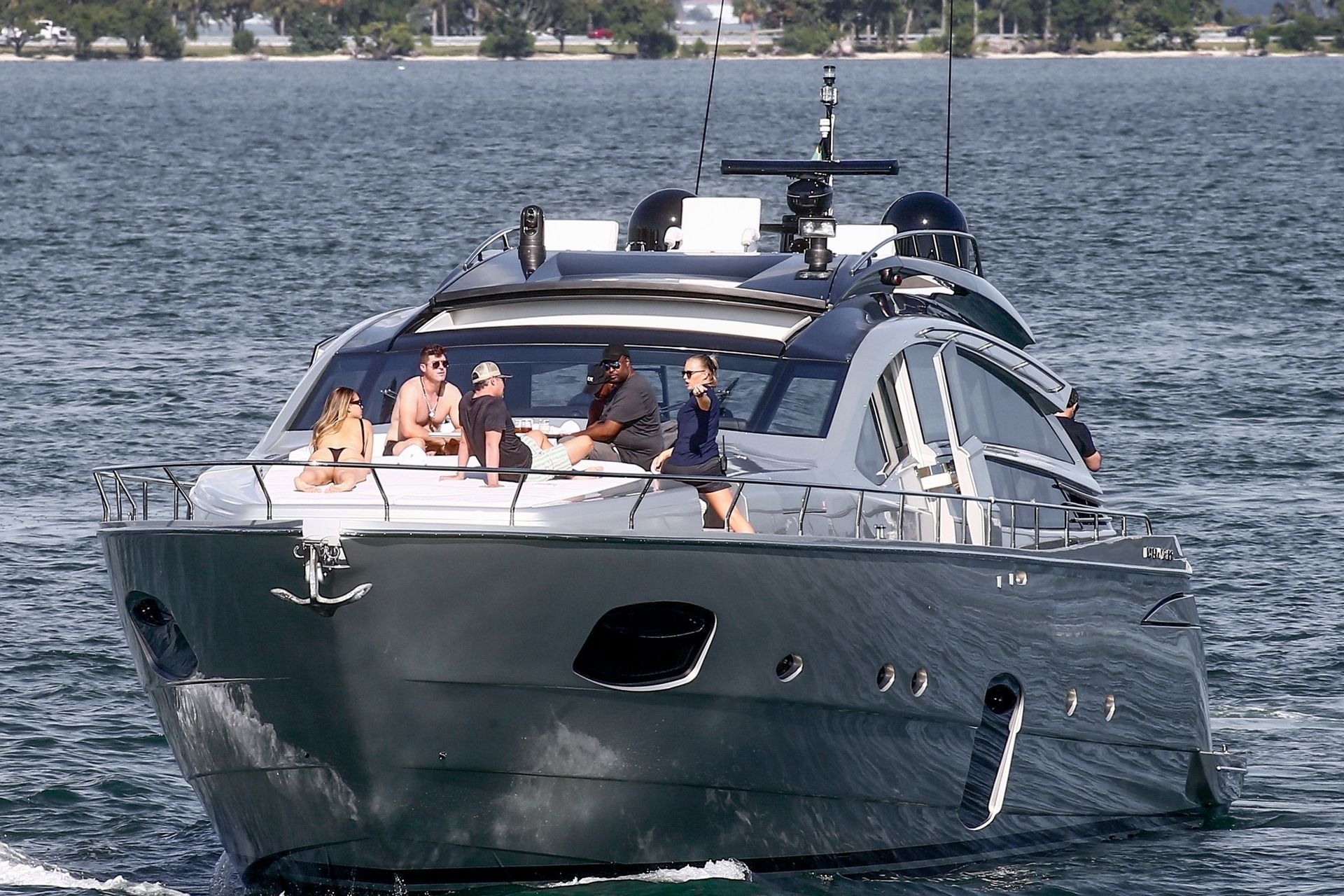 Crooner Robin Thicke and his sexy blonde, April Love Geary, are tanning it up on a yacht with friends while holidaying in Miami, 11/22/2019.