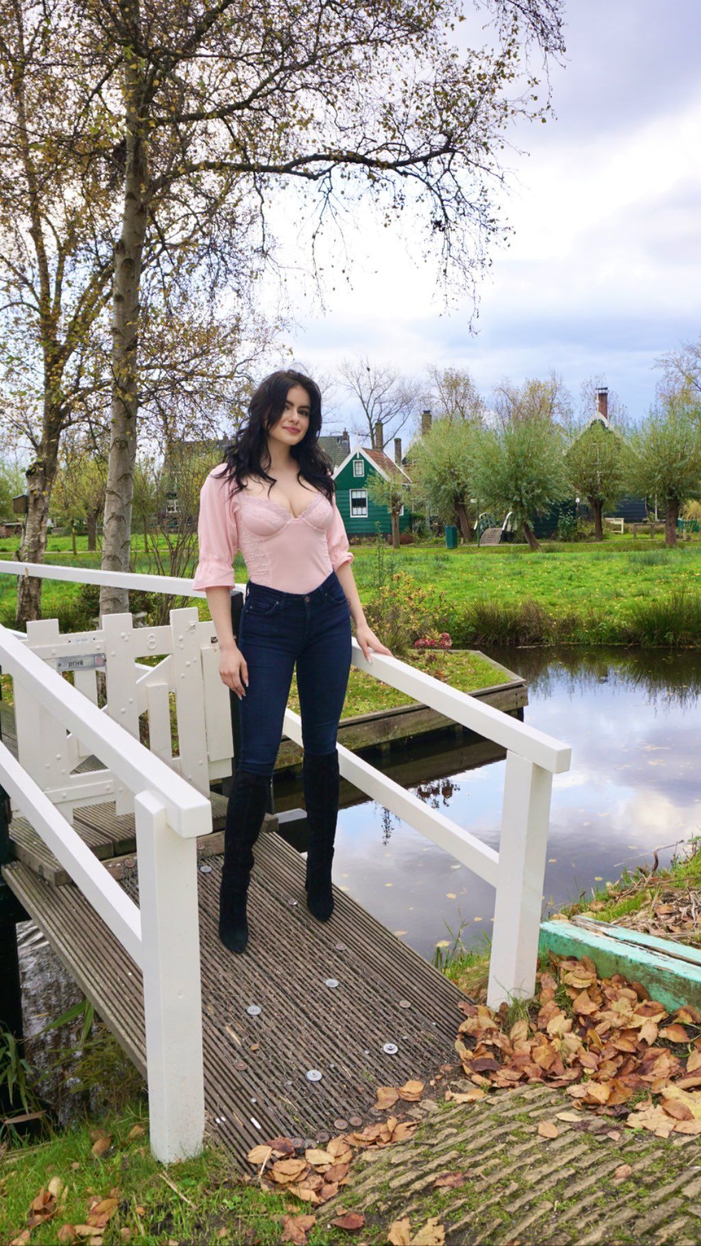 Ariel Winter shows her tits, wearing a pink blouse in Zaanse Schans, Amsterdam, Holland – Instagram, 11/19/2019. You can still look at her breasts, not the house from behind.