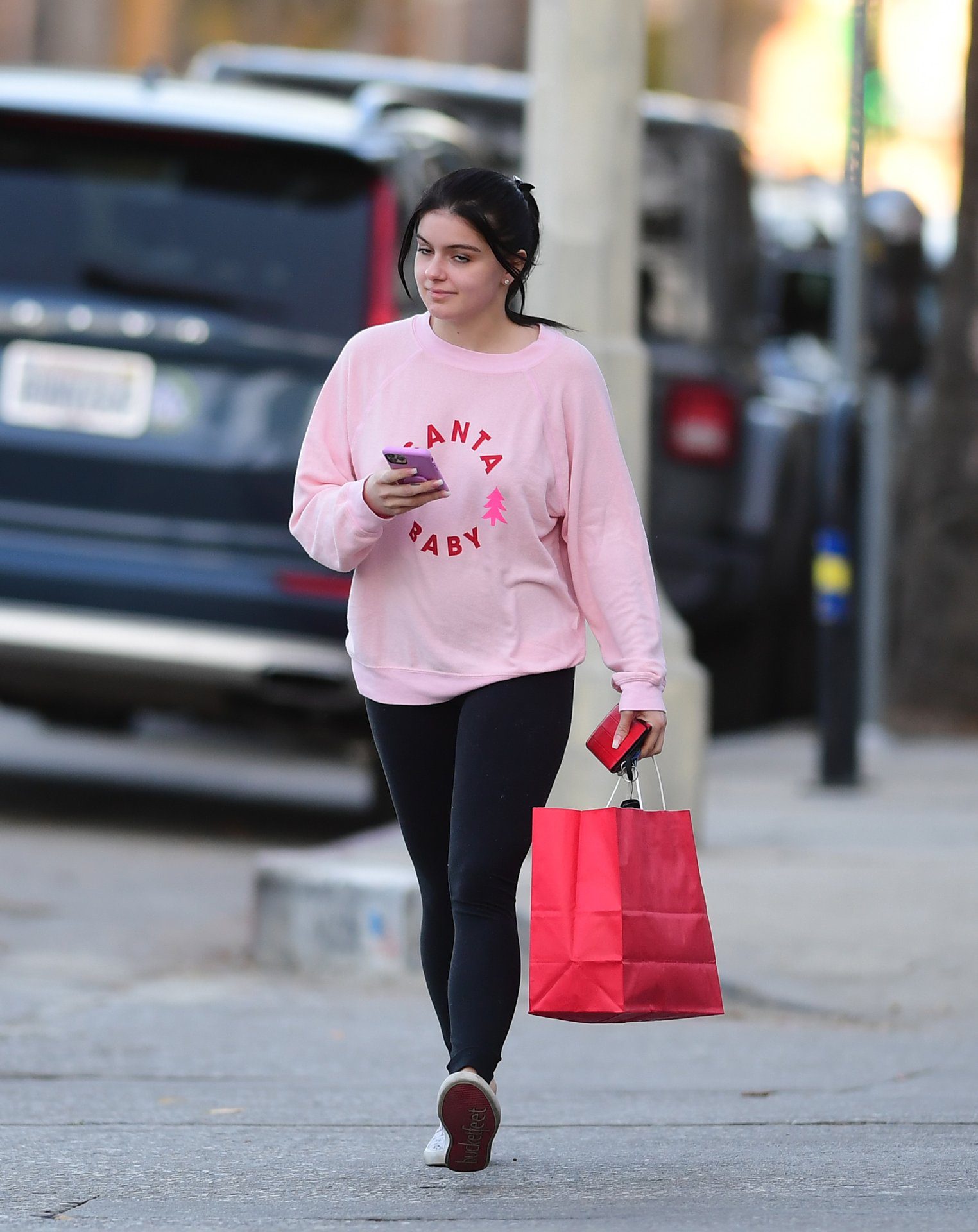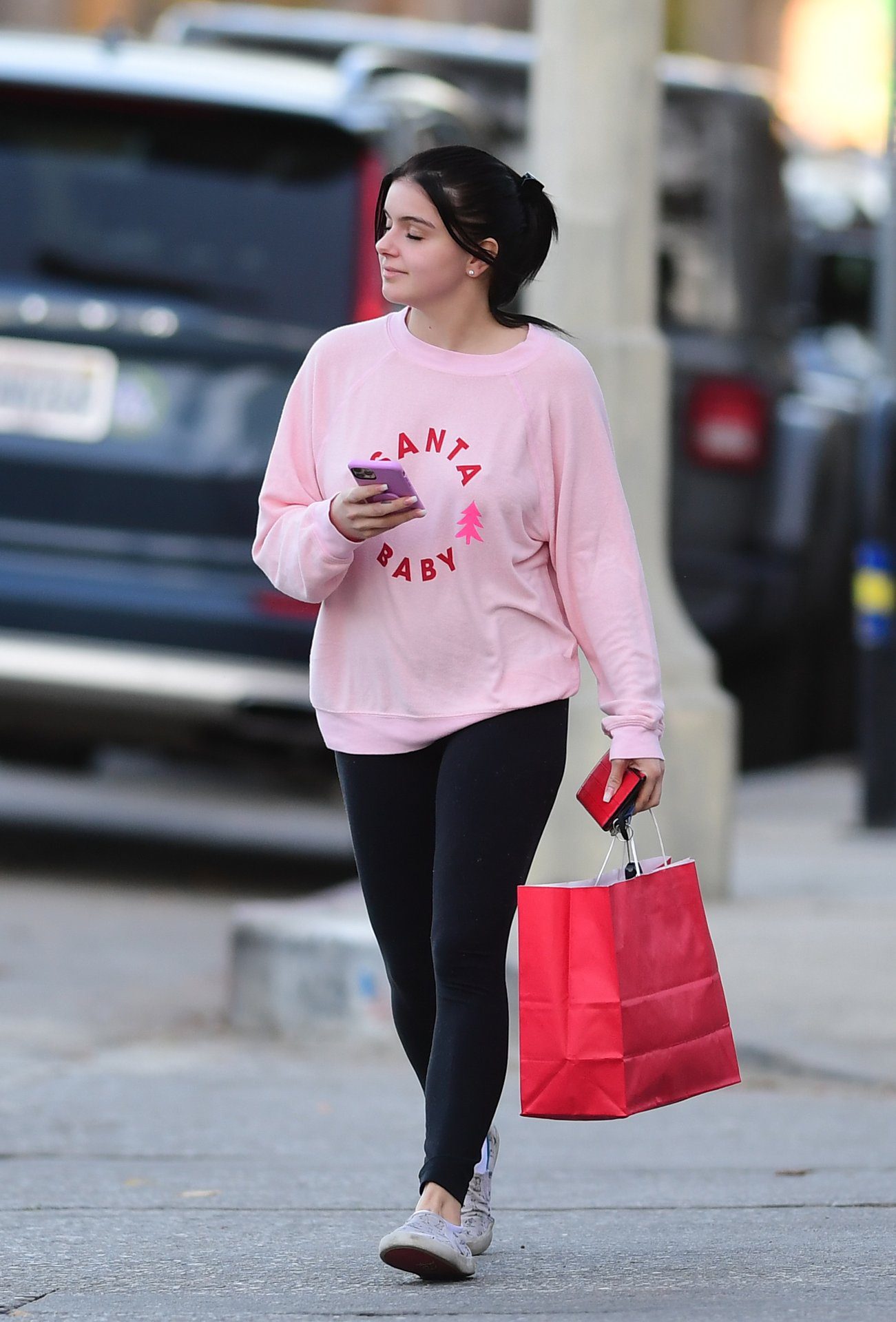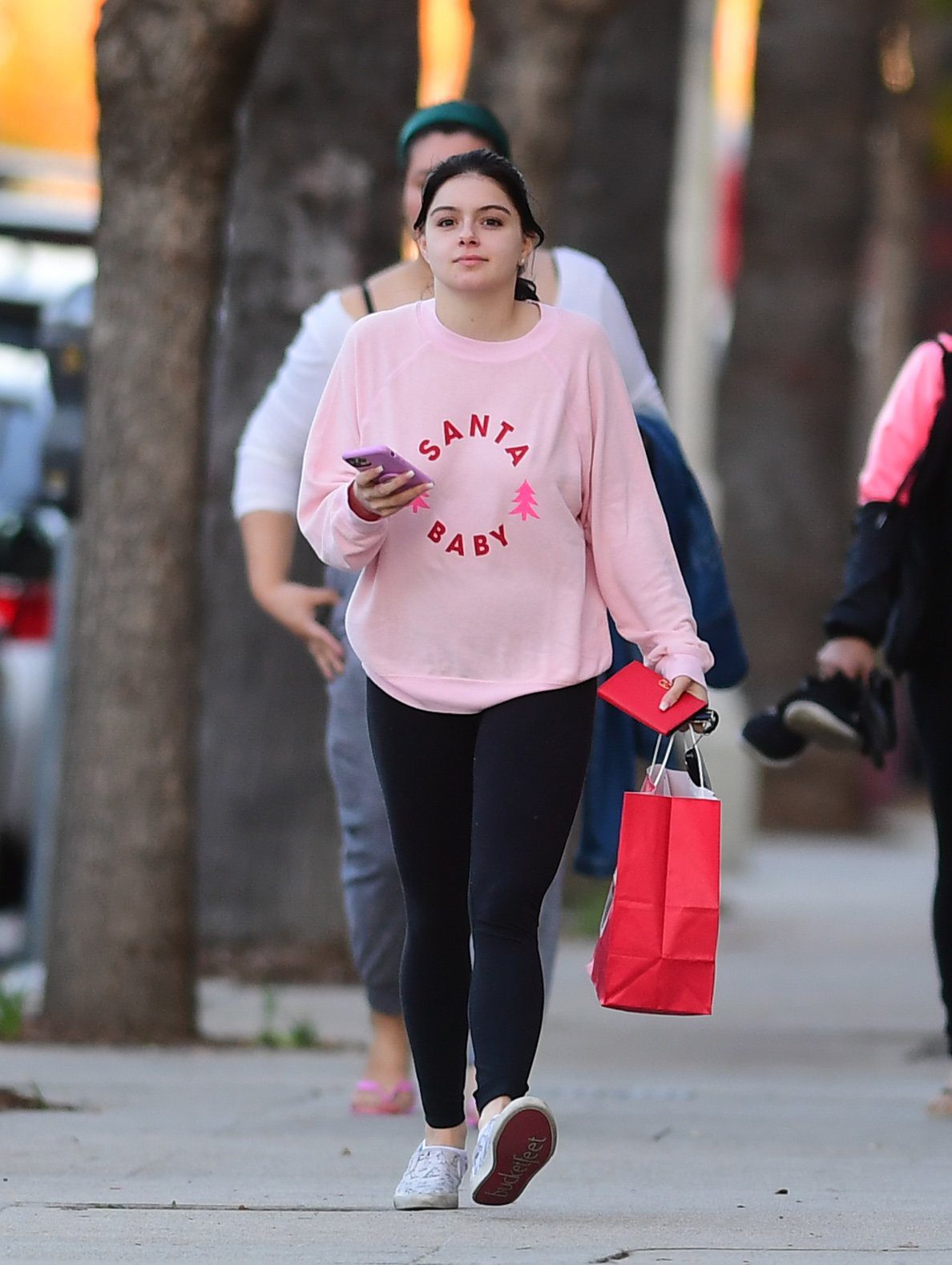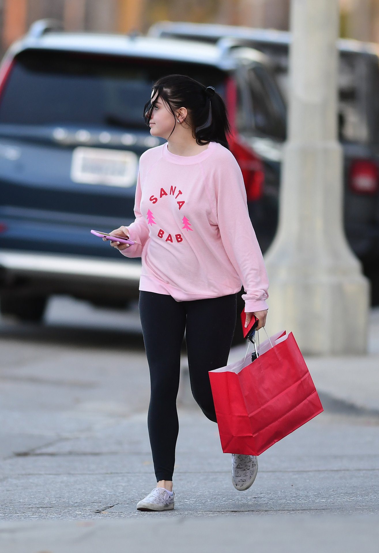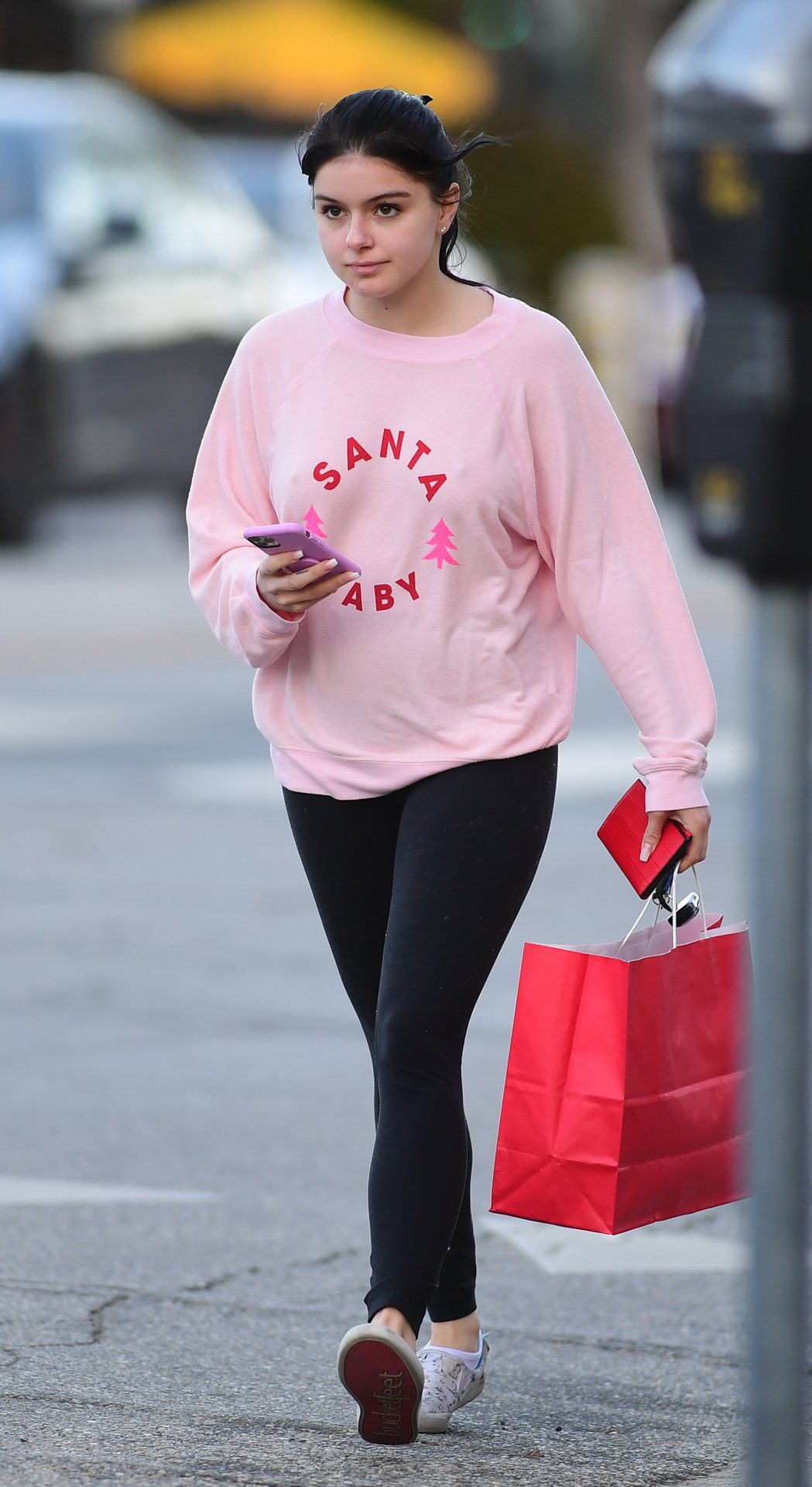 Ariel Winter was pictured out shopping in Los Angeles, 12/18/2019. The 21-year-old “Modern Family” actress sported a pink “Santa Baby” sweatshirt, black leggings, and Bucketfeet shoes.