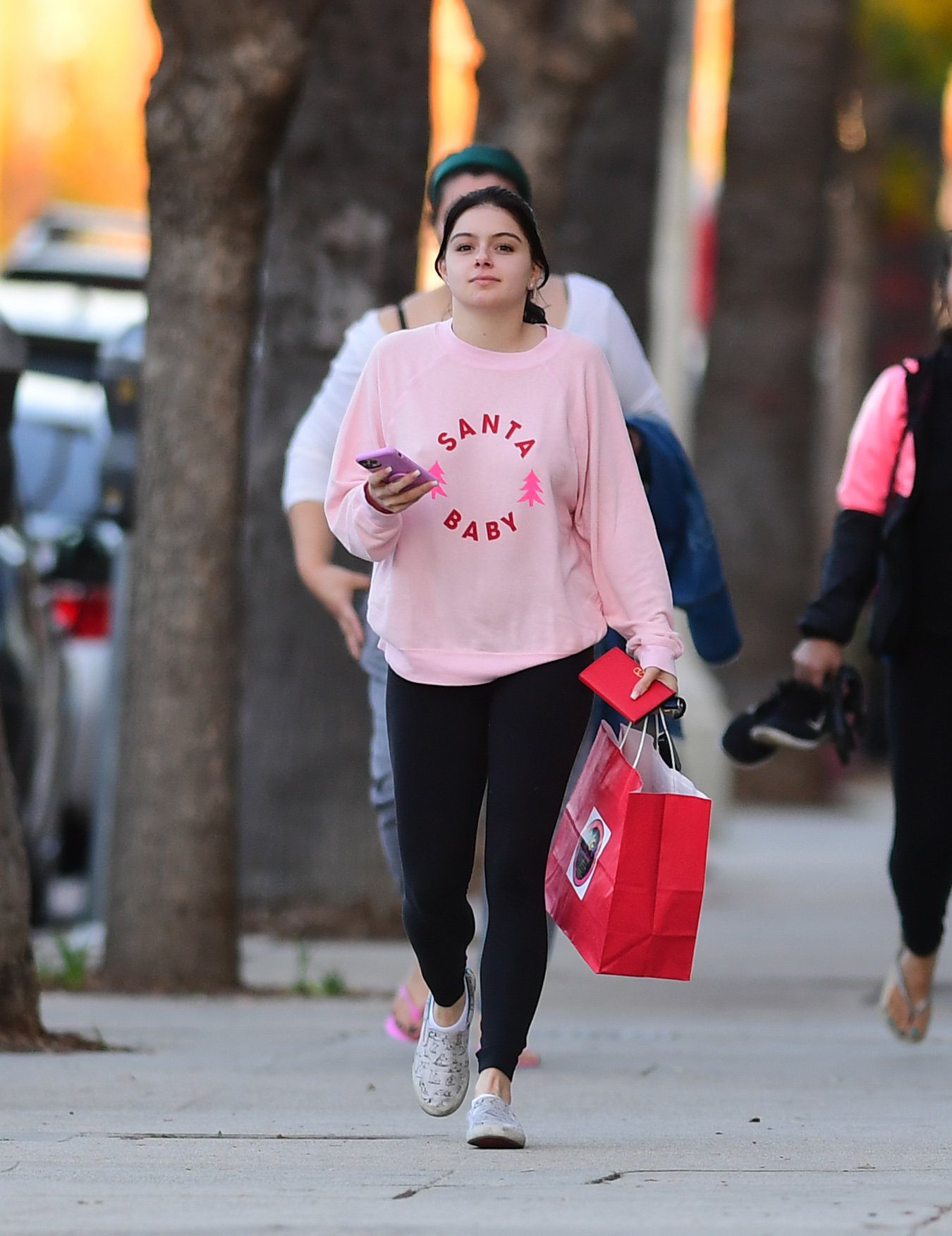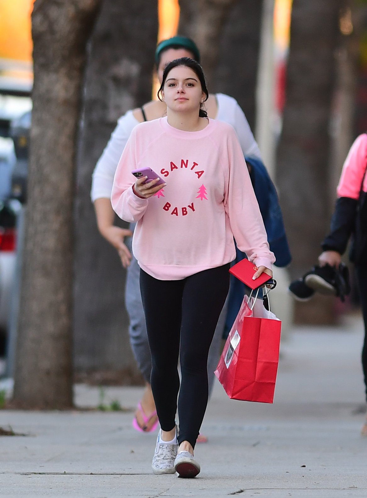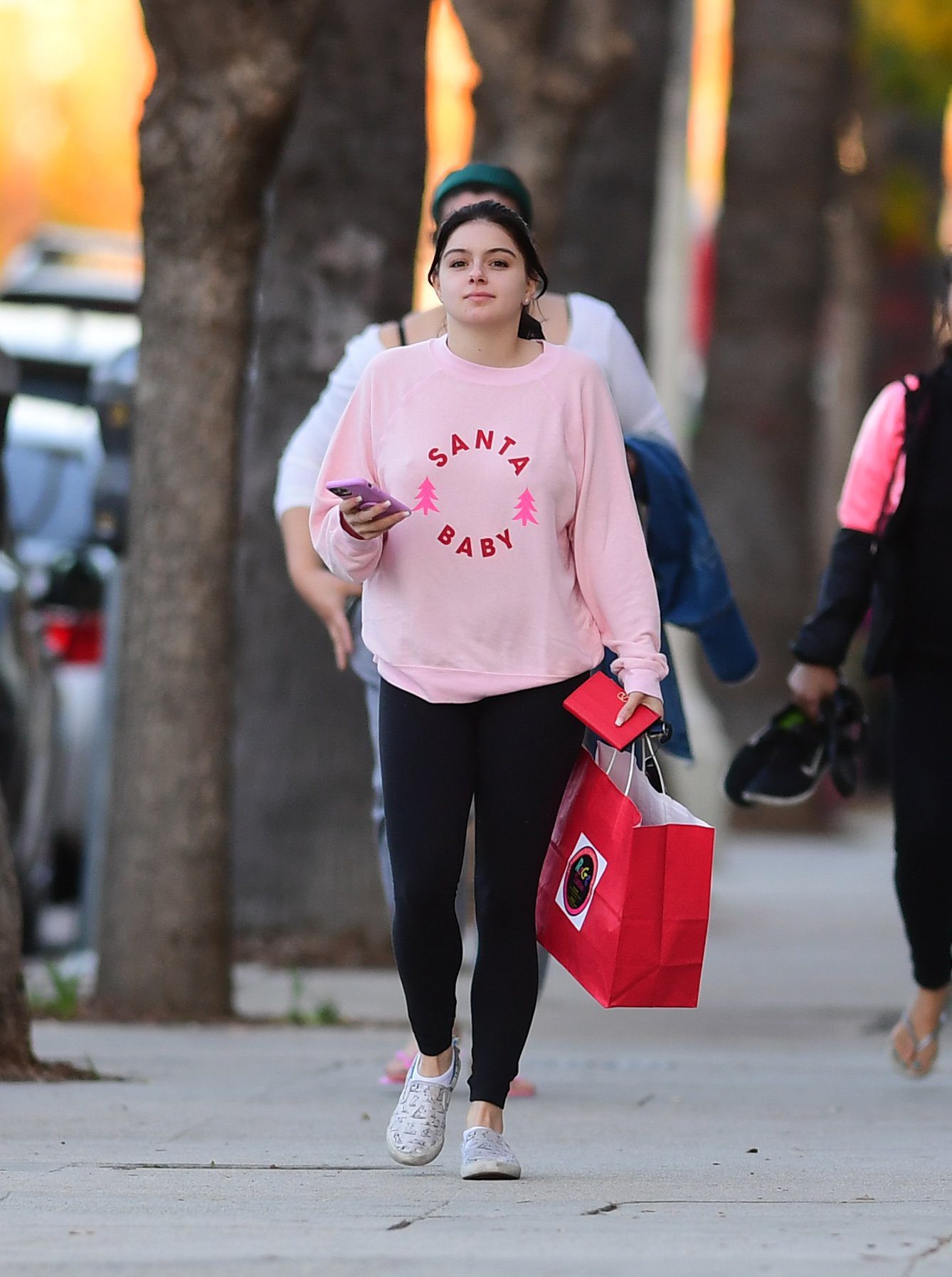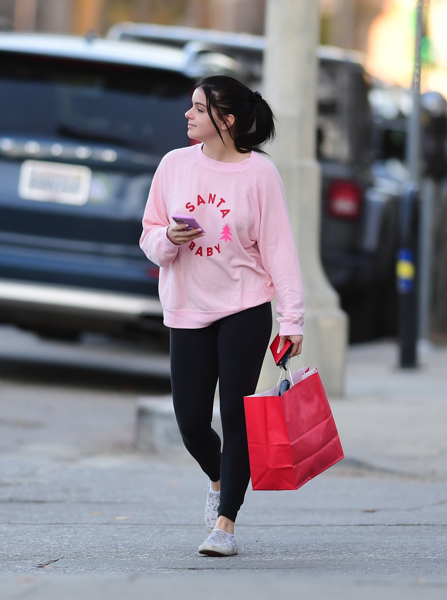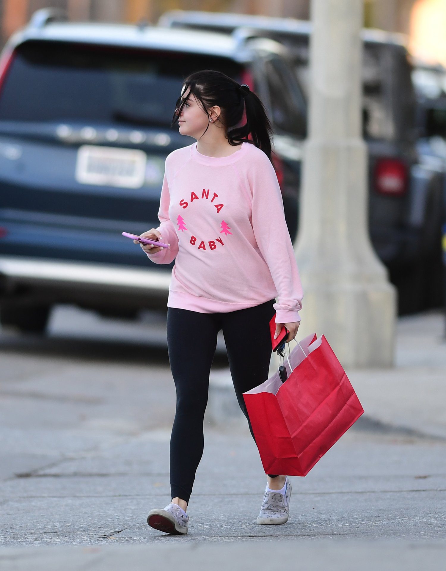 Ariel Winter was pictured out shopping in Los Angeles, 12/18/2019. The 21-year-old “Modern Family” actress sported a pink “Santa Baby” sweatshirt, black leggings, and Bucketfeet shoes.