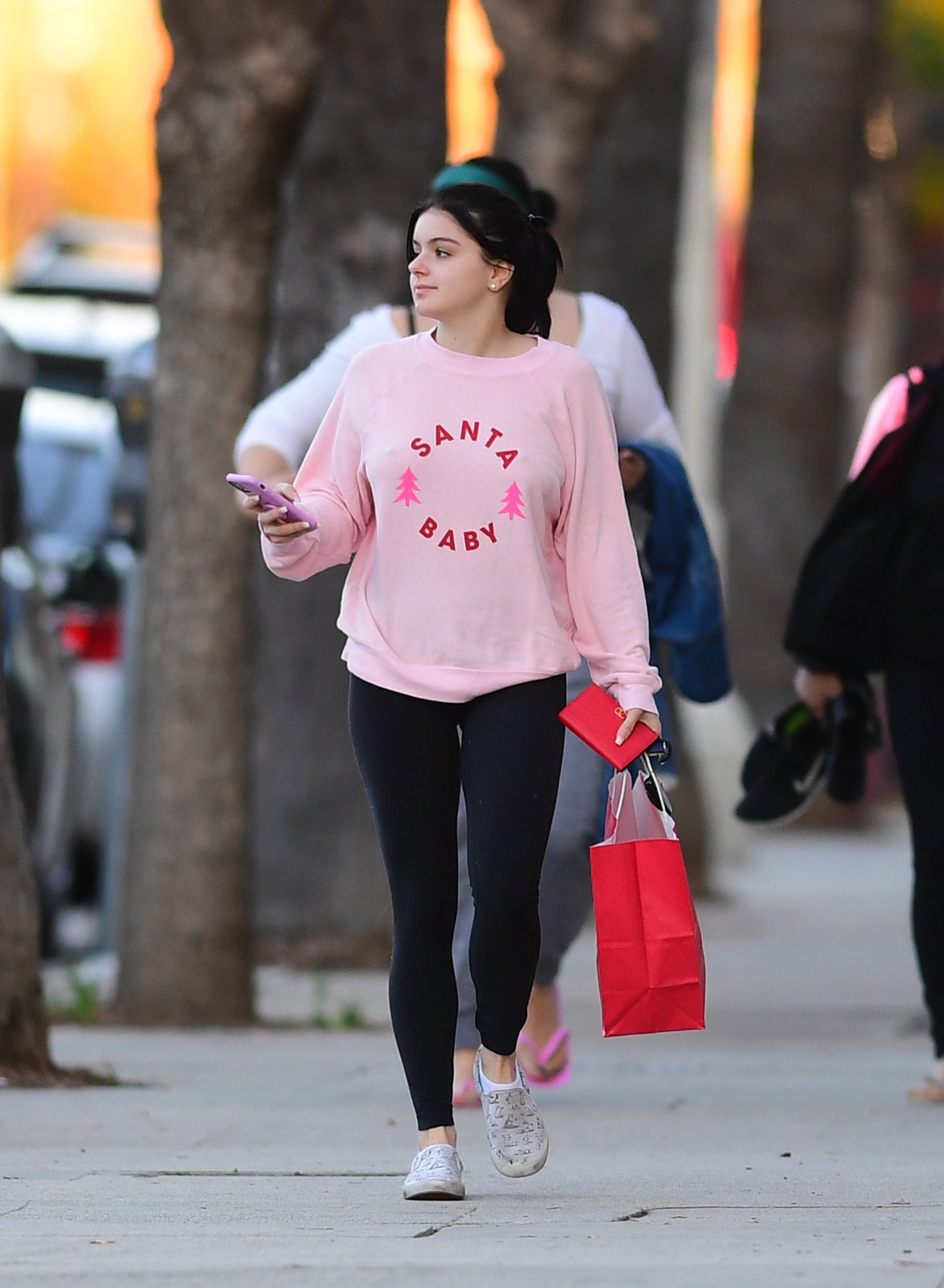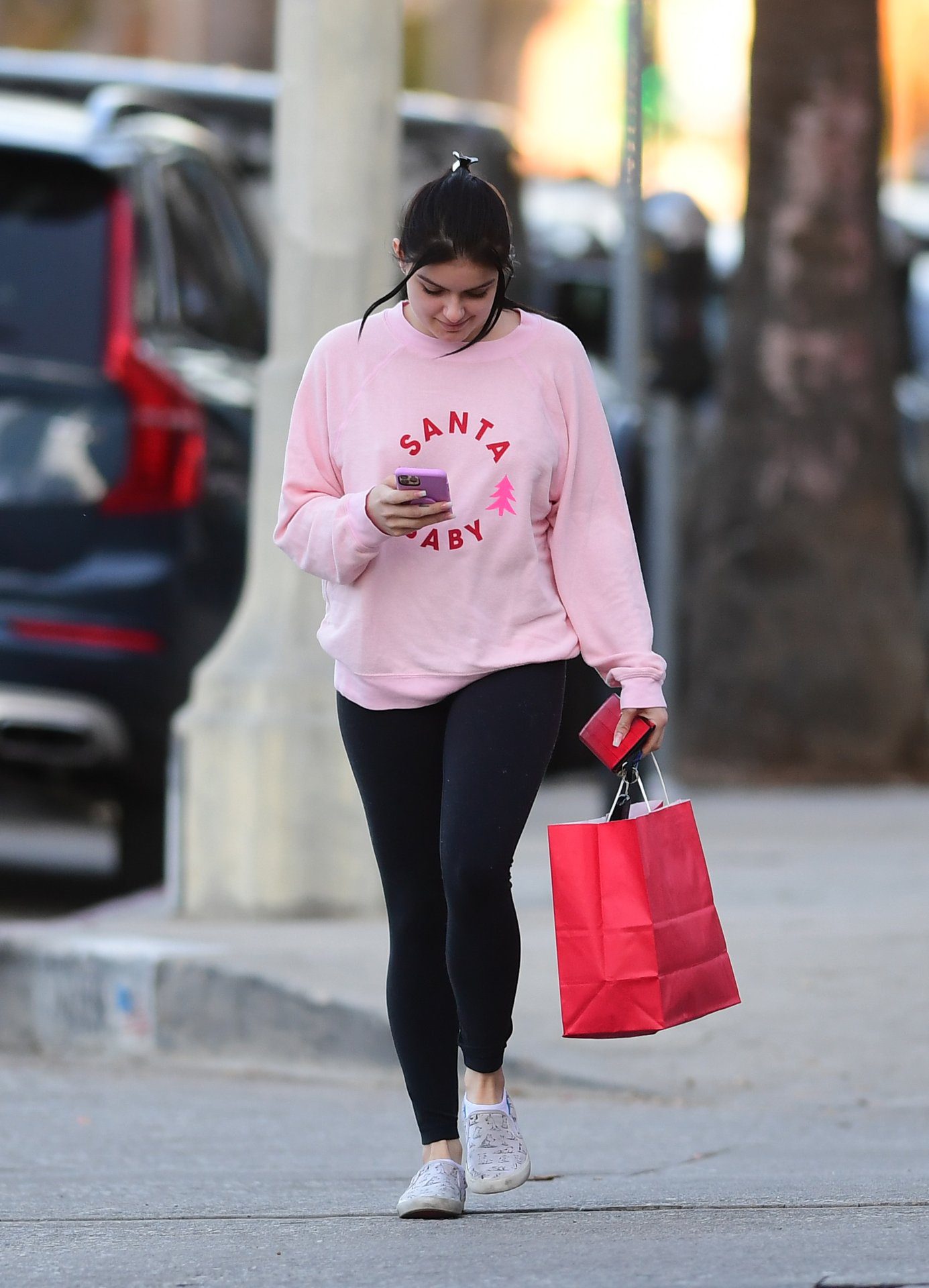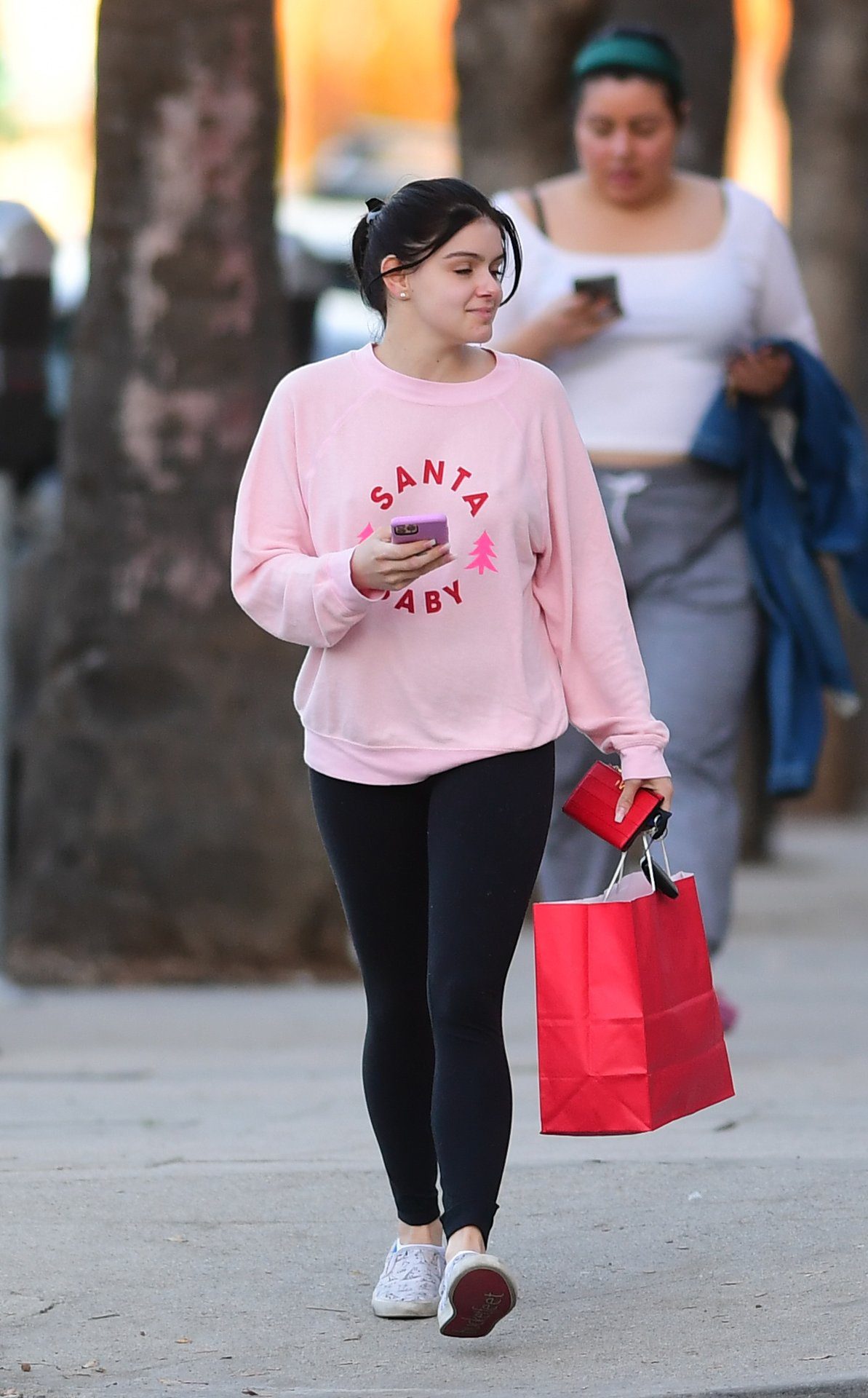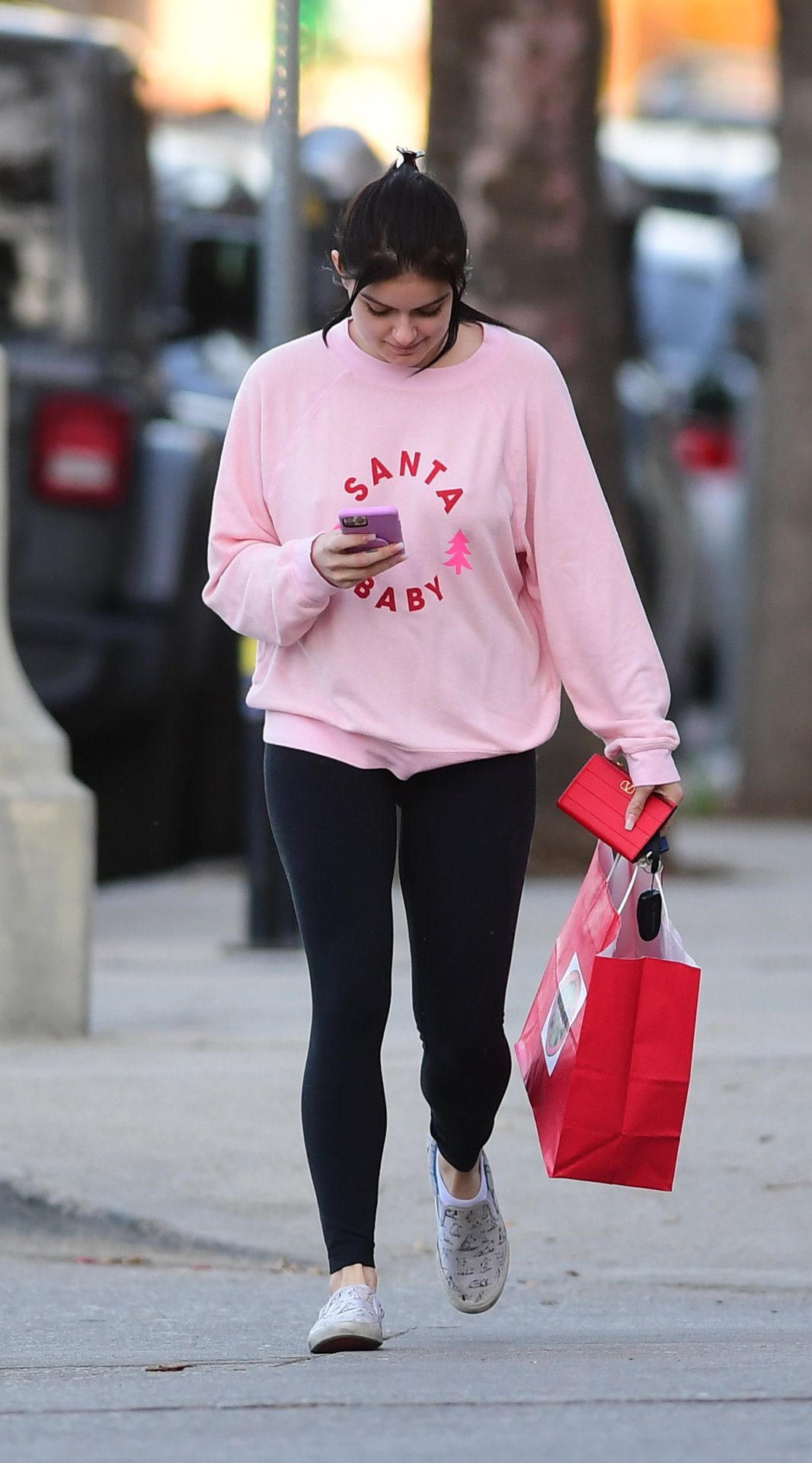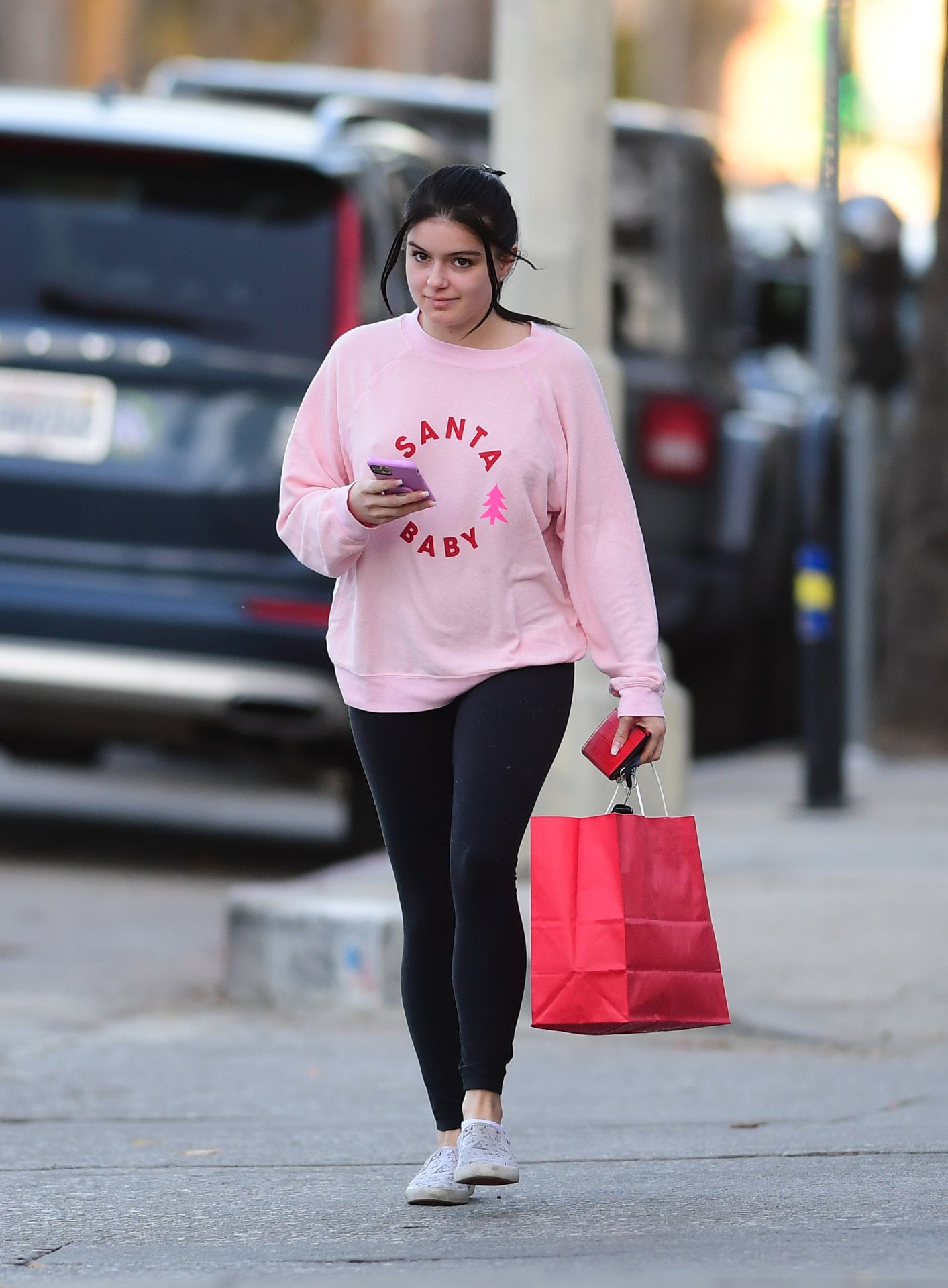 Ariel Winter was pictured out shopping in Los Angeles, 12/18/2019. The 21-year-old “Modern Family” actress sported a pink “Santa Baby” sweatshirt, black leggings, and Bucketfeet shoes.