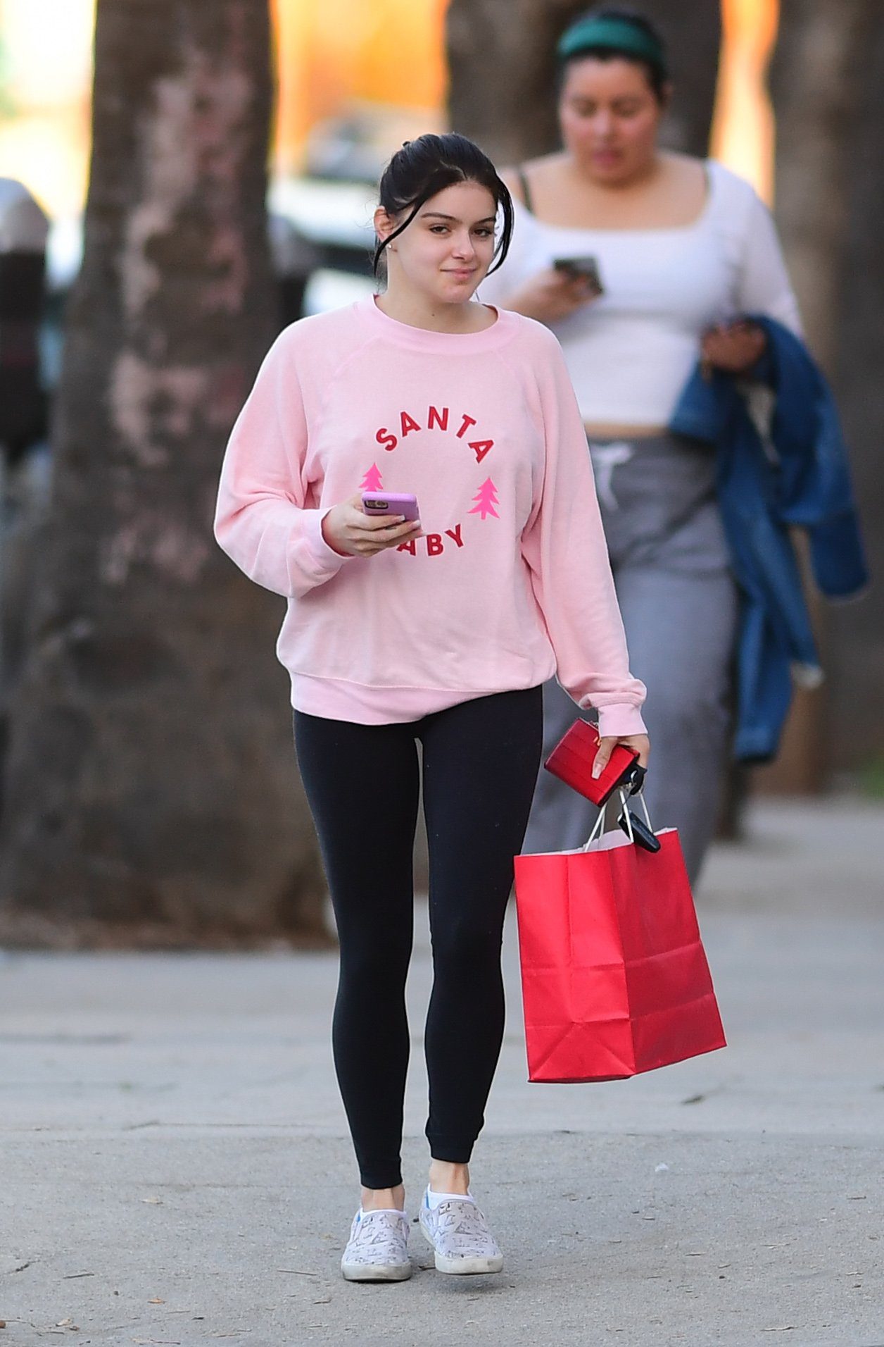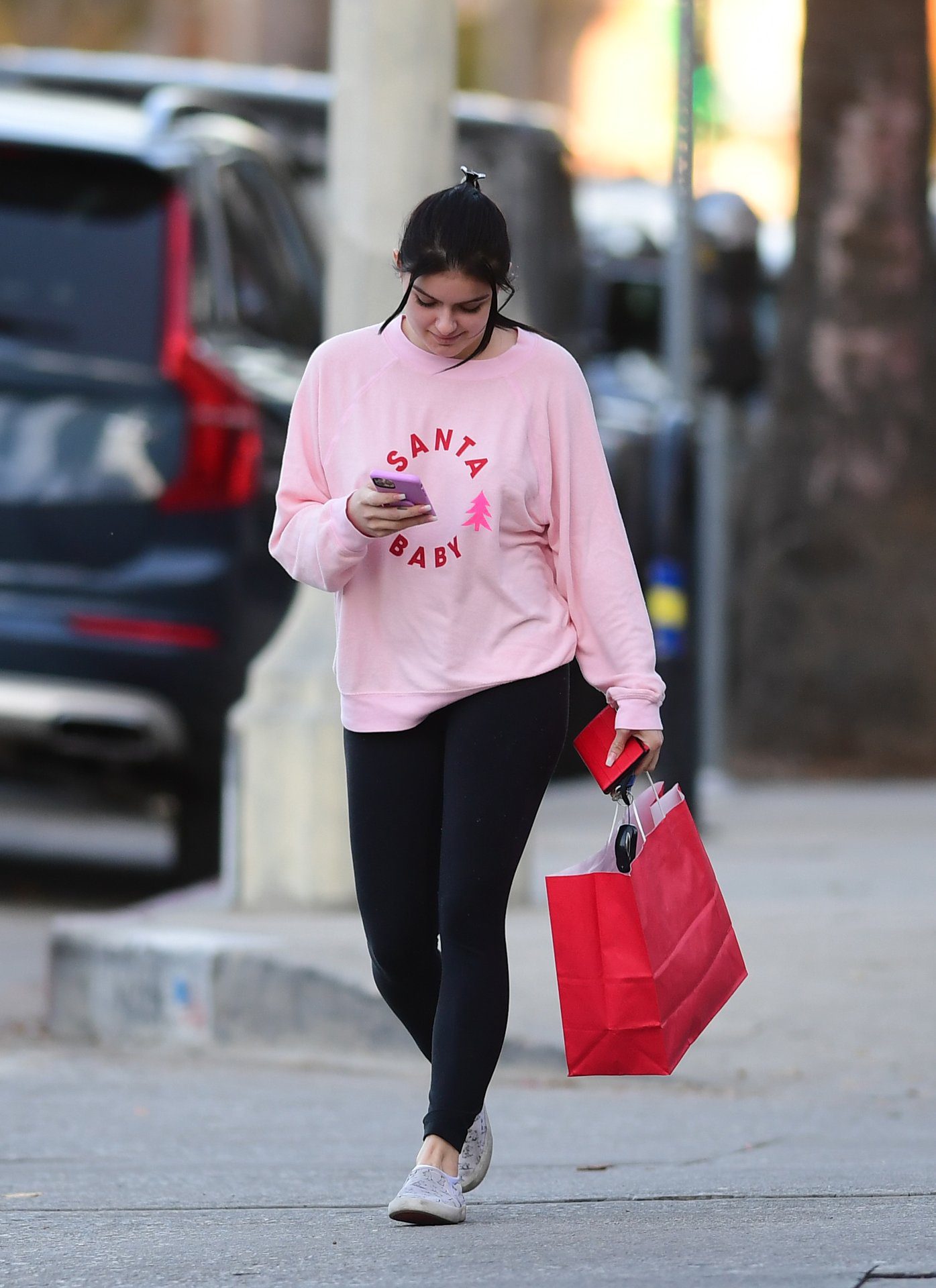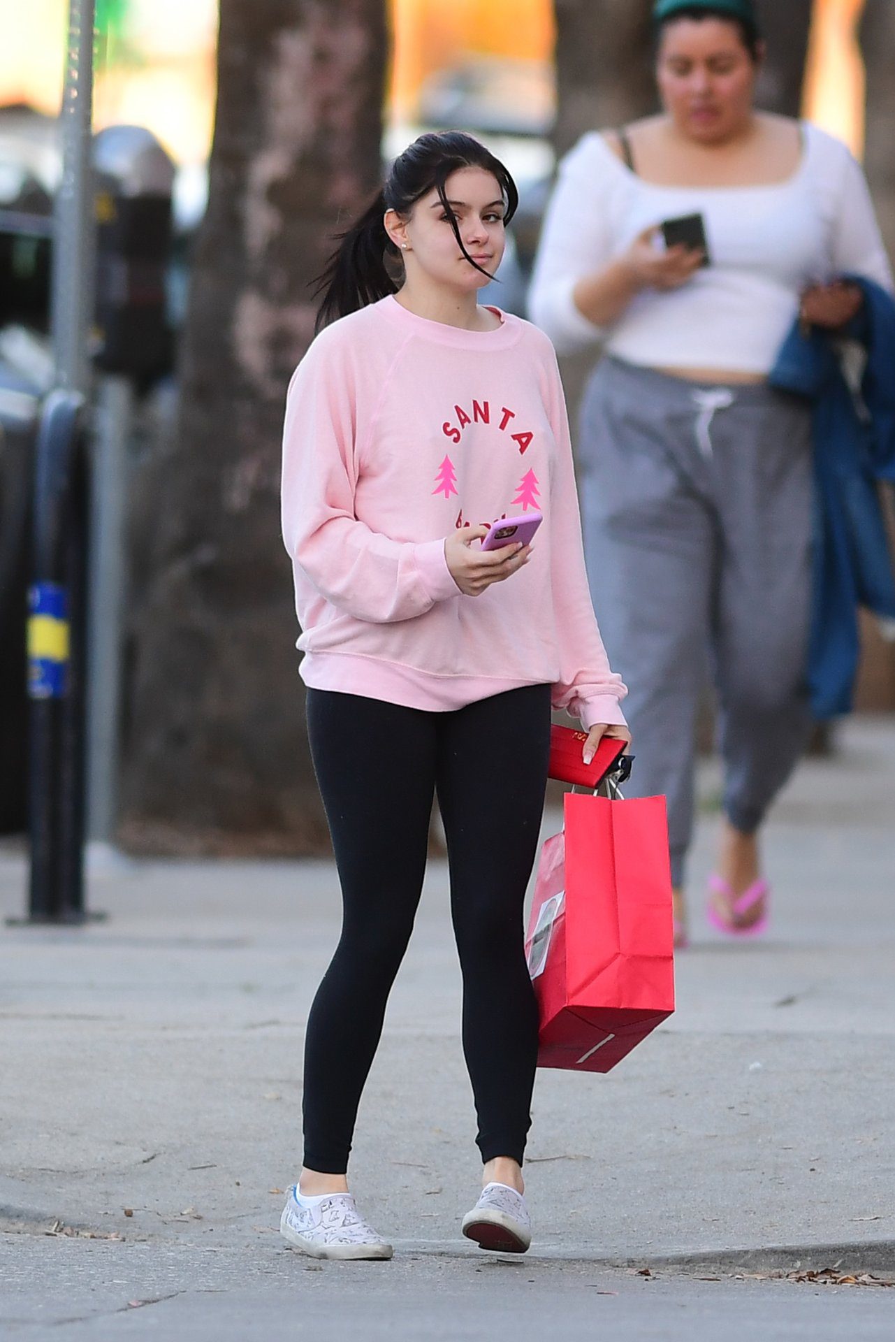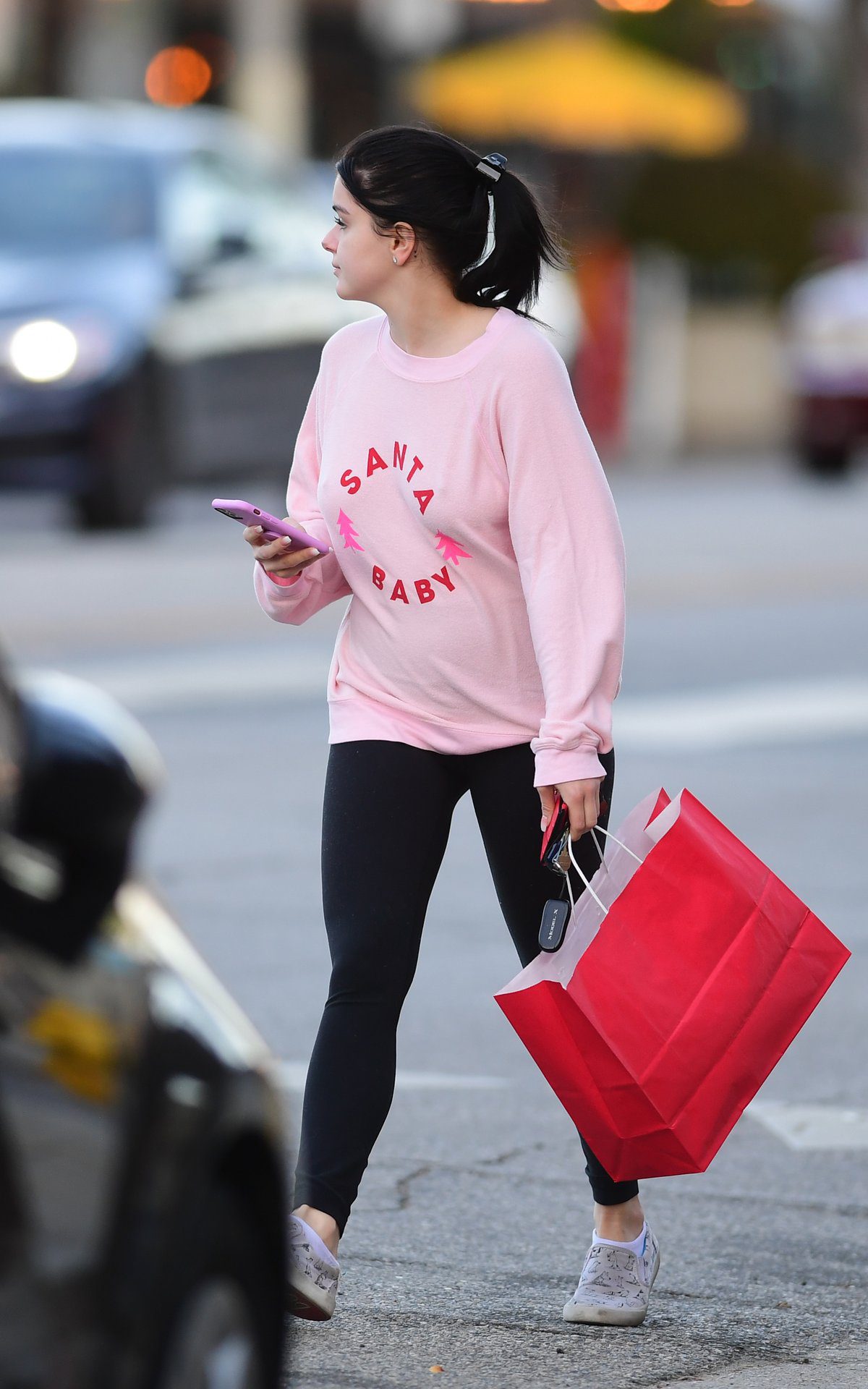 Ariel Winter was pictured out shopping in Los Angeles, 12/18/2019. The 21-year-old “Modern Family” actress sported a pink “Santa Baby” sweatshirt, black leggings, and Bucketfeet shoes.
