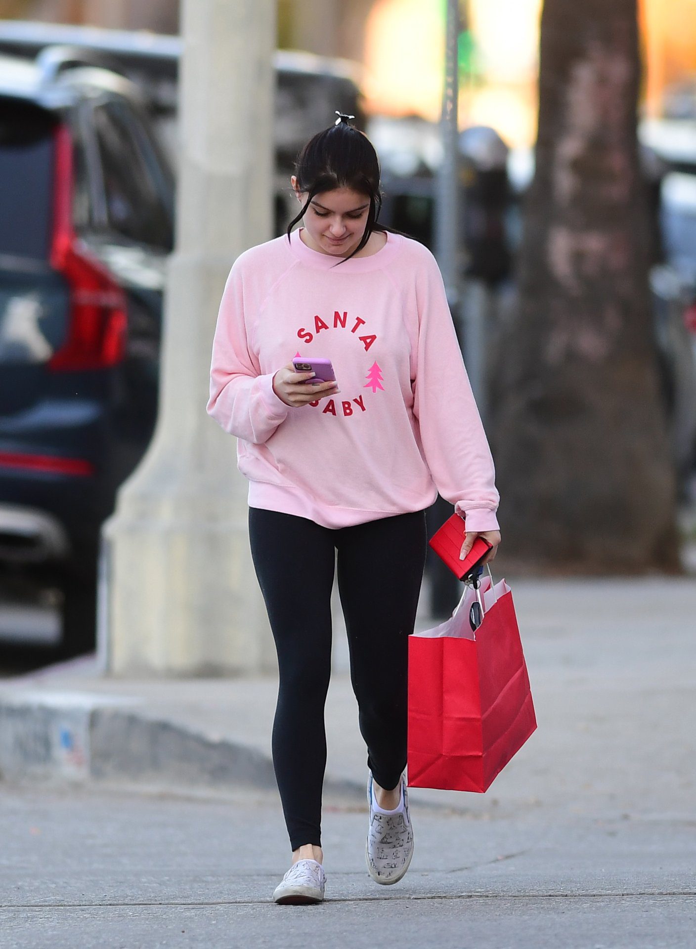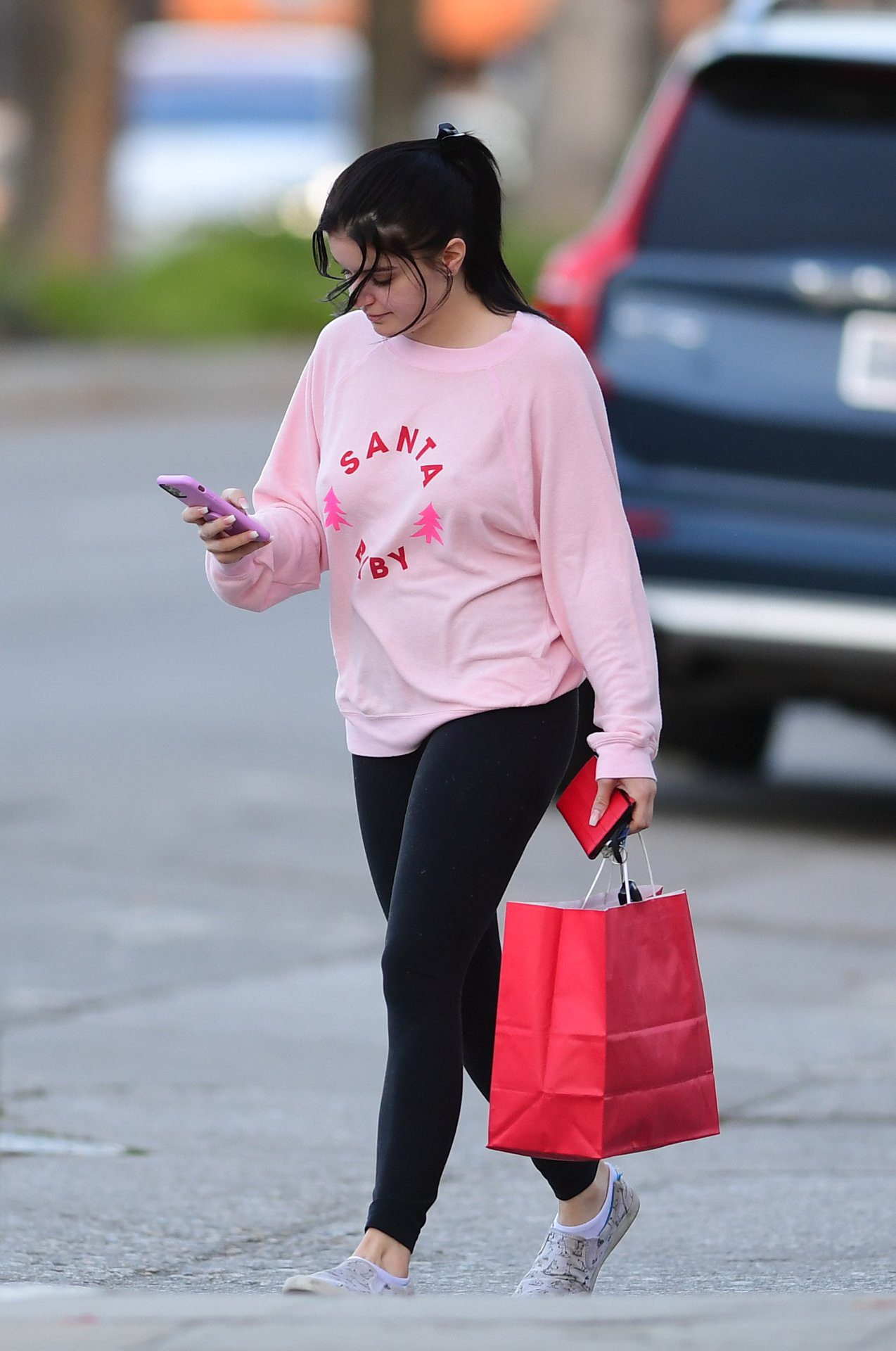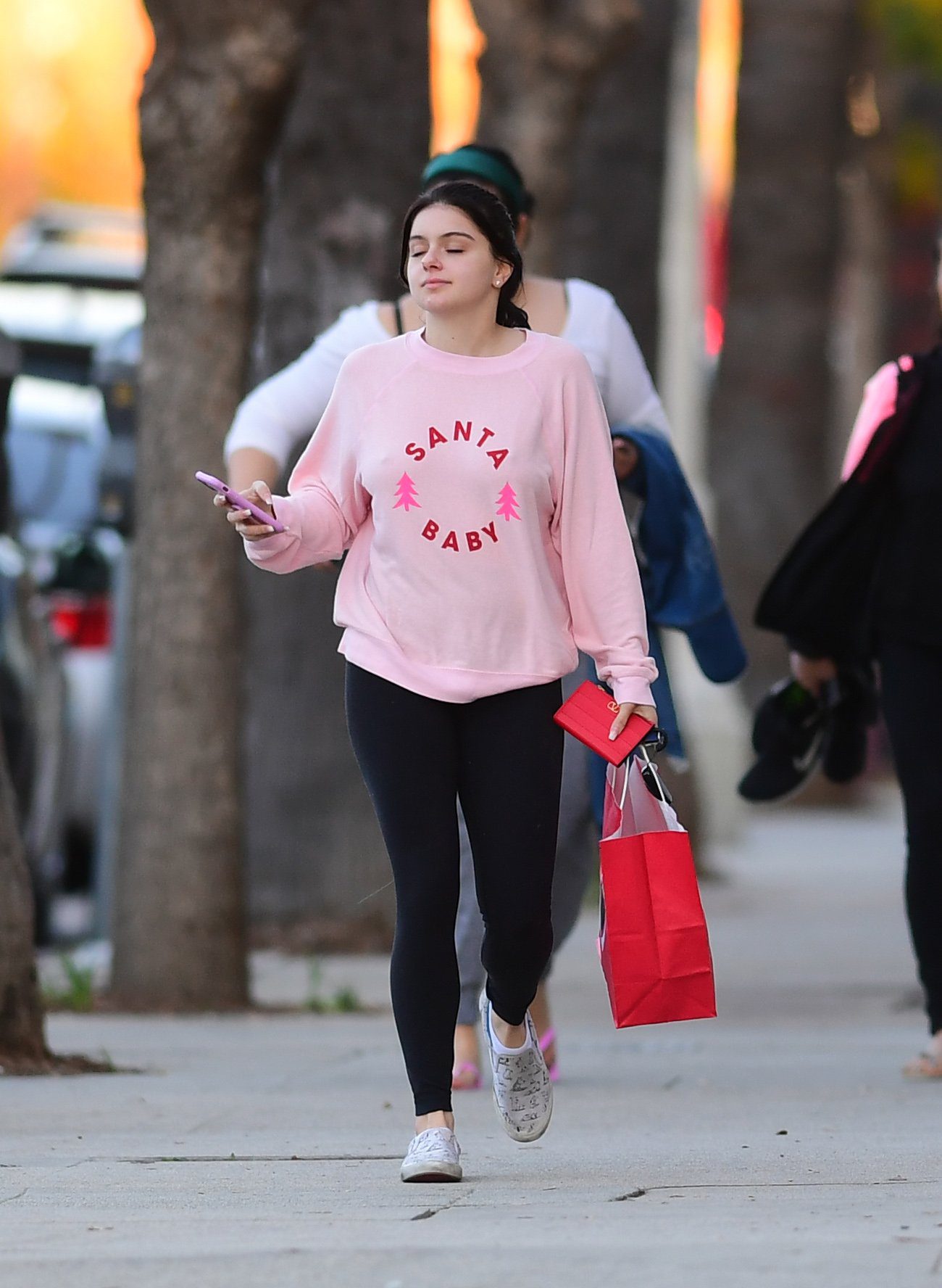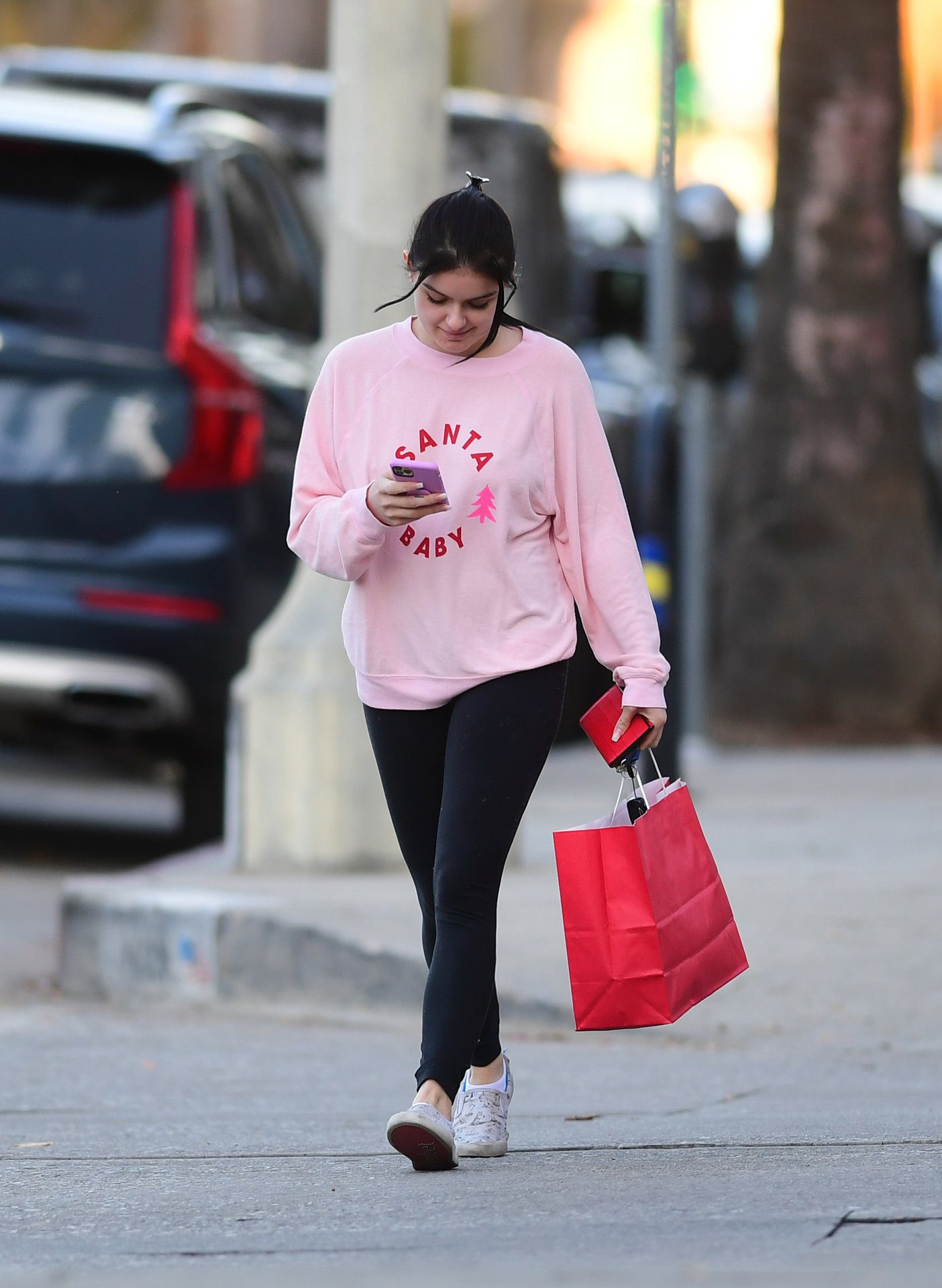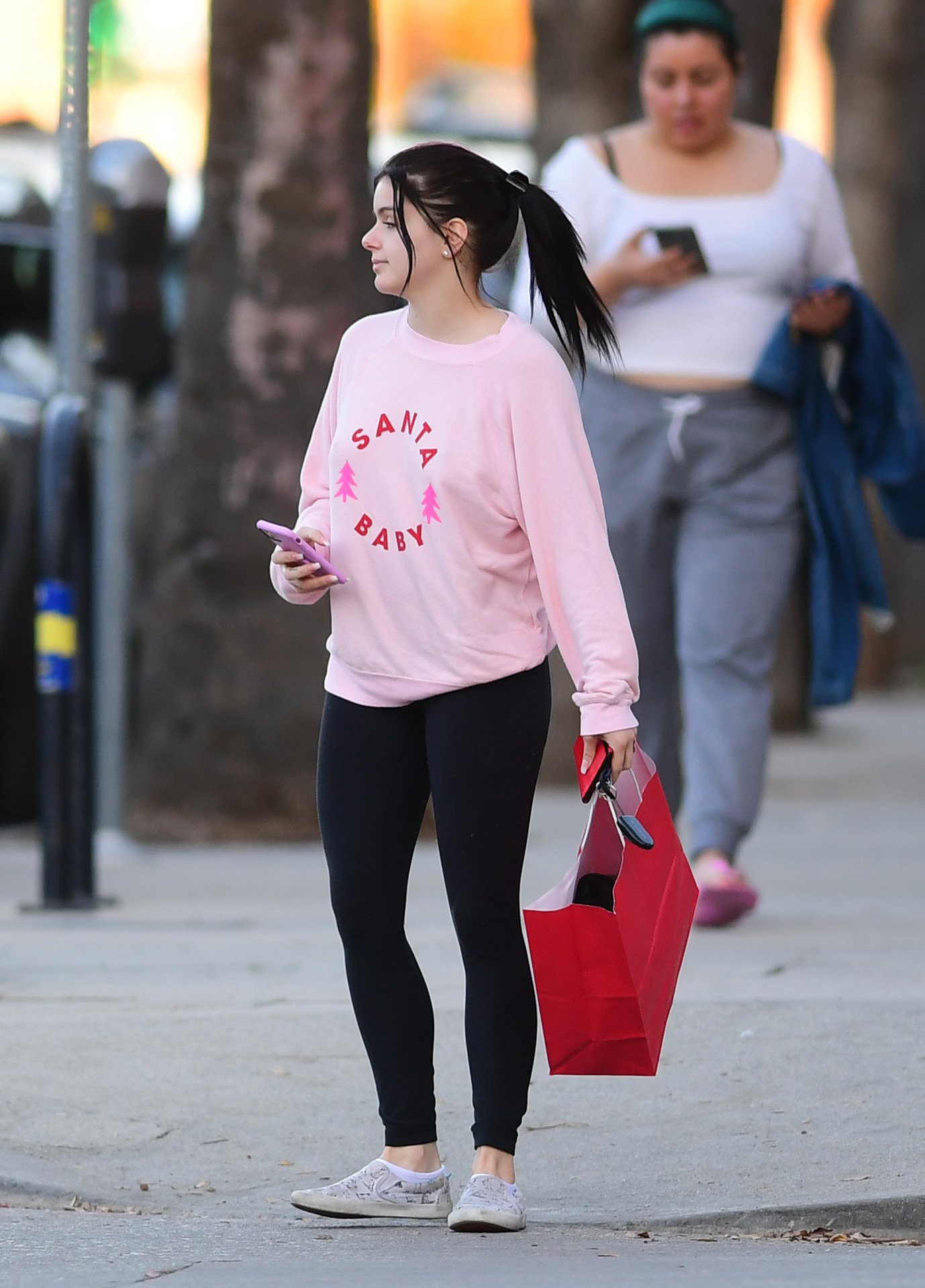 Ariel Winter was pictured out shopping in Los Angeles, 12/18/2019. The 21-year-old “Modern Family” actress sported a pink “Santa Baby” sweatshirt, black leggings, and Bucketfeet shoes.