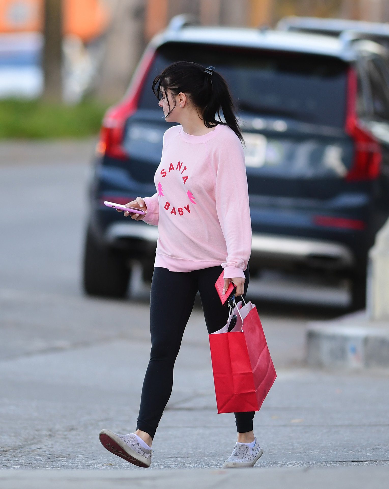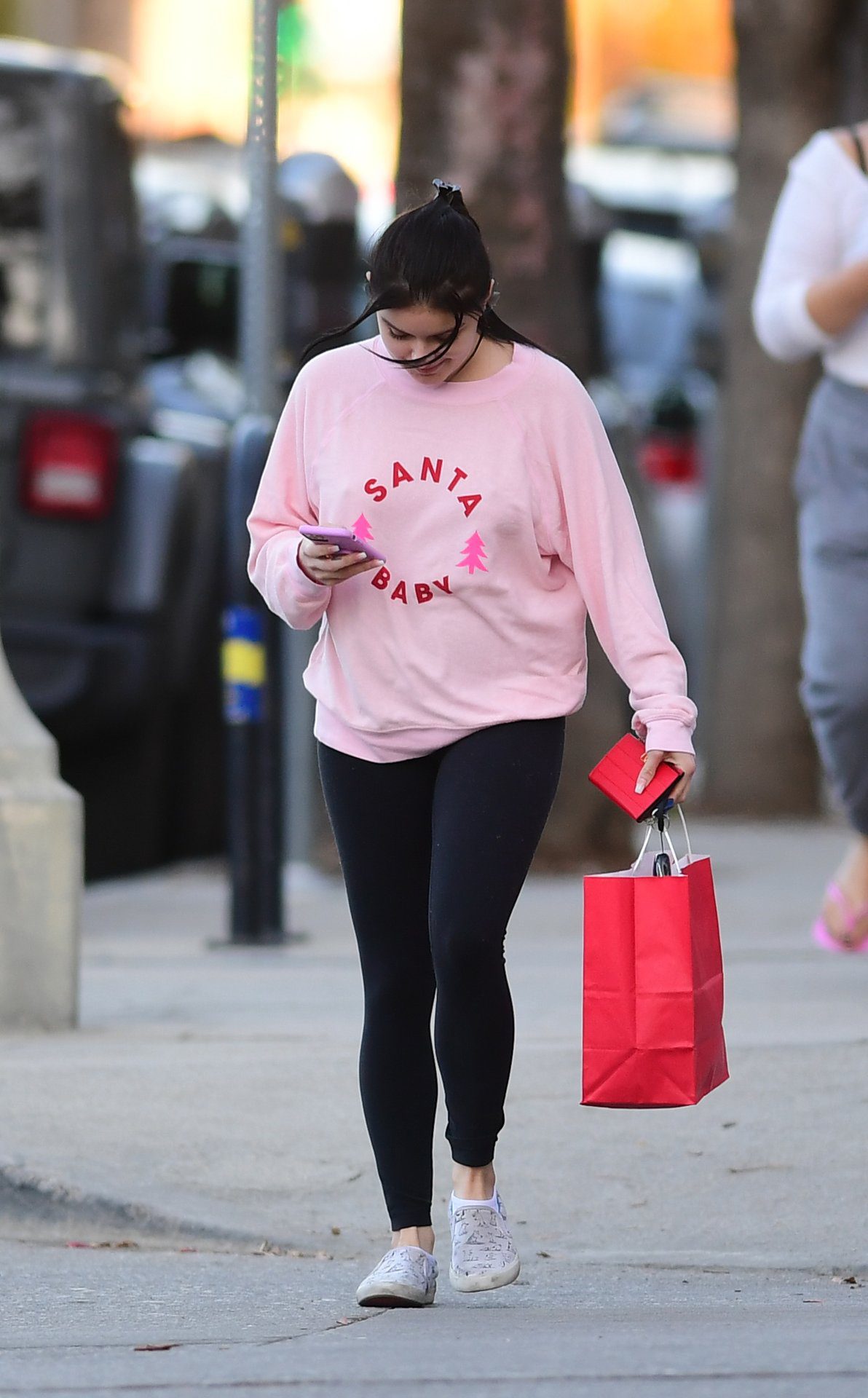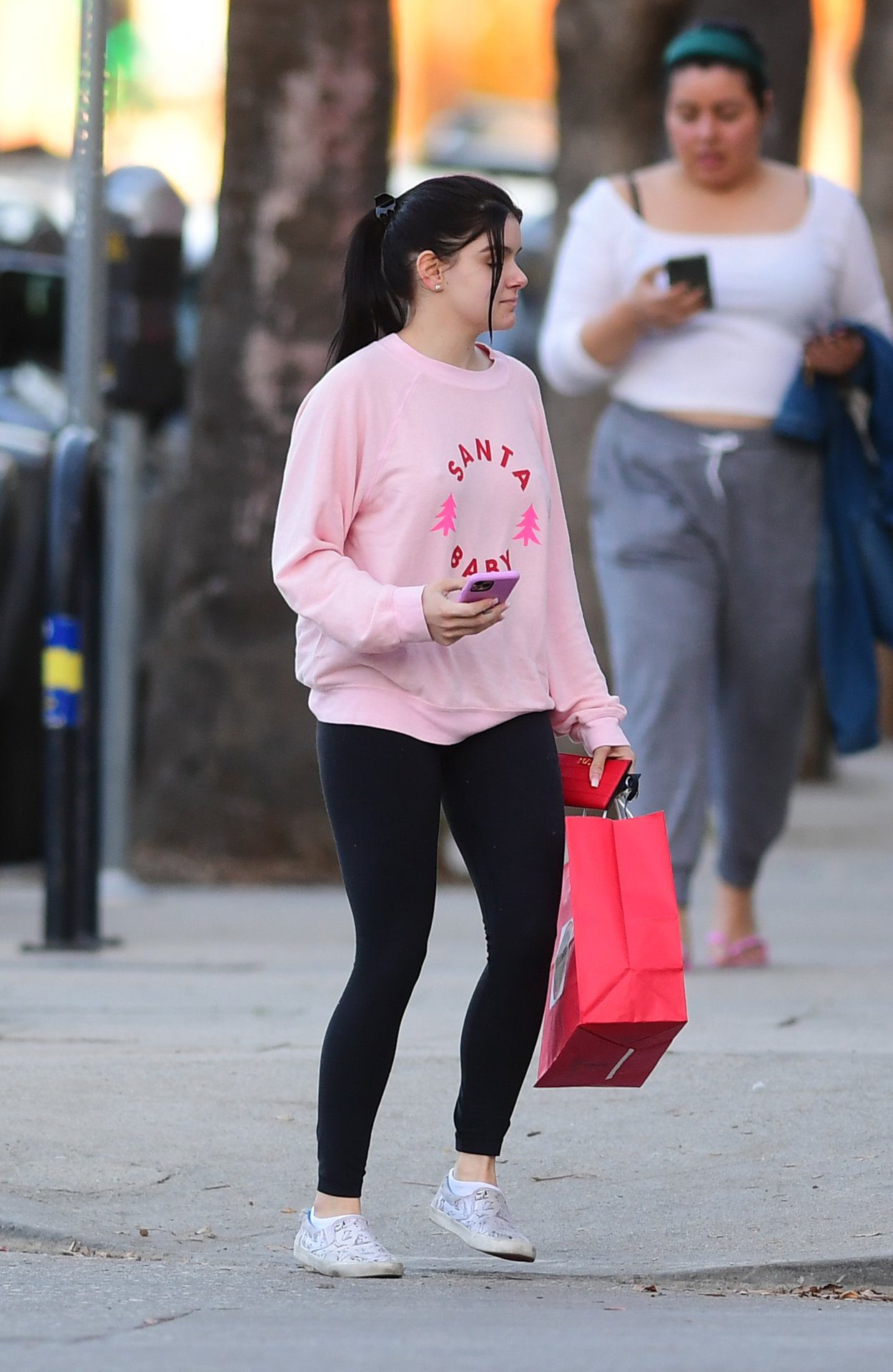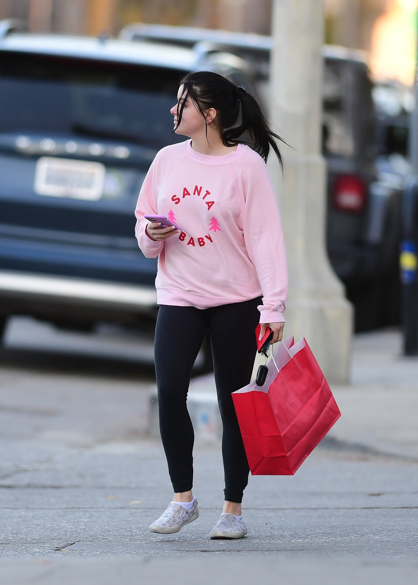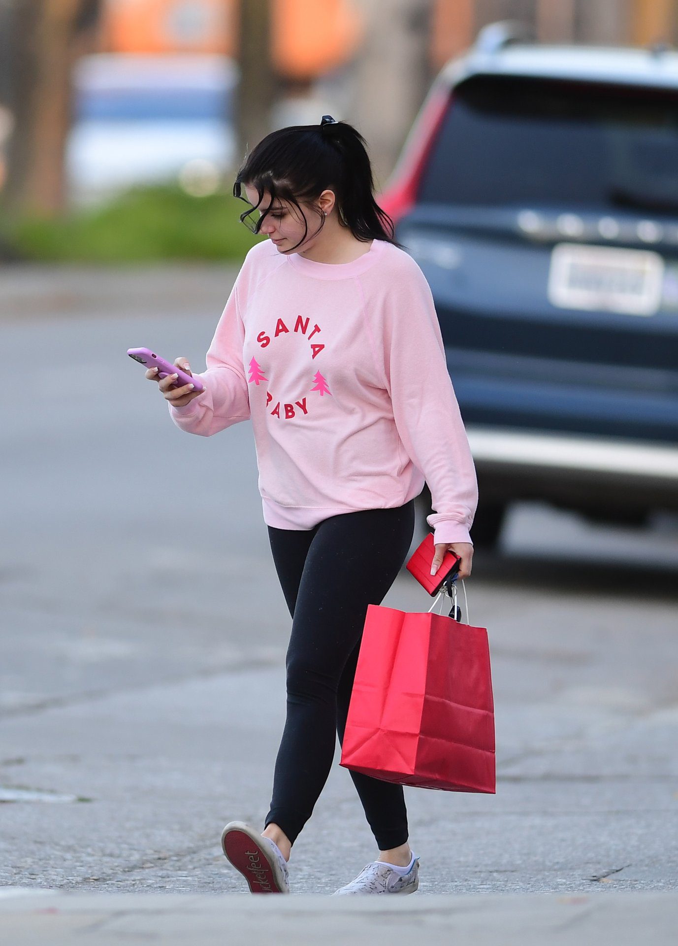 Ariel Winter was pictured out shopping in Los Angeles, 12/18/2019. The 21-year-old “Modern Family” actress sported a pink “Santa Baby” sweatshirt, black leggings, and Bucketfeet shoes.