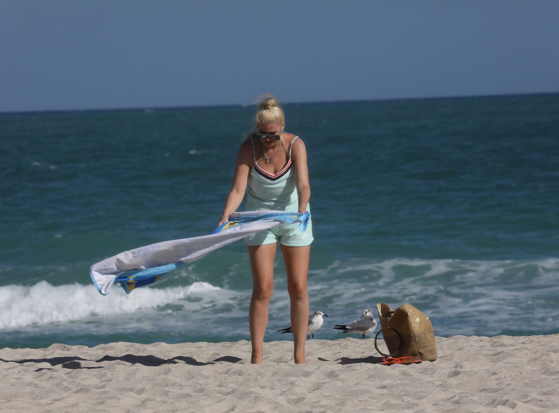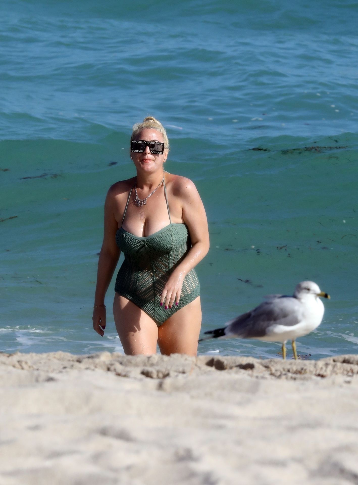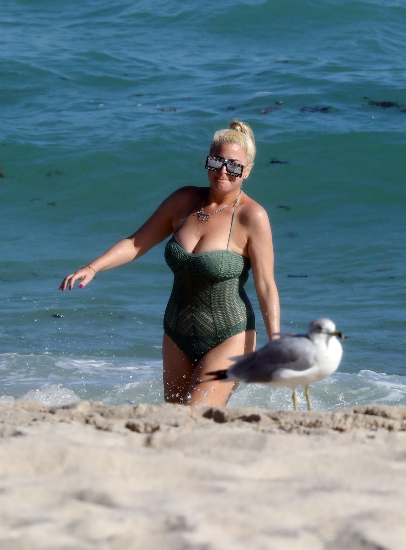Dr. Phil guest star and former Playboy model Josie Goldberg enjoys a beach day in a knitted green one-piece bikini, 12/17/2019.