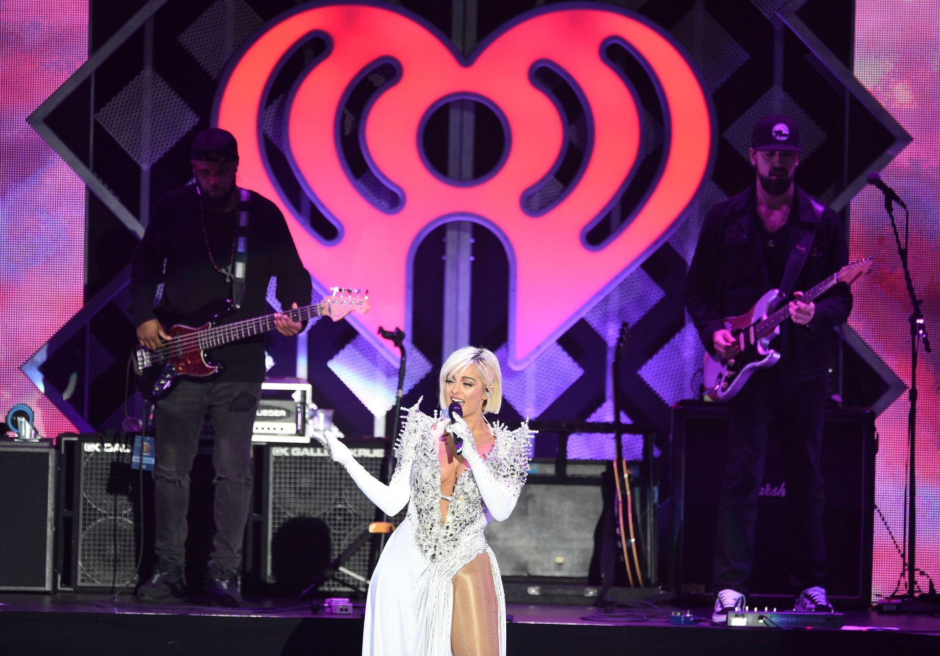 Bebe Rexha performs at Jingle Ball at The Forum in Inglewood, 11/30/2018. The singer showed off a deep cleavage wearing a really chic dress.