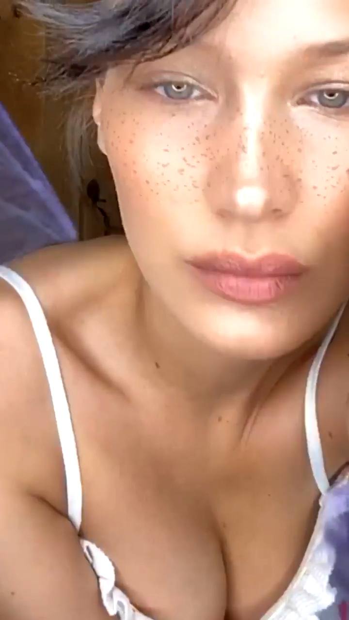 Bella Hadid shows sexy boobs and nipples wearing sheer white shirt in sexy photoshoot.