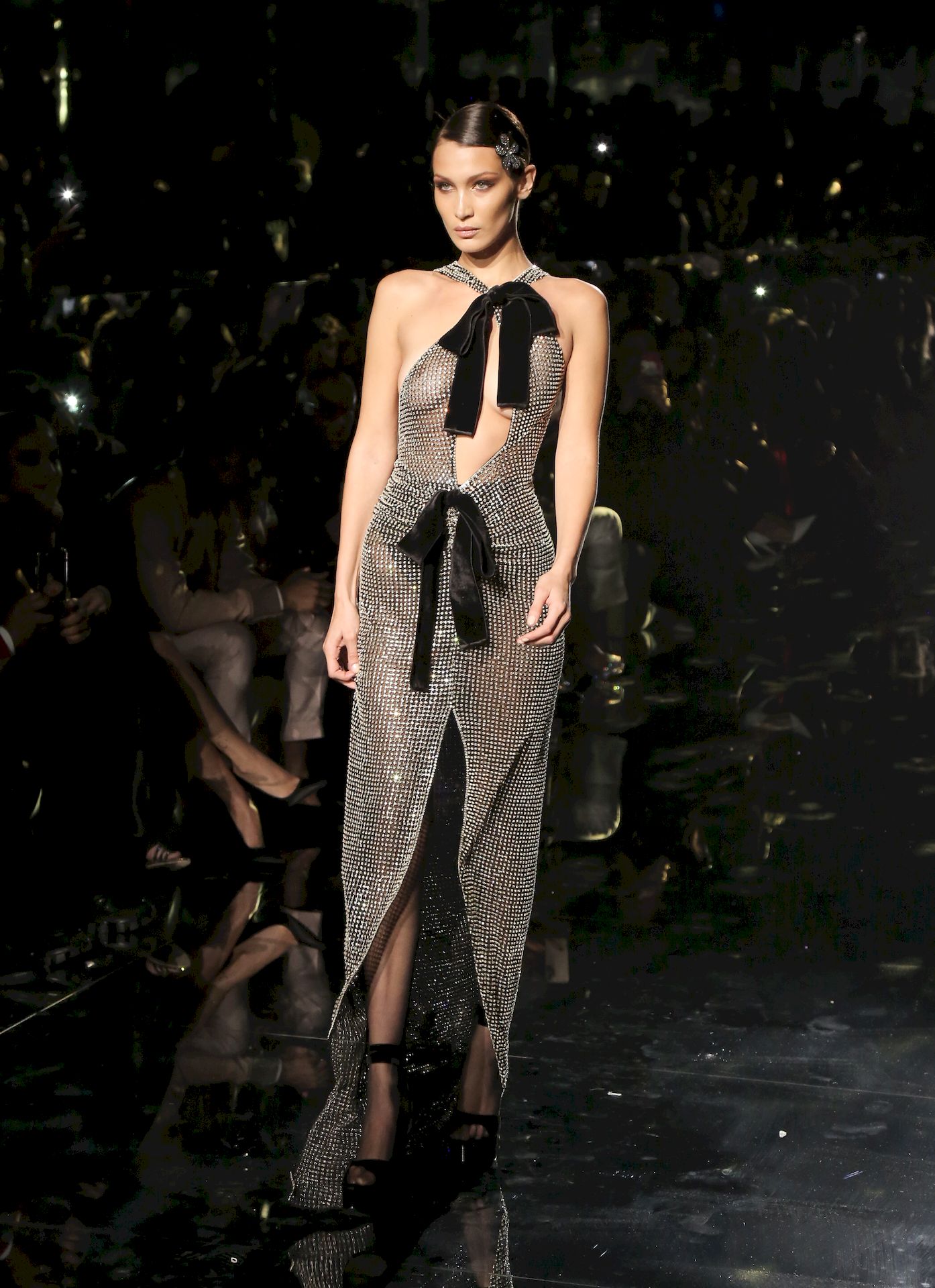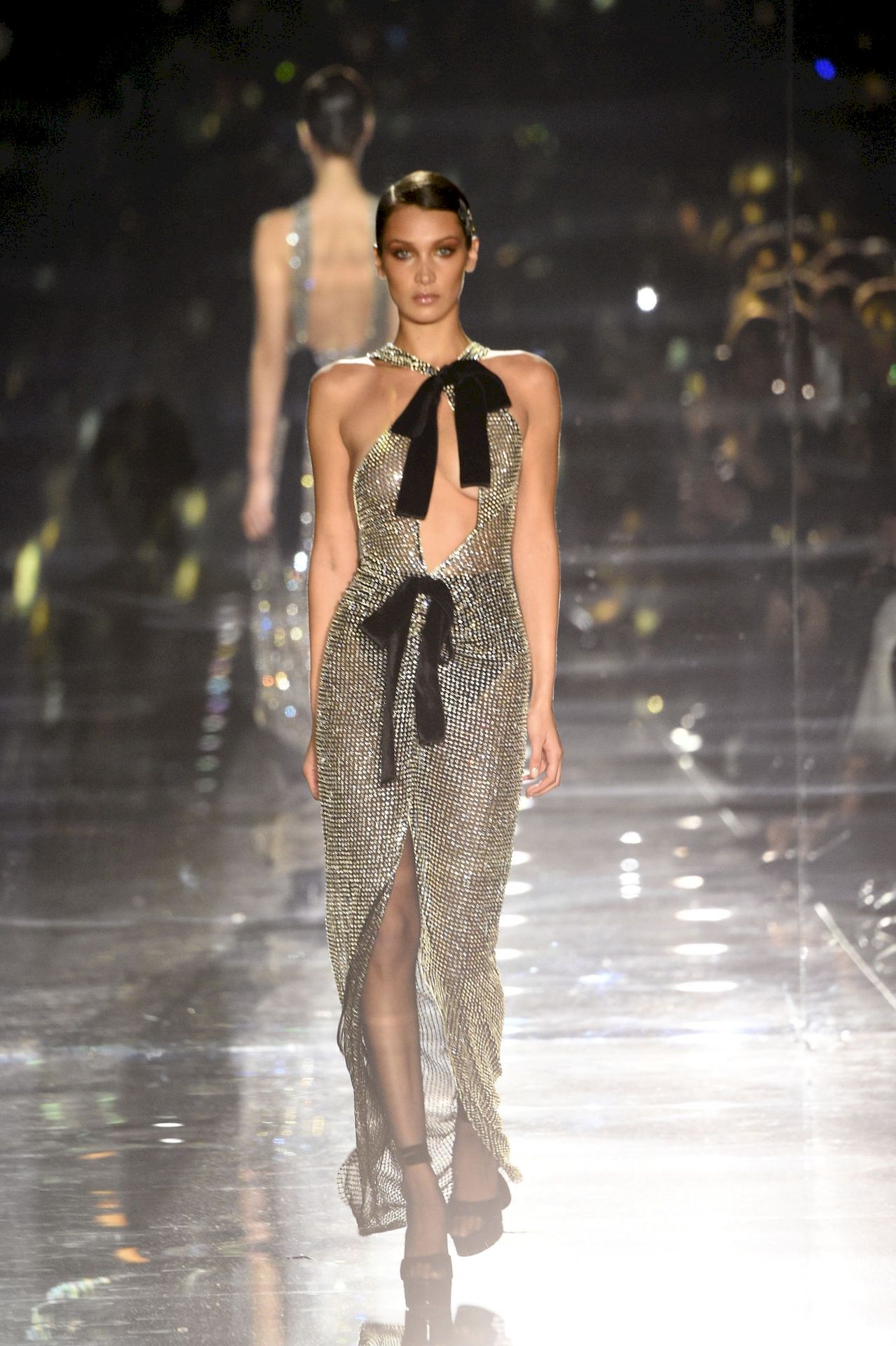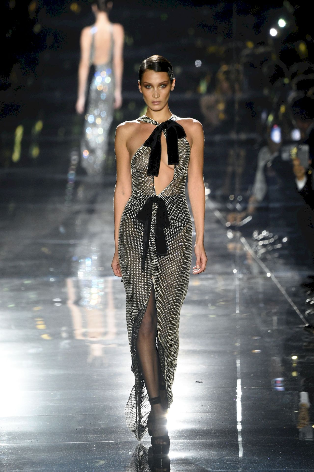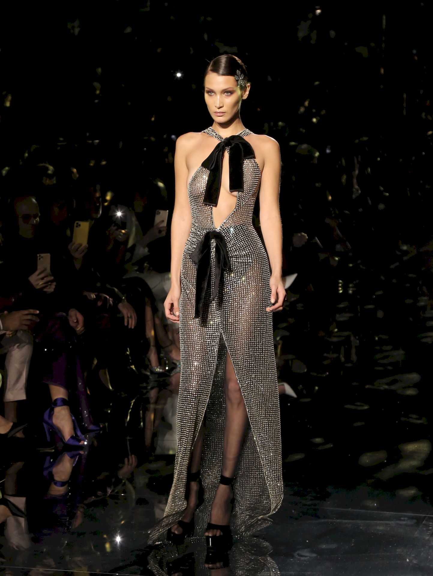 Model Bella Hadid walks the runway in a see-through dress, showing off her nude tits for all guests of the fashion show in Hollywood, 02/07/2020.