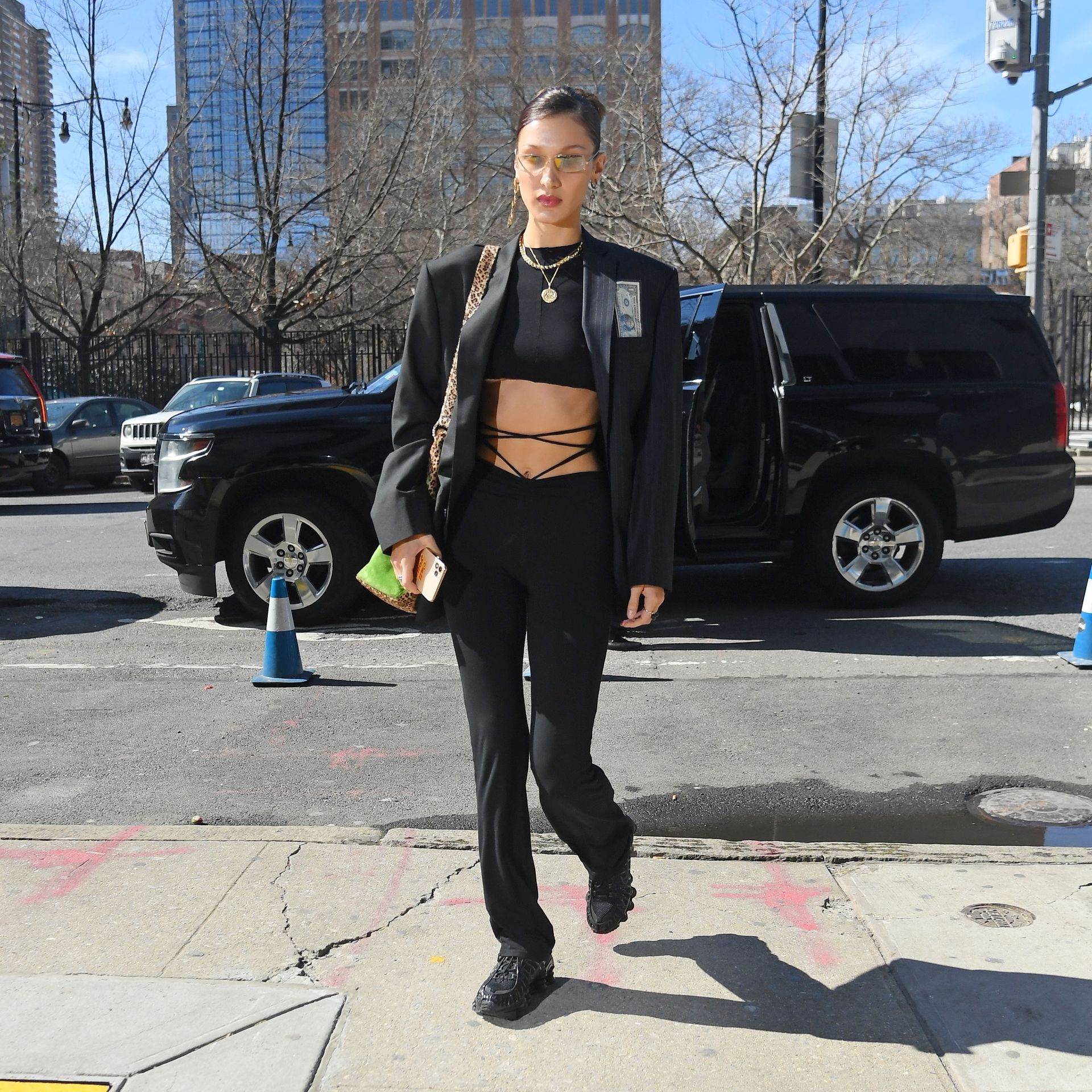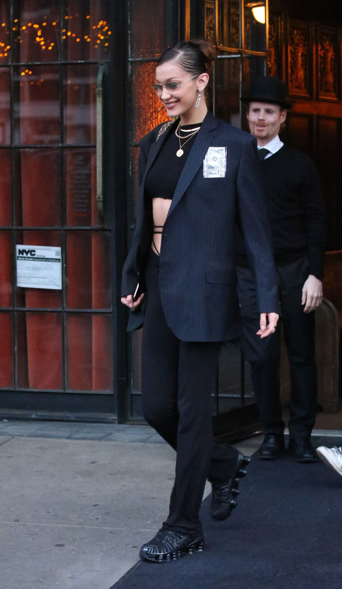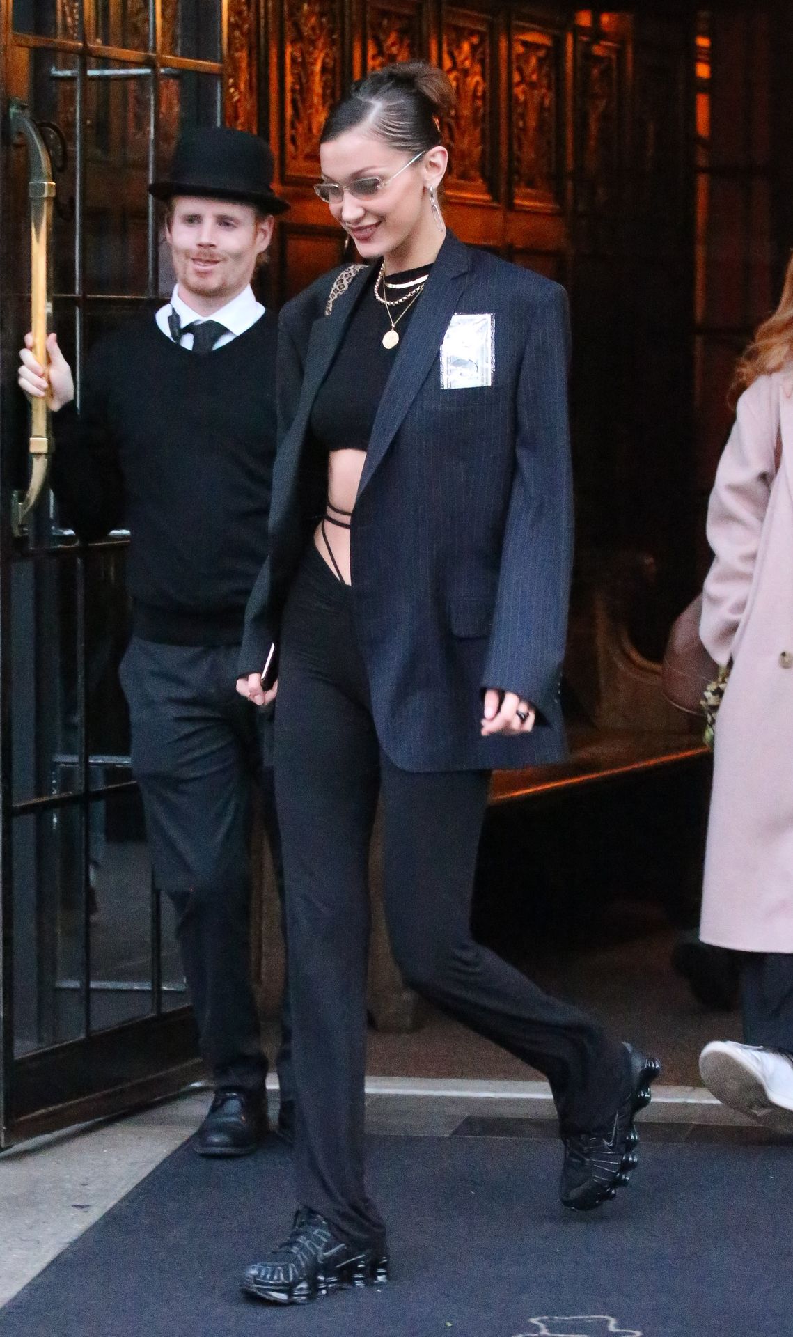 The 23-year-old supermodel just returned from storming the catwalk during Paris Fashion Week. Bella looked in high spirits sporting a black blazer over a black midriff bearing top black trousers and black trainers