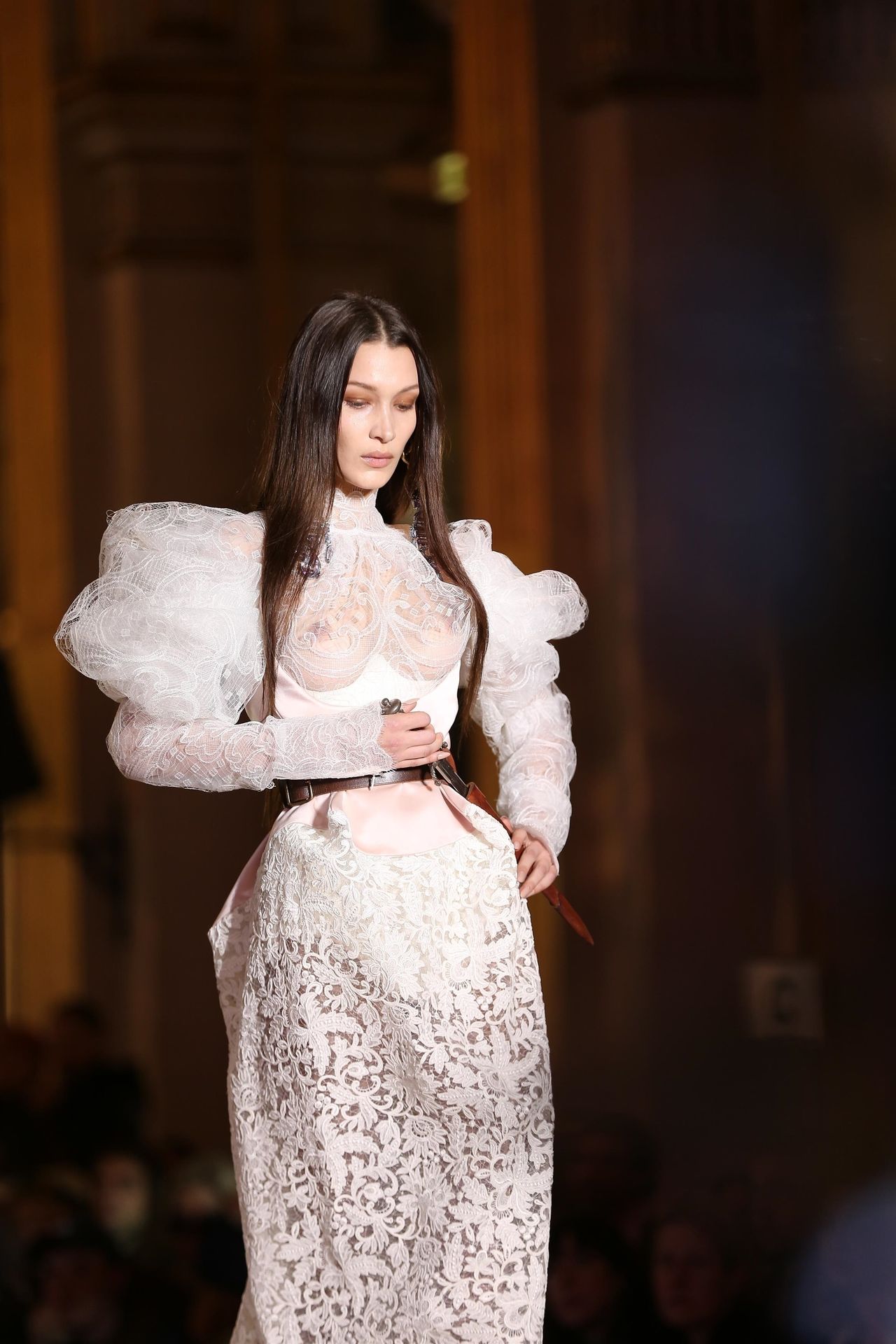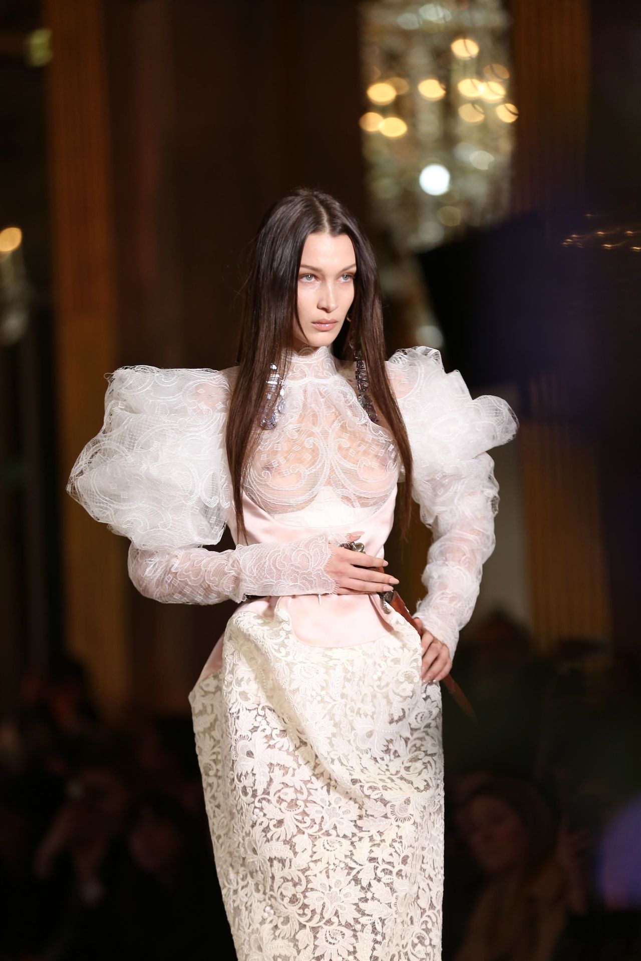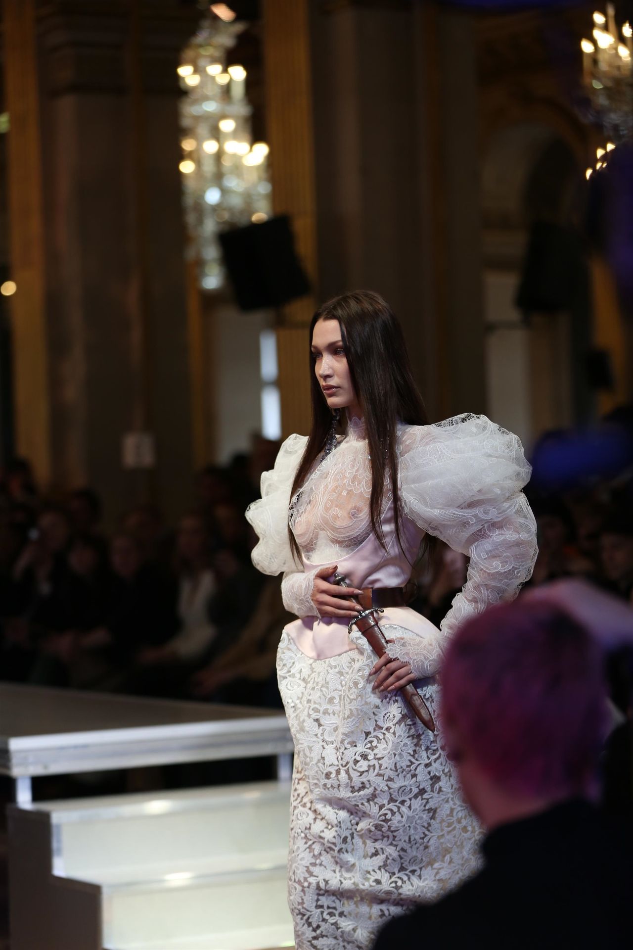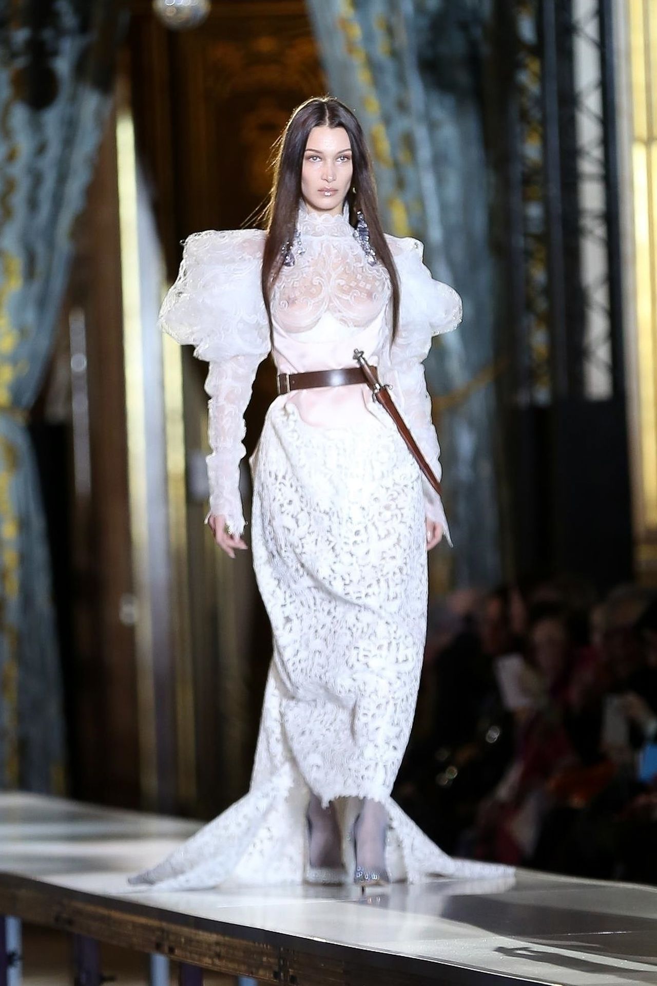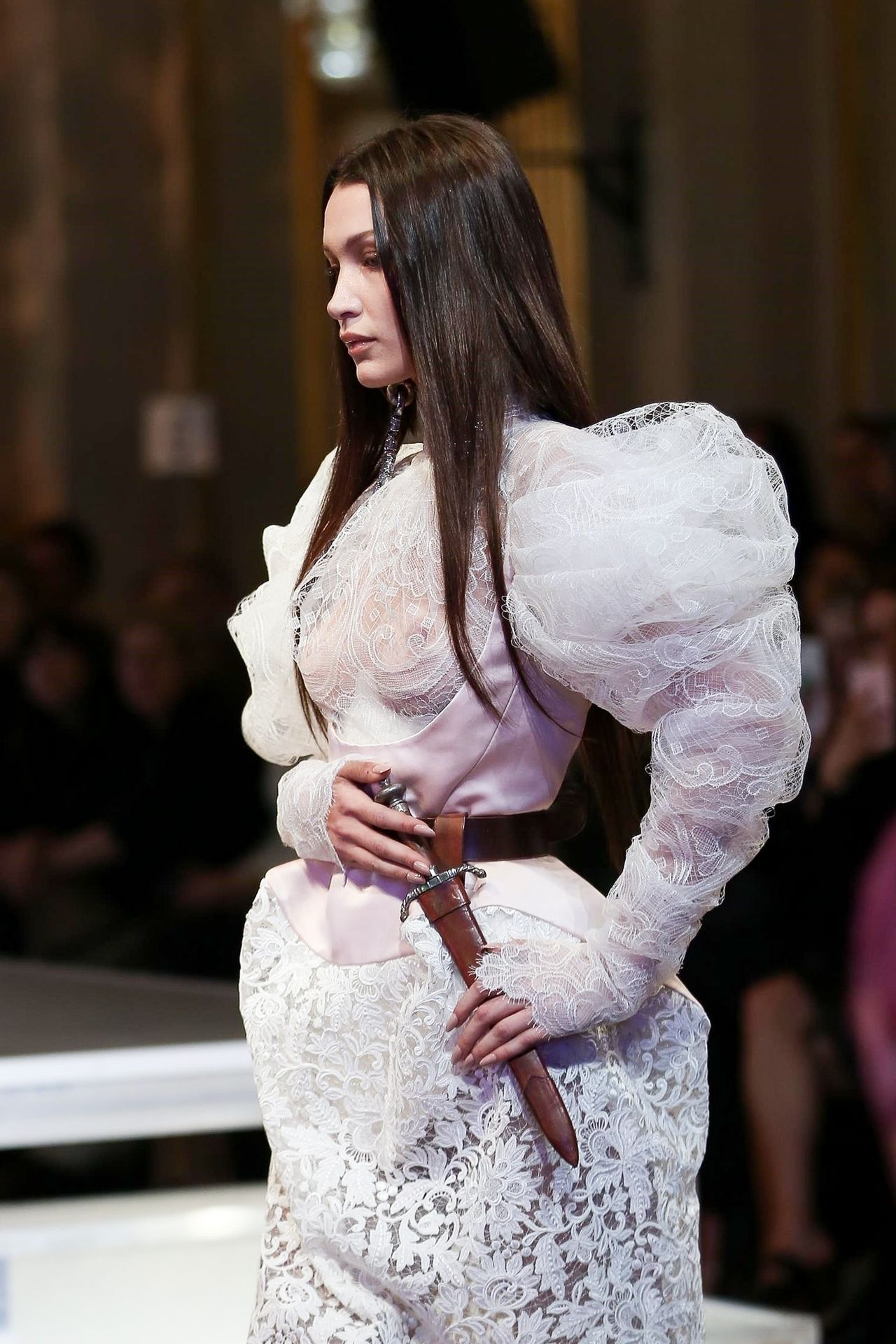 Model Bella Hadid was pictured braless walking the catwalk at the Vivienne Westwood fashion show during Paris Fashion Week, 02/29/2020. Bella will cut off your balls if you look at her tits!