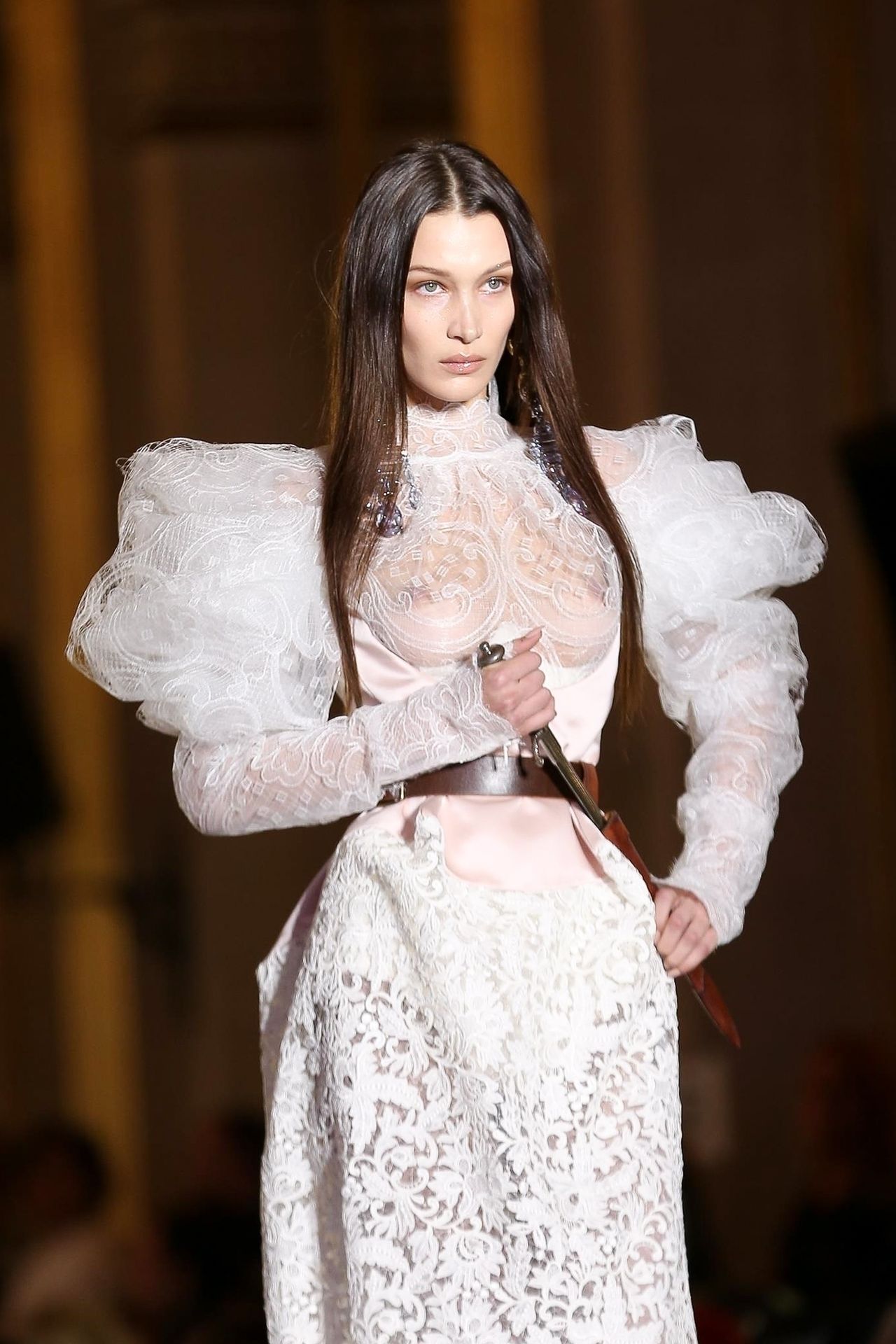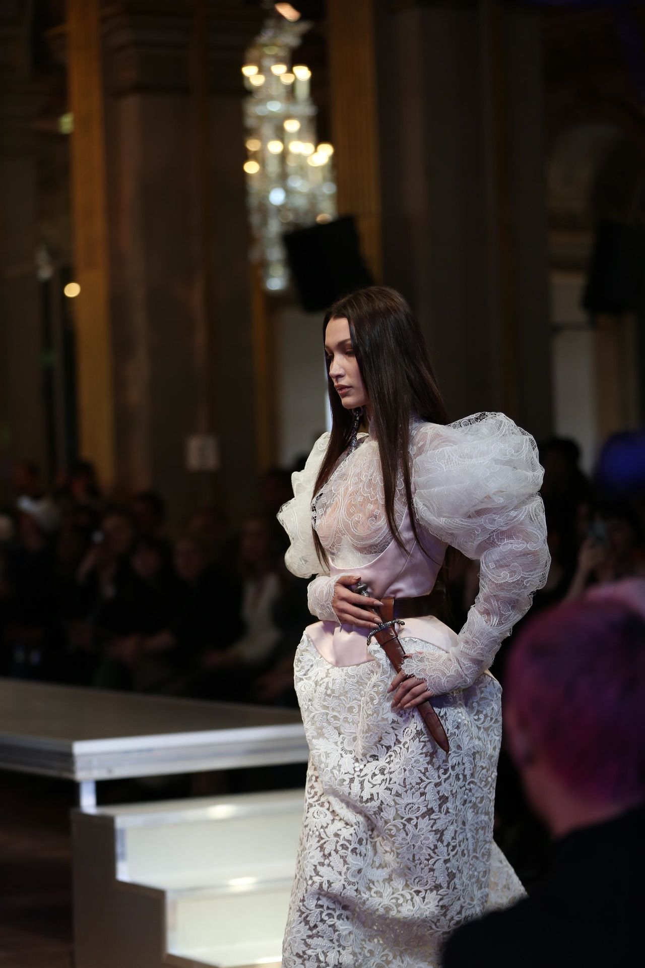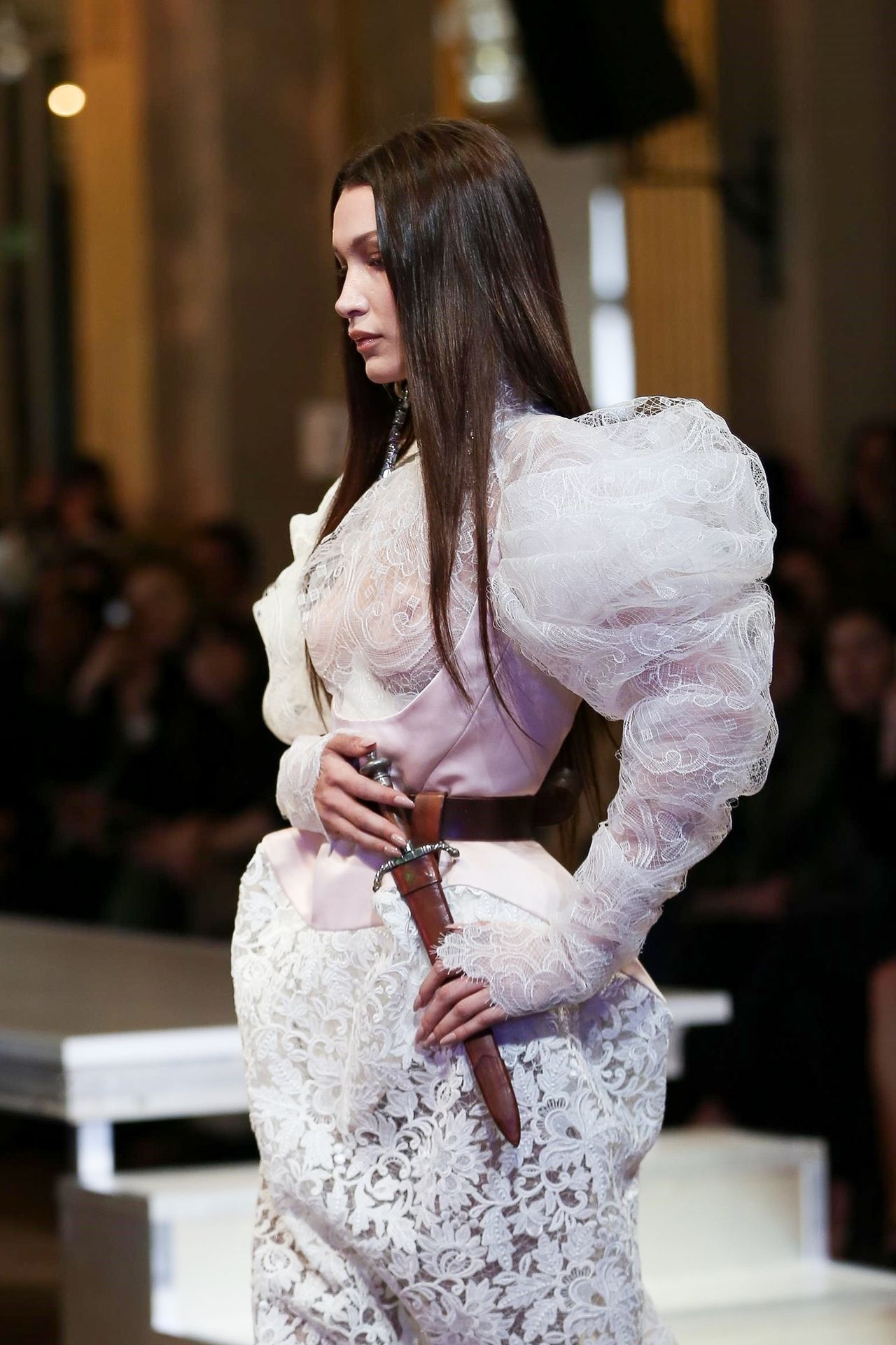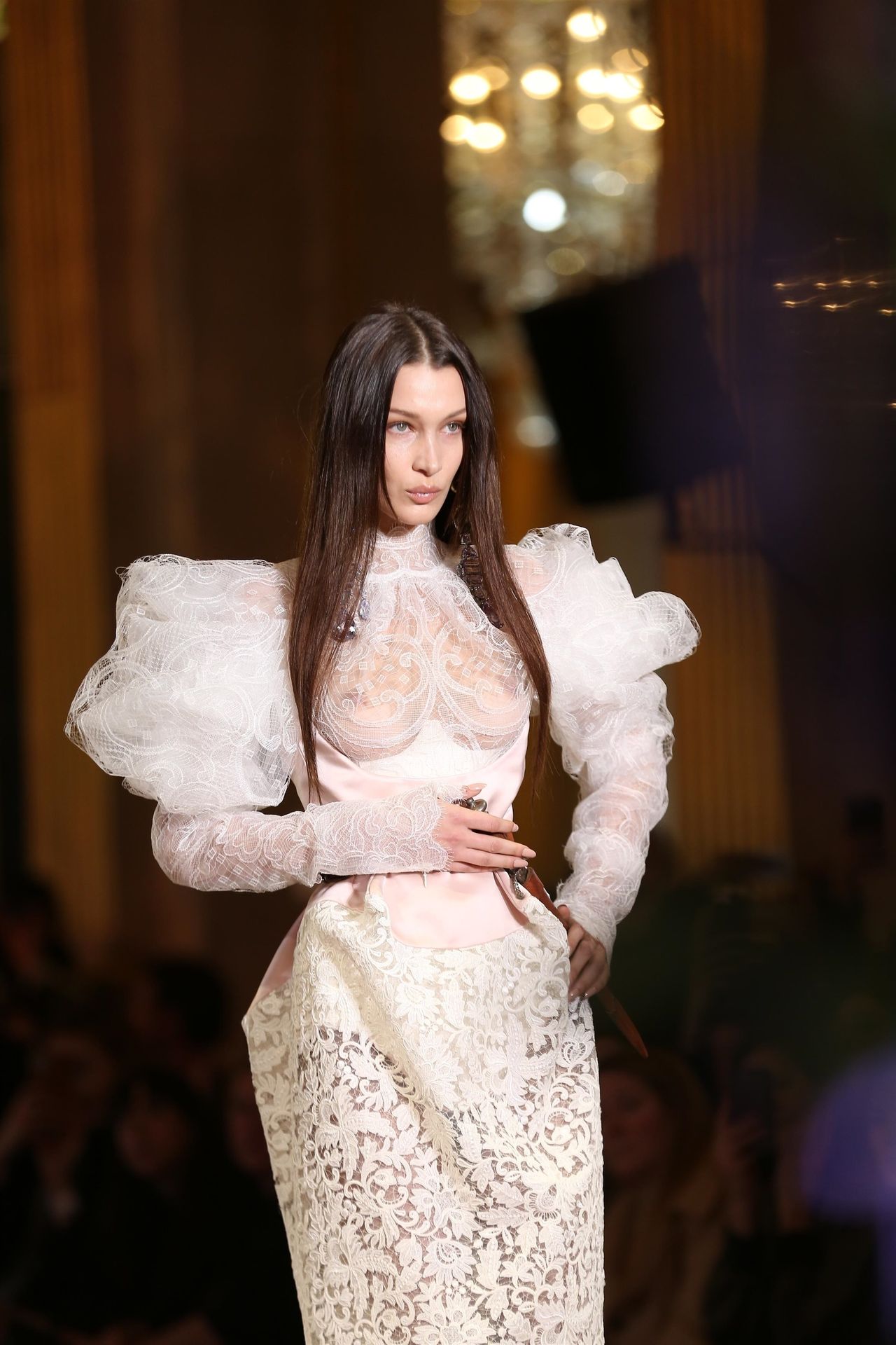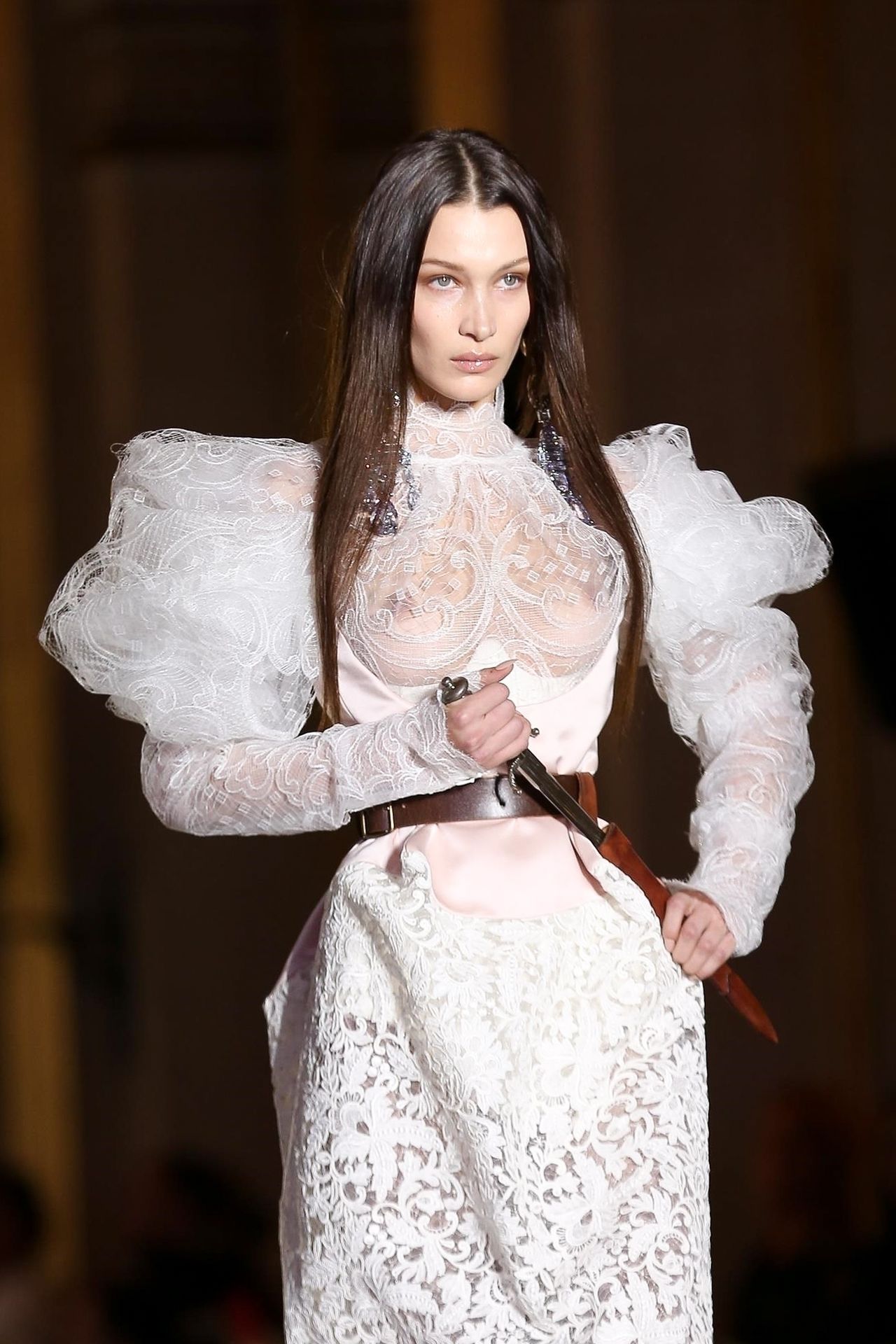 Model Bella Hadid was pictured braless walking the catwalk at the Vivienne Westwood fashion show during Paris Fashion Week, 02/29/2020. Bella will cut off your balls if you look at her tits!