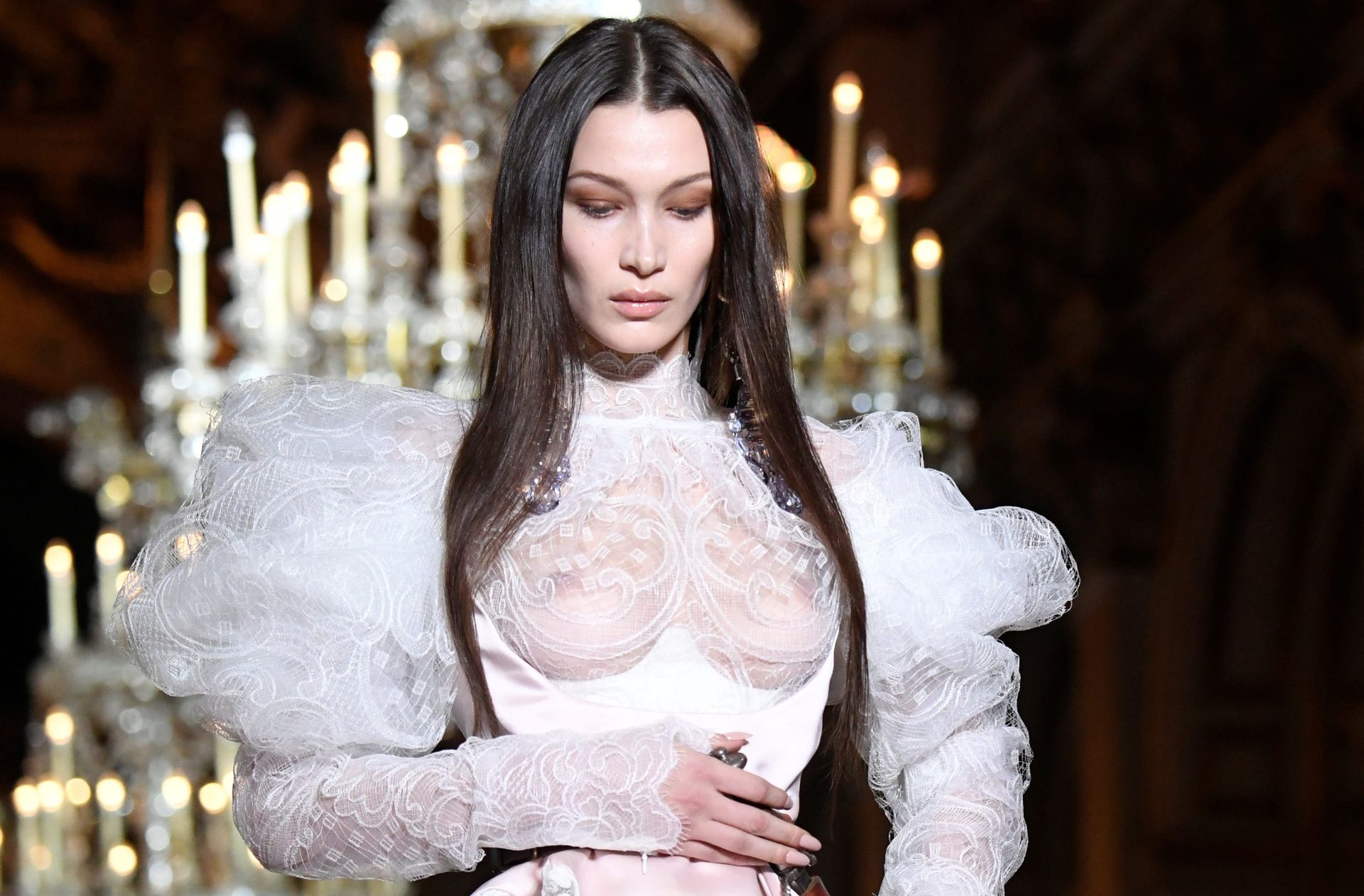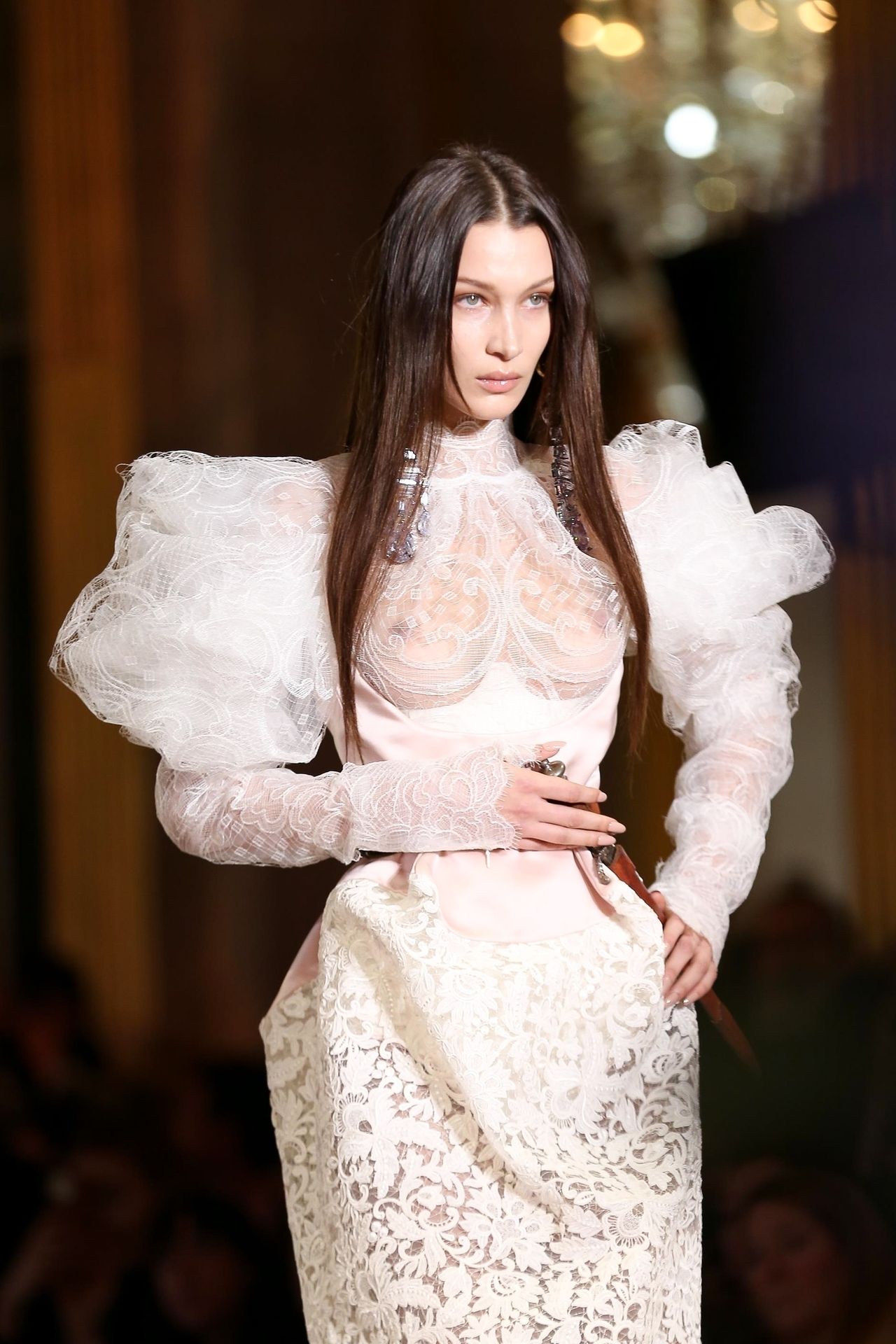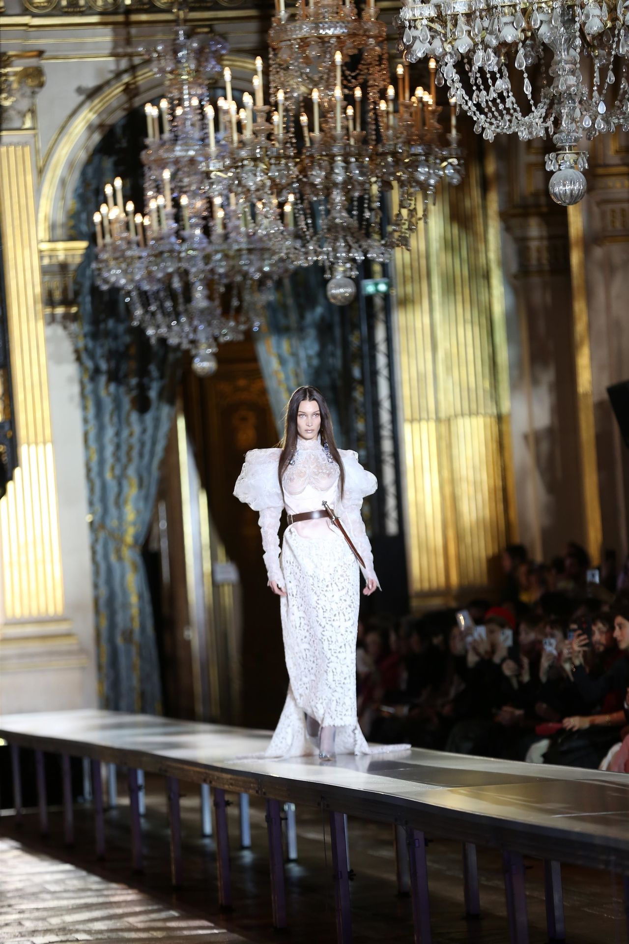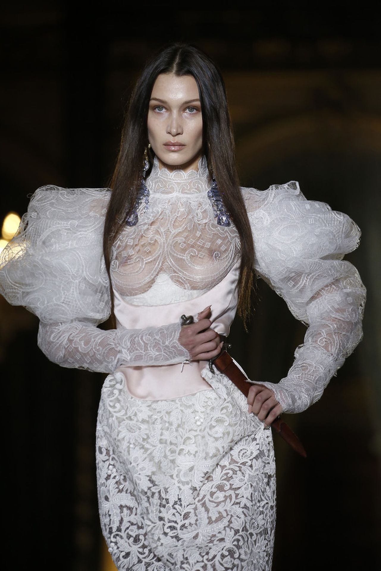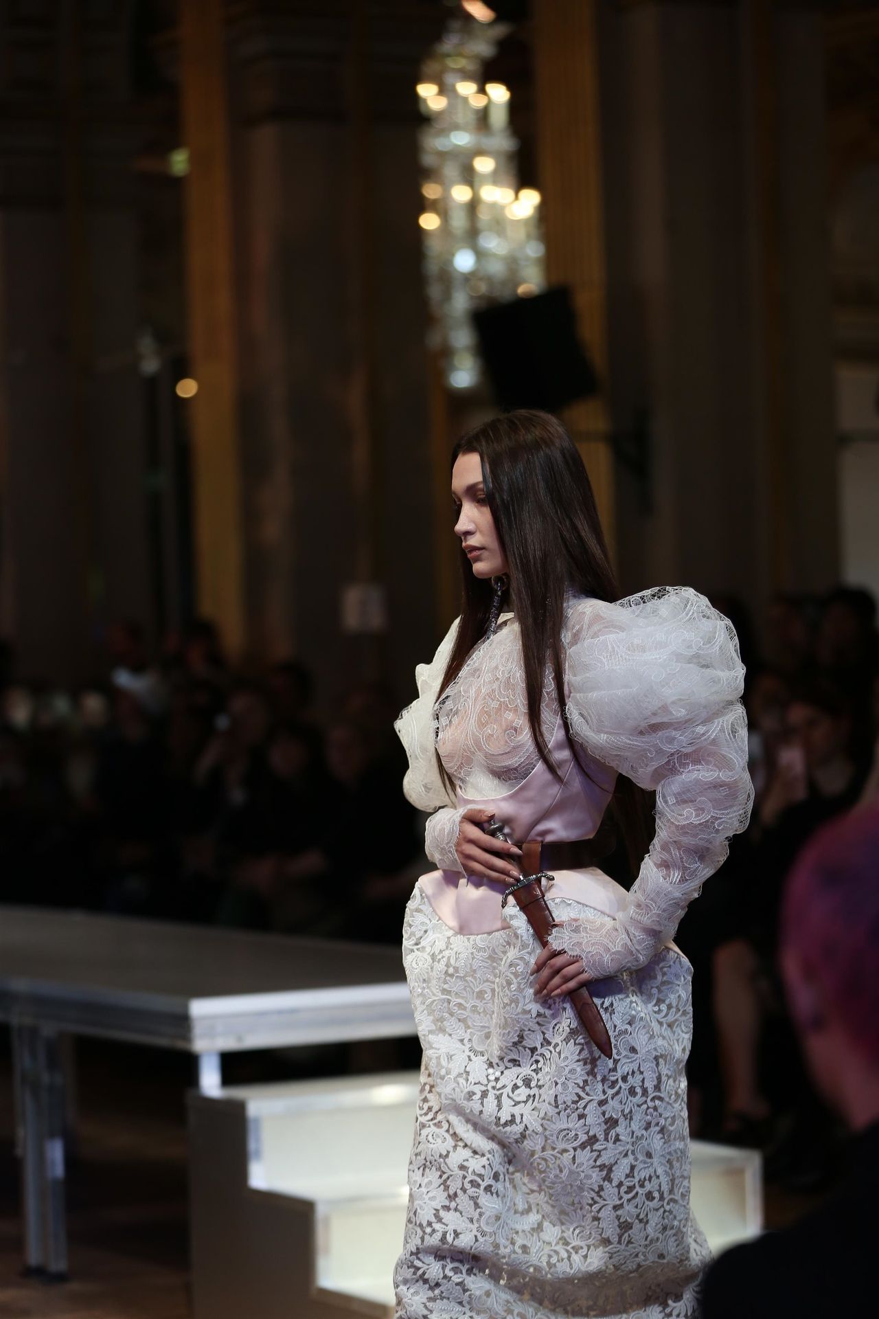 Model Bella Hadid was pictured braless walking the catwalk at the Vivienne Westwood fashion show during Paris Fashion Week, 02/29/2020. Bella will cut off your balls if you look at her tits!