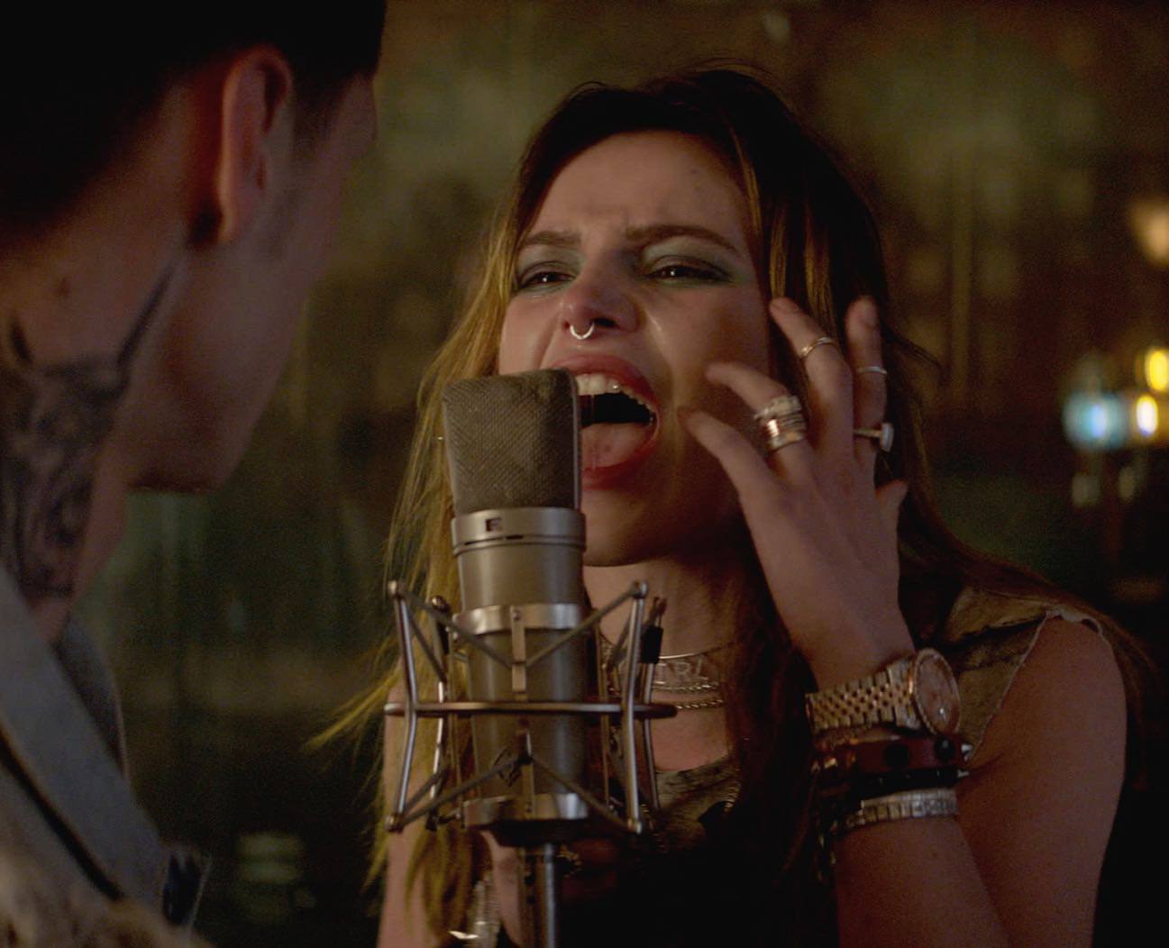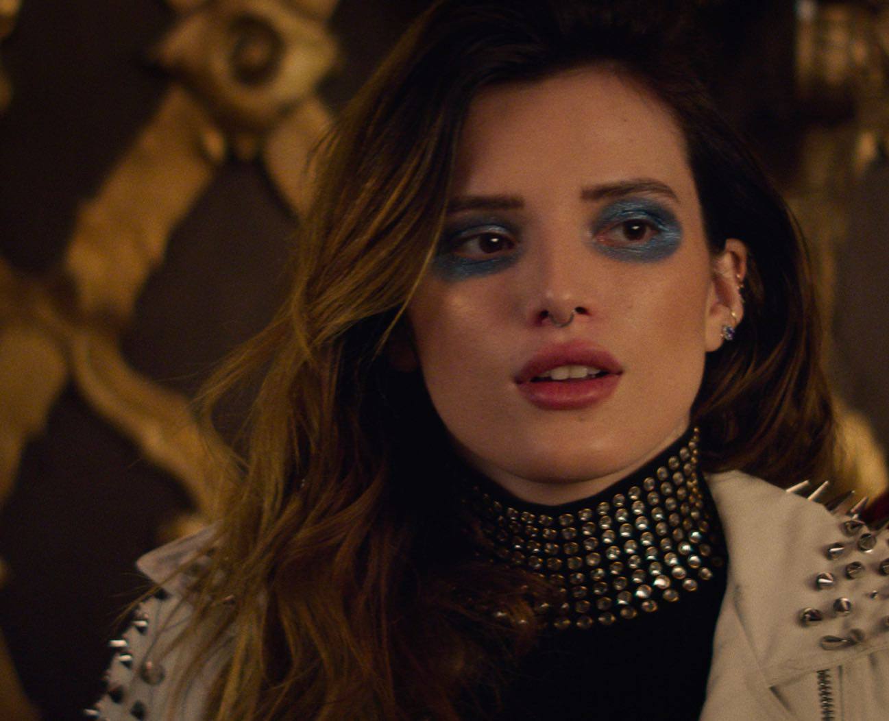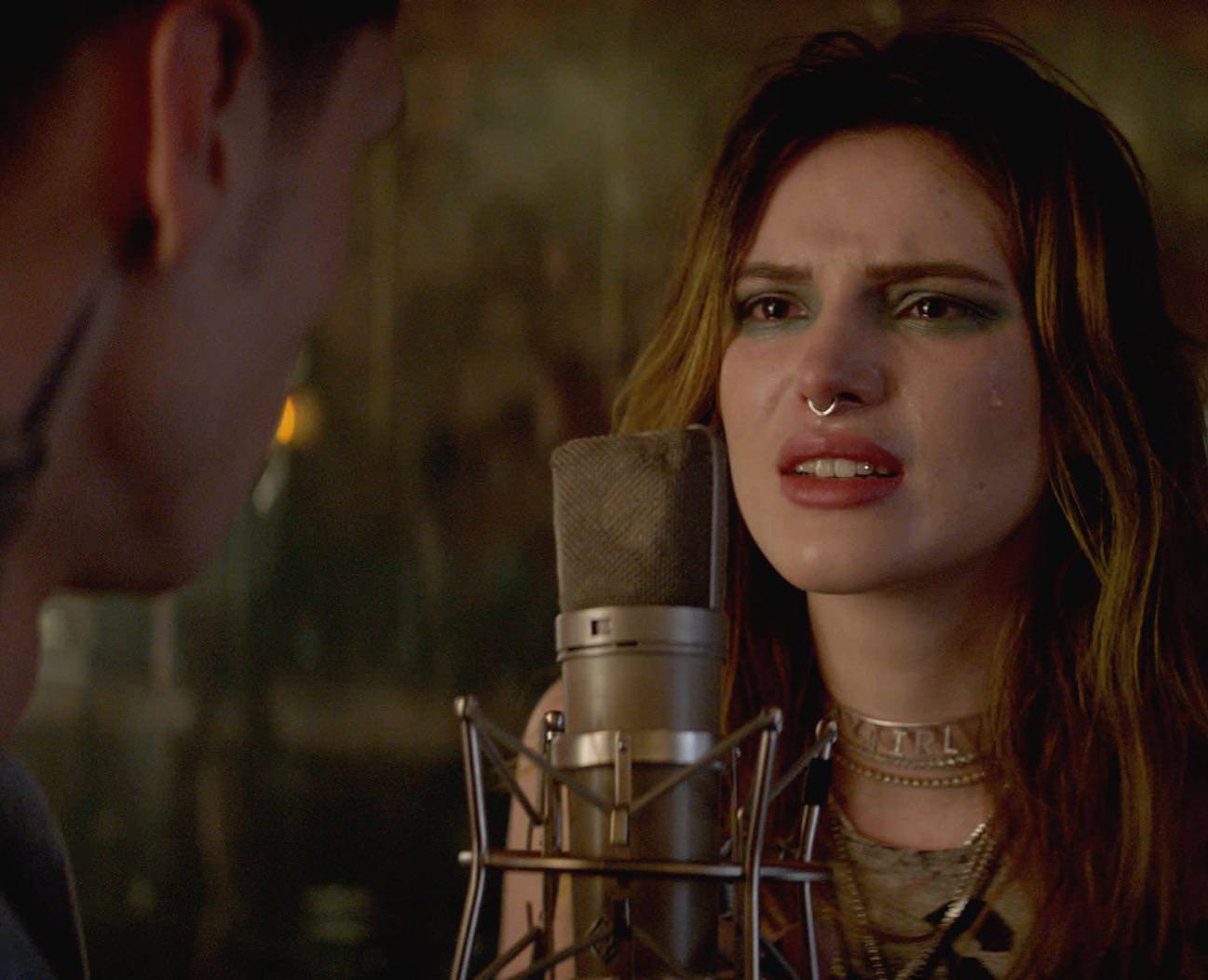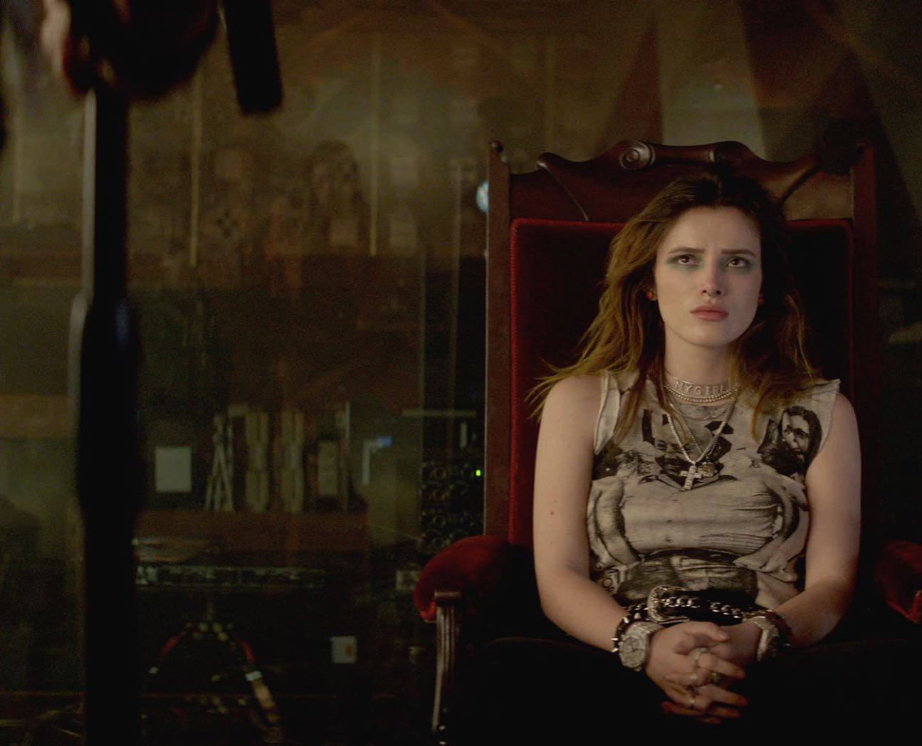 Bella Thorne braless wearing tank top in sexy lesbian orgy in promo for Paradise City TV series.