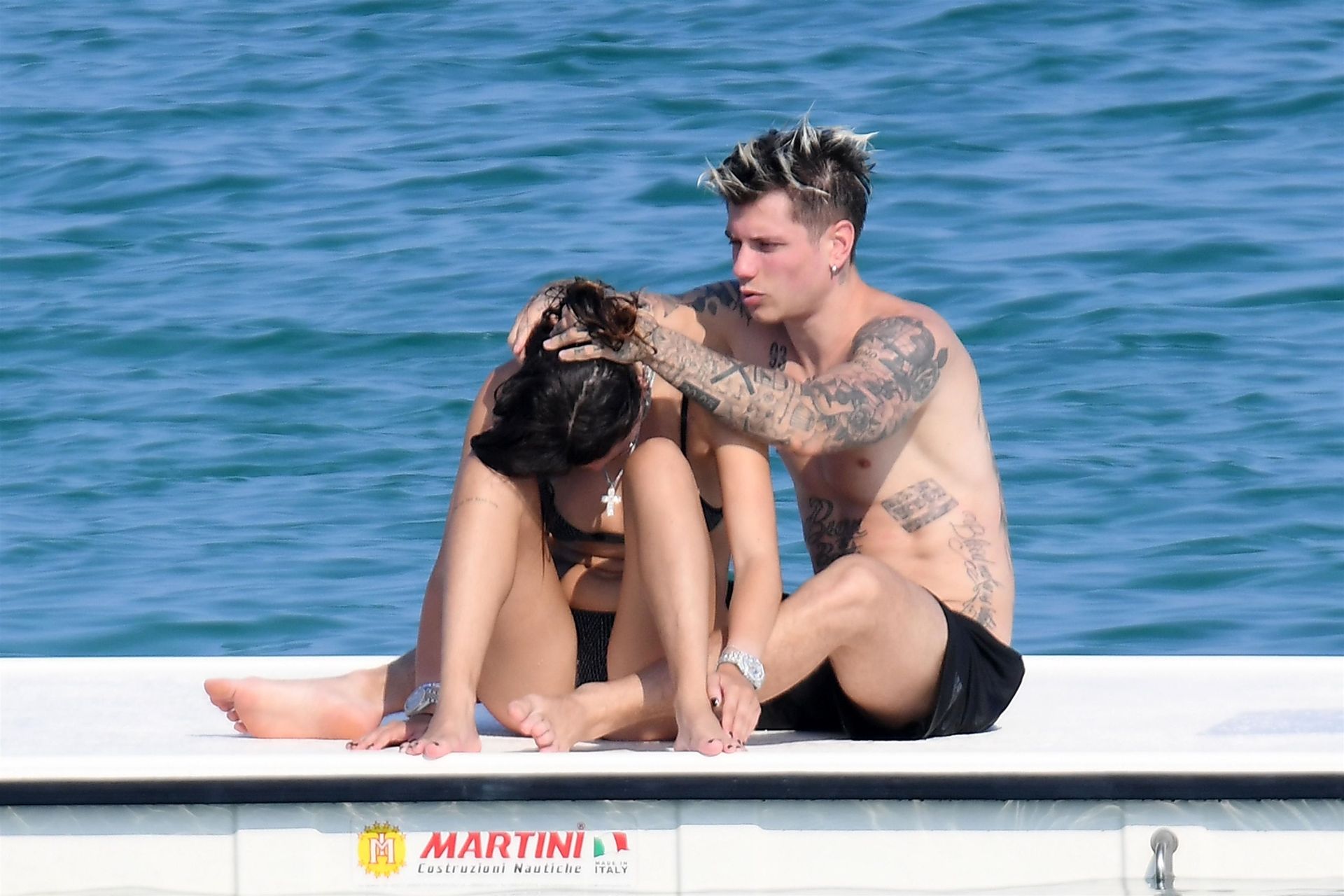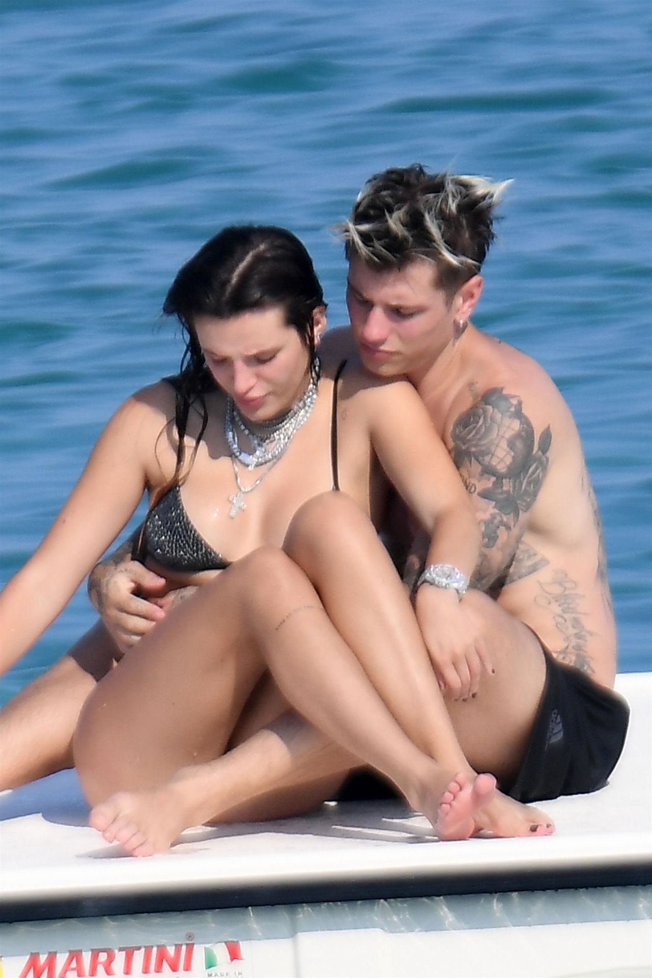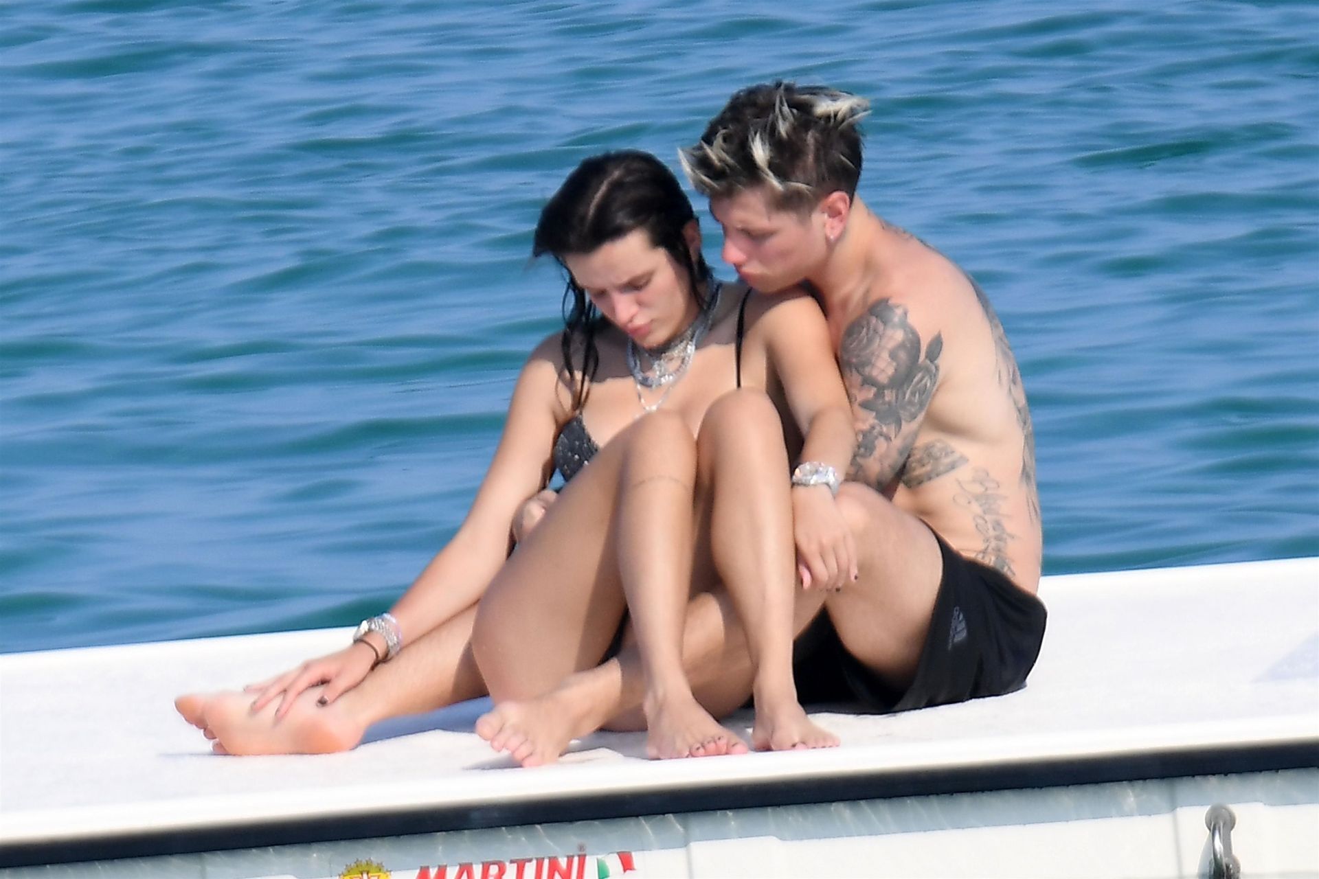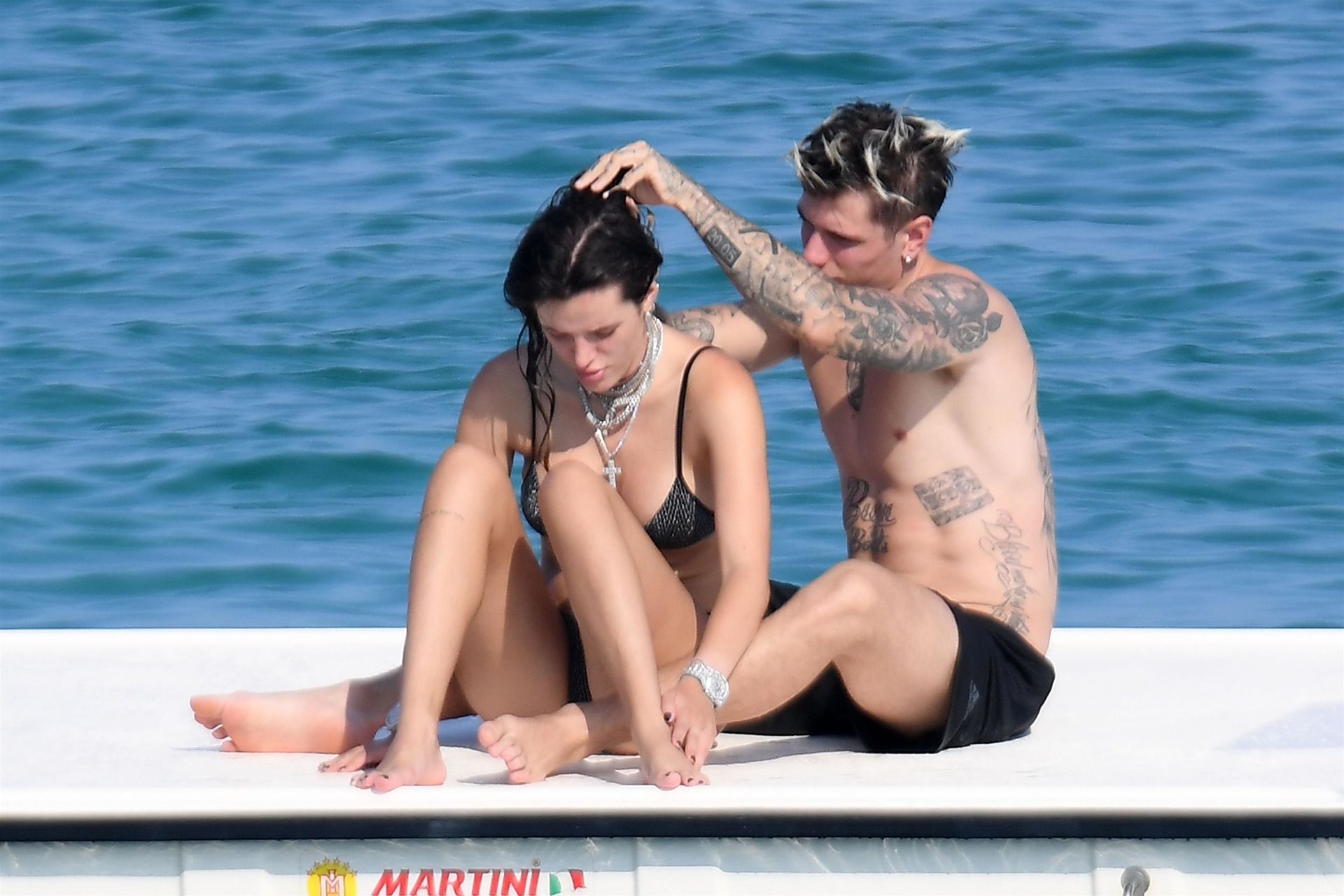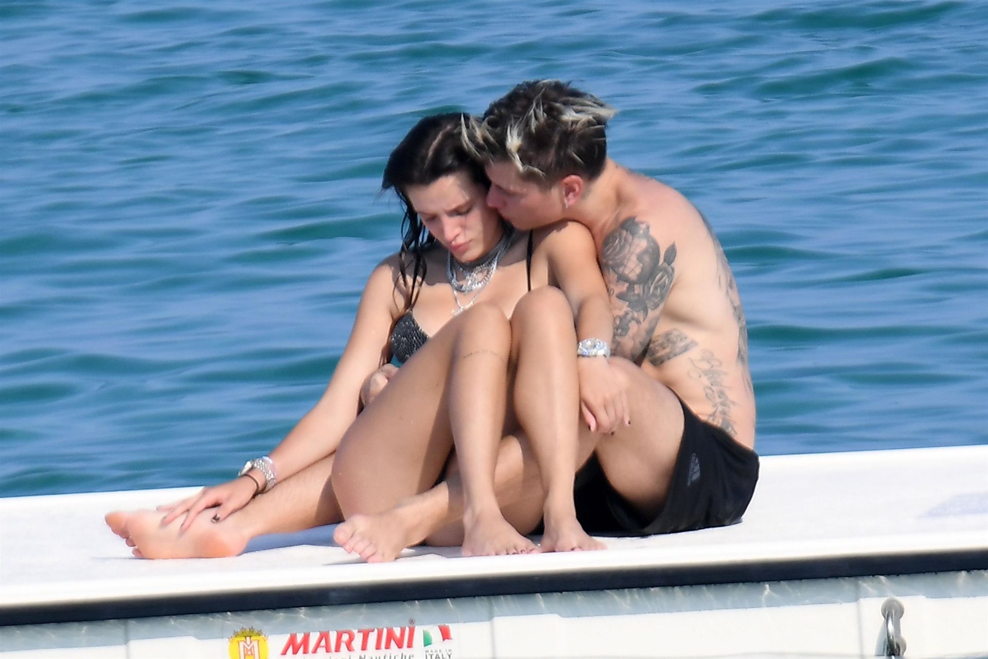 Bella Thorne and Benjamin Mascolo continue their love filled romantic holiday in Sardinia, Italy, 08/25/2019. The couple put on a heavy PDA display and could be seen cuddling and kissing while sitting by the water.