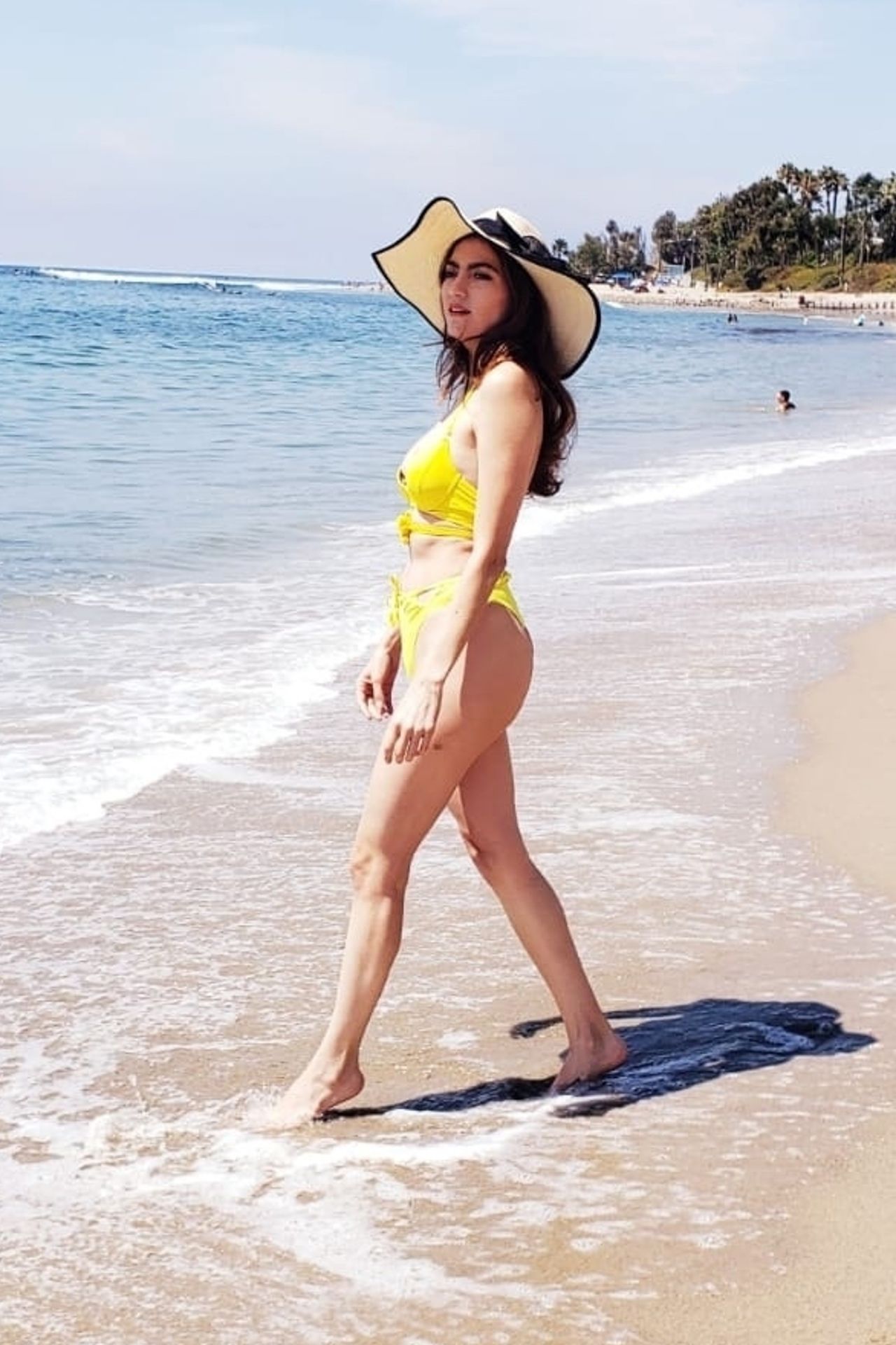 Actress Blanca Blanco suffers an “accidental” nip slip as she poses in a yellow bikini on the beach in Malibu, 08/18/2019.