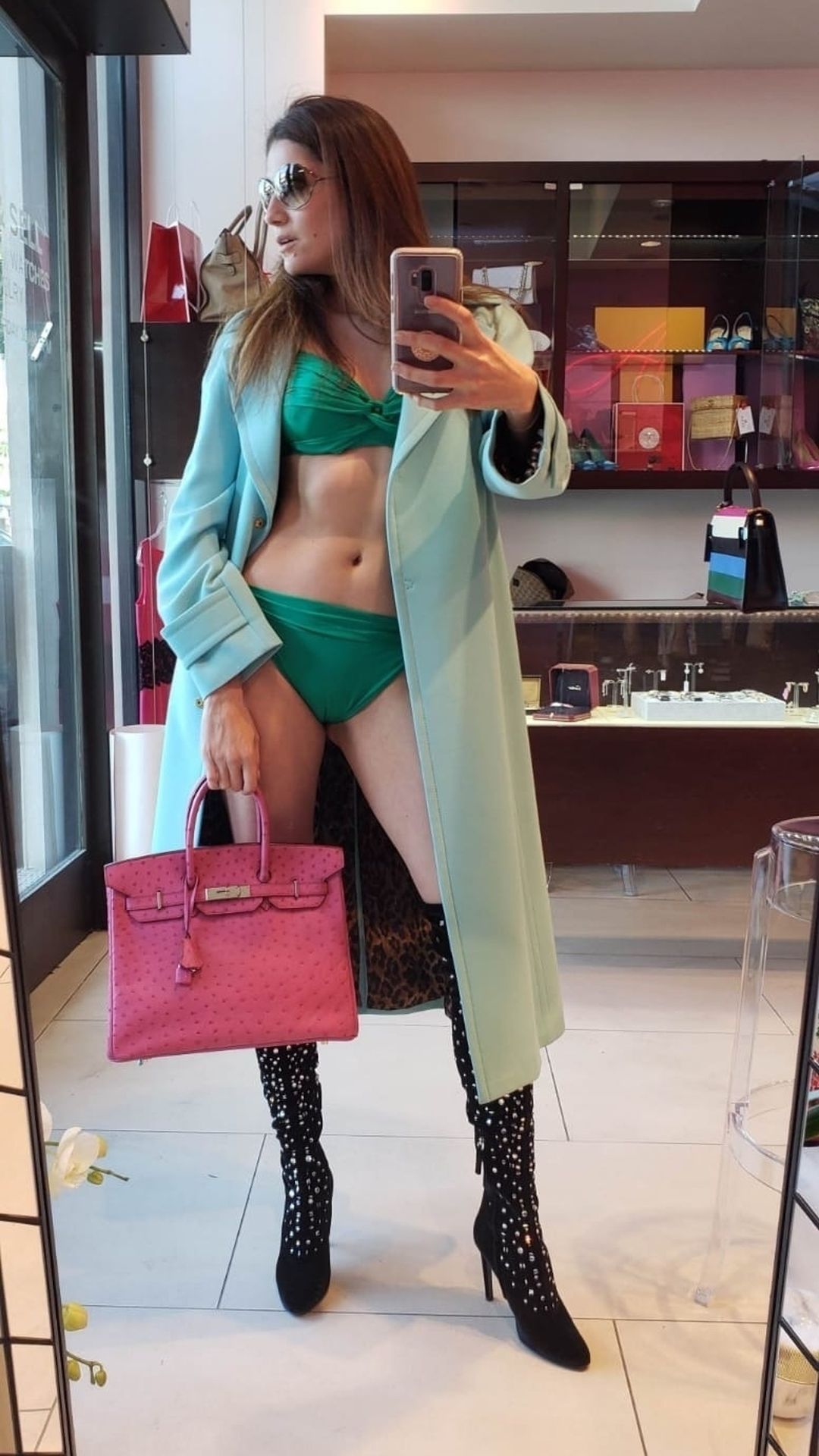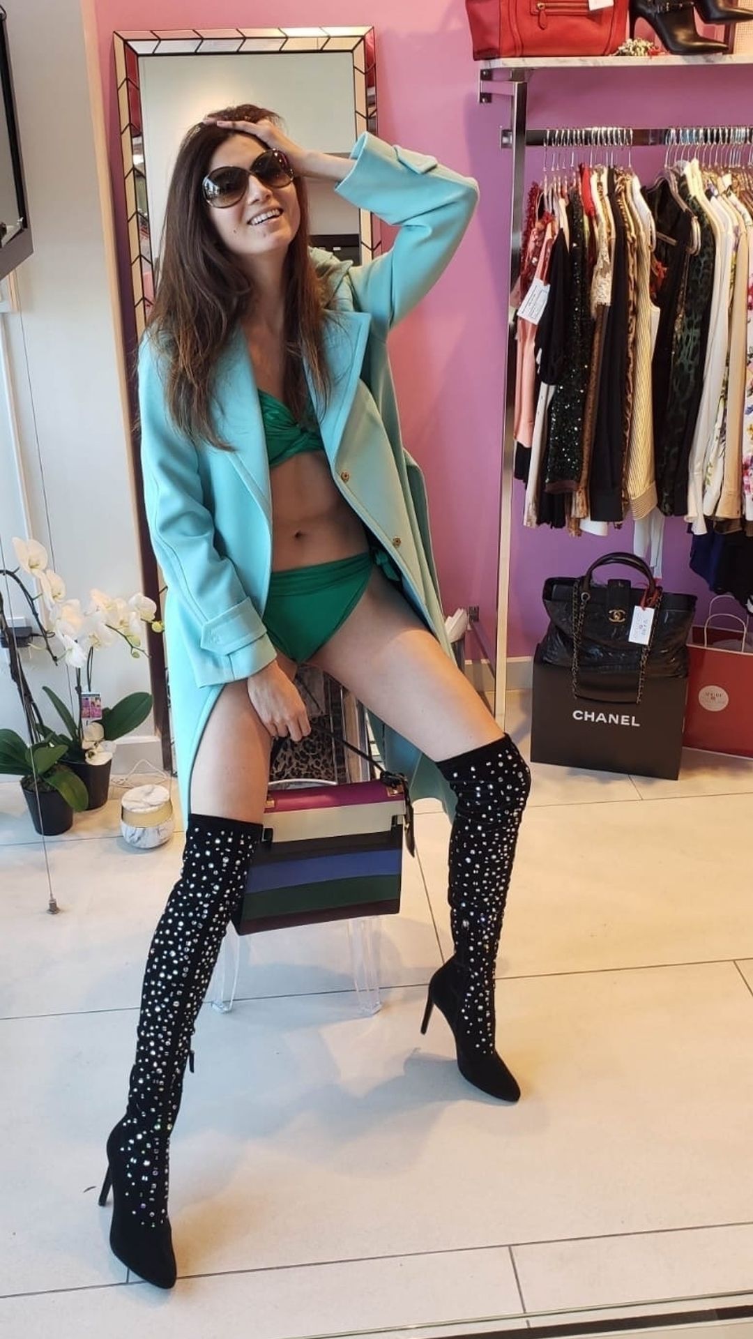 Blanca Blanco dons lingerie for an impromptu photoshoot in Beverly Hills, 11/17/2019. Blanca donned a green bra and panty set, black knee boots and a light blue jacket.