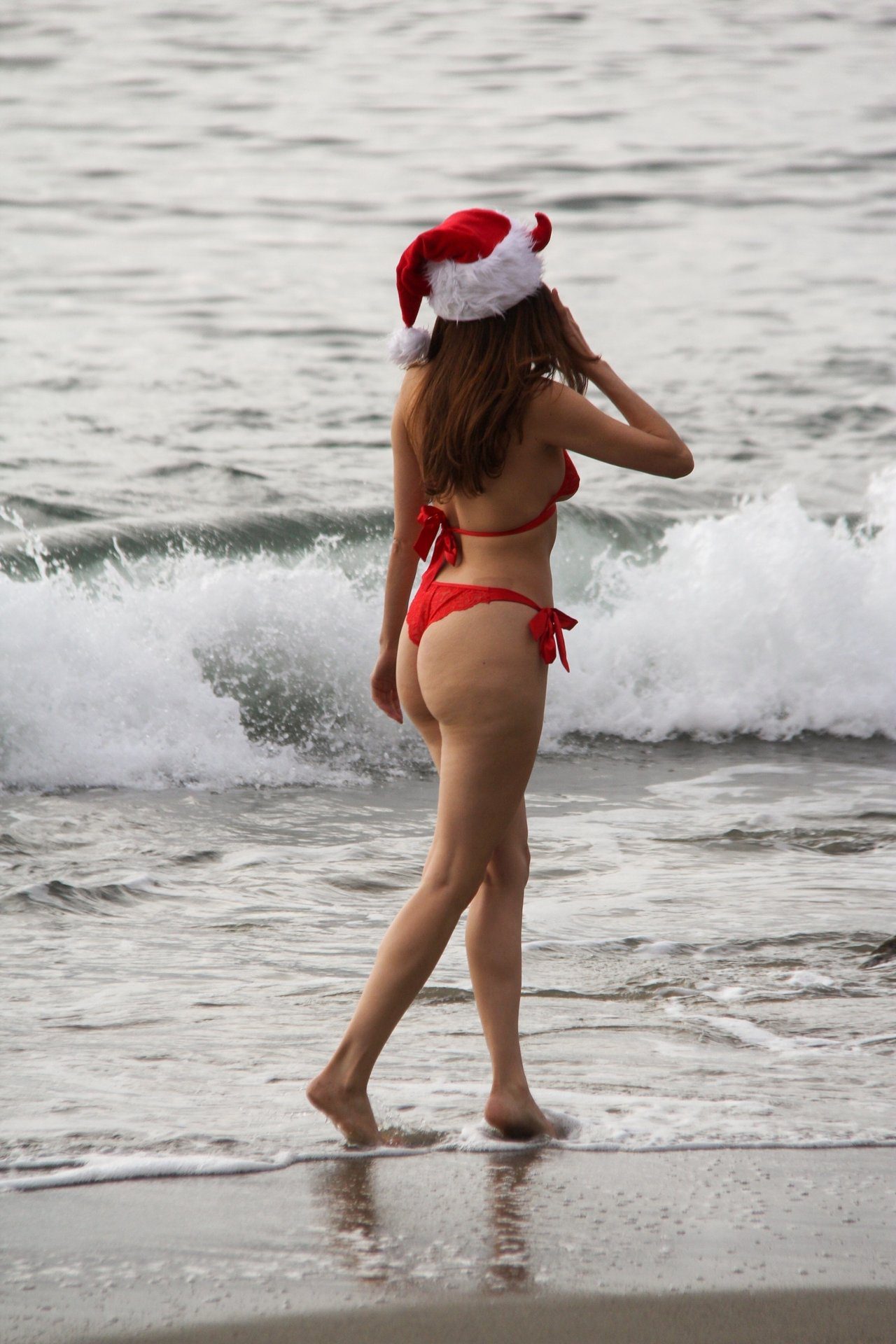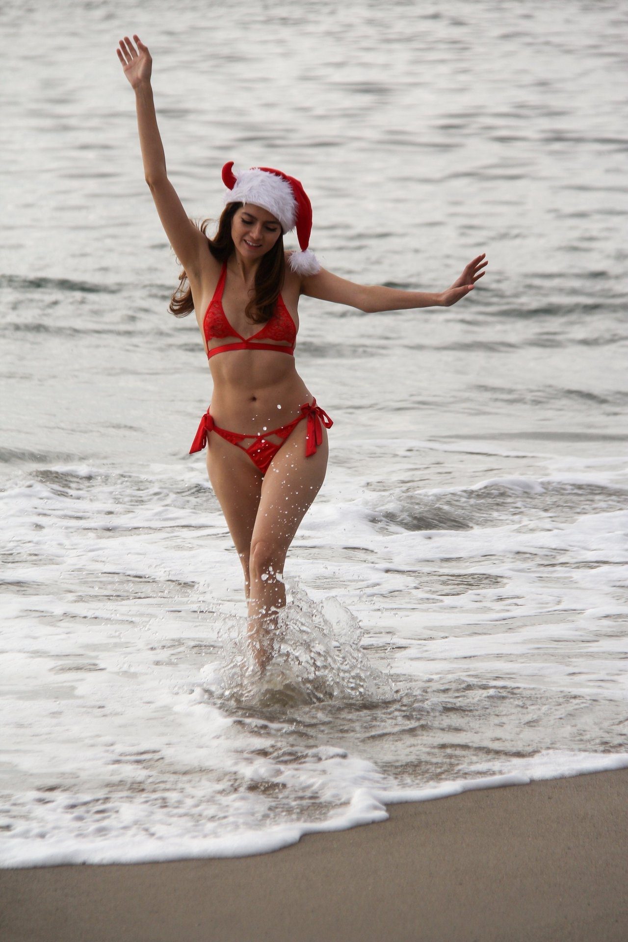 Actress Blanca Blanco poses for a shoot on Matador State Beach in Malibu, 12/18/2019. The star slips into a sexy red bikini and gets festive with a red Santa hat.
