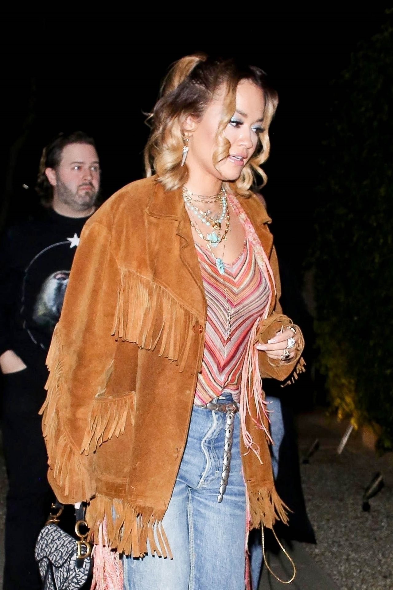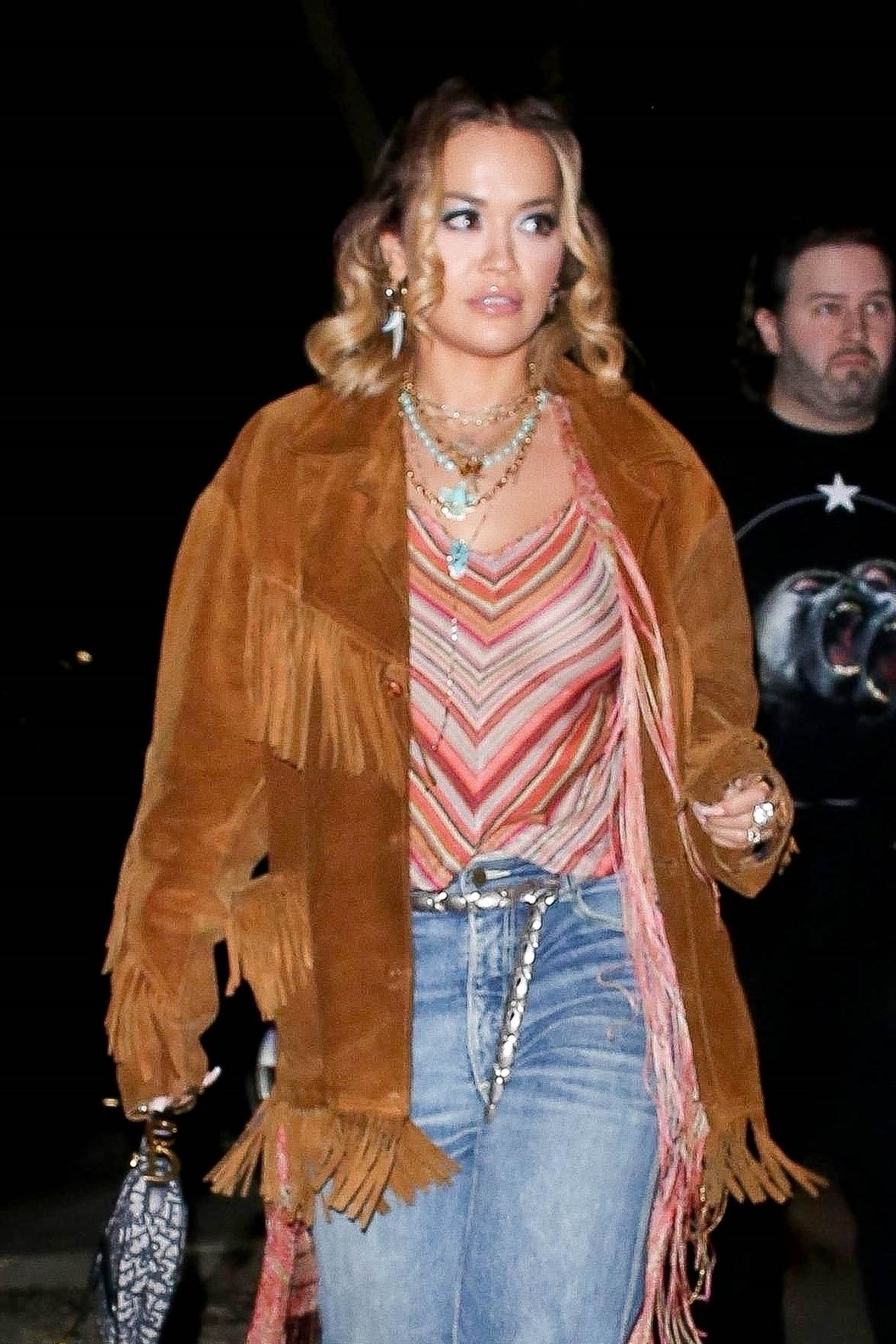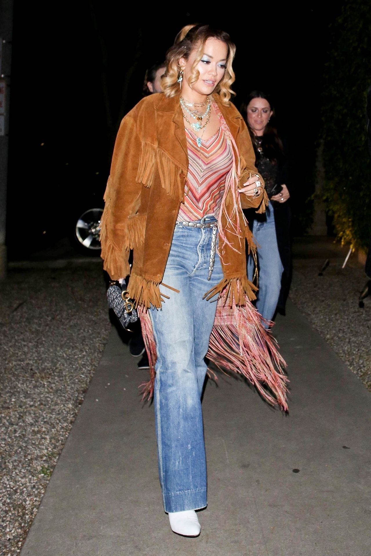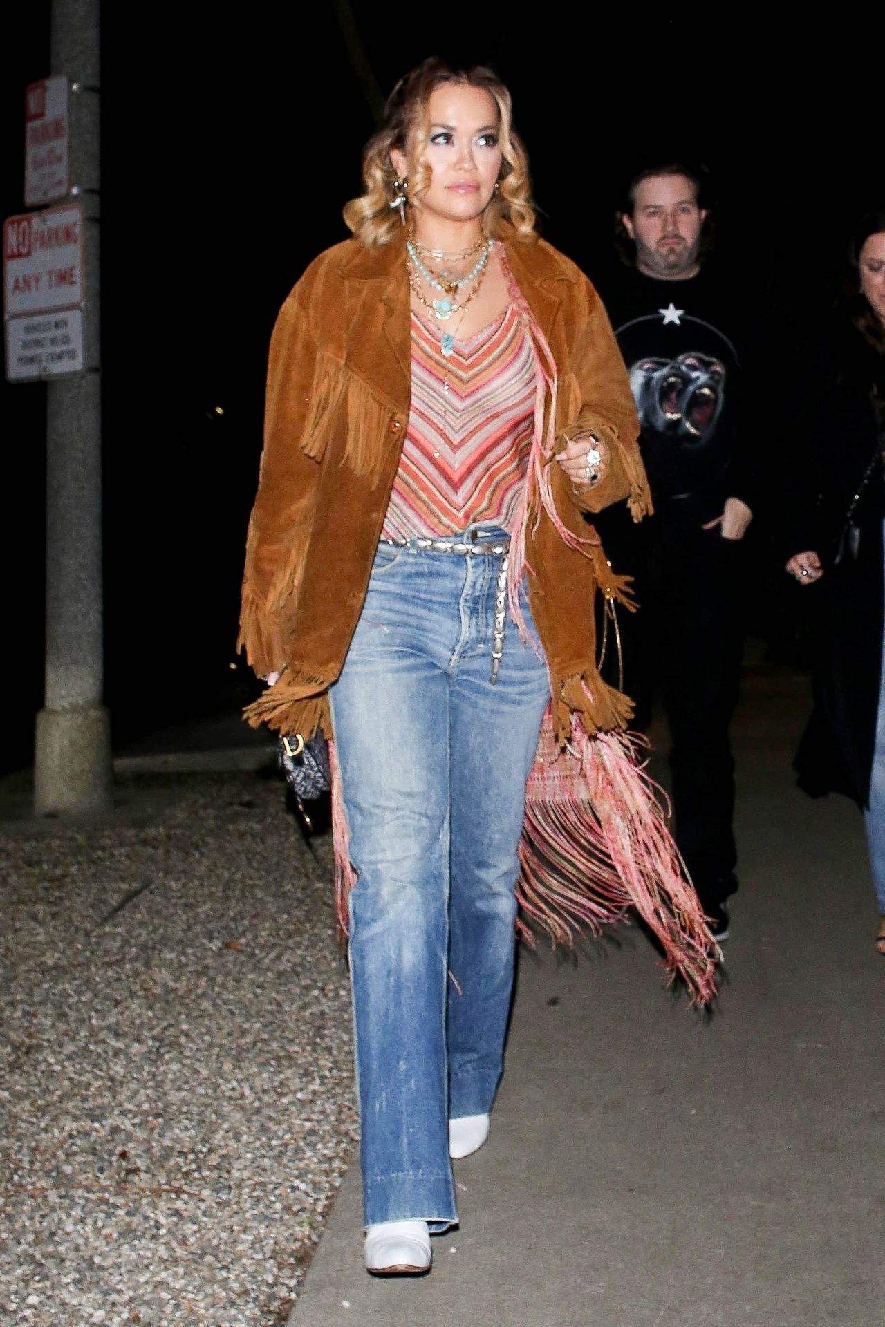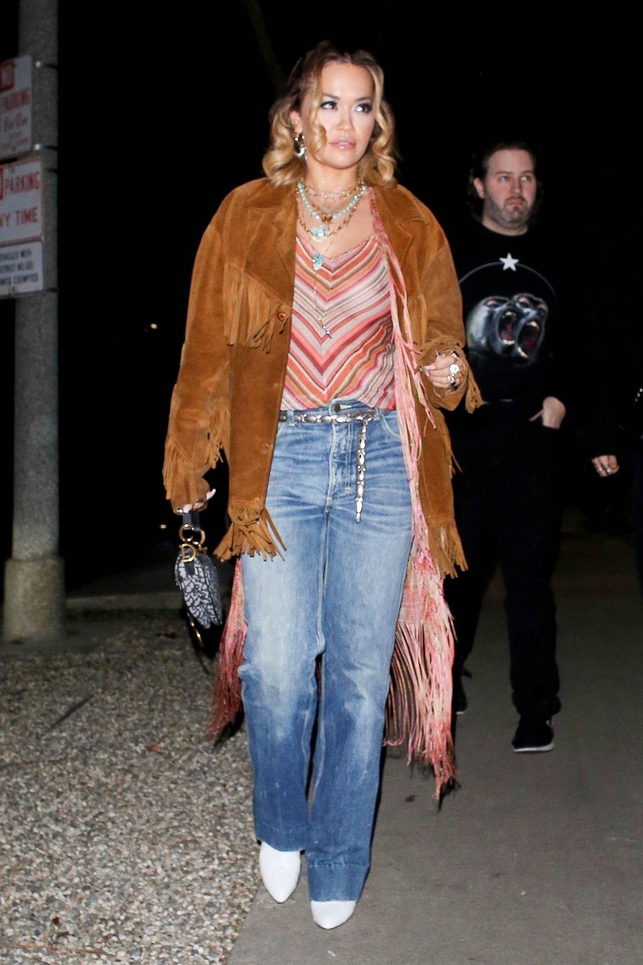 Singer Rita Ora turns heads as she rocks a fringe 70’s inspired jacket without a bra as she steps out with friends for dinner in Los Feliz, 01/24/2020.