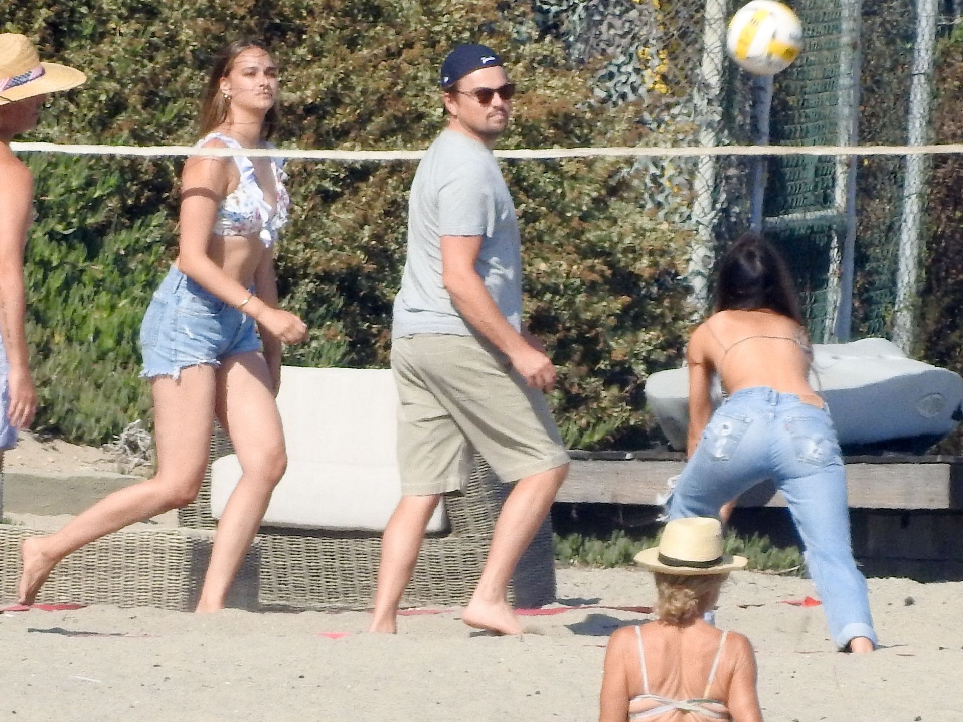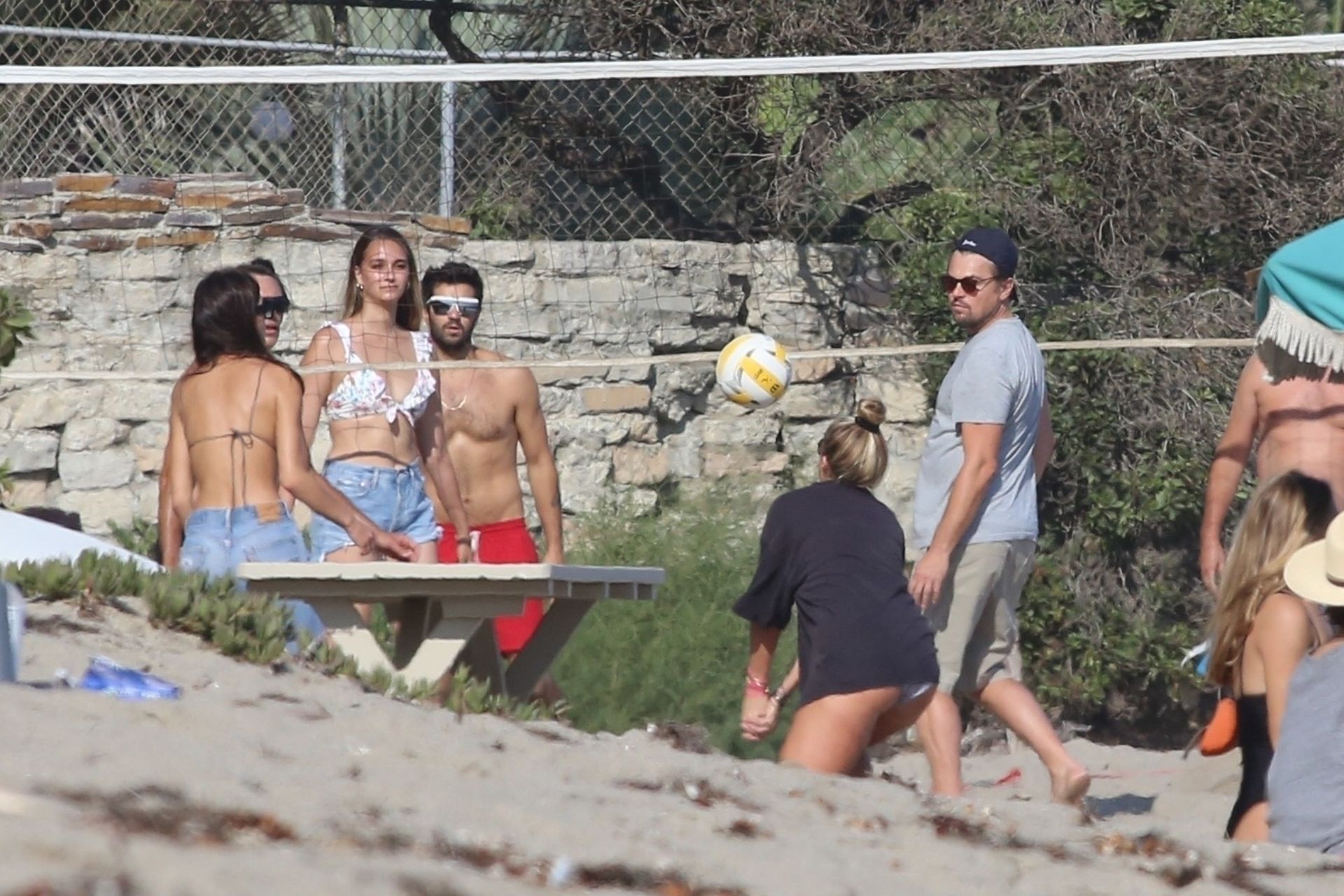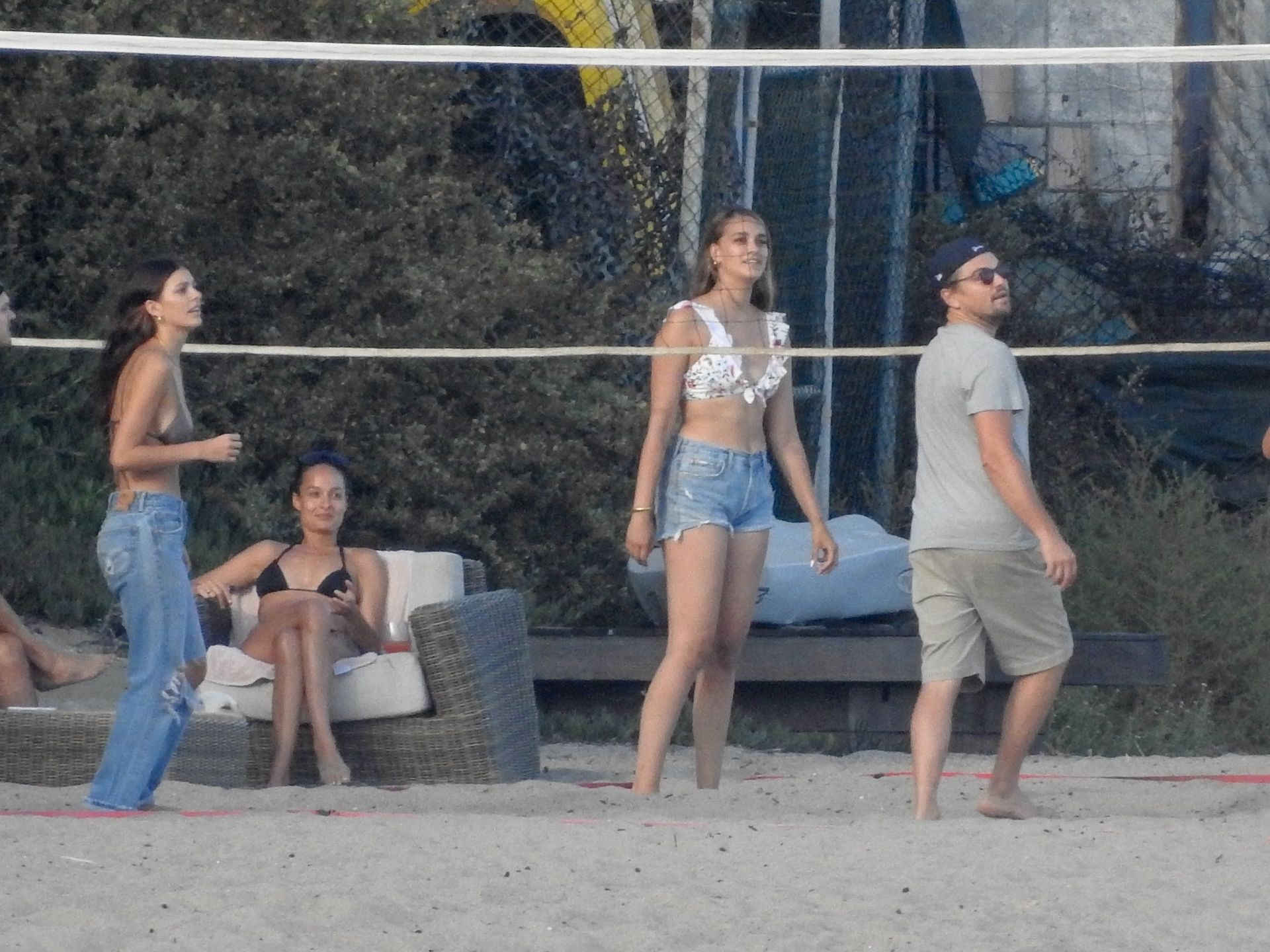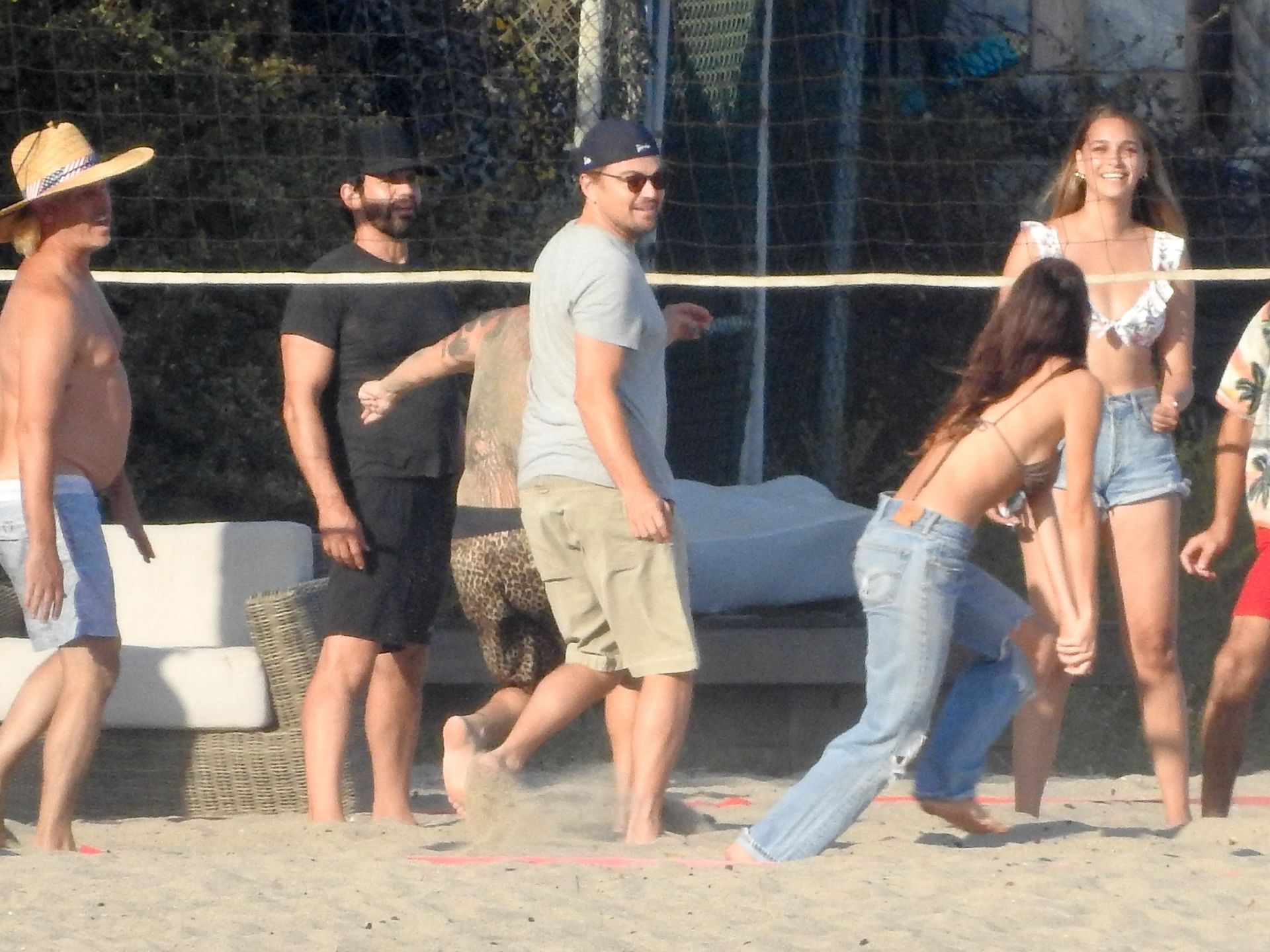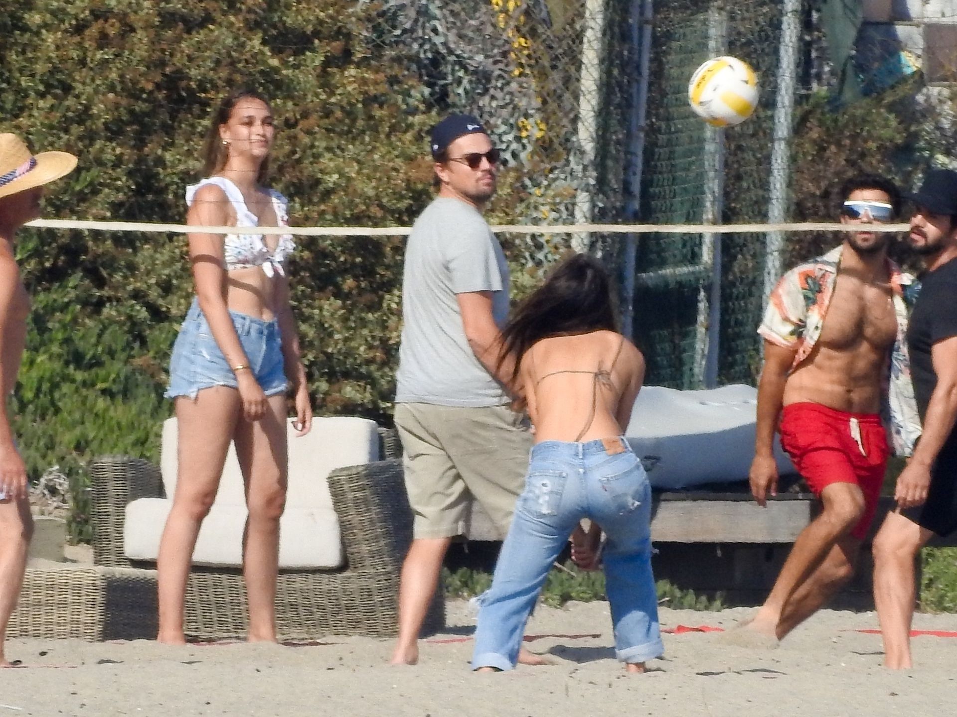 Leonardo DiCaprio, Camila Morrone, April Love Geary and Lukas Haas play volleyball on the beach in Malibu, 09/01/2019. Camila wore a string bikini top for the game paired with ripped jeans.