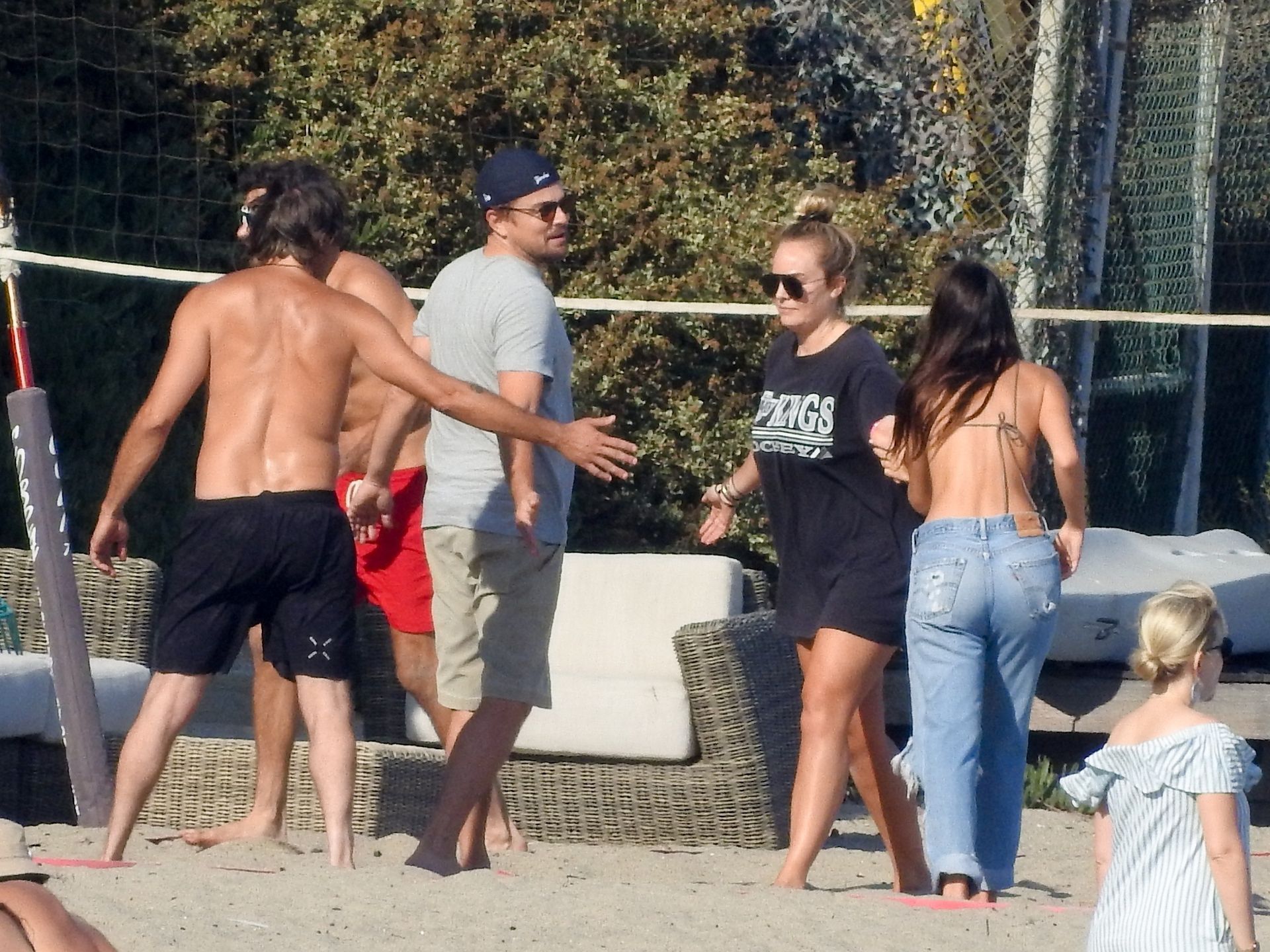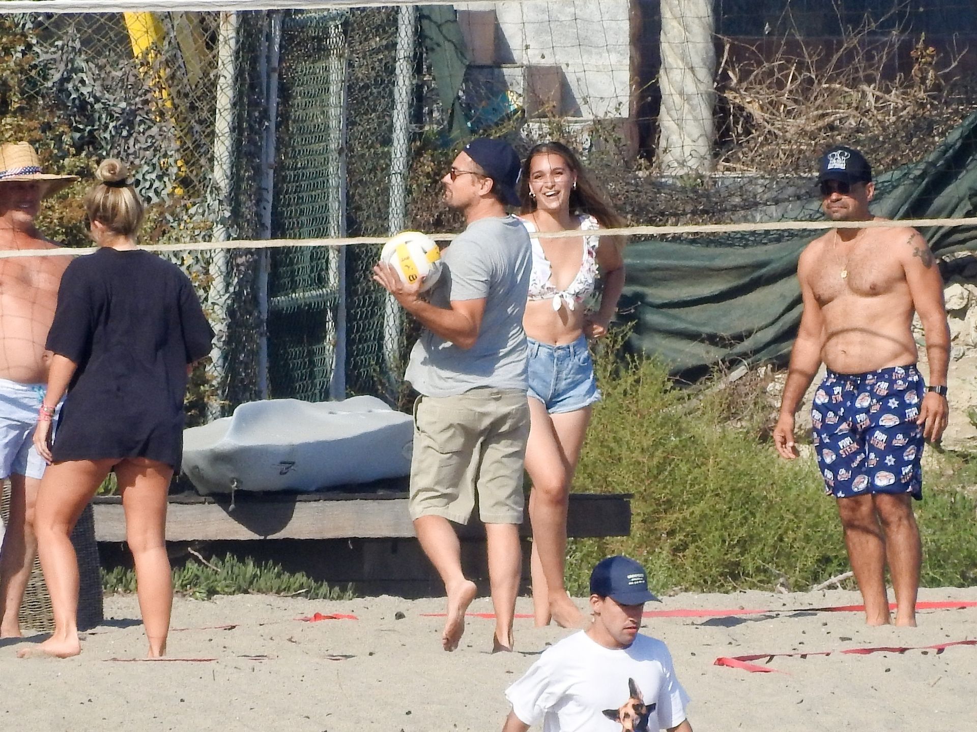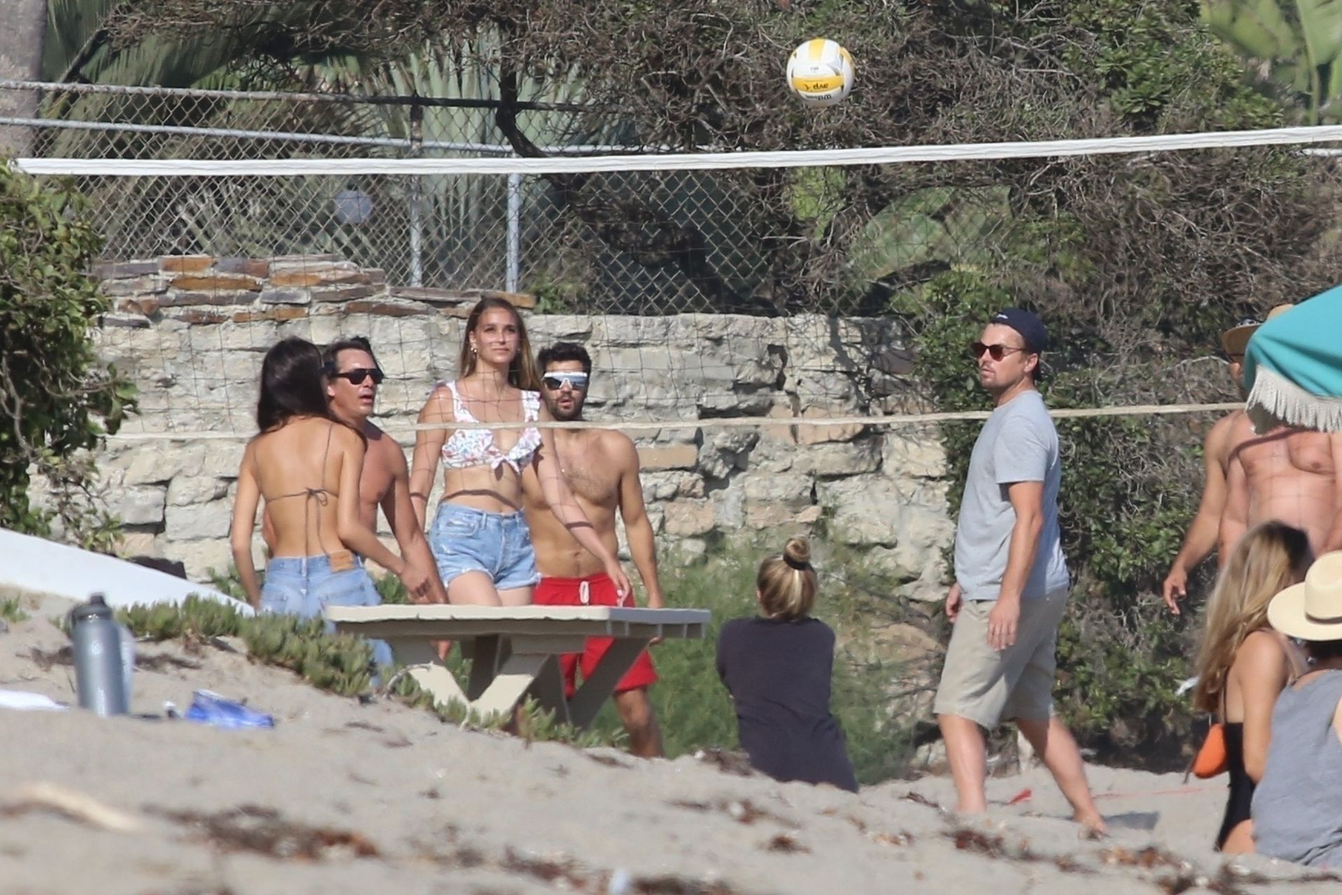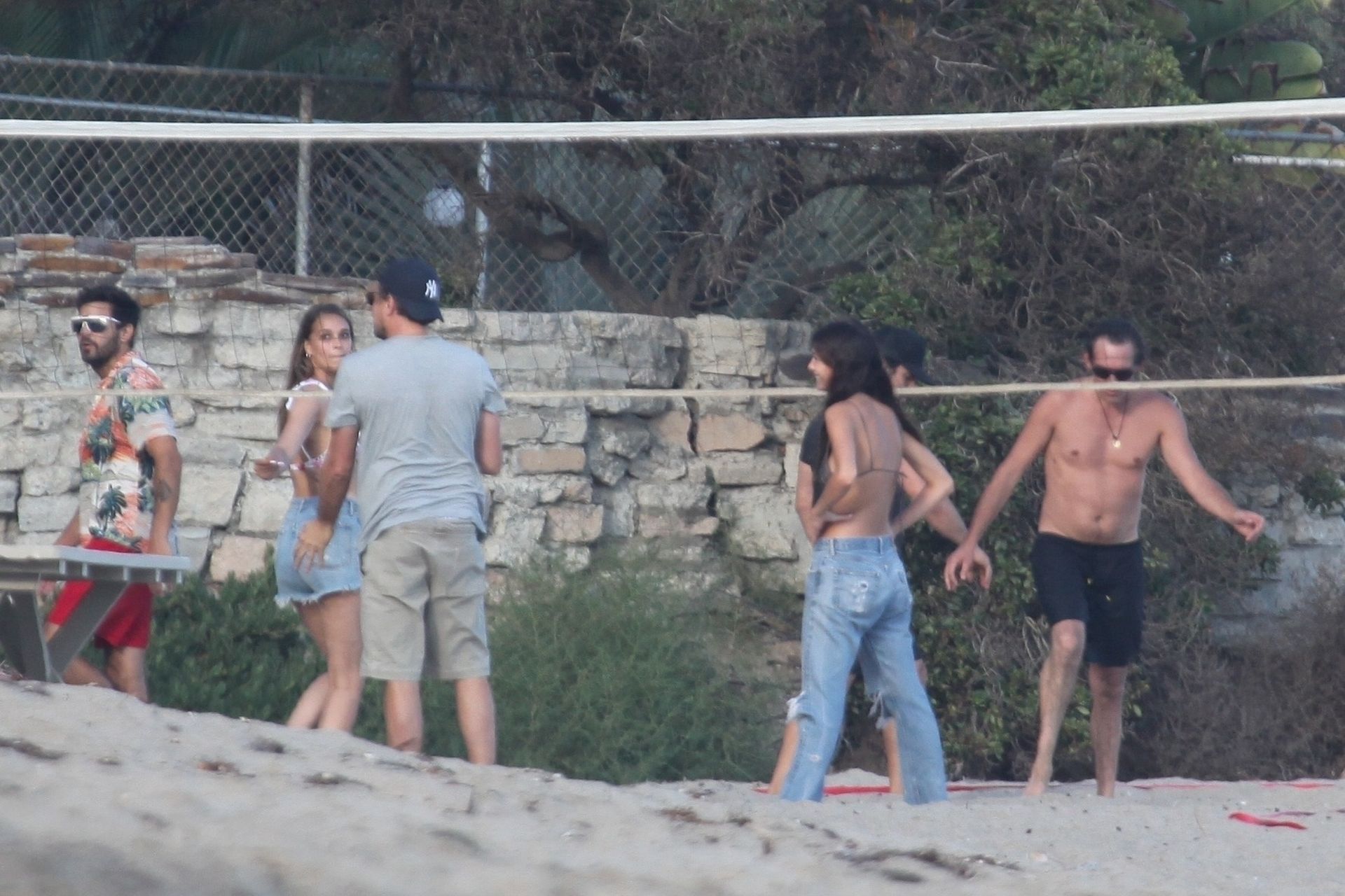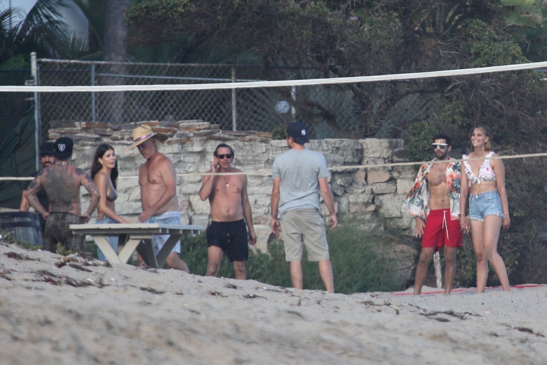 Leonardo DiCaprio, Camila Morrone, April Love Geary and Lukas Haas play volleyball on the beach in Malibu, 09/01/2019. Camila wore a string bikini top for the game paired with ripped jeans.
