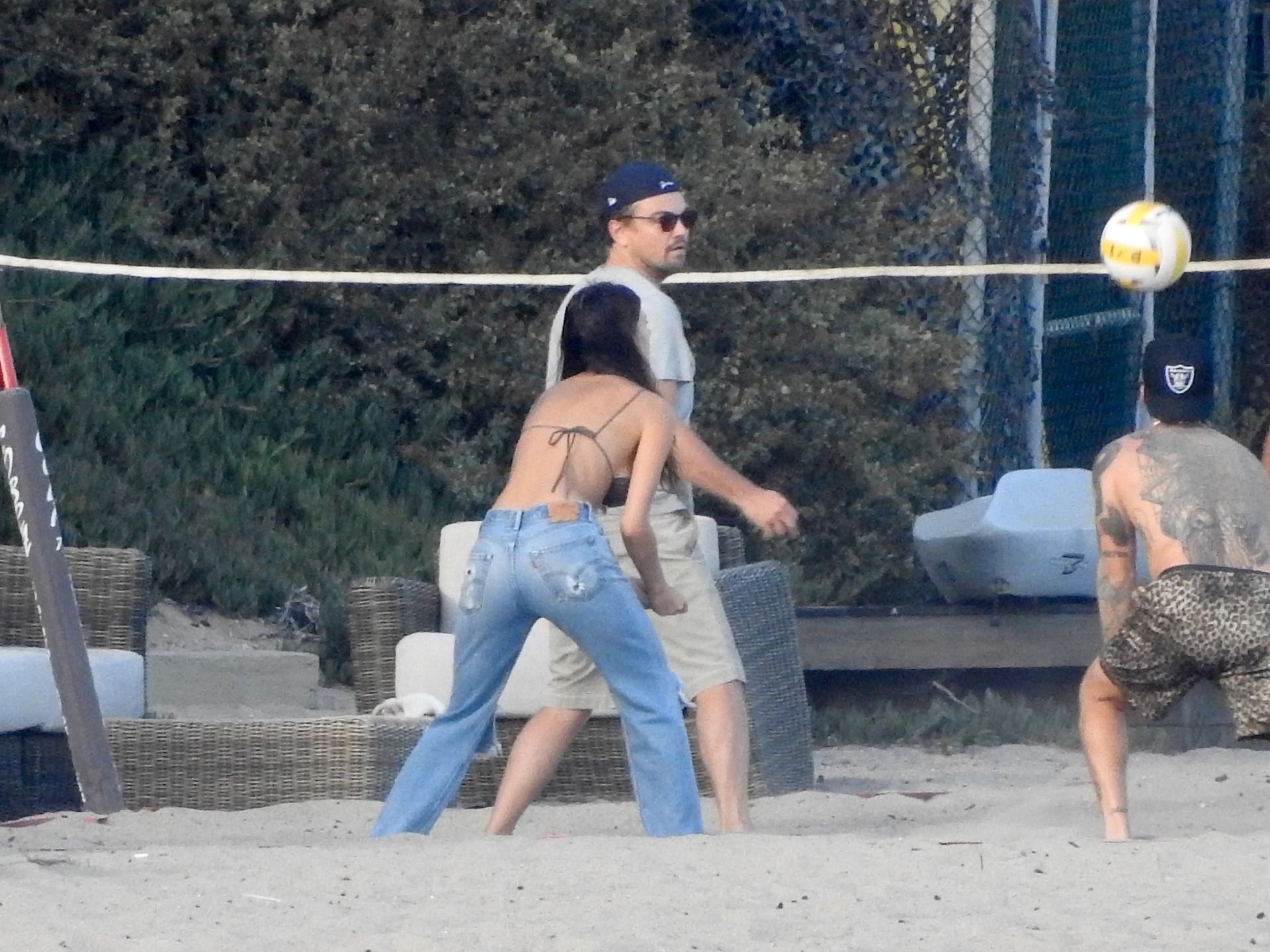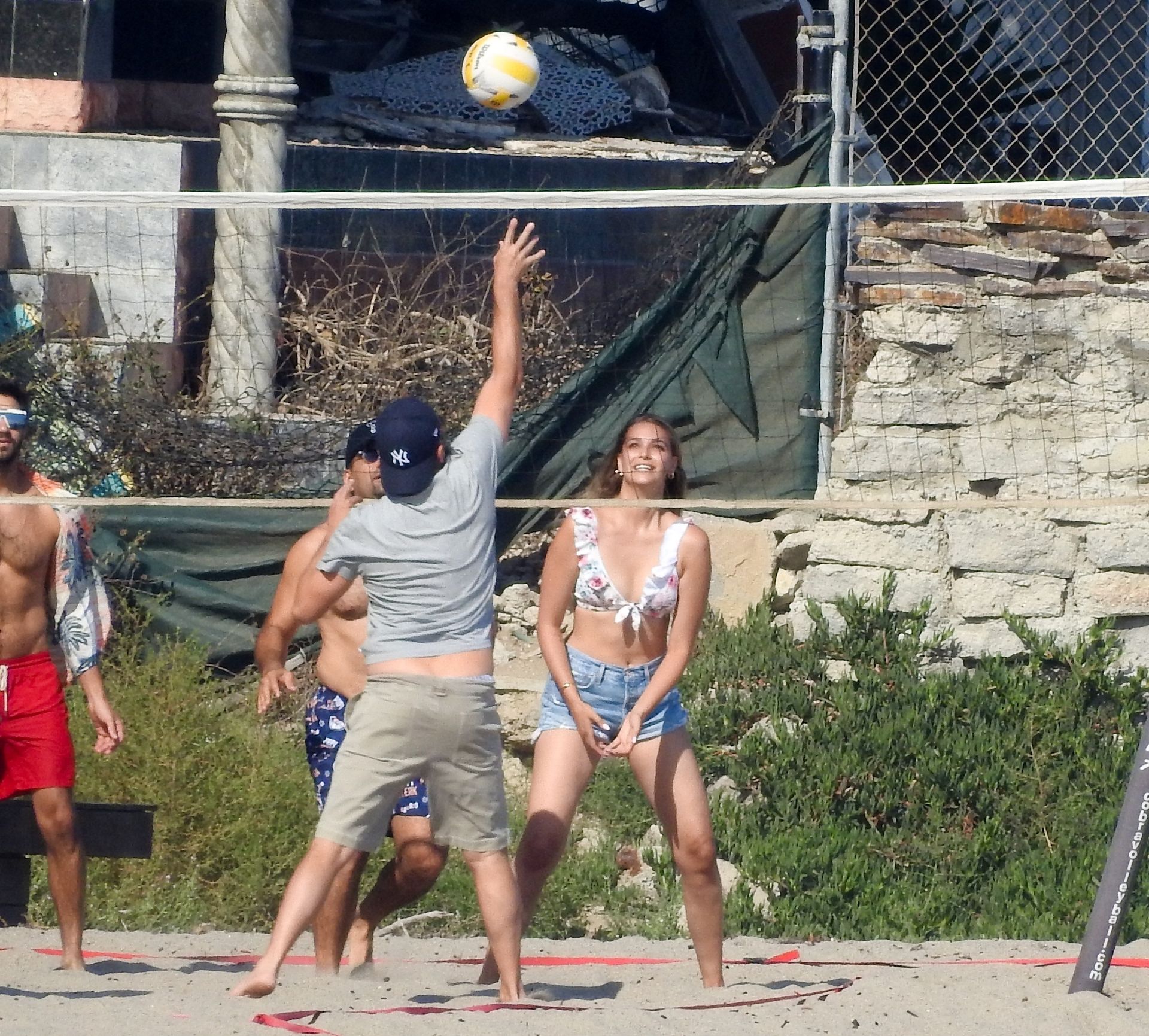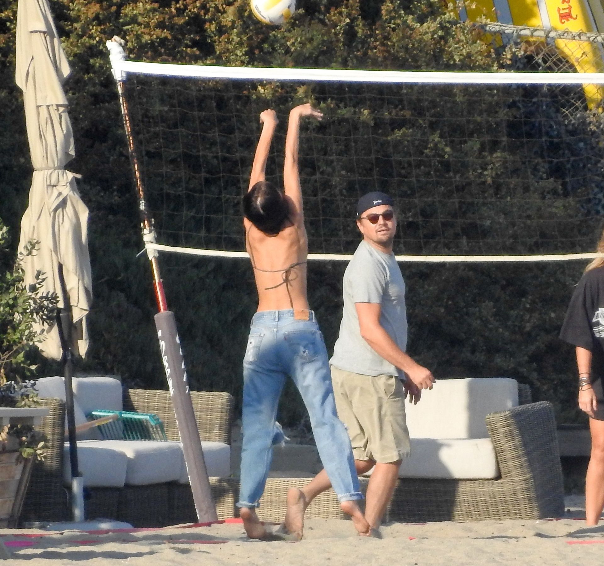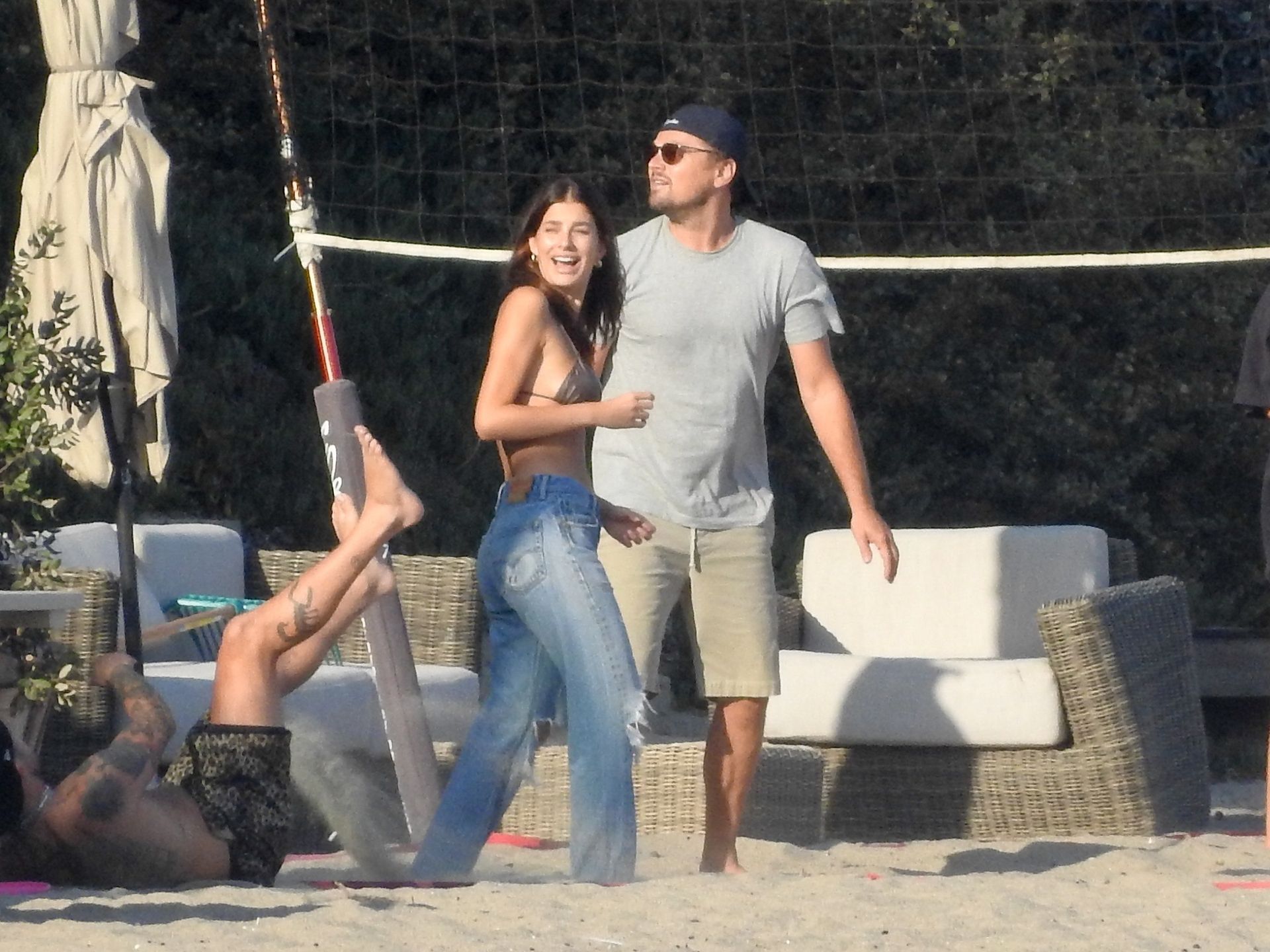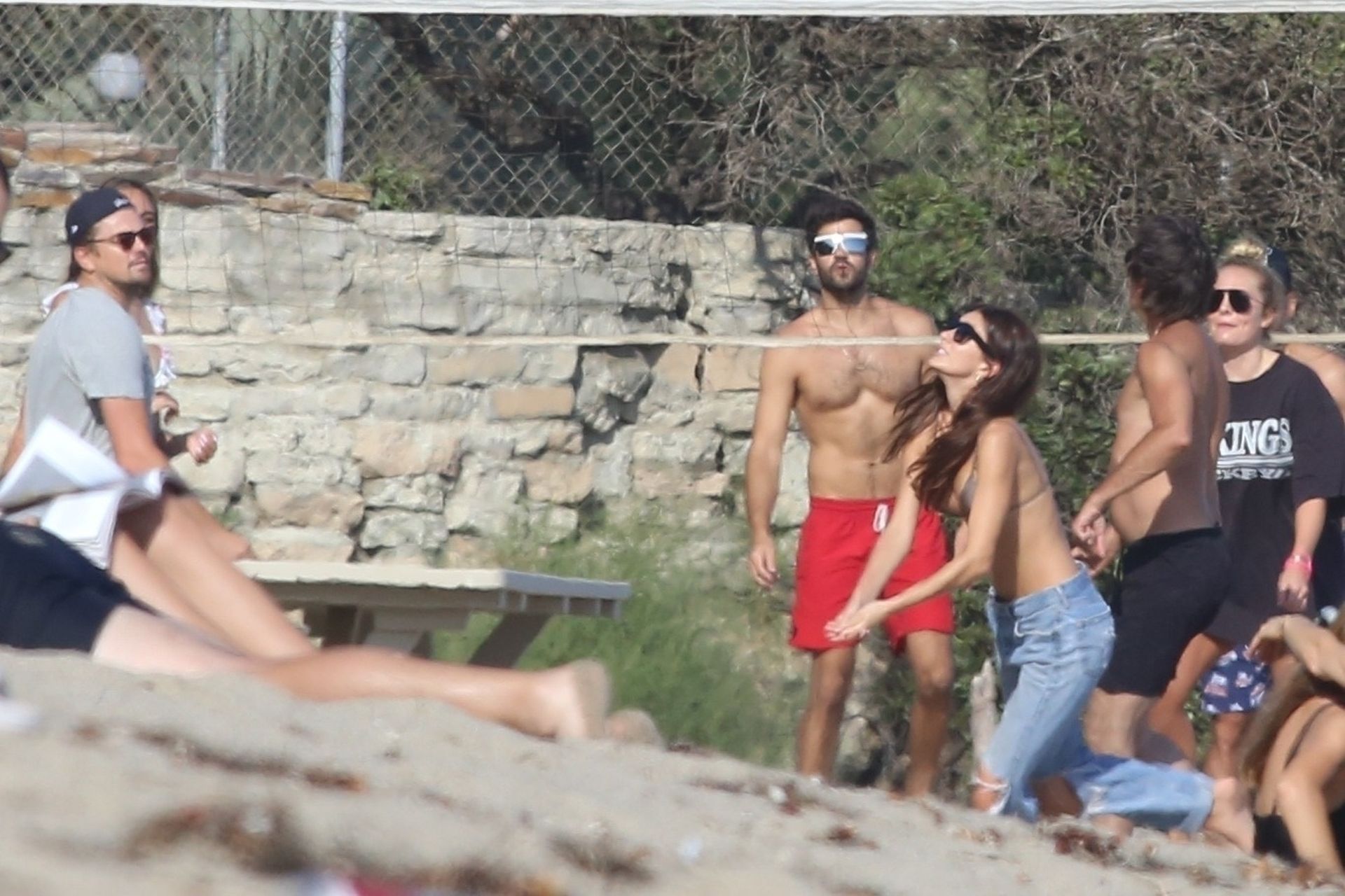 Leonardo DiCaprio, Camila Morrone, April Love Geary and Lukas Haas play volleyball on the beach in Malibu, 09/01/2019. Camila wore a string bikini top for the game paired with ripped jeans.