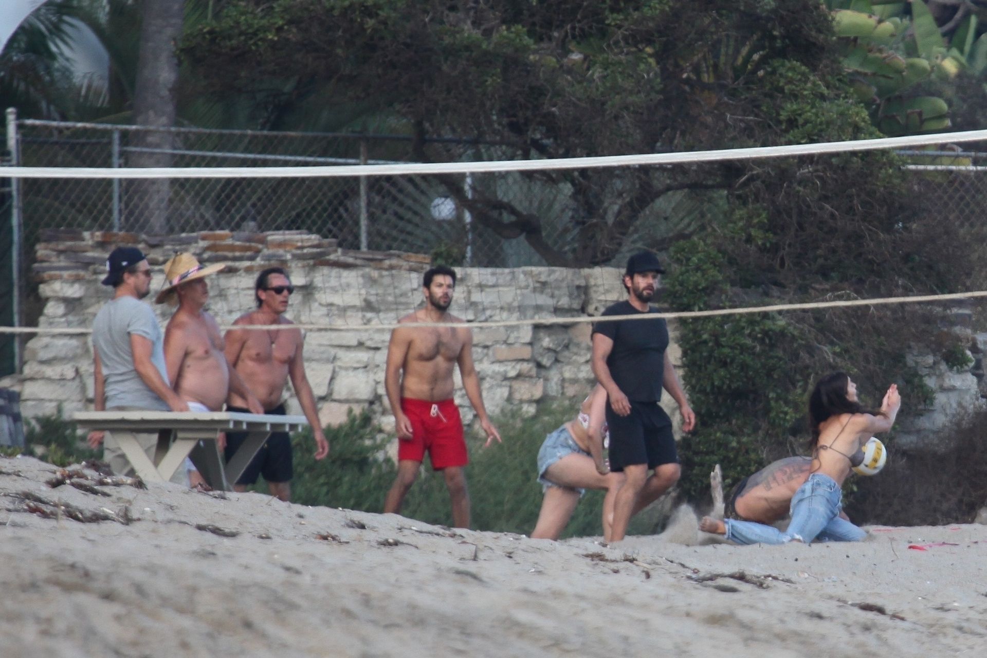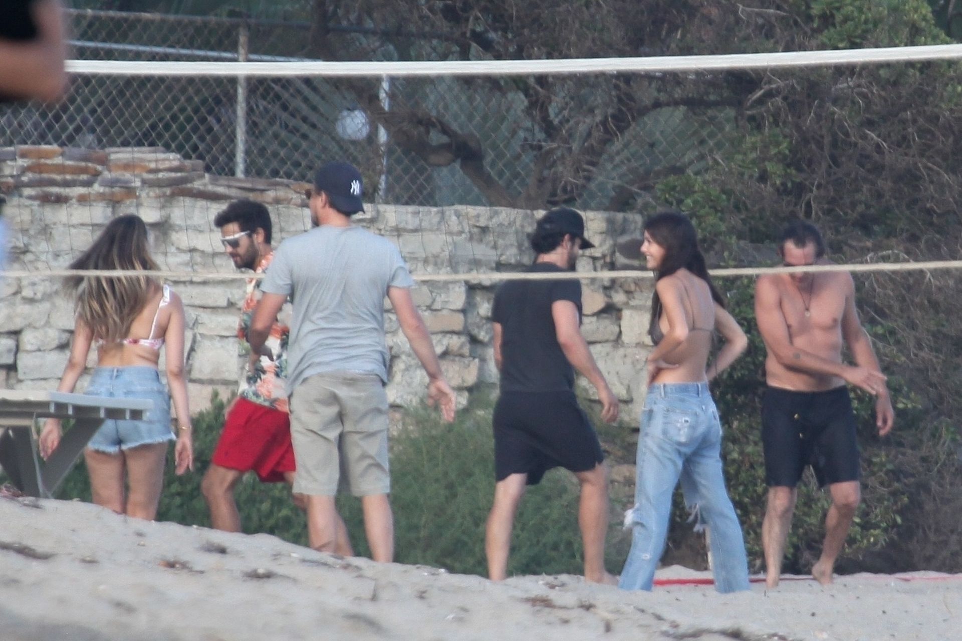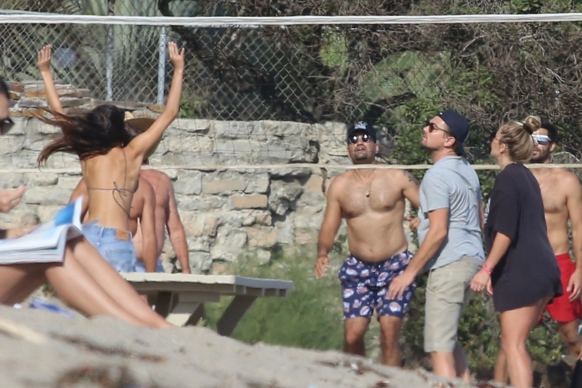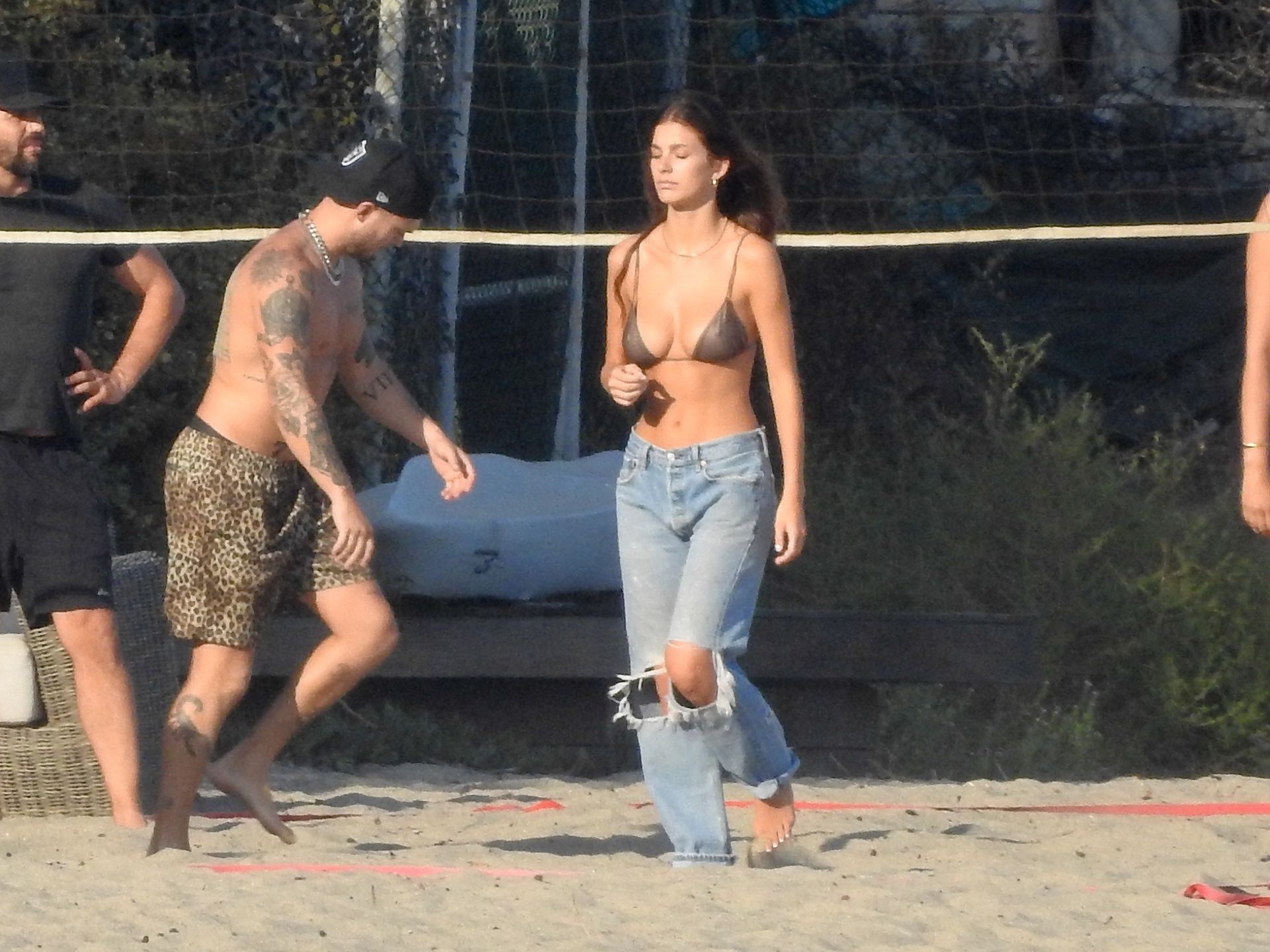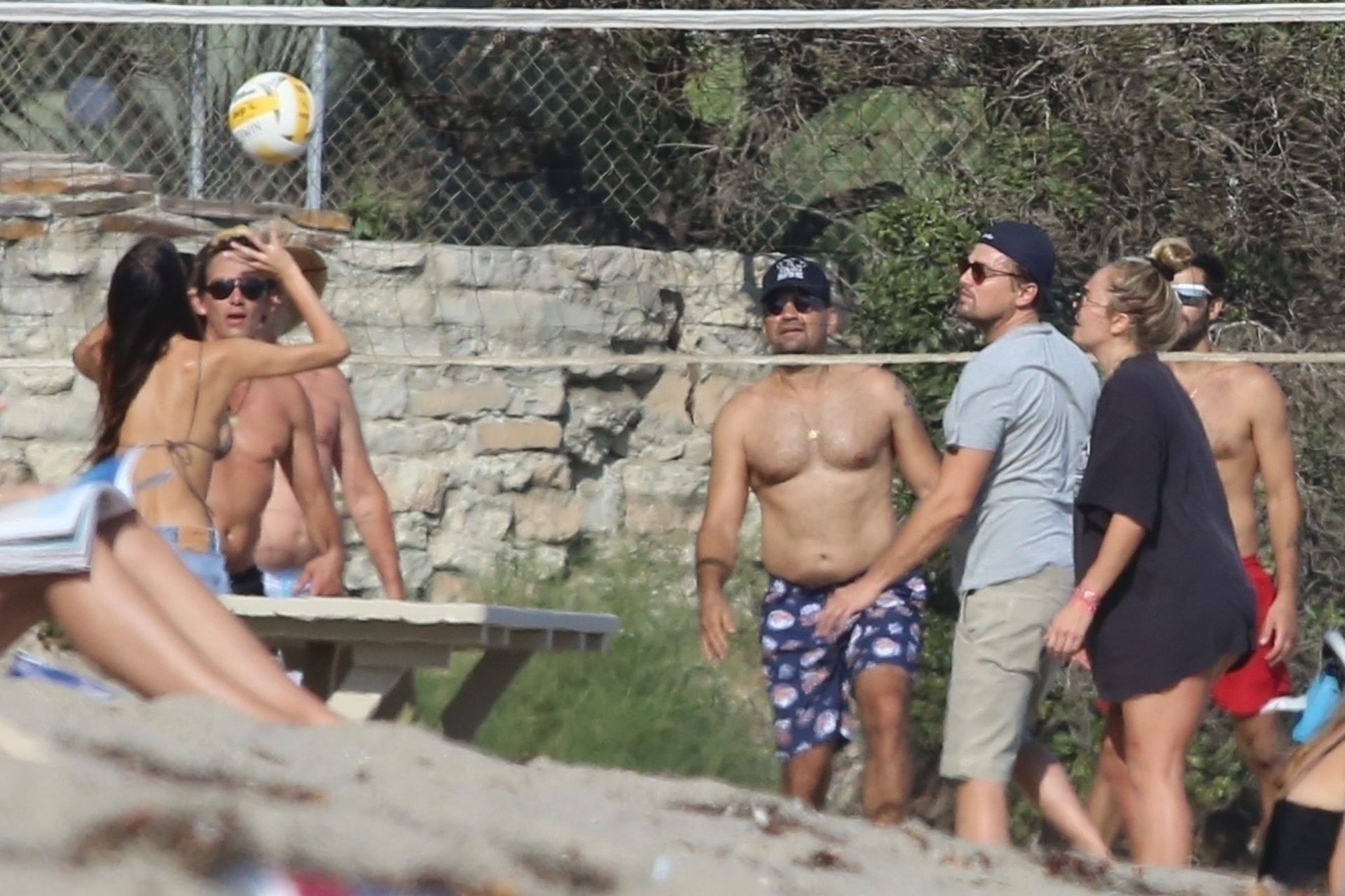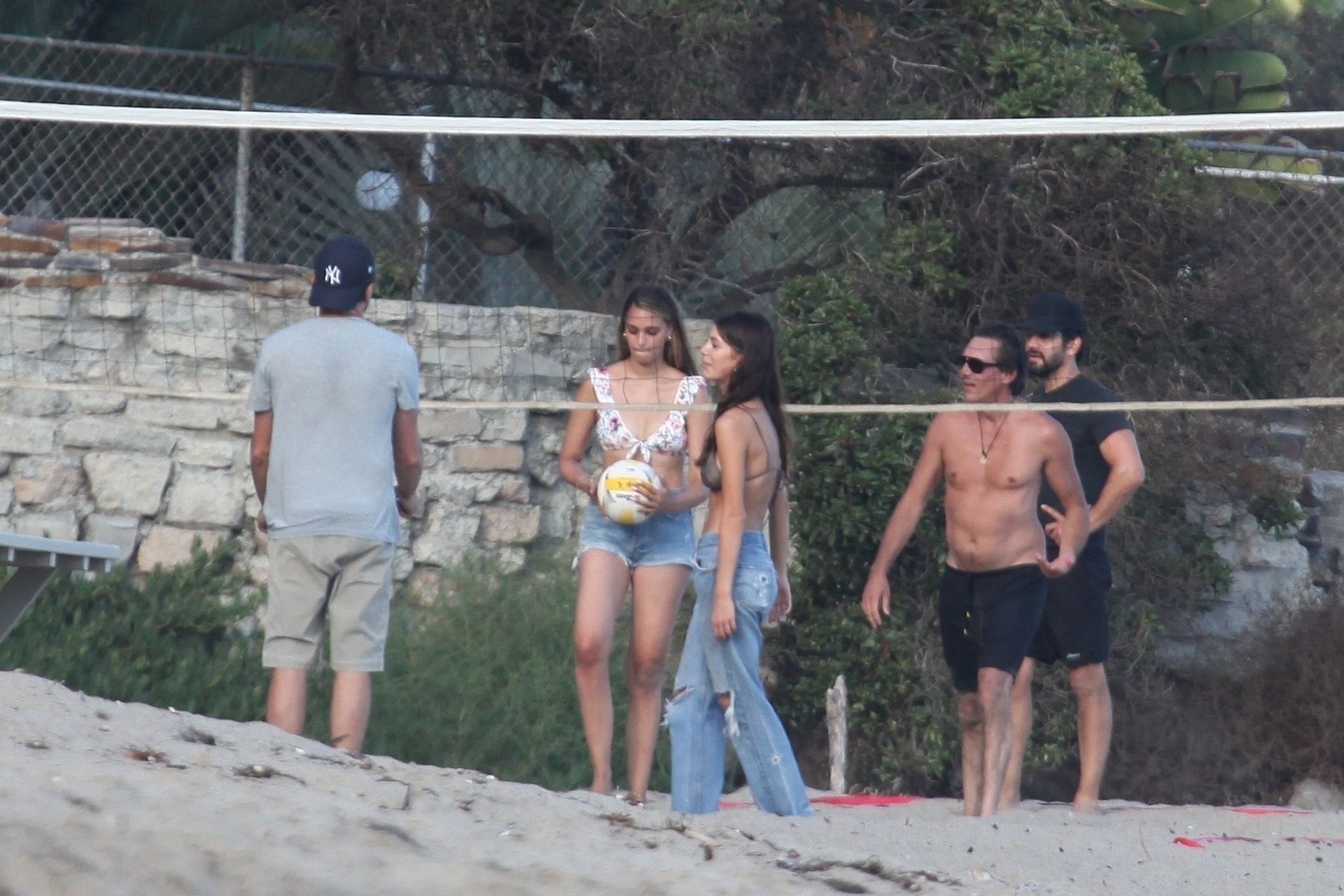 Leonardo DiCaprio, Camila Morrone, April Love Geary and Lukas Haas play volleyball on the beach in Malibu, 09/01/2019. Camila wore a string bikini top for the game paired with ripped jeans.