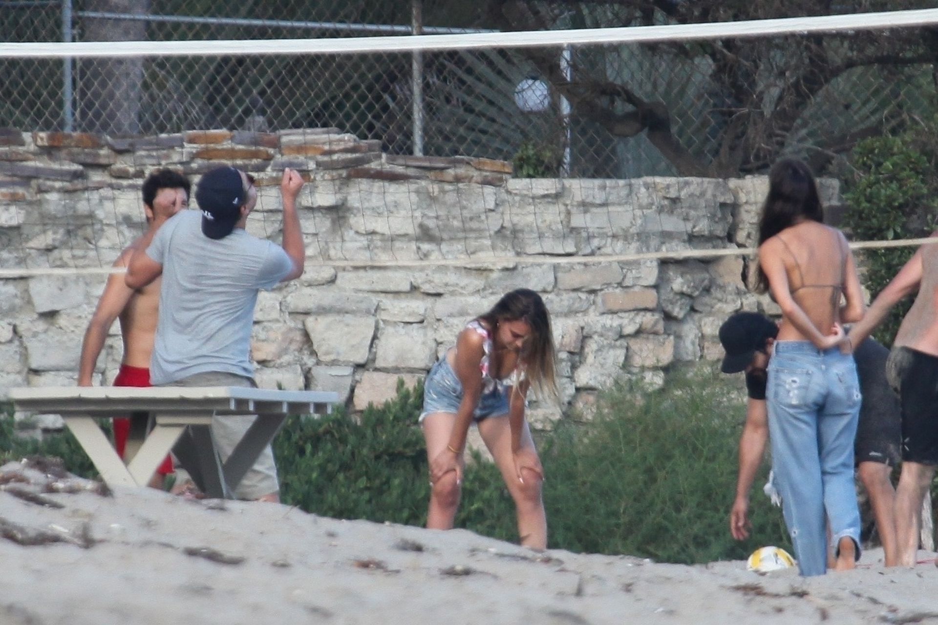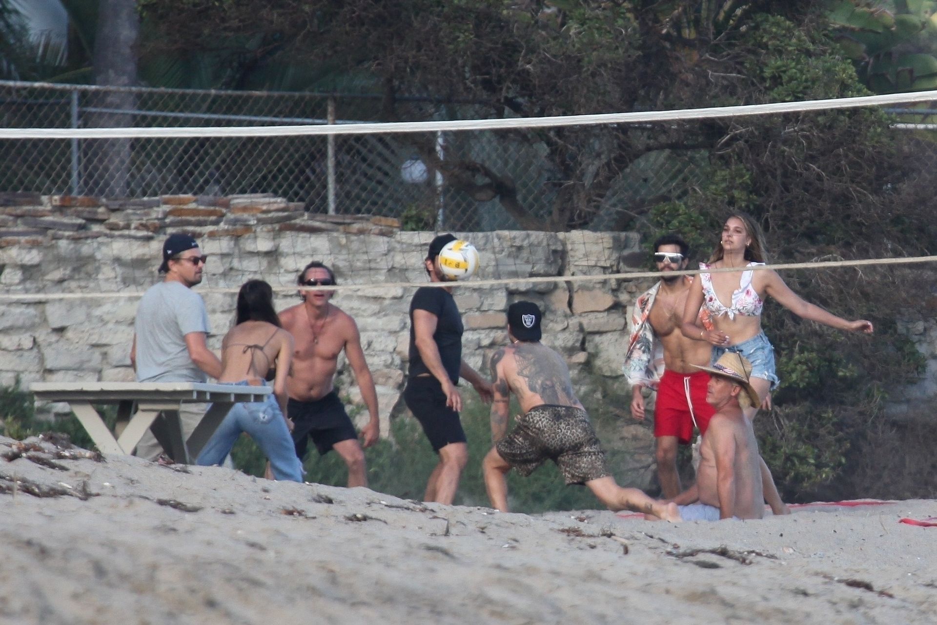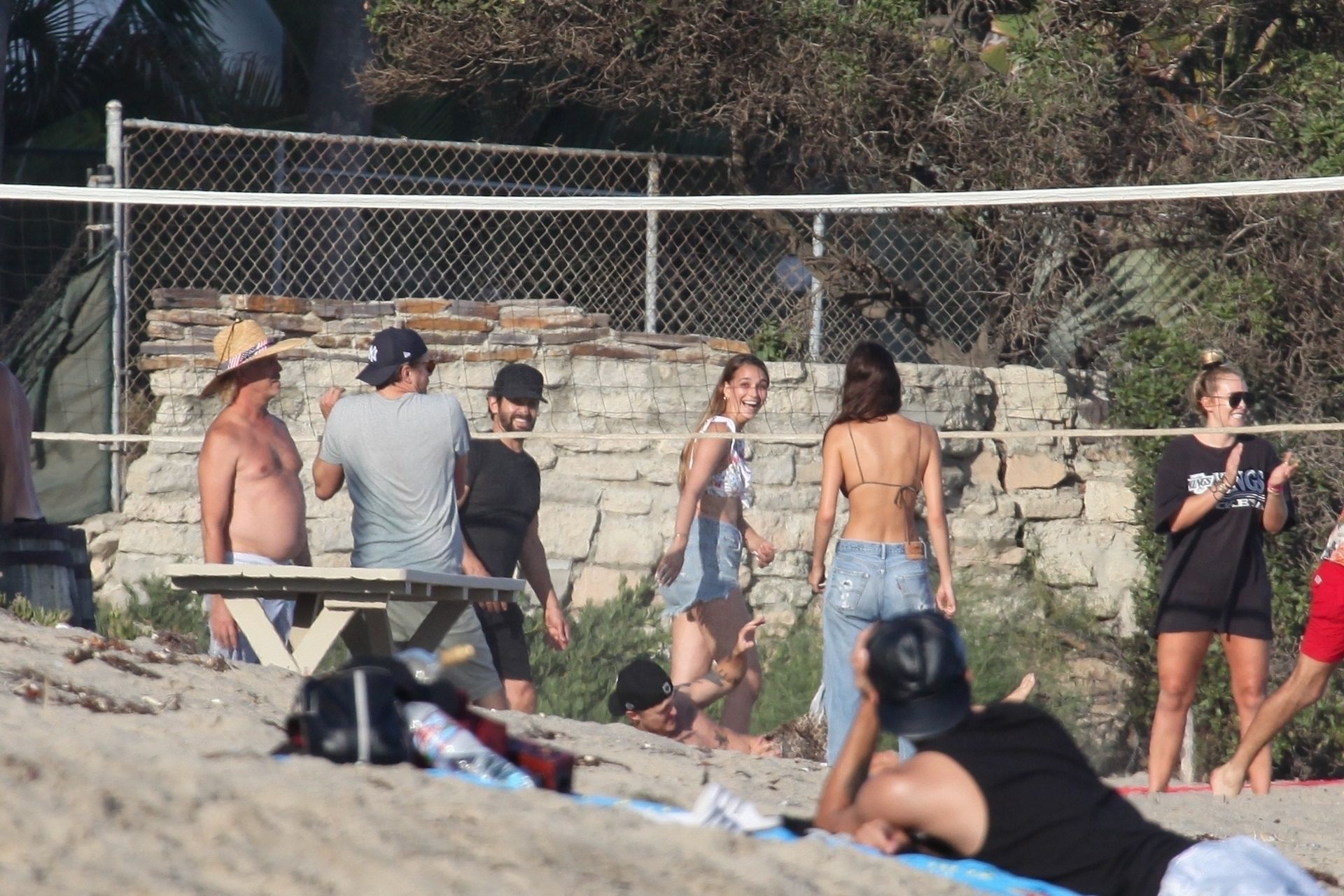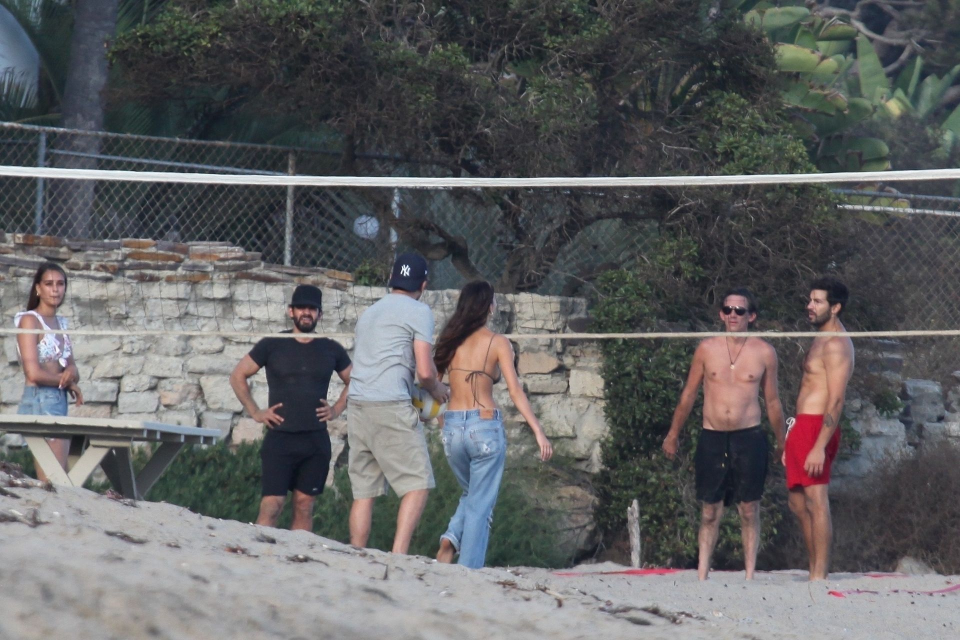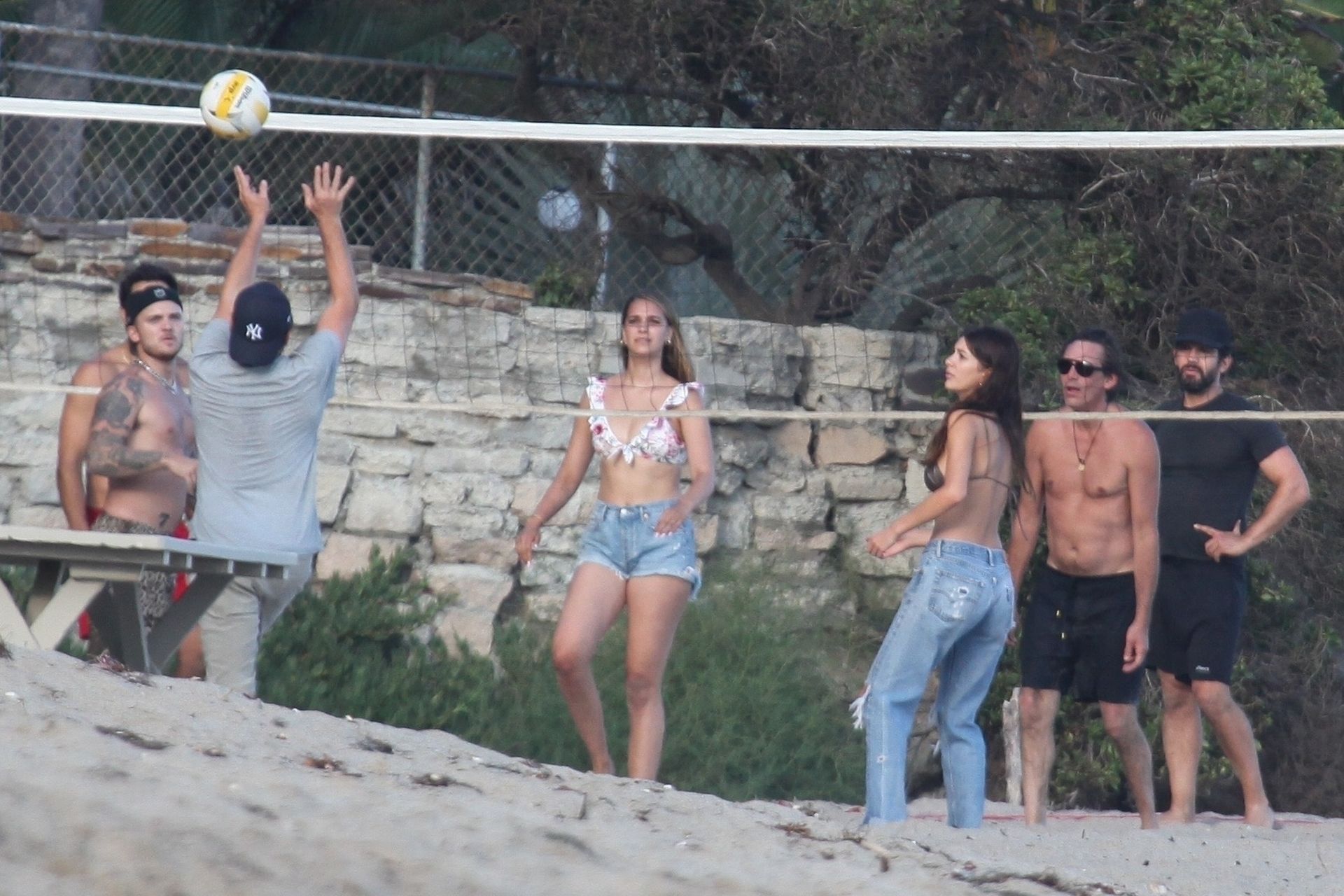 Leonardo DiCaprio, Camila Morrone, April Love Geary and Lukas Haas play volleyball on the beach in Malibu, 09/01/2019. Camila wore a string bikini top for the game paired with ripped jeans.