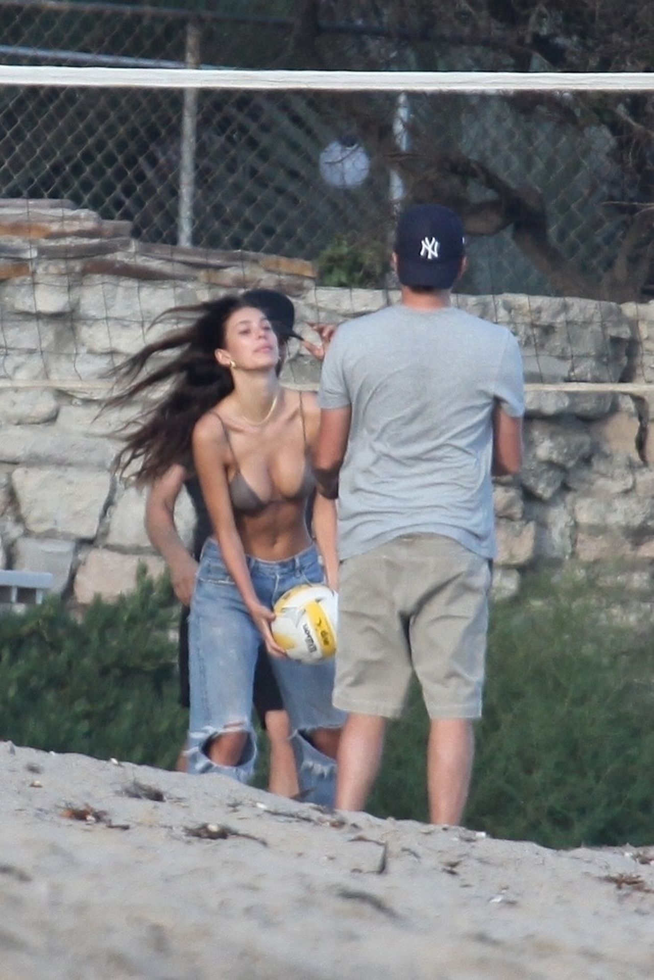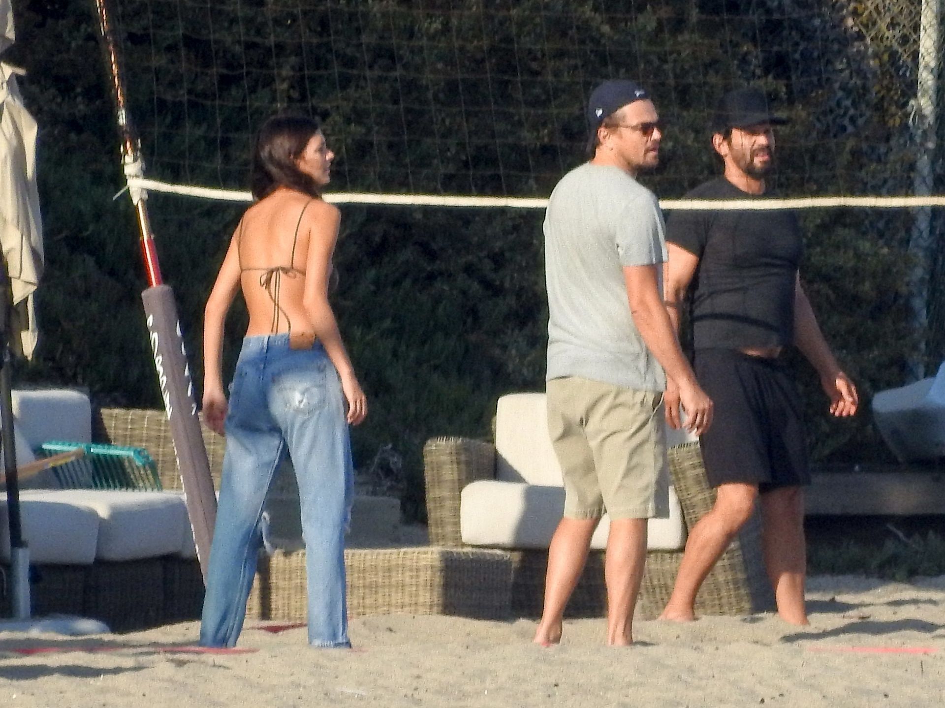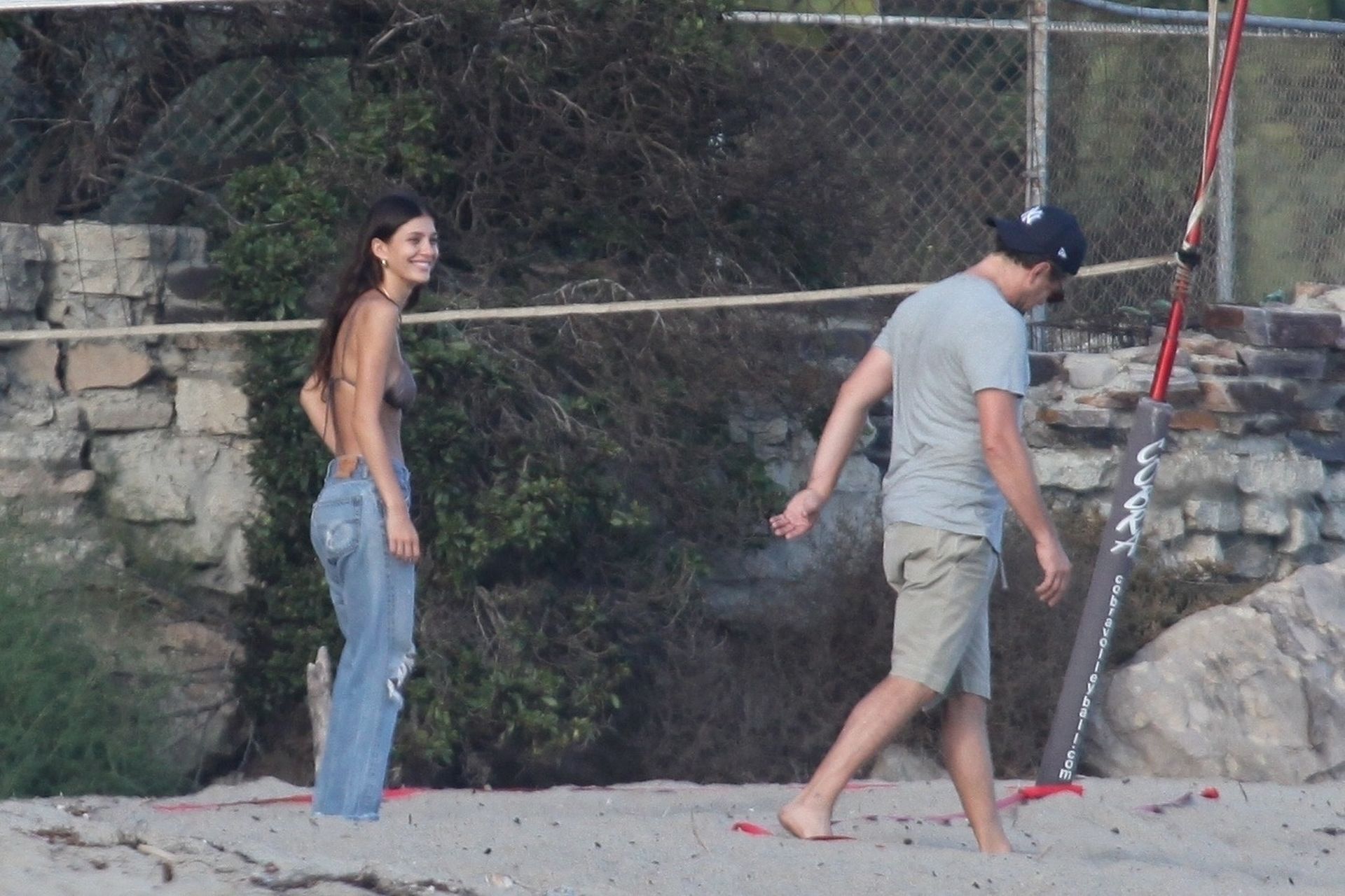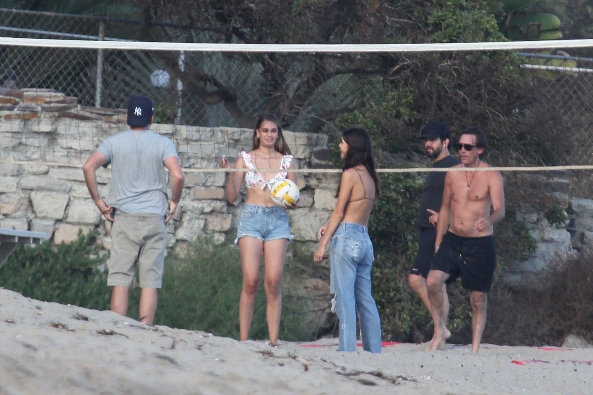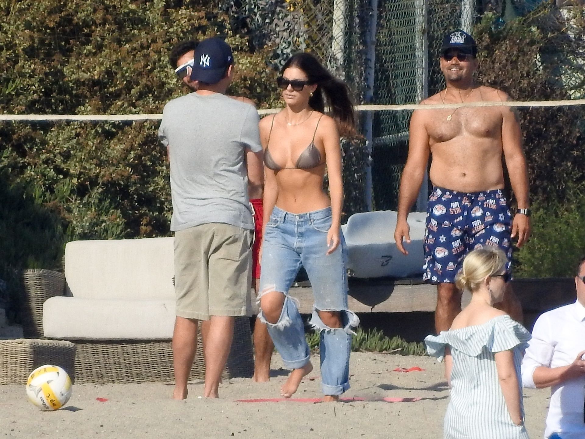 Leonardo DiCaprio, Camila Morrone, April Love Geary and Lukas Haas play volleyball on the beach in Malibu, 09/01/2019. Camila wore a string bikini top for the game paired with ripped jeans.