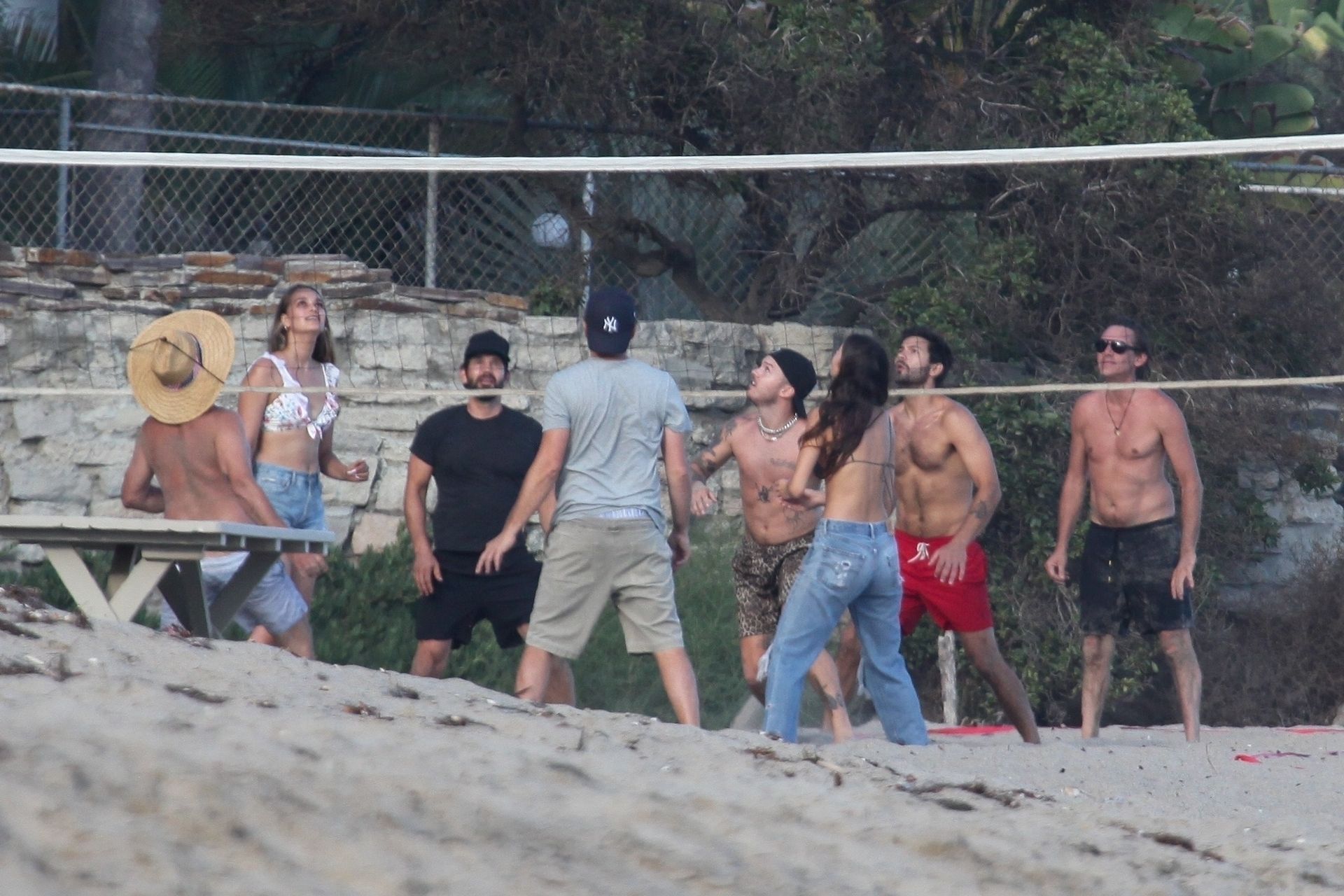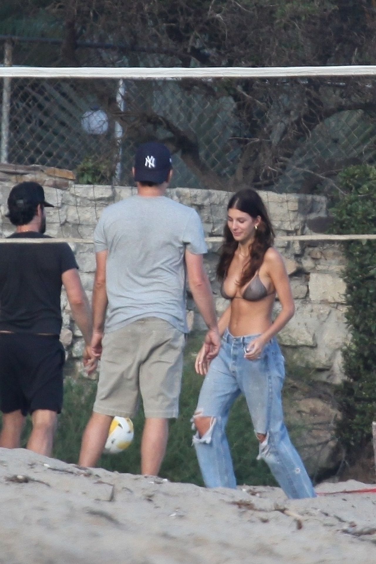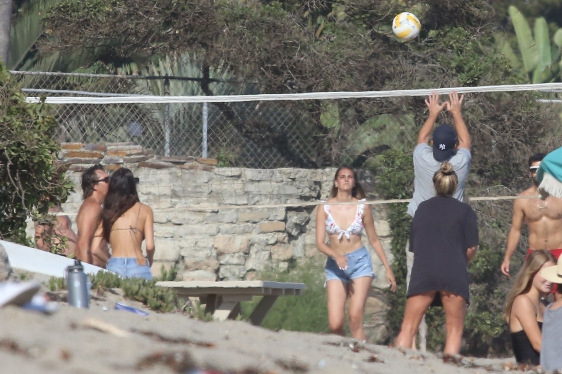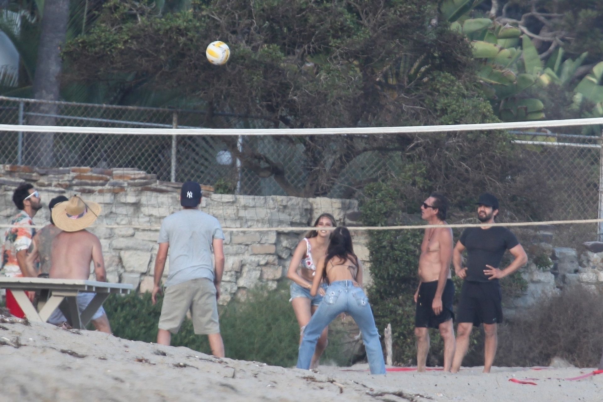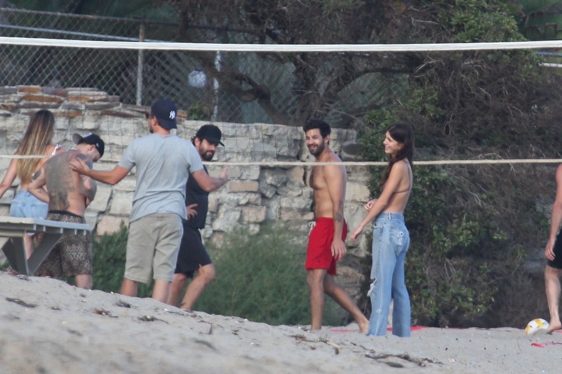 Leonardo DiCaprio, Camila Morrone, April Love Geary and Lukas Haas play volleyball on the beach in Malibu, 09/01/2019. Camila wore a string bikini top for the game paired with ripped jeans.