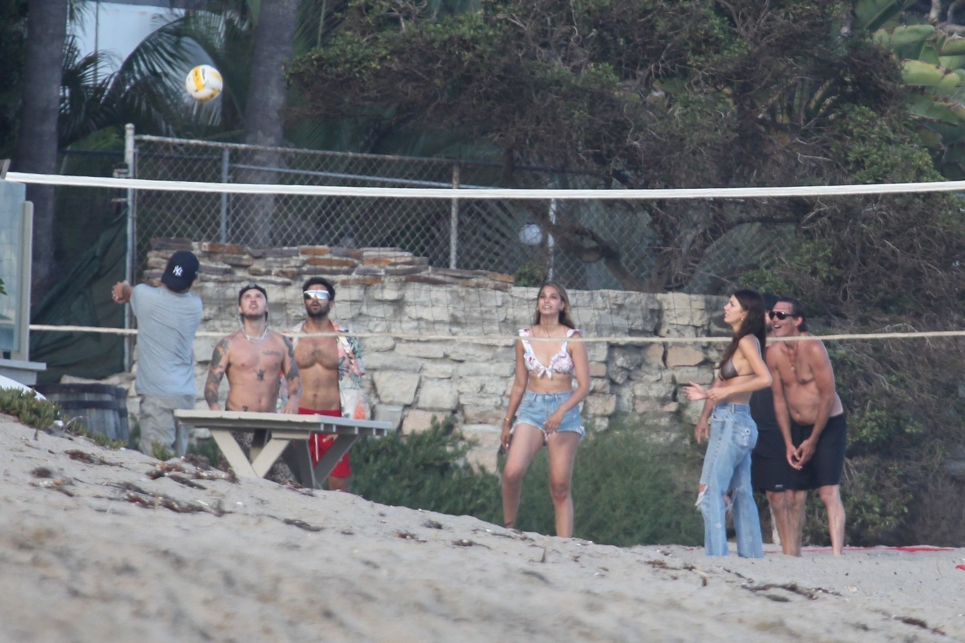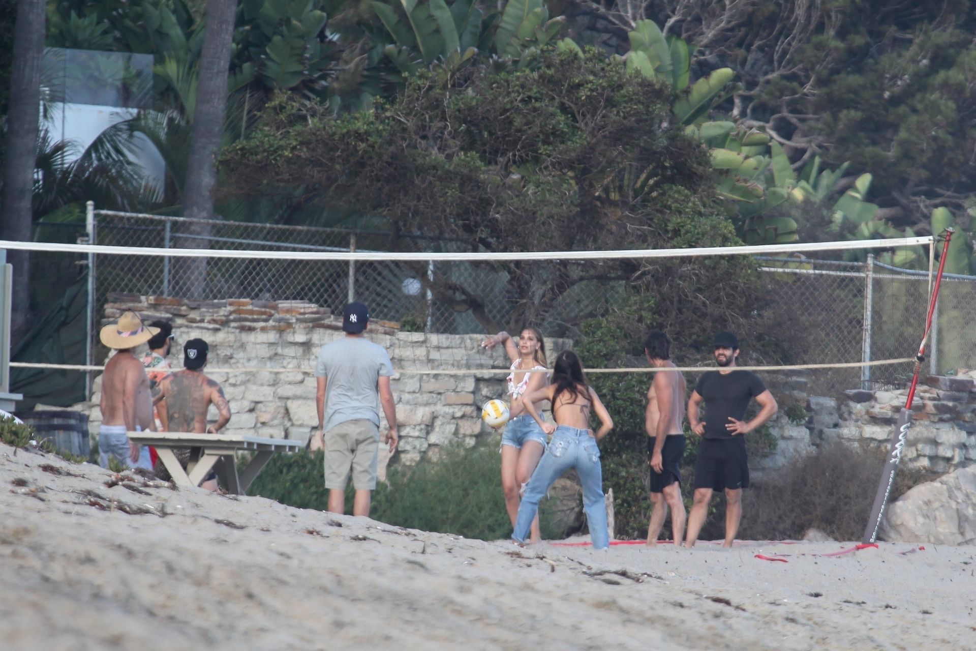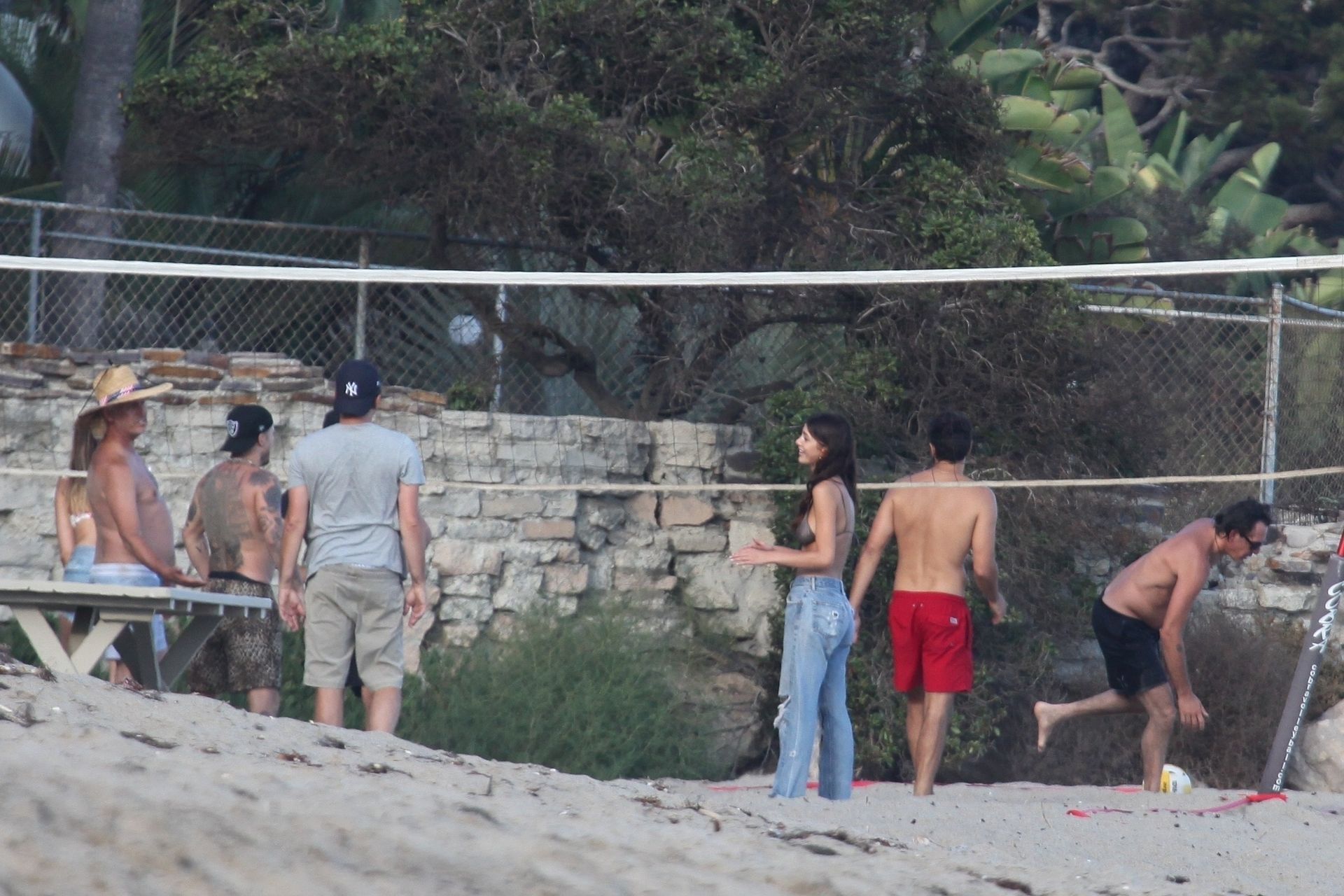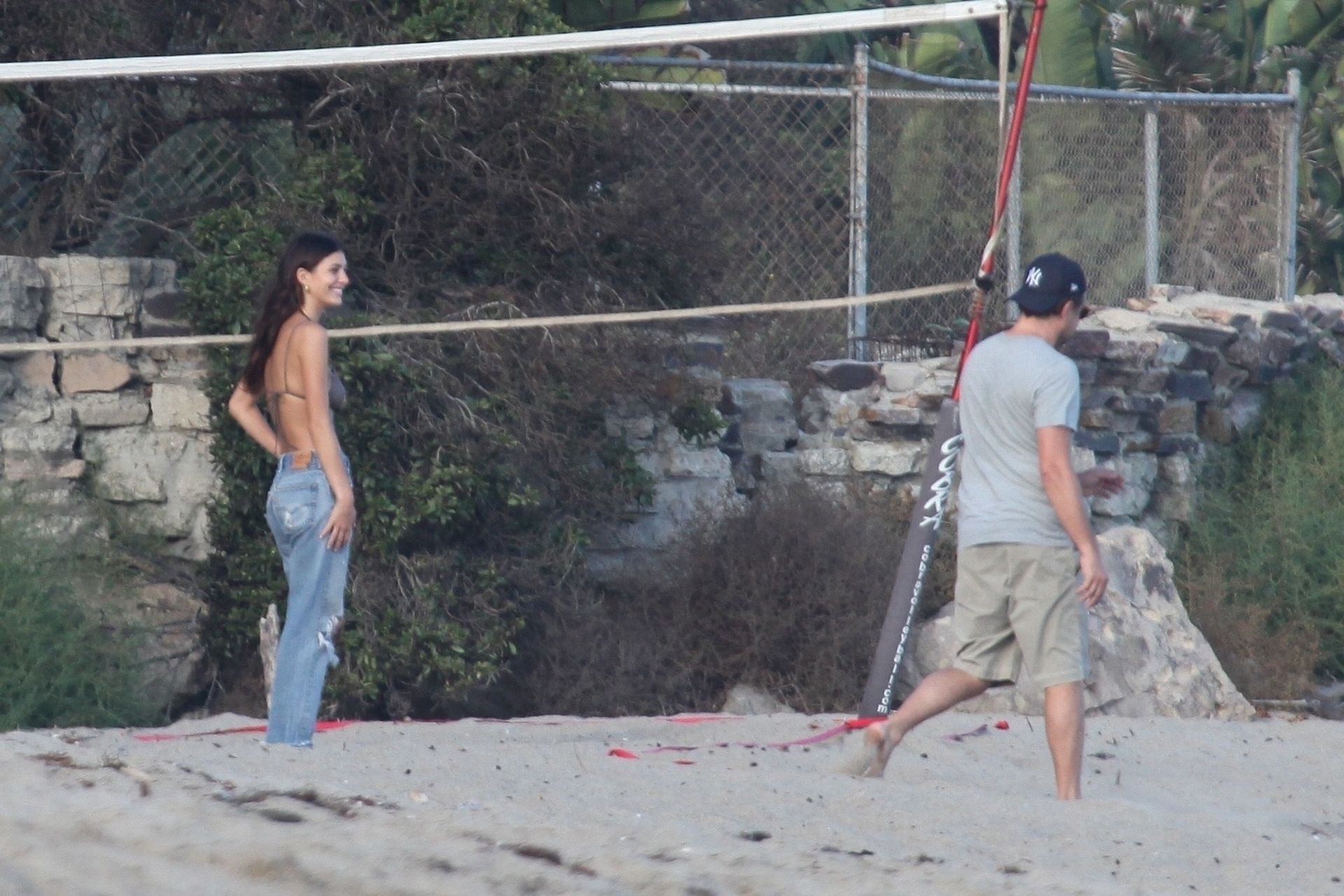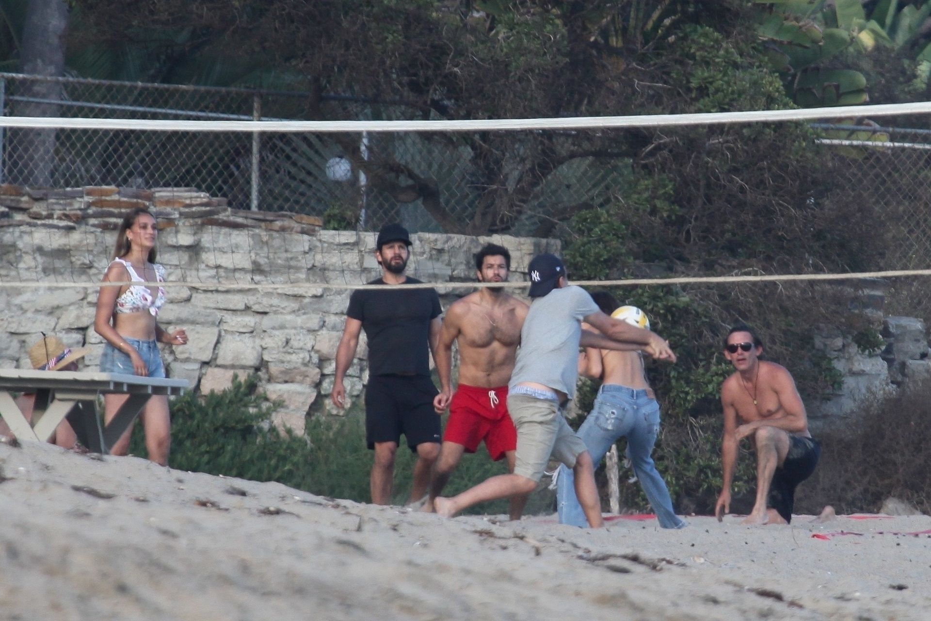 Leonardo DiCaprio, Camila Morrone, April Love Geary and Lukas Haas play volleyball on the beach in Malibu, 09/01/2019. Camila wore a string bikini top for the game paired with ripped jeans.
