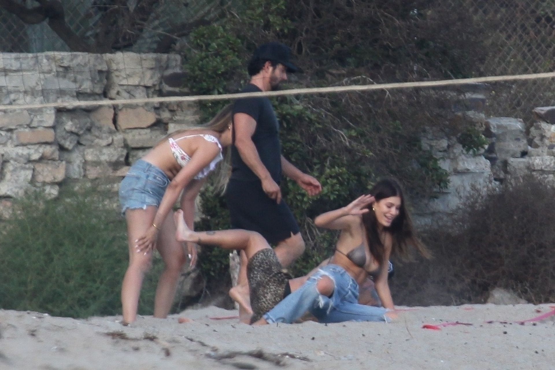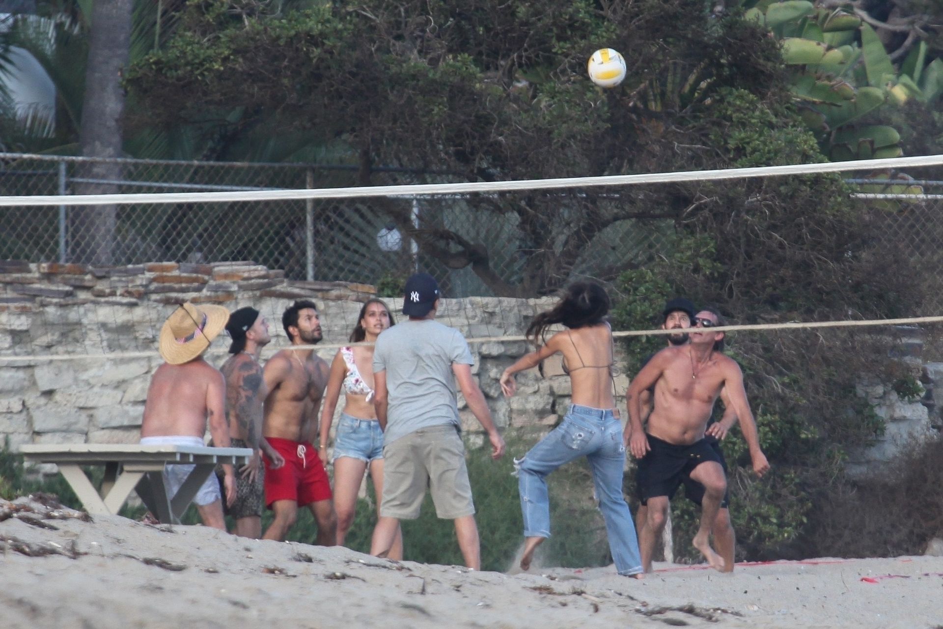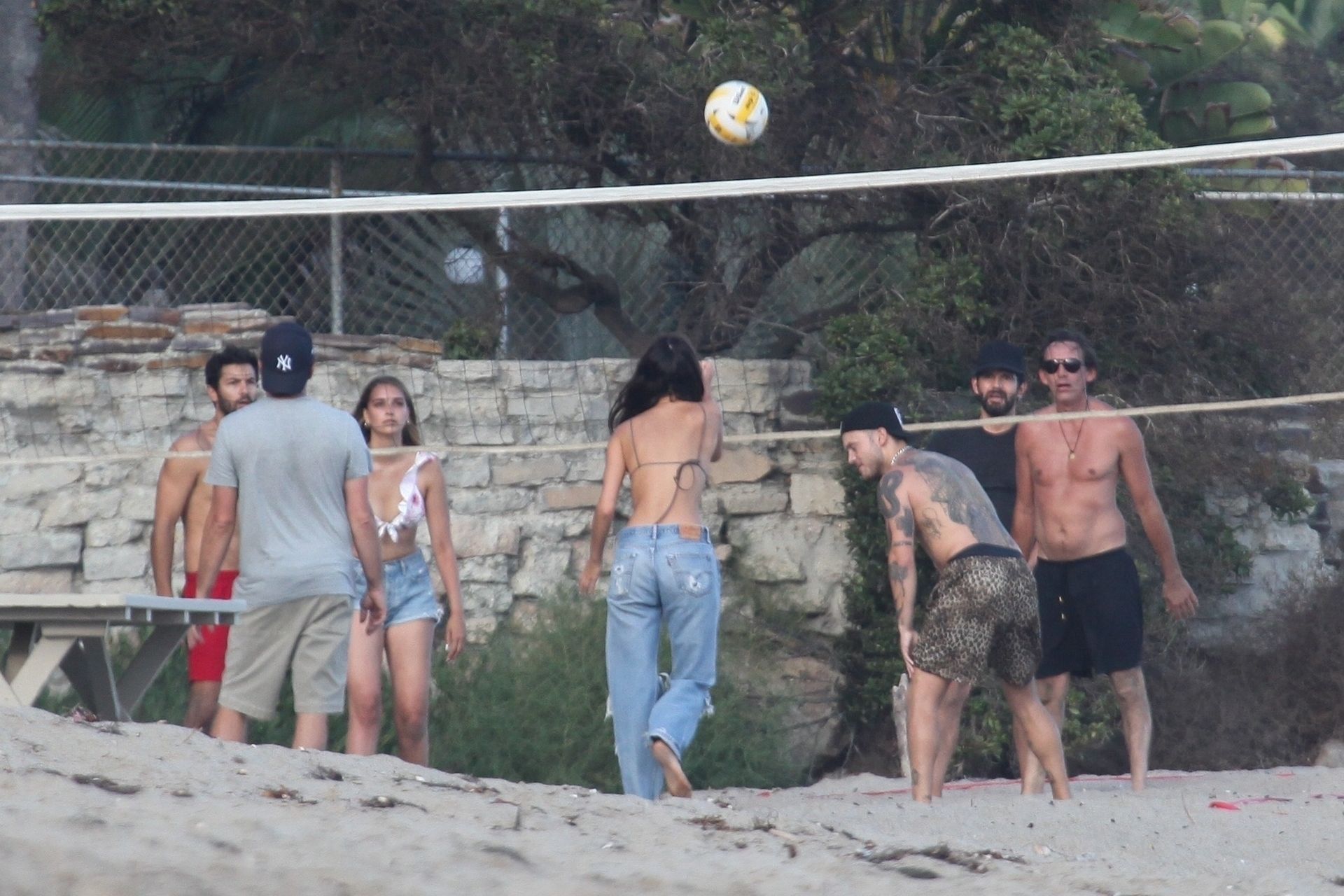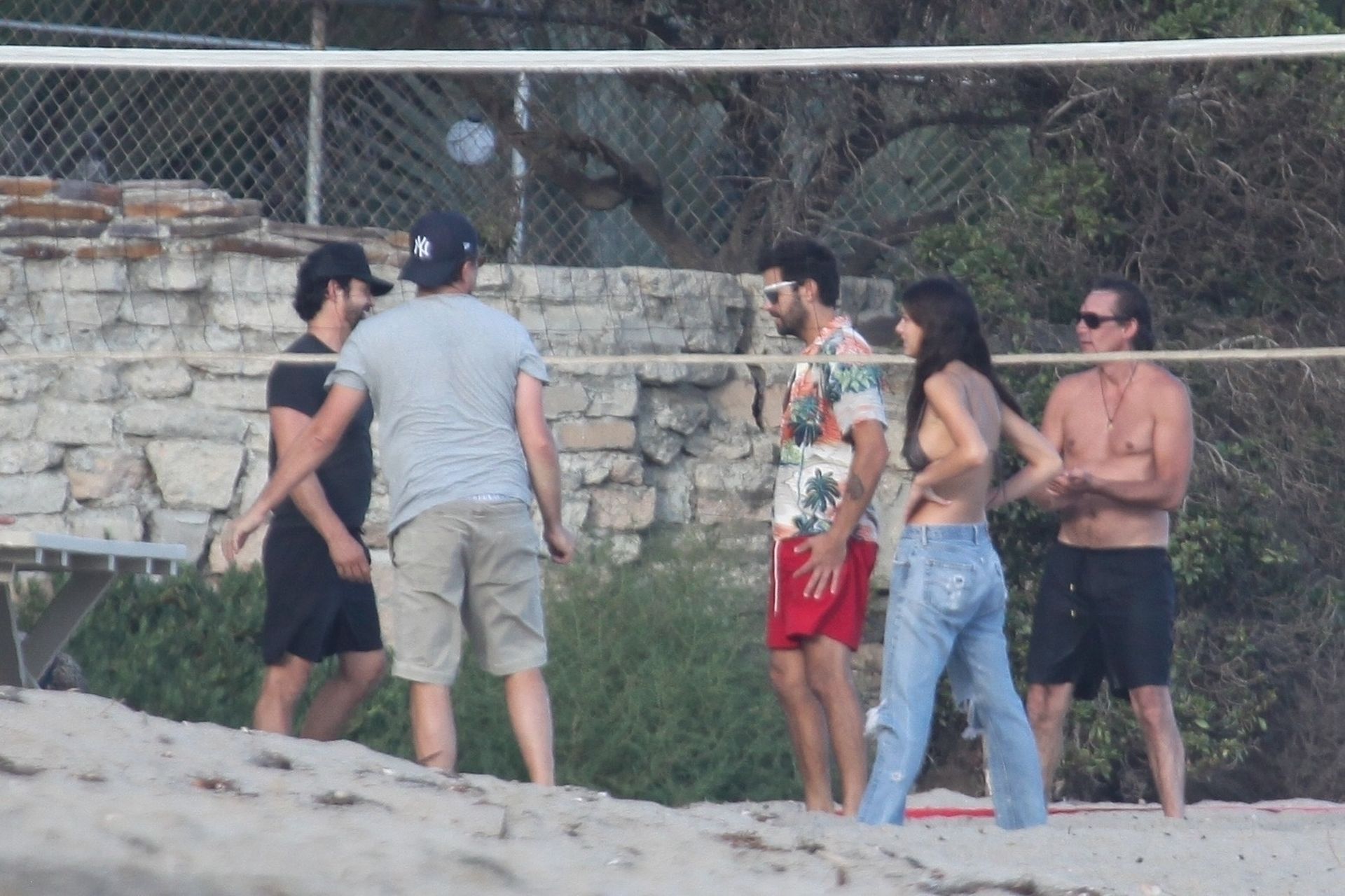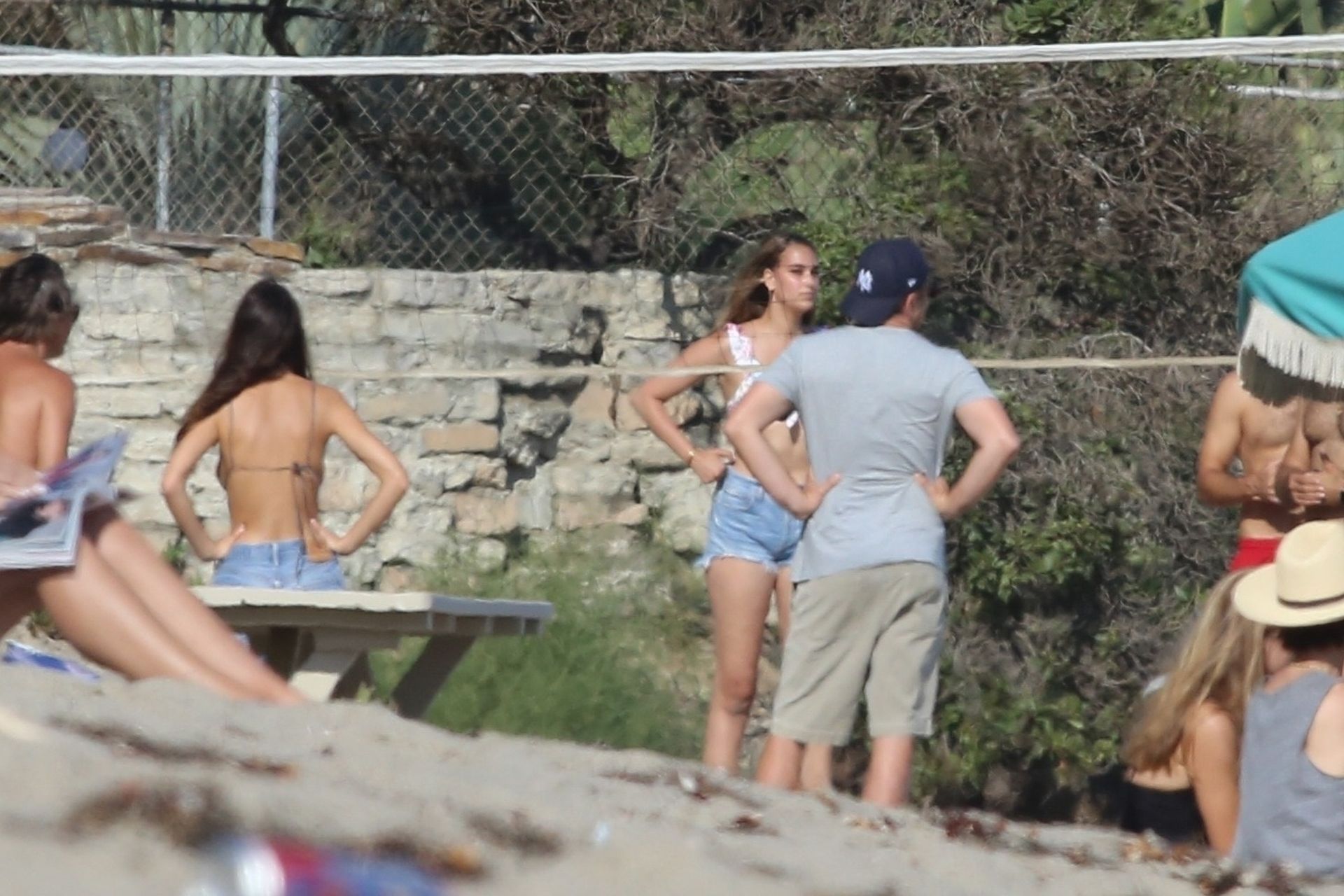 Leonardo DiCaprio, Camila Morrone, April Love Geary and Lukas Haas play volleyball on the beach in Malibu, 09/01/2019. Camila wore a string bikini top for the game paired with ripped jeans.