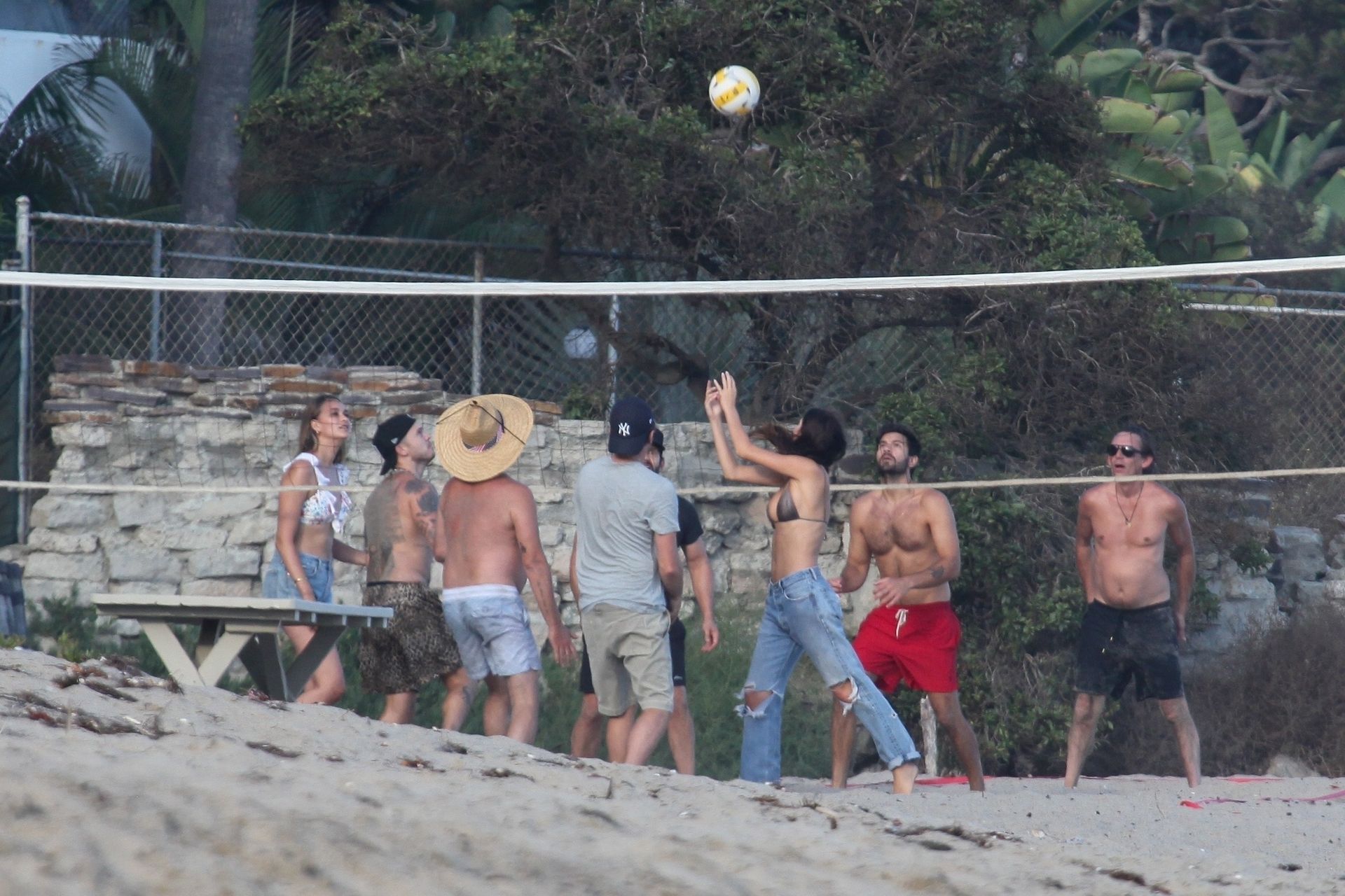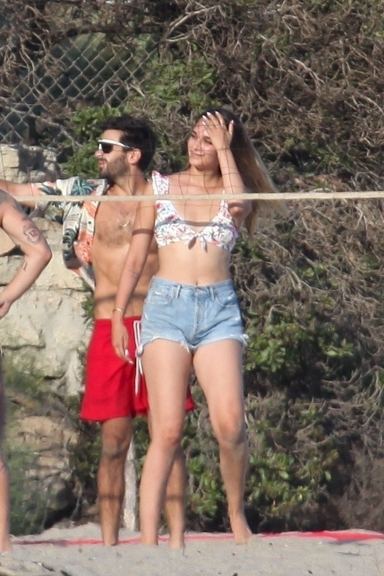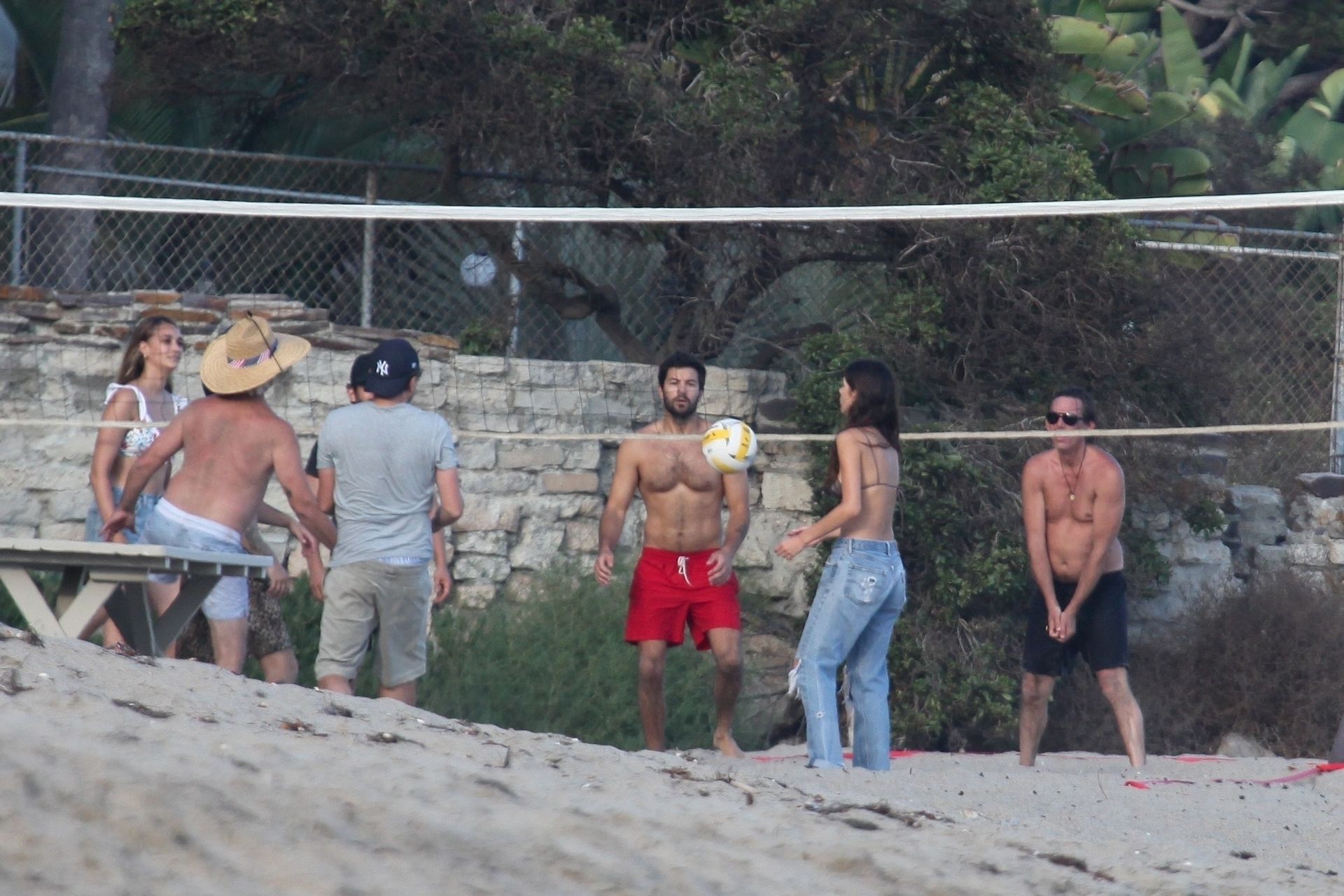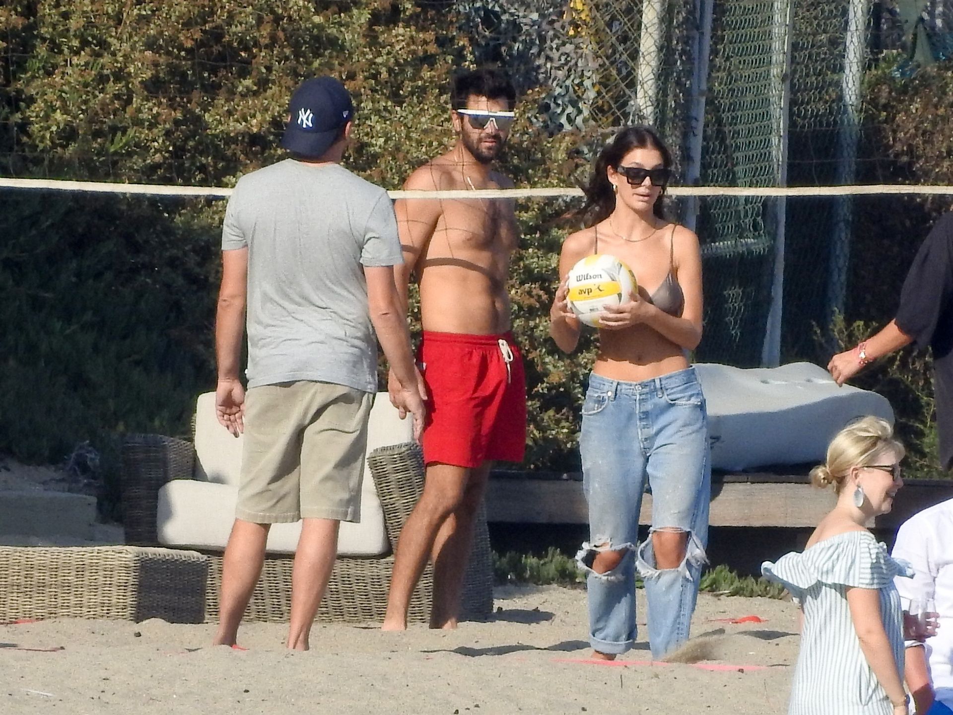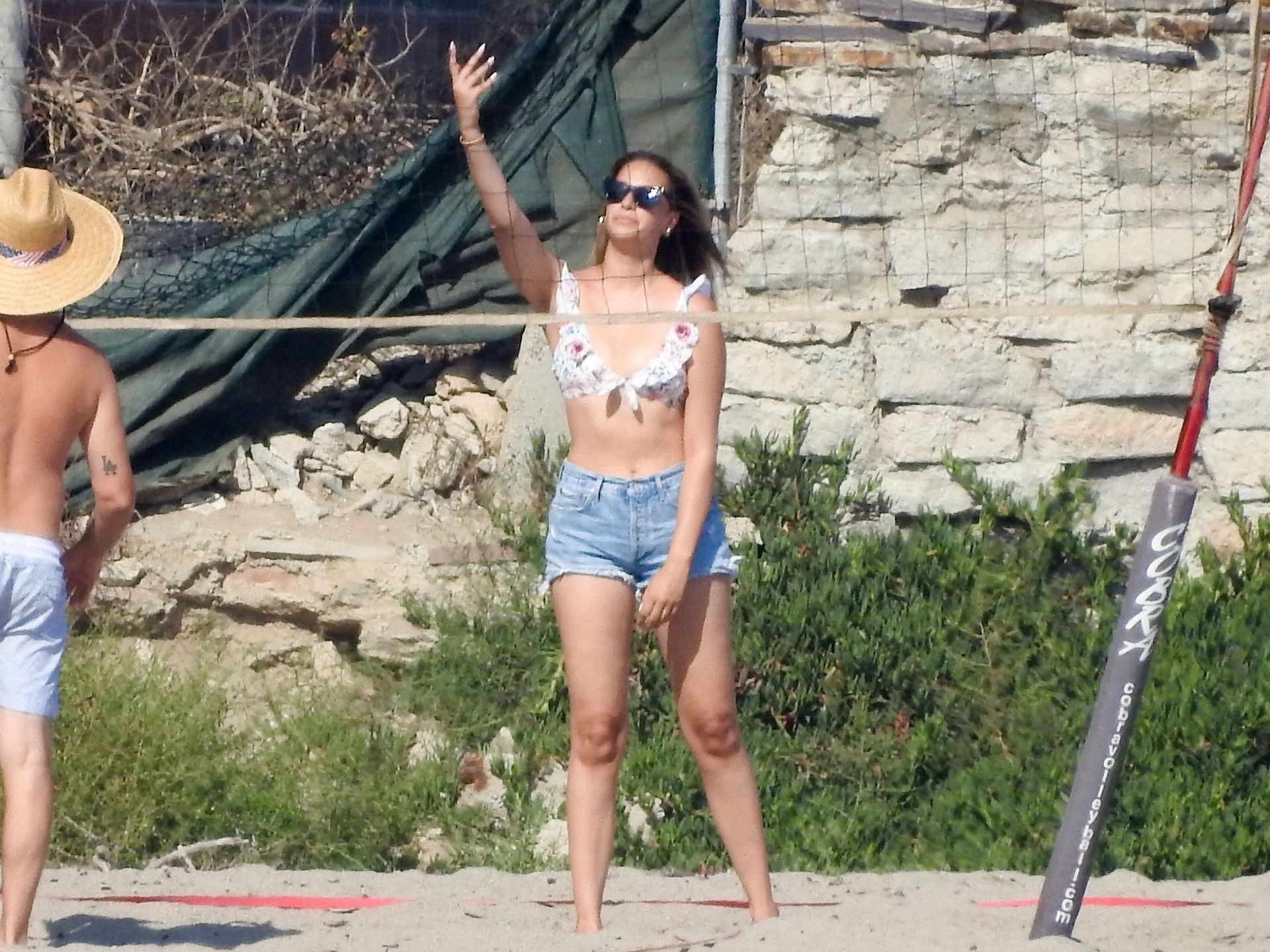 Leonardo DiCaprio, Camila Morrone, April Love Geary and Lukas Haas play volleyball on the beach in Malibu, 09/01/2019. Camila wore a string bikini top for the game paired with ripped jeans.