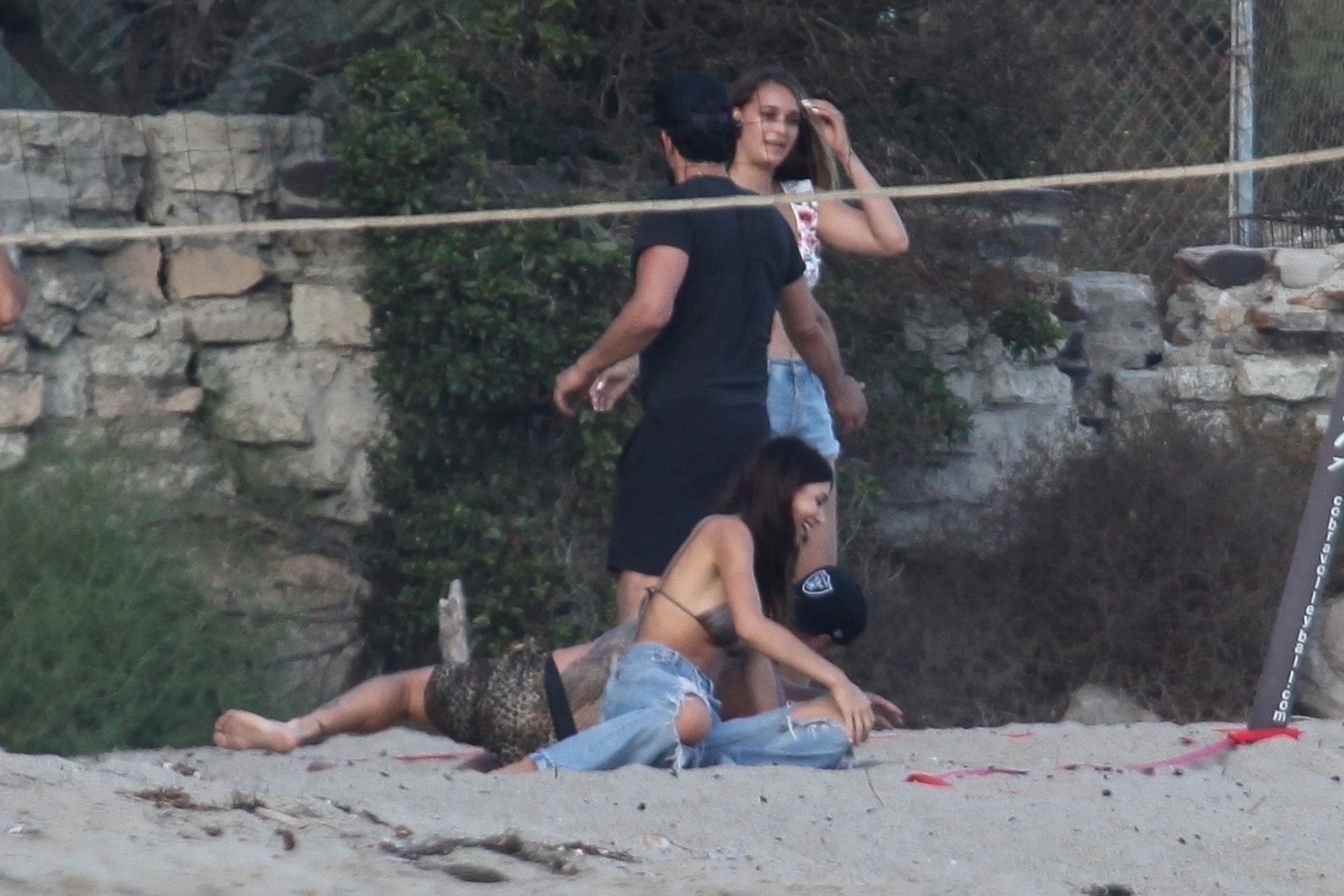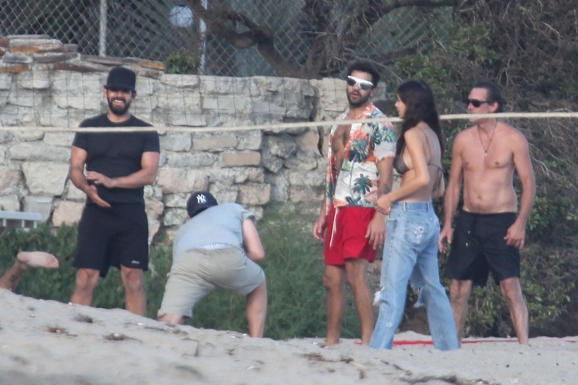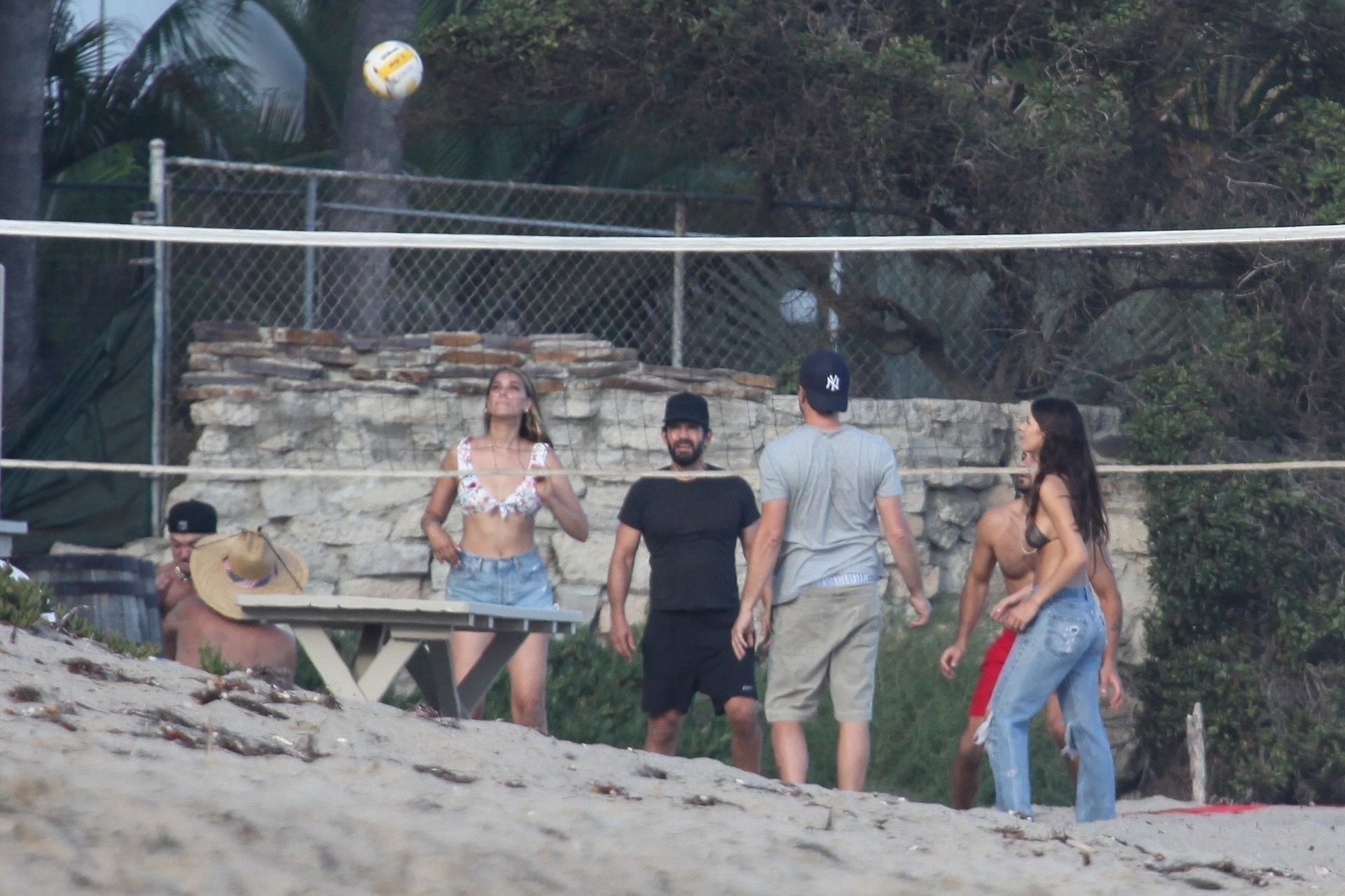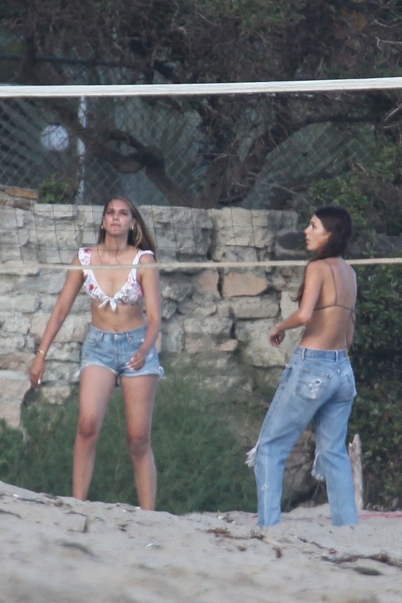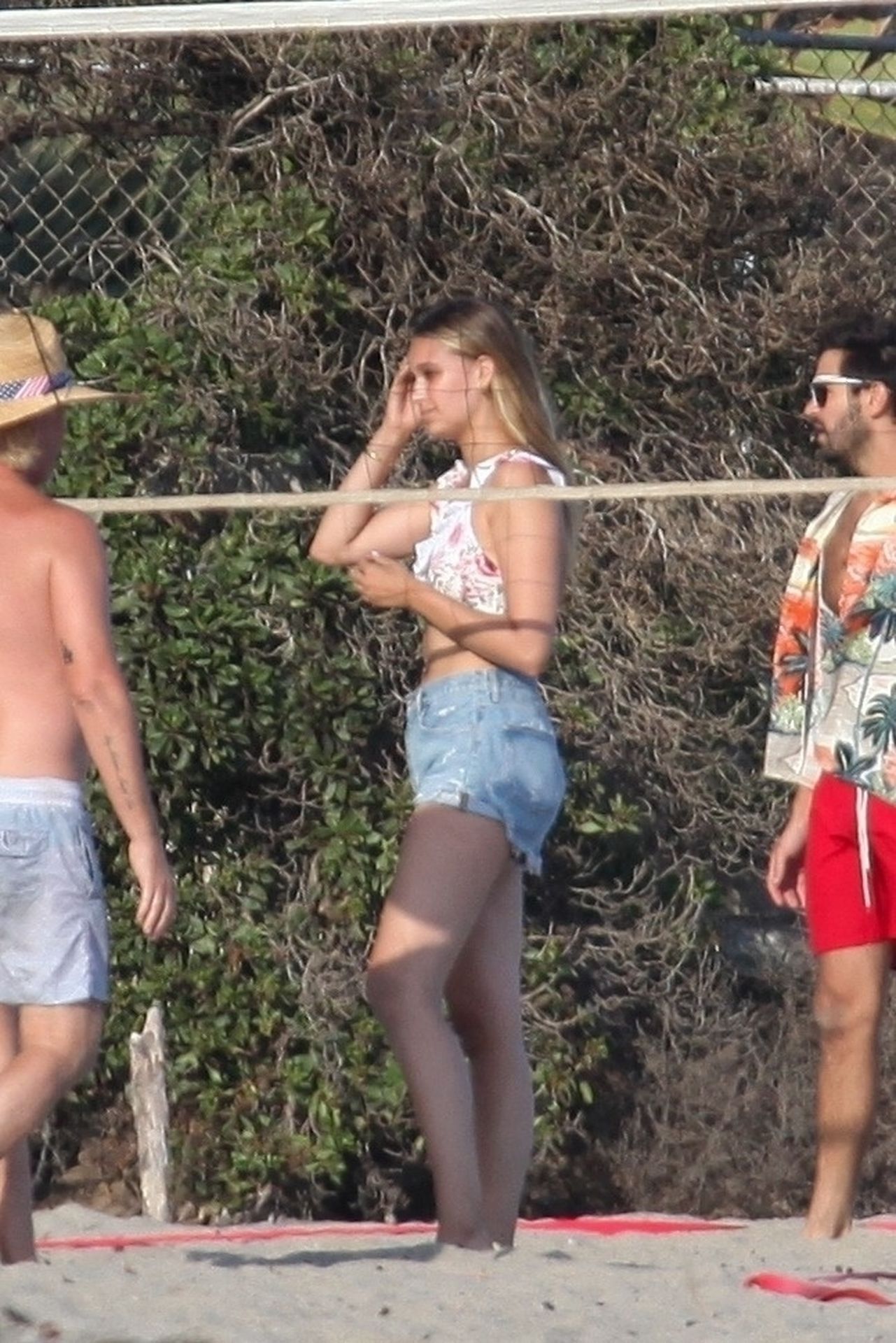 Leonardo DiCaprio, Camila Morrone, April Love Geary and Lukas Haas play volleyball on the beach in Malibu, 09/01/2019. Camila wore a string bikini top for the game paired with ripped jeans.