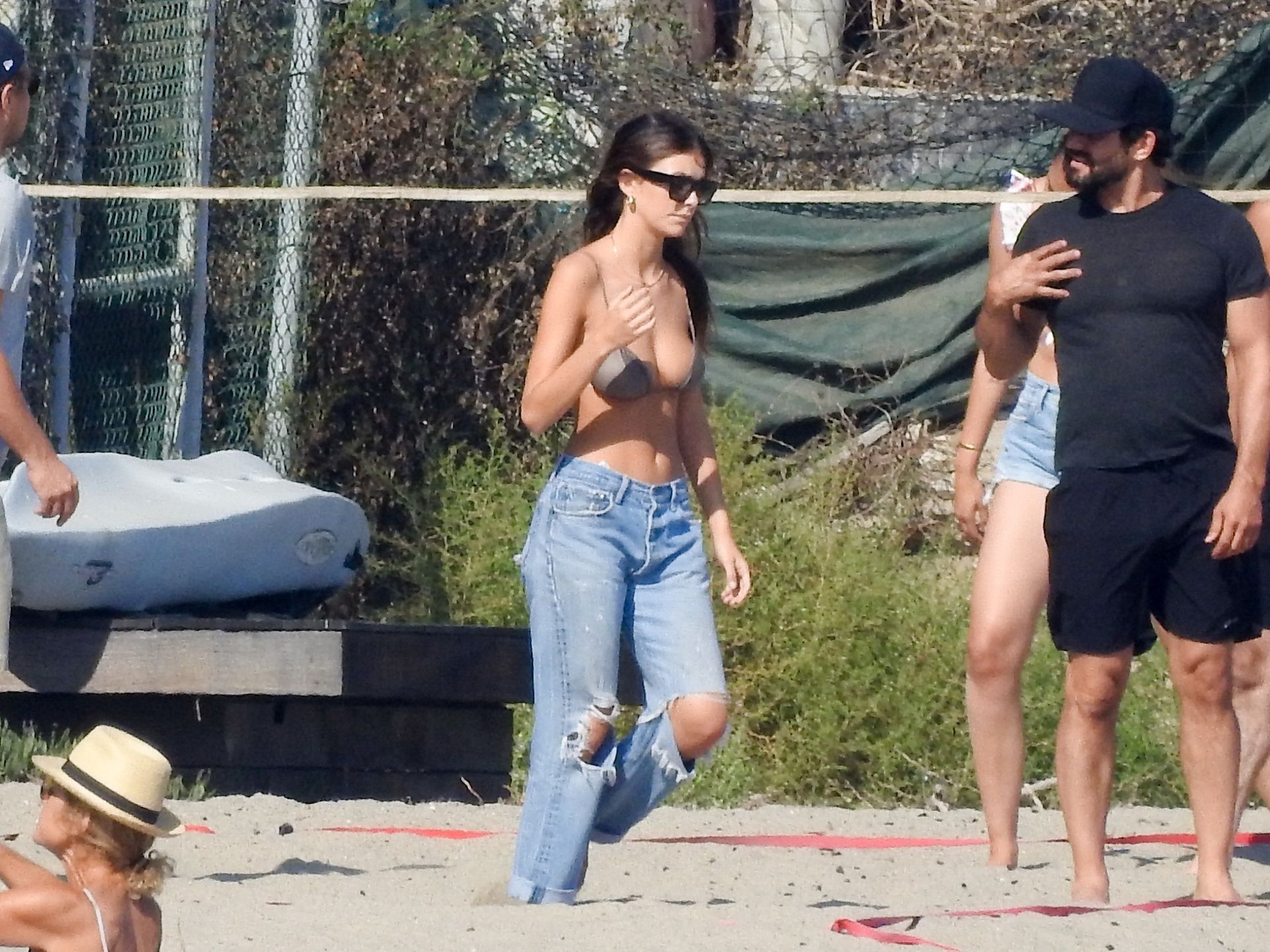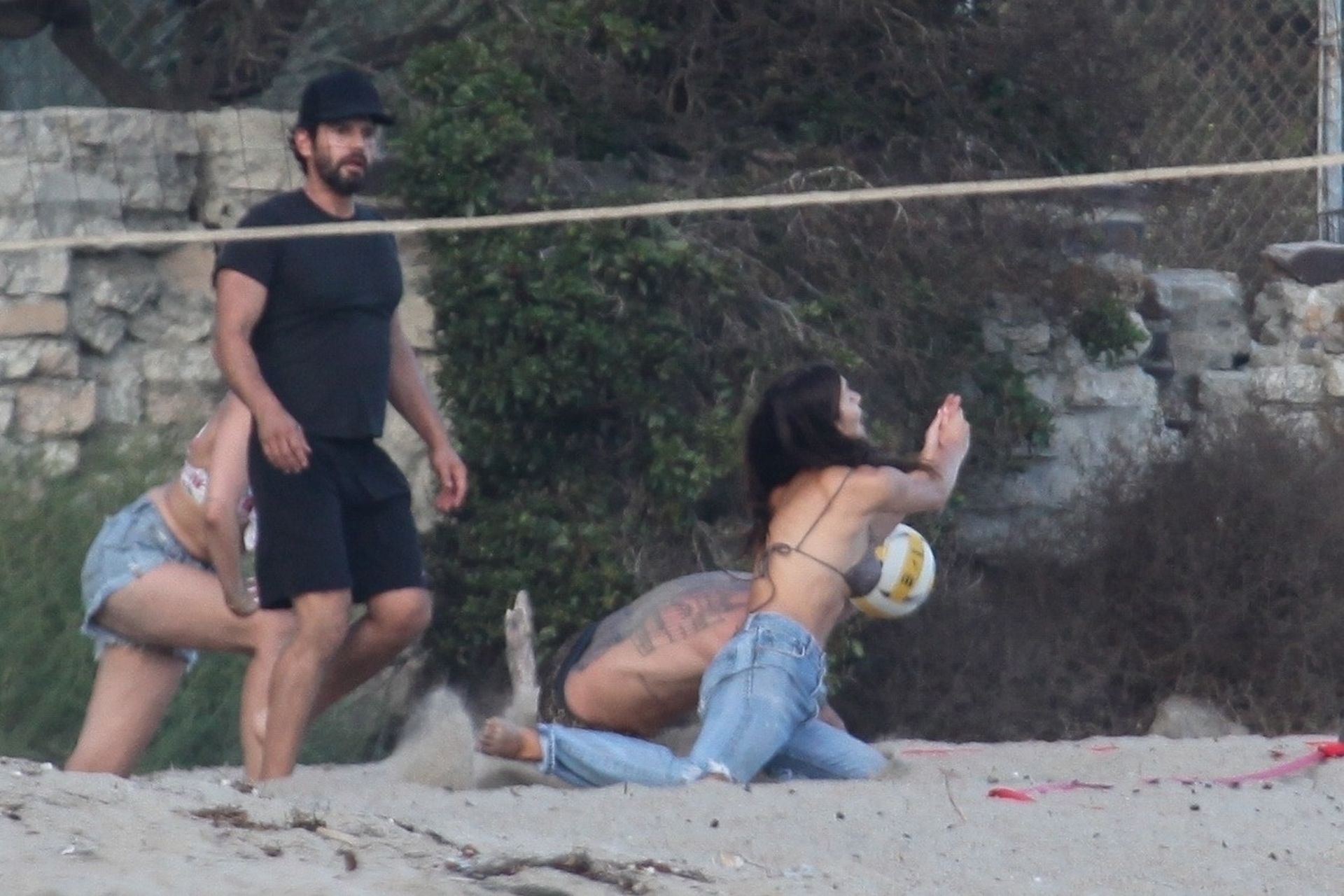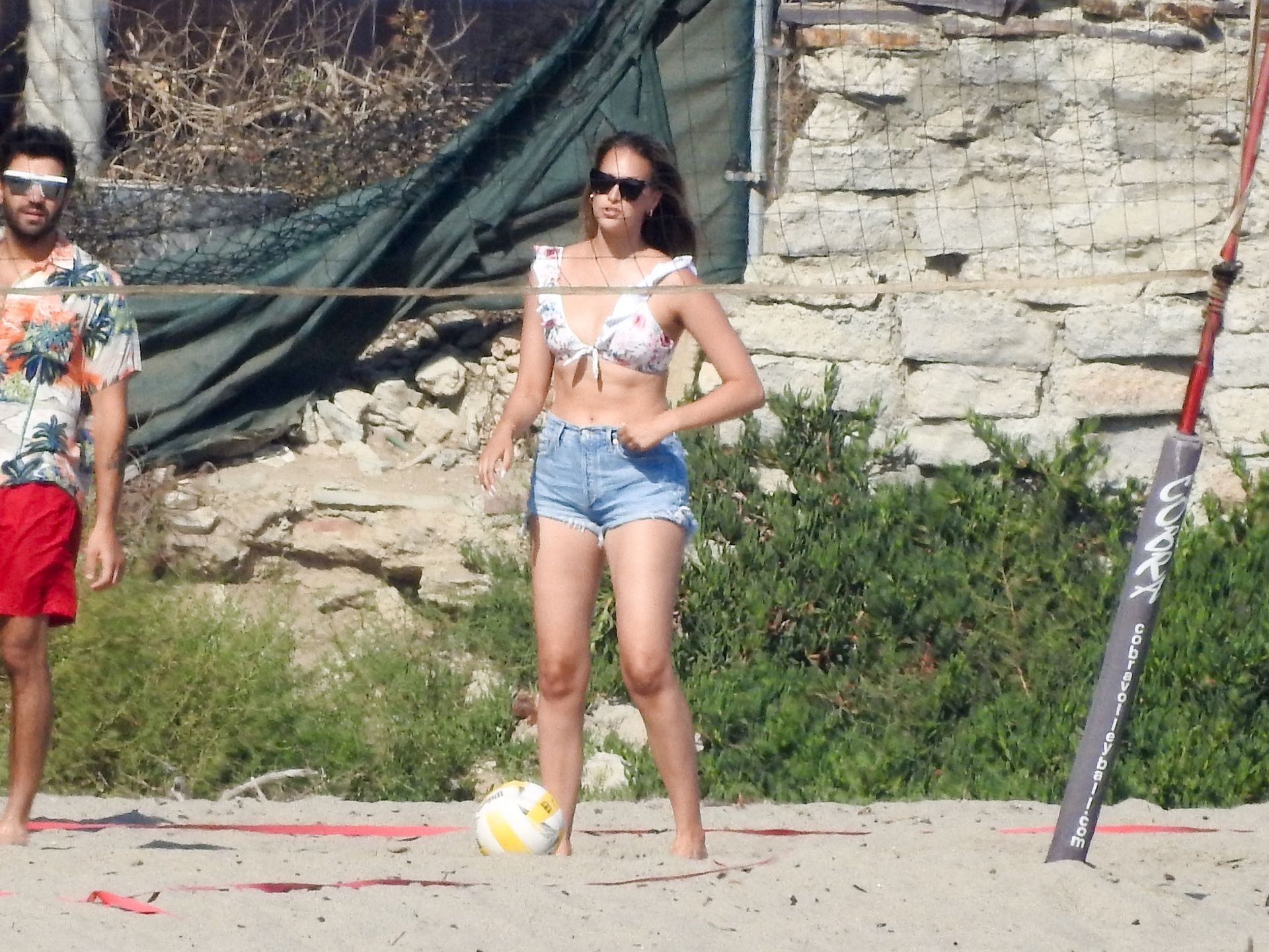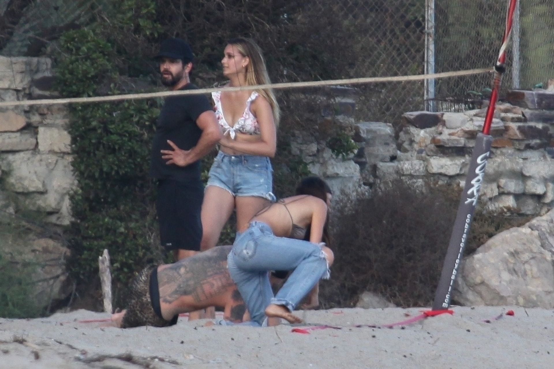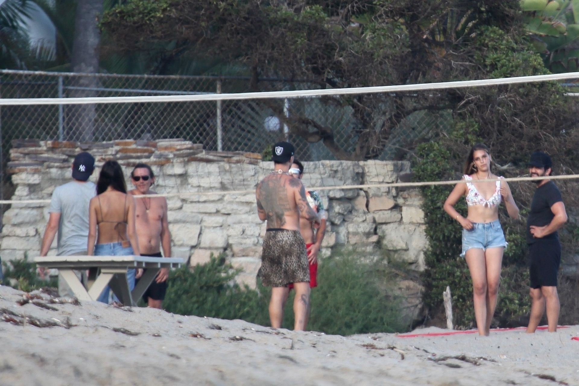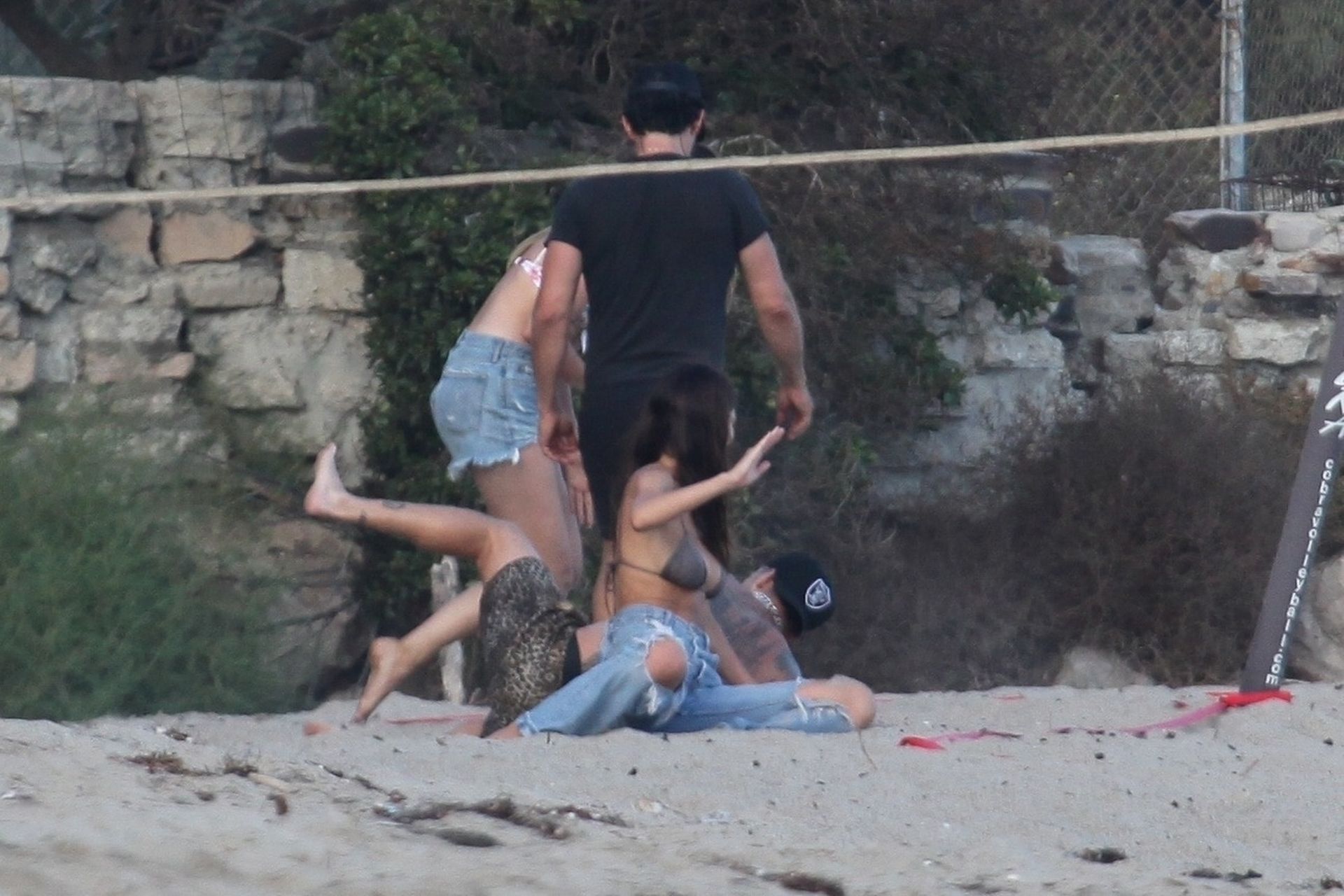 Leonardo DiCaprio, Camila Morrone, April Love Geary and Lukas Haas play volleyball on the beach in Malibu, 09/01/2019. Camila wore a string bikini top for the game paired with ripped jeans.