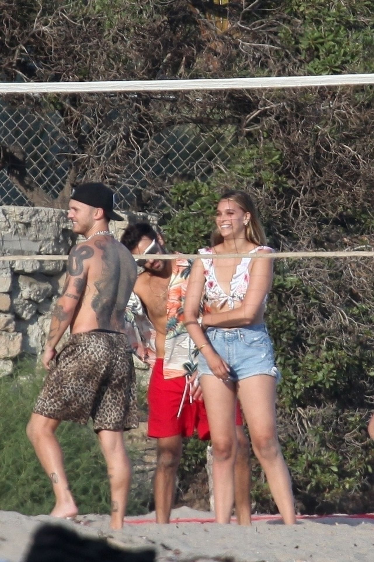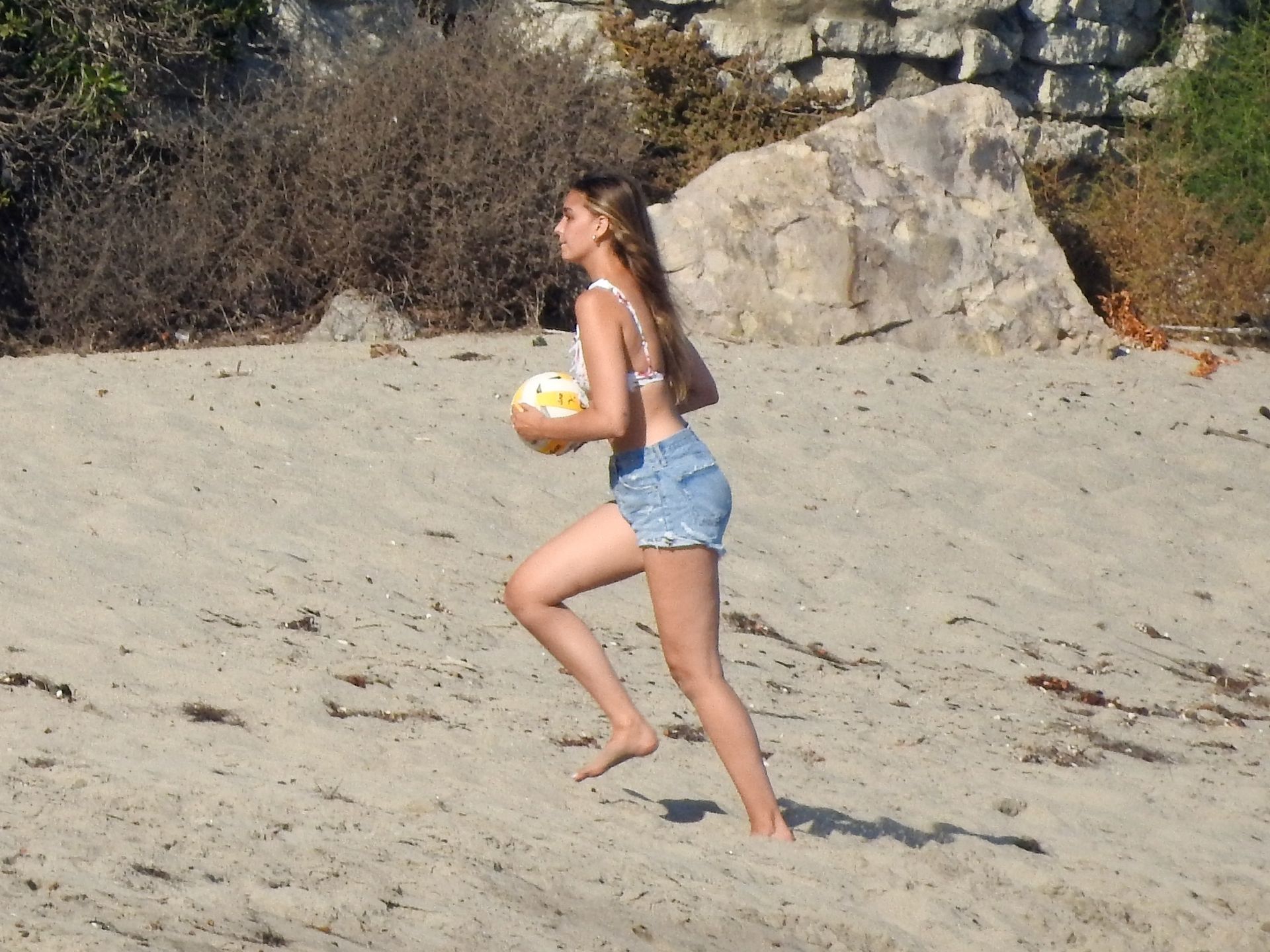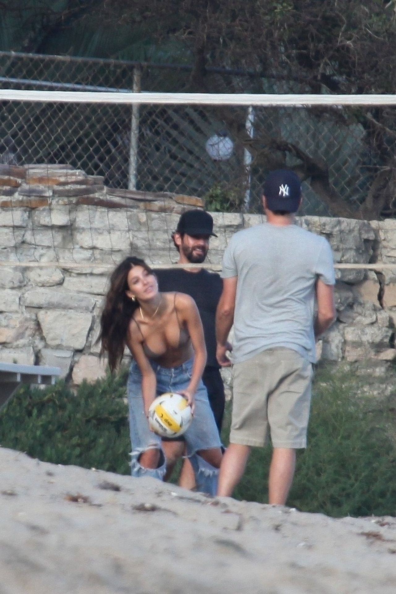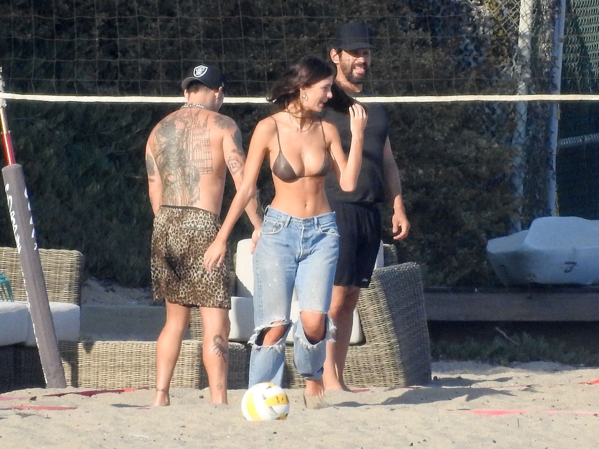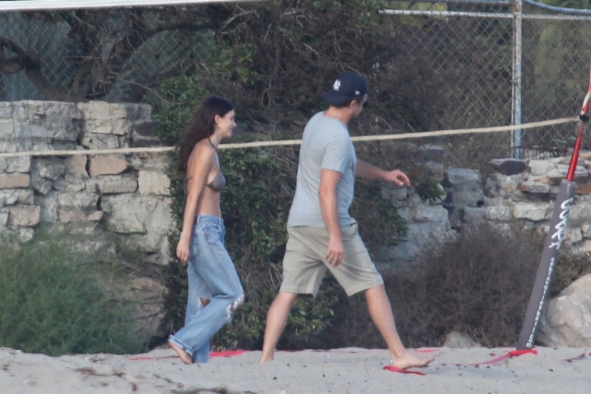 Leonardo DiCaprio, Camila Morrone, April Love Geary and Lukas Haas play volleyball on the beach in Malibu, 09/01/2019. Camila wore a string bikini top for the game paired with ripped jeans.