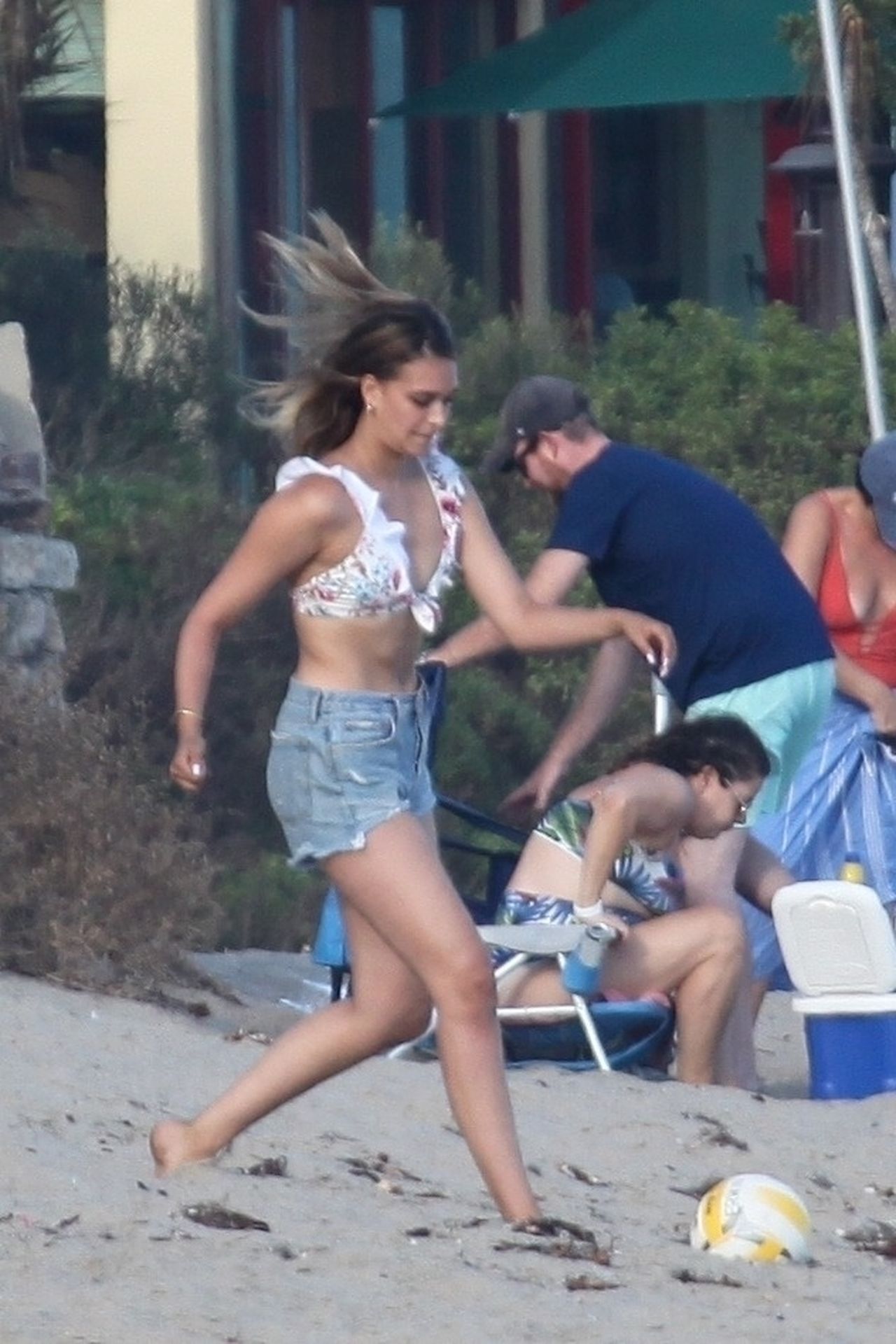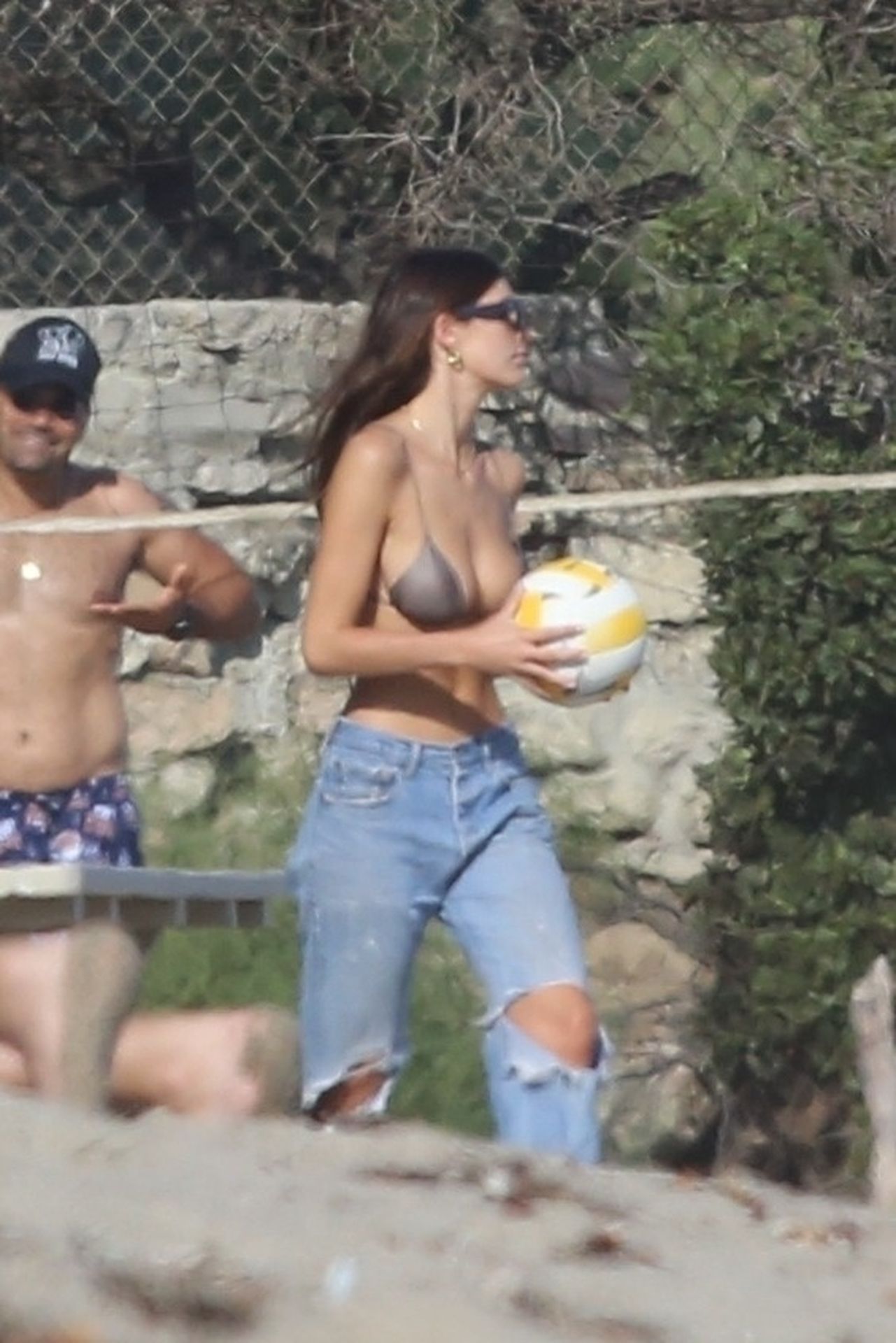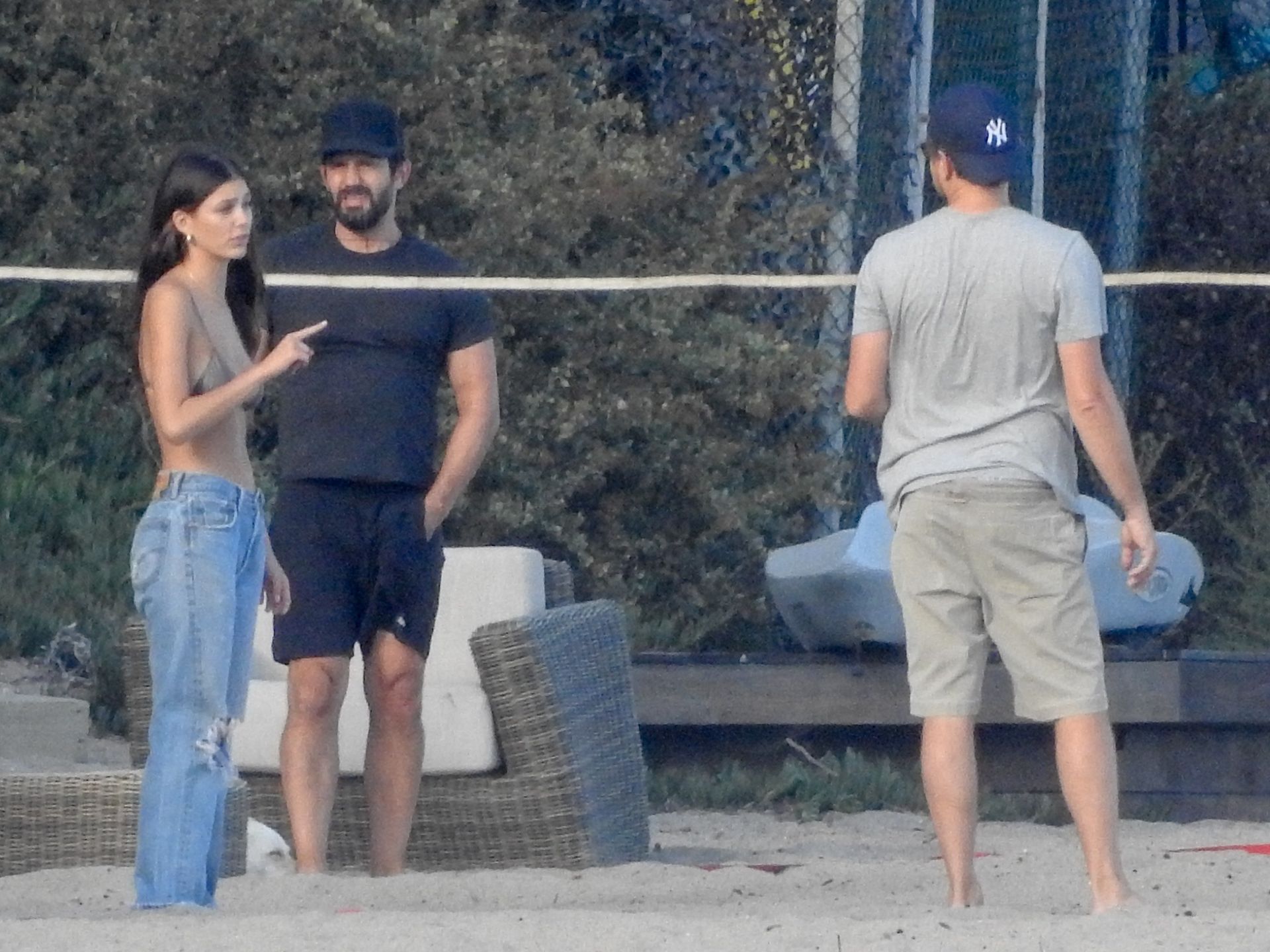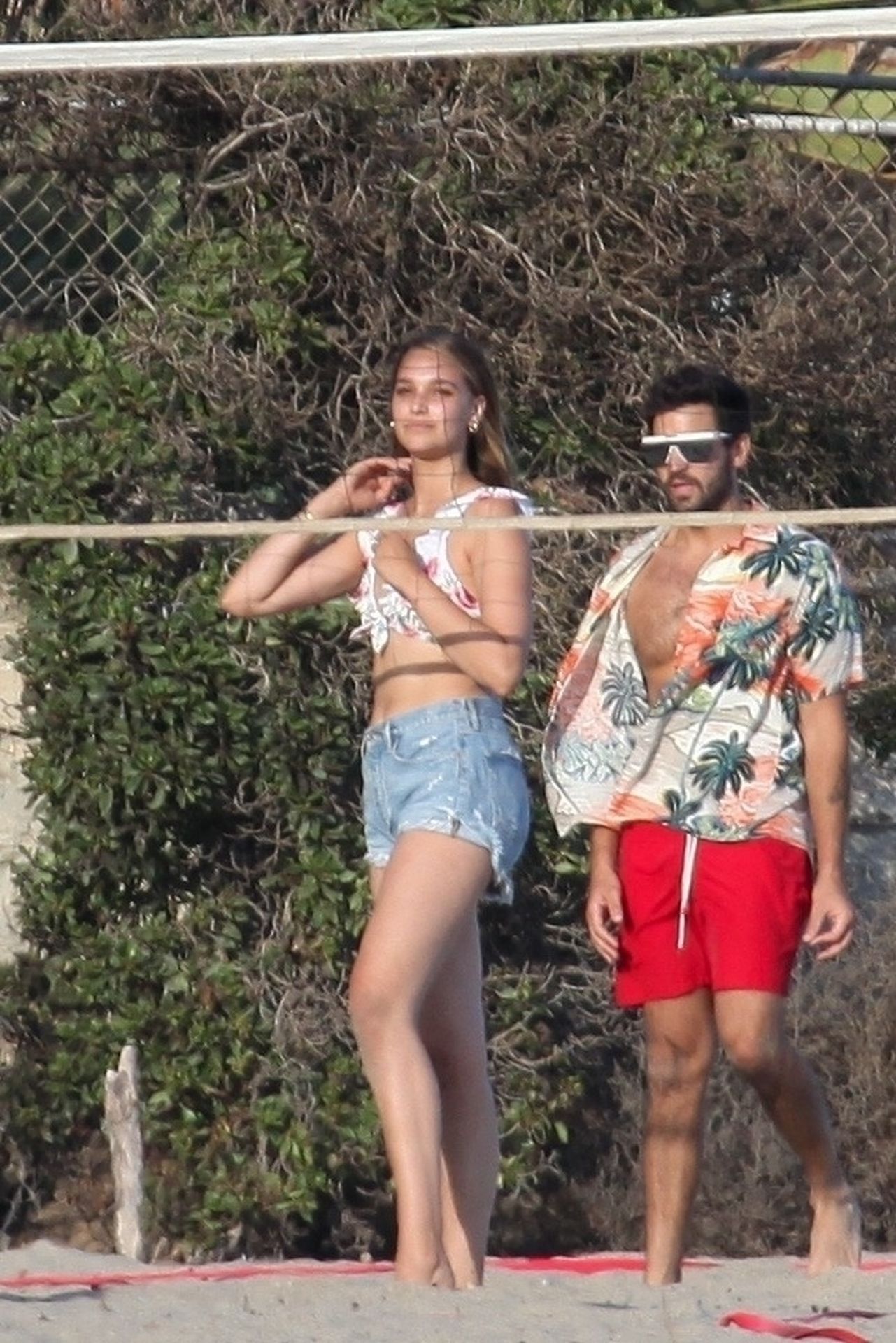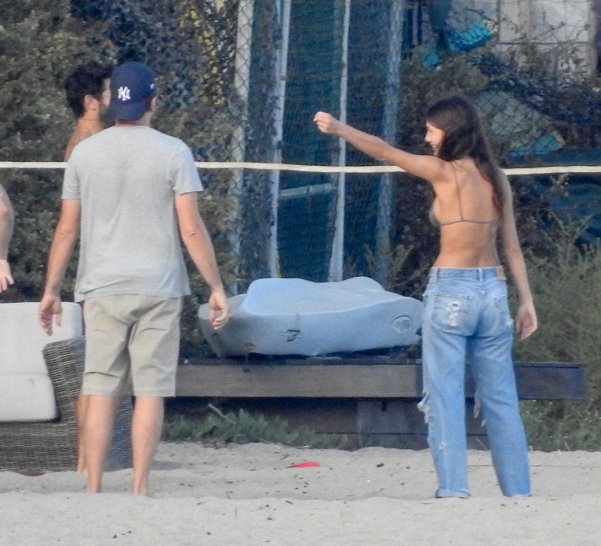 Leonardo DiCaprio, Camila Morrone, April Love Geary and Lukas Haas play volleyball on the beach in Malibu, 09/01/2019. Camila wore a string bikini top for the game paired with ripped jeans.