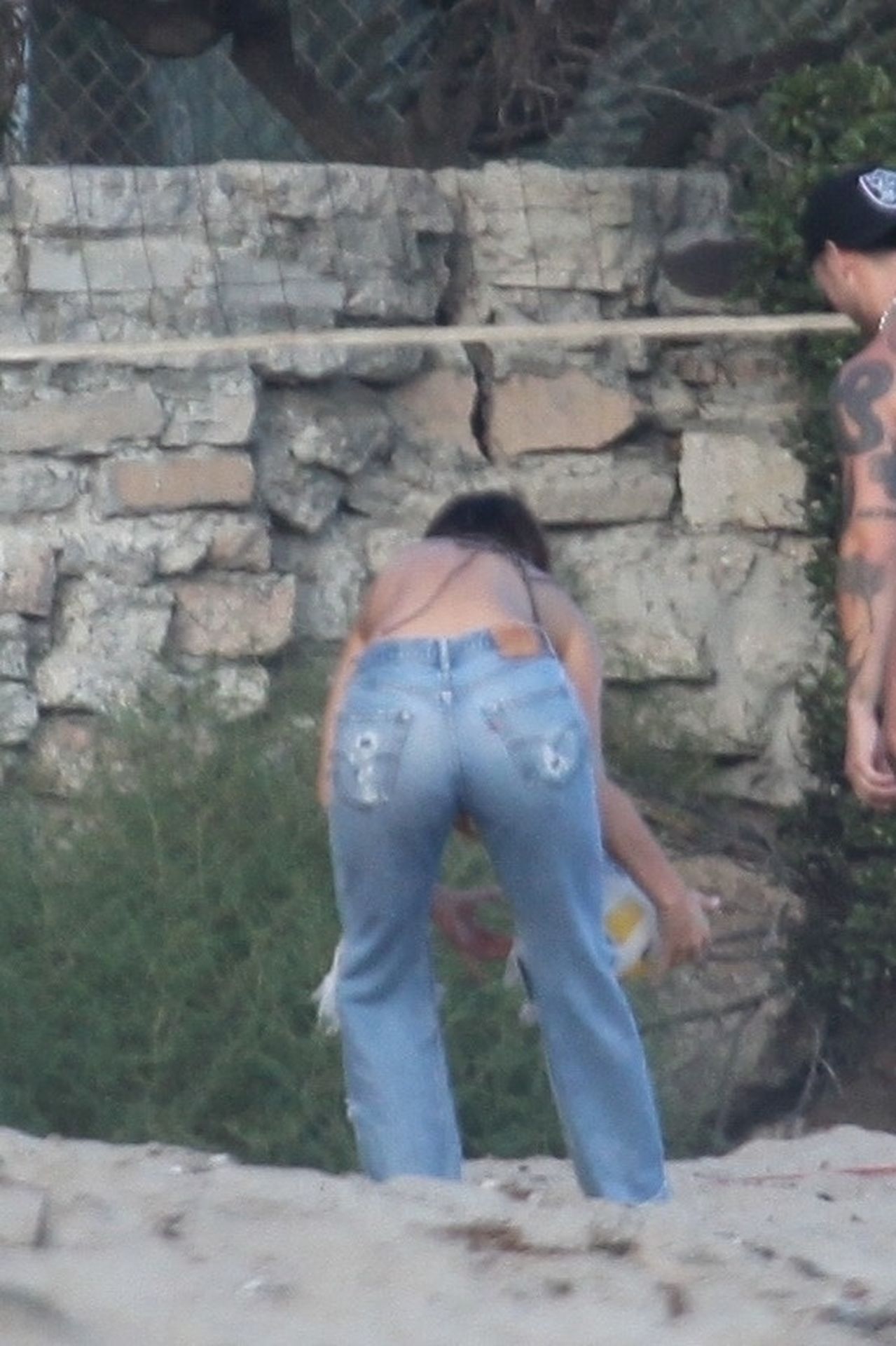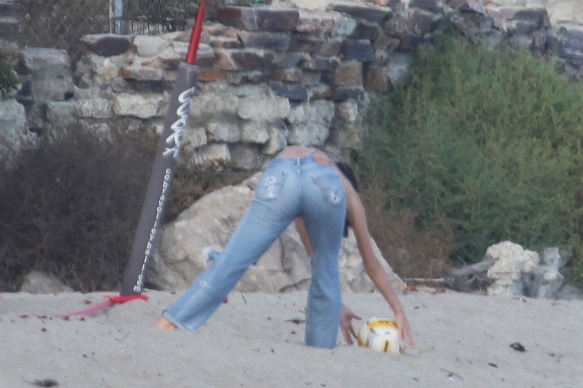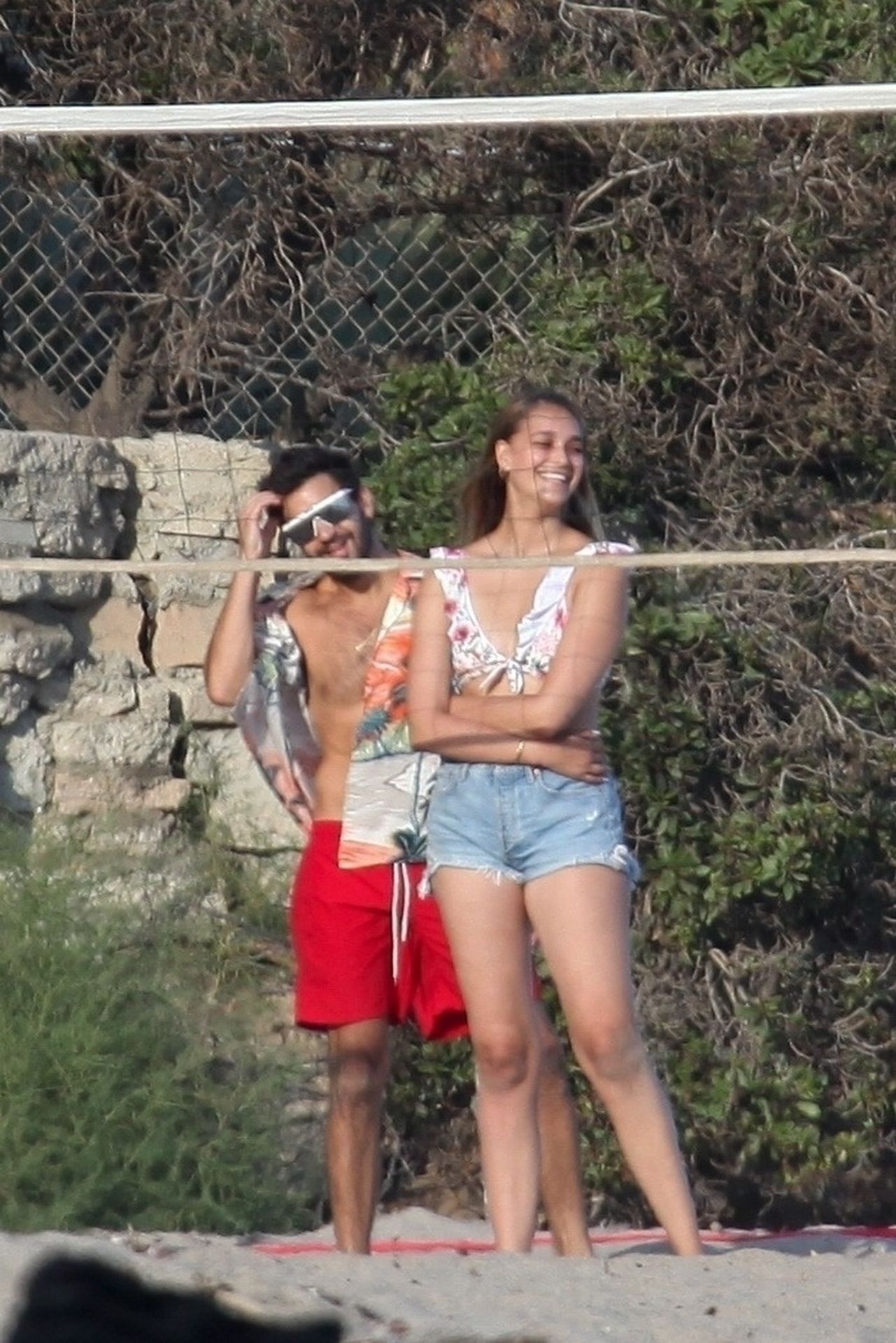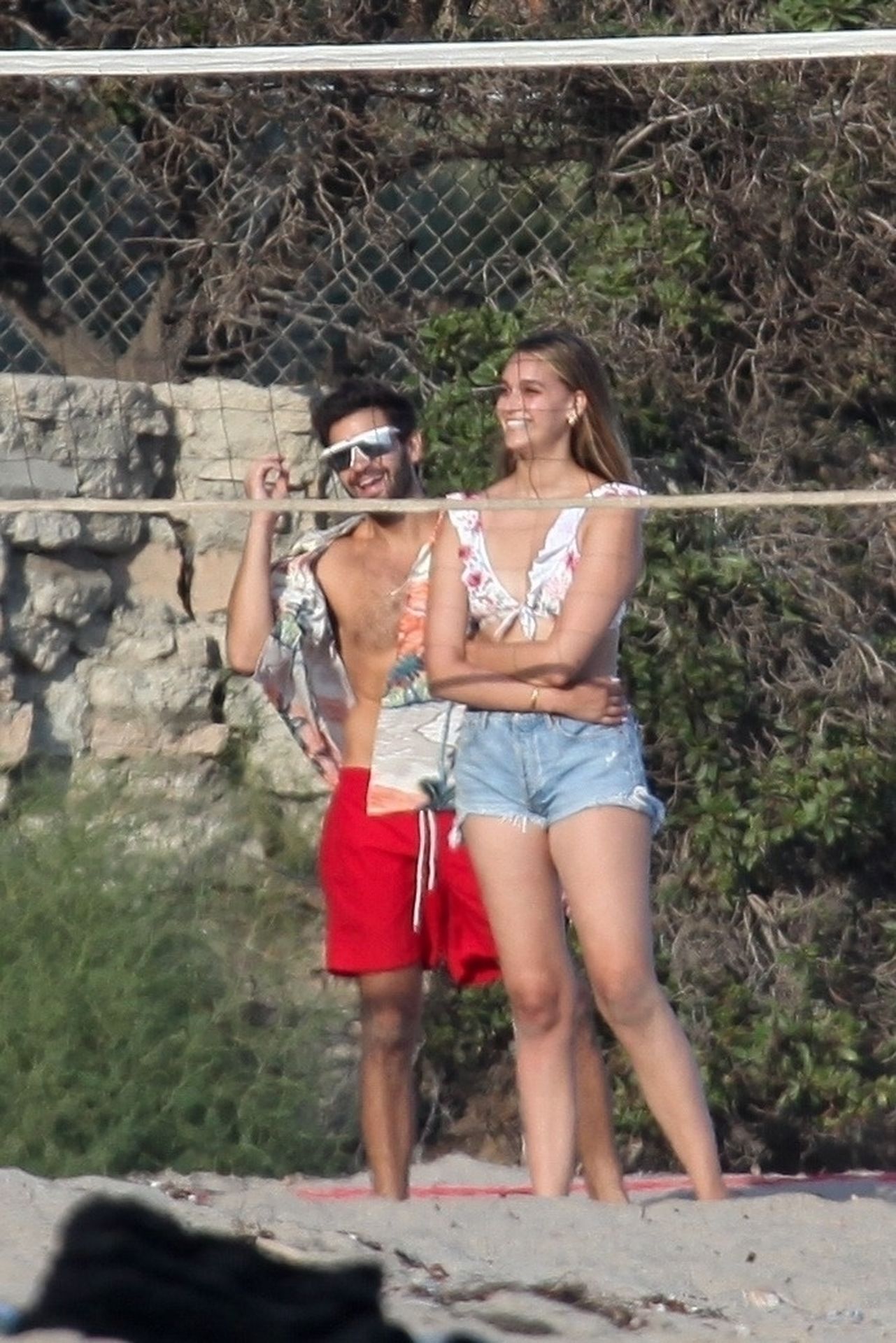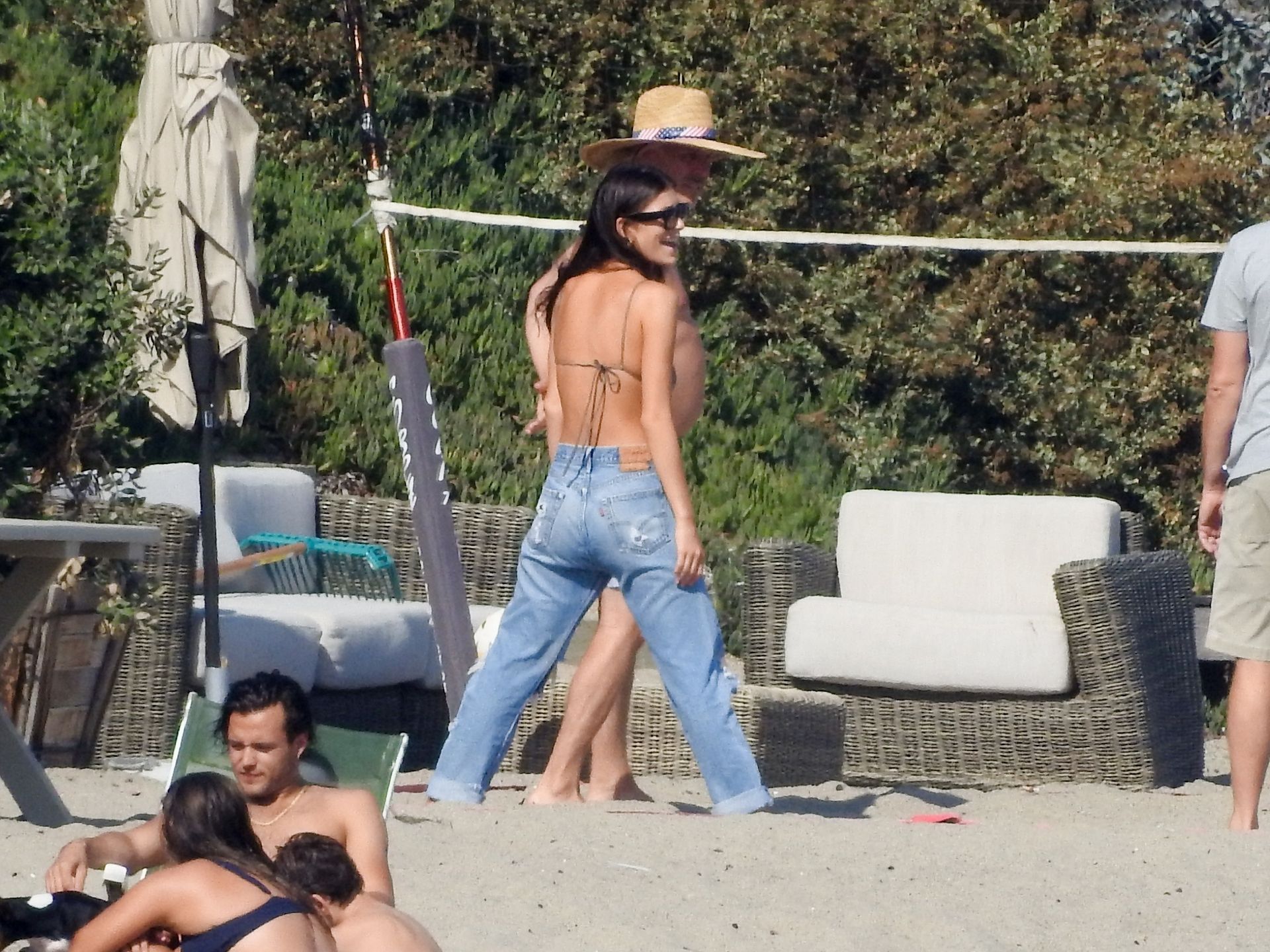 Leonardo DiCaprio, Camila Morrone, April Love Geary and Lukas Haas play volleyball on the beach in Malibu, 09/01/2019. Camila wore a string bikini top for the game paired with ripped jeans.