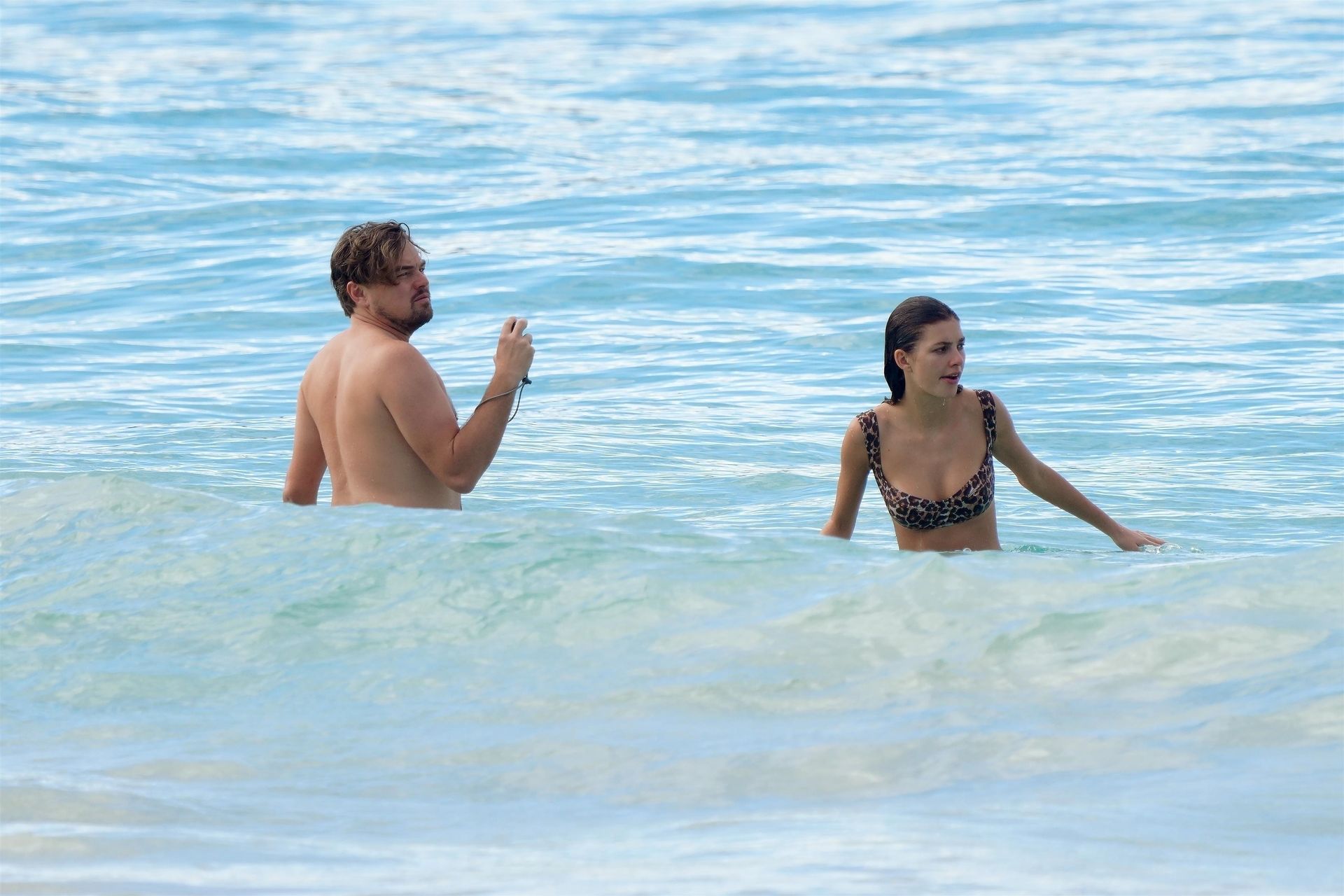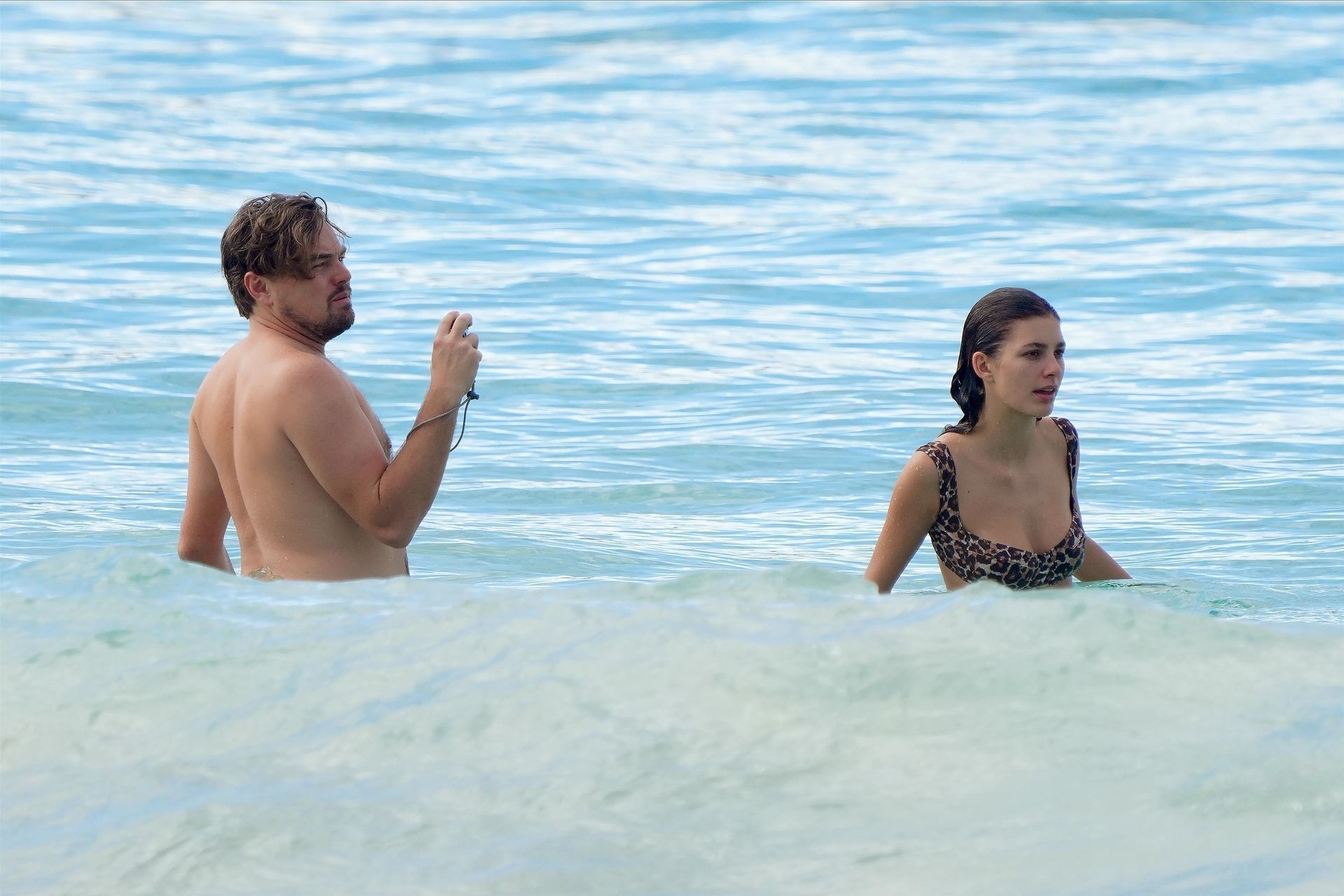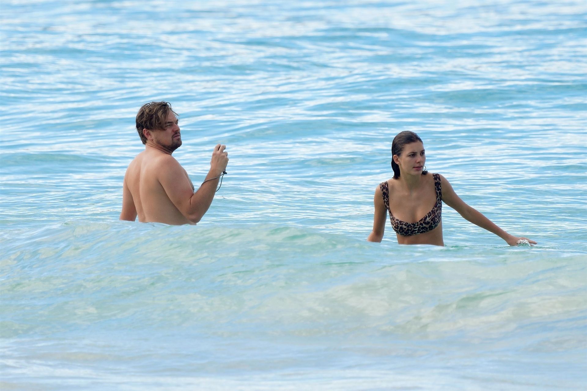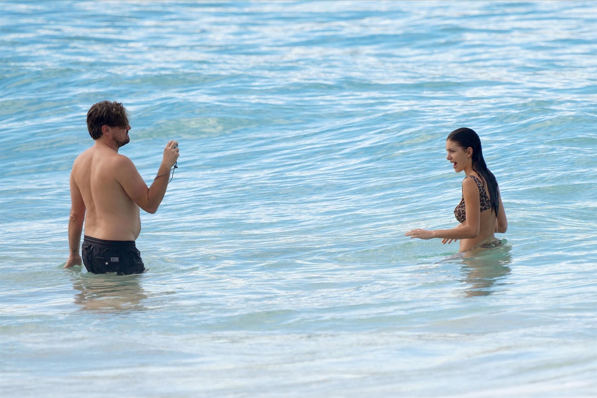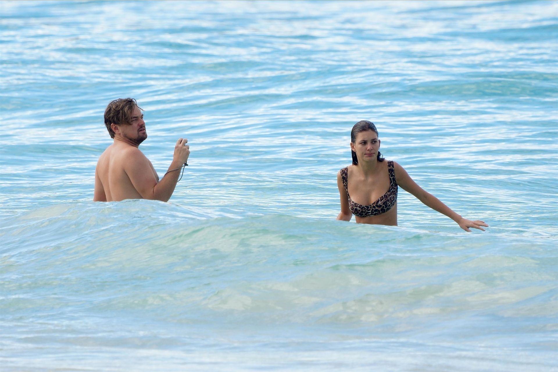 Leonardo Dicaprio and his girlfriend Camila Morrone enjoy a playful swim in the sea during NYE getaway in St. Barths, 12/31/2019.