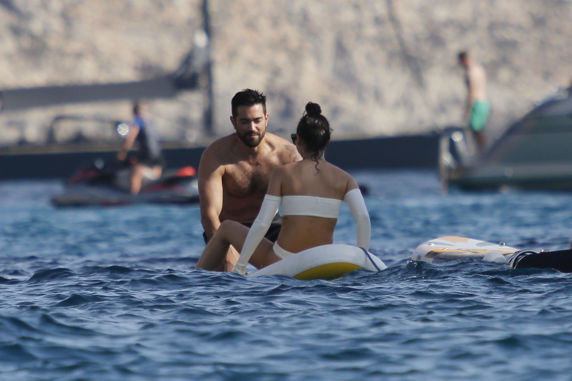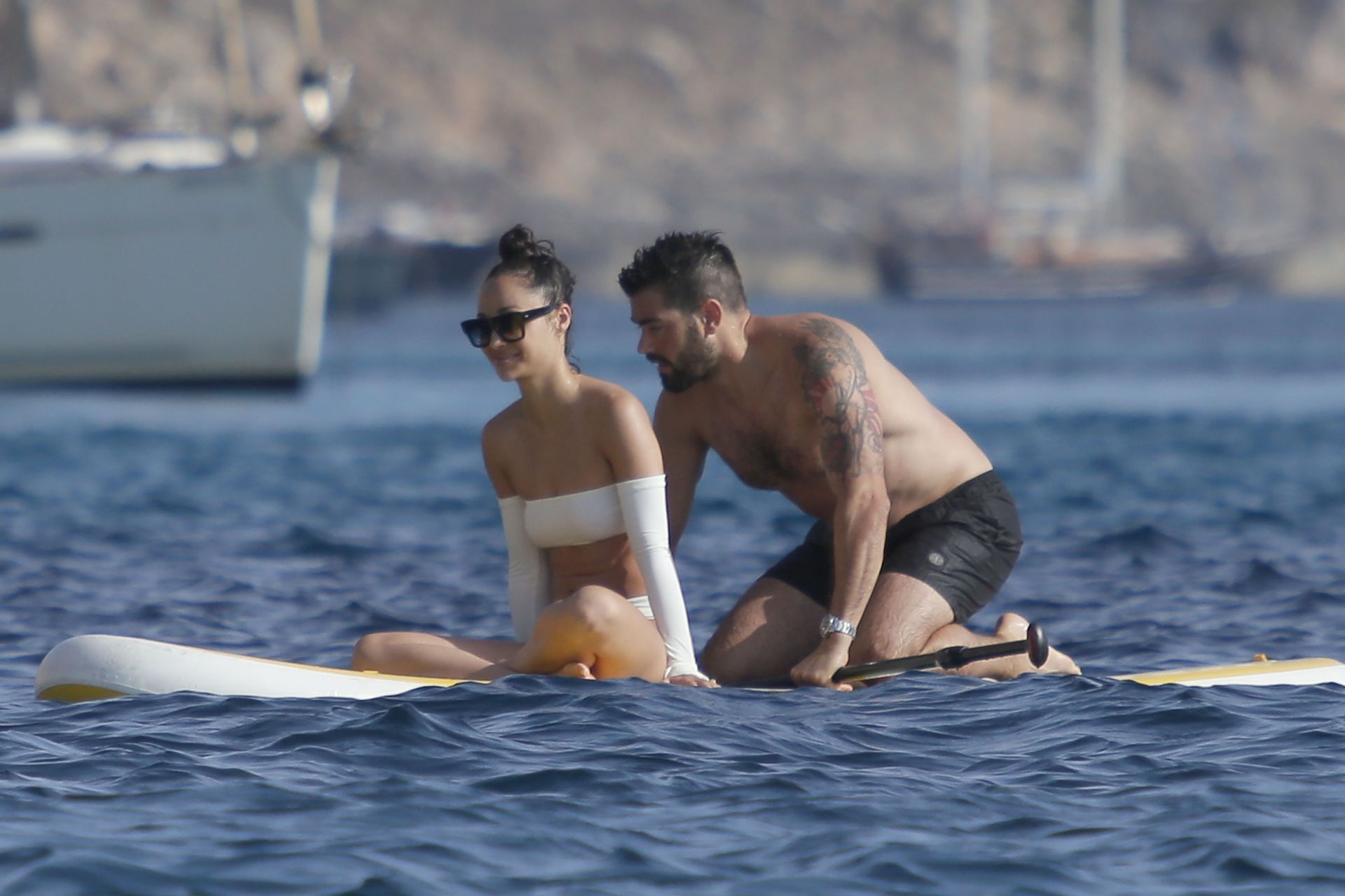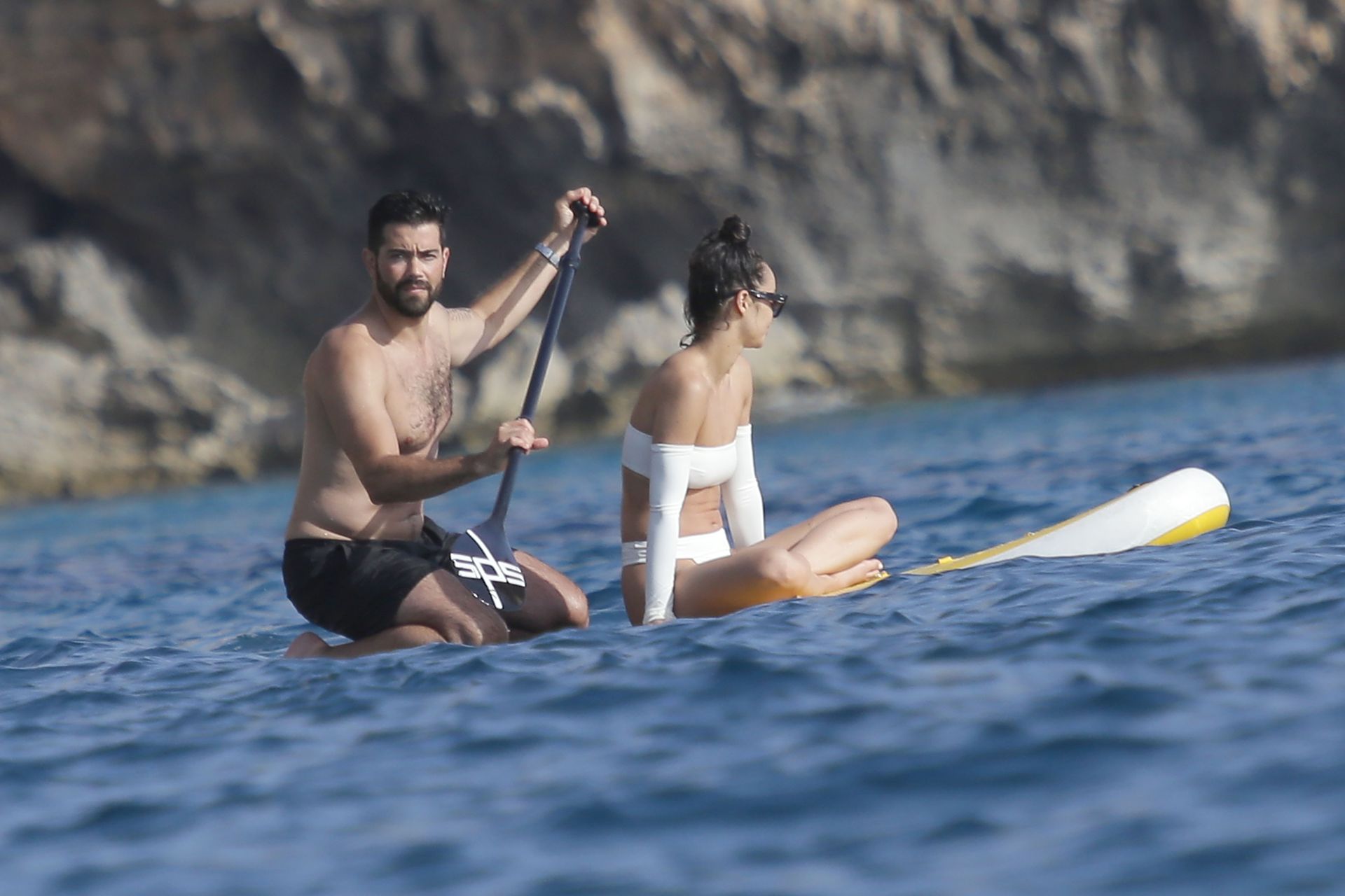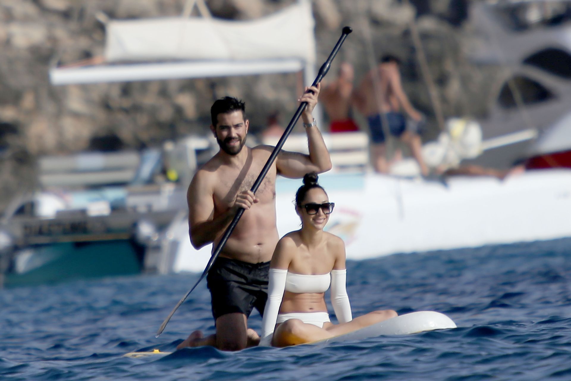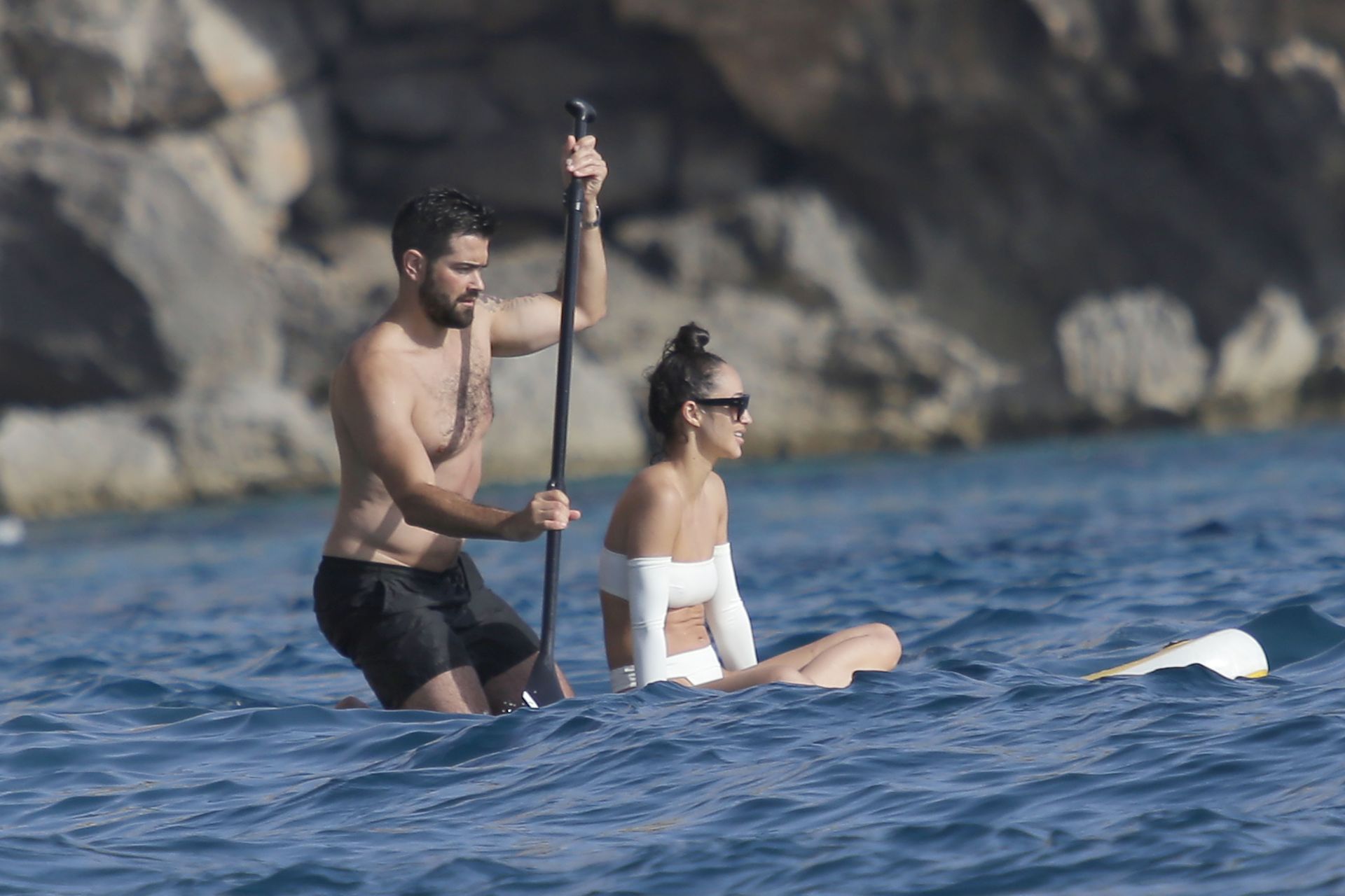 Movie actress Cara Santana and Jesse Metcalfe go paddle-boarding together at the end of a long and relaxed beach day in Formentera, Spain, 07/21/2019.