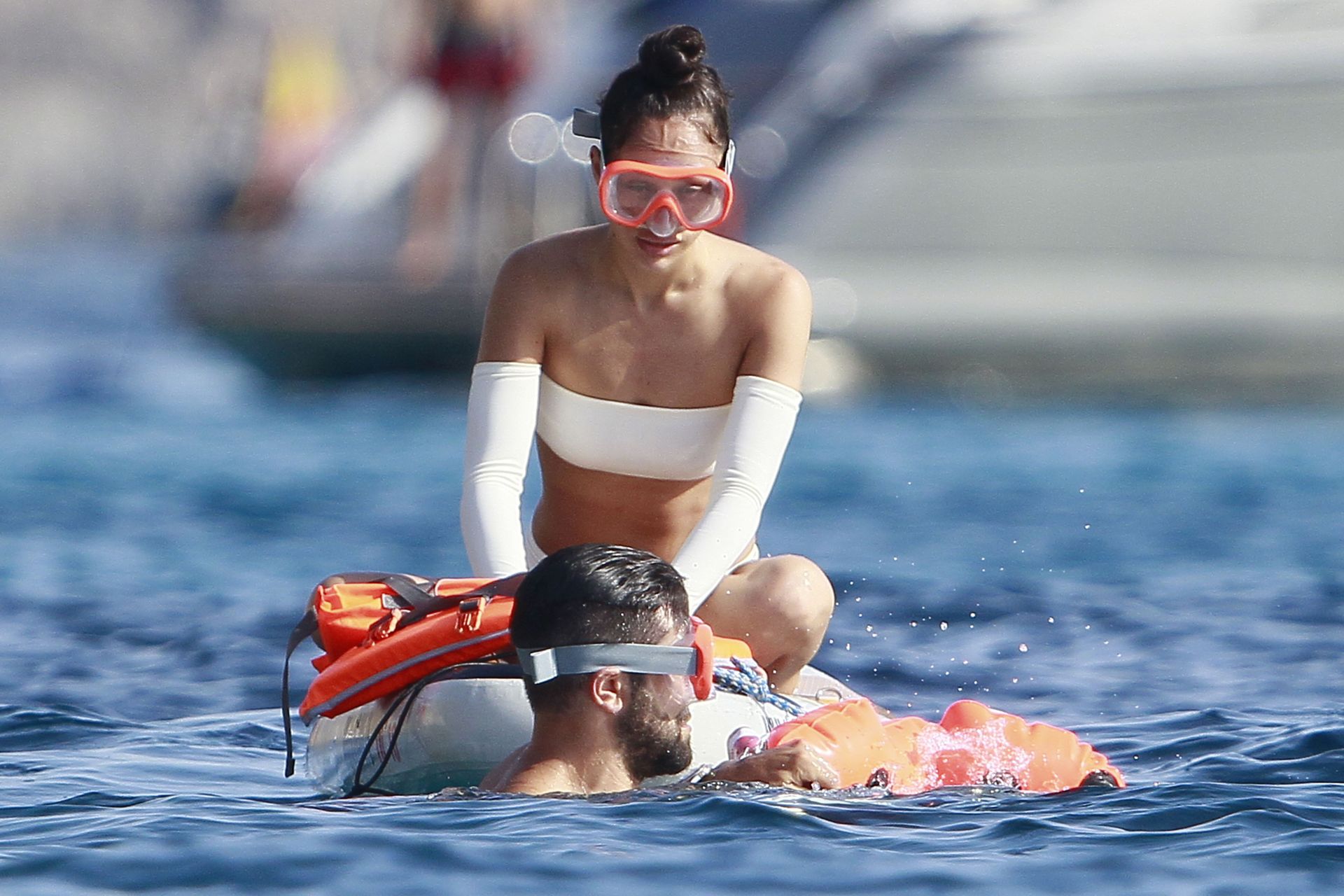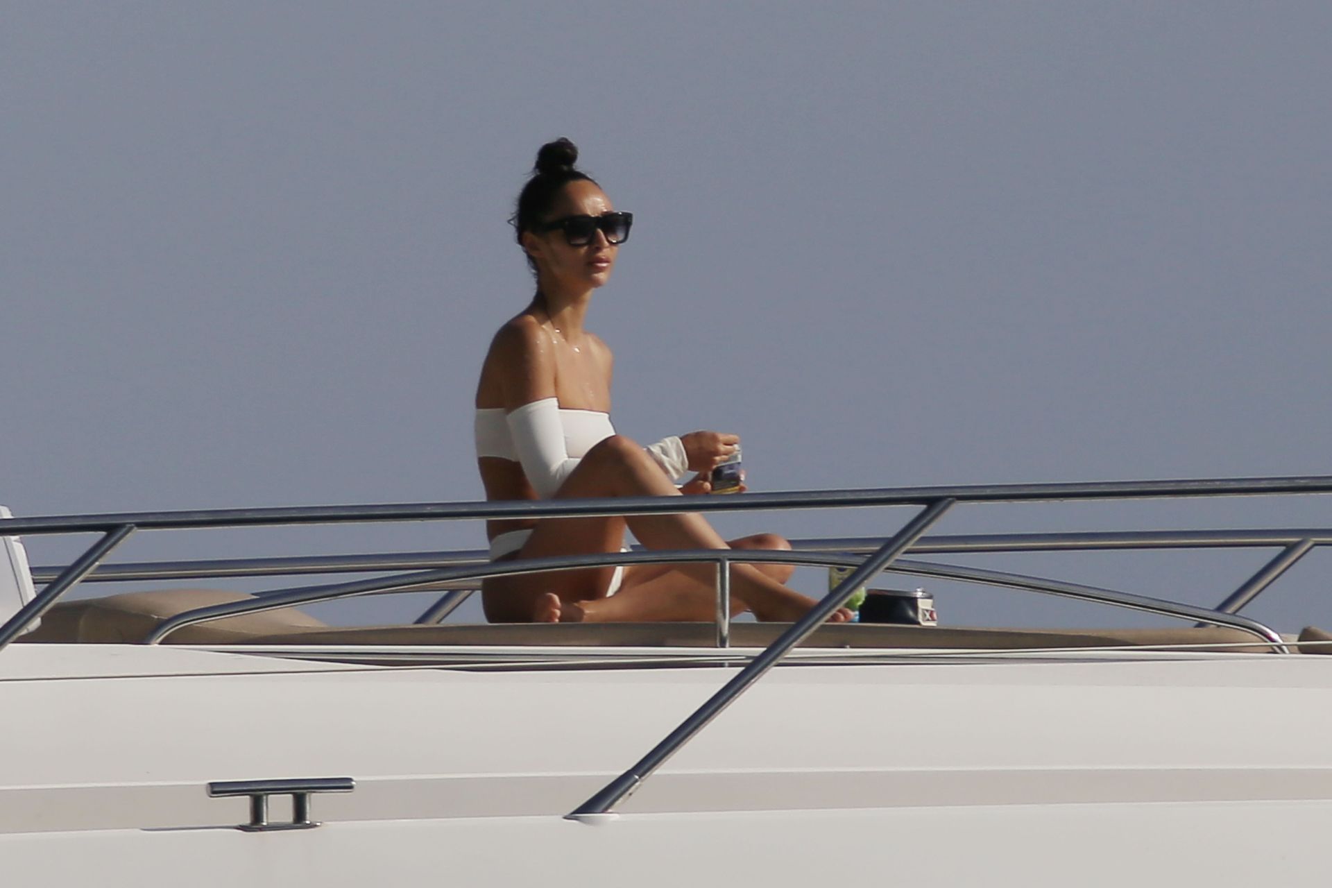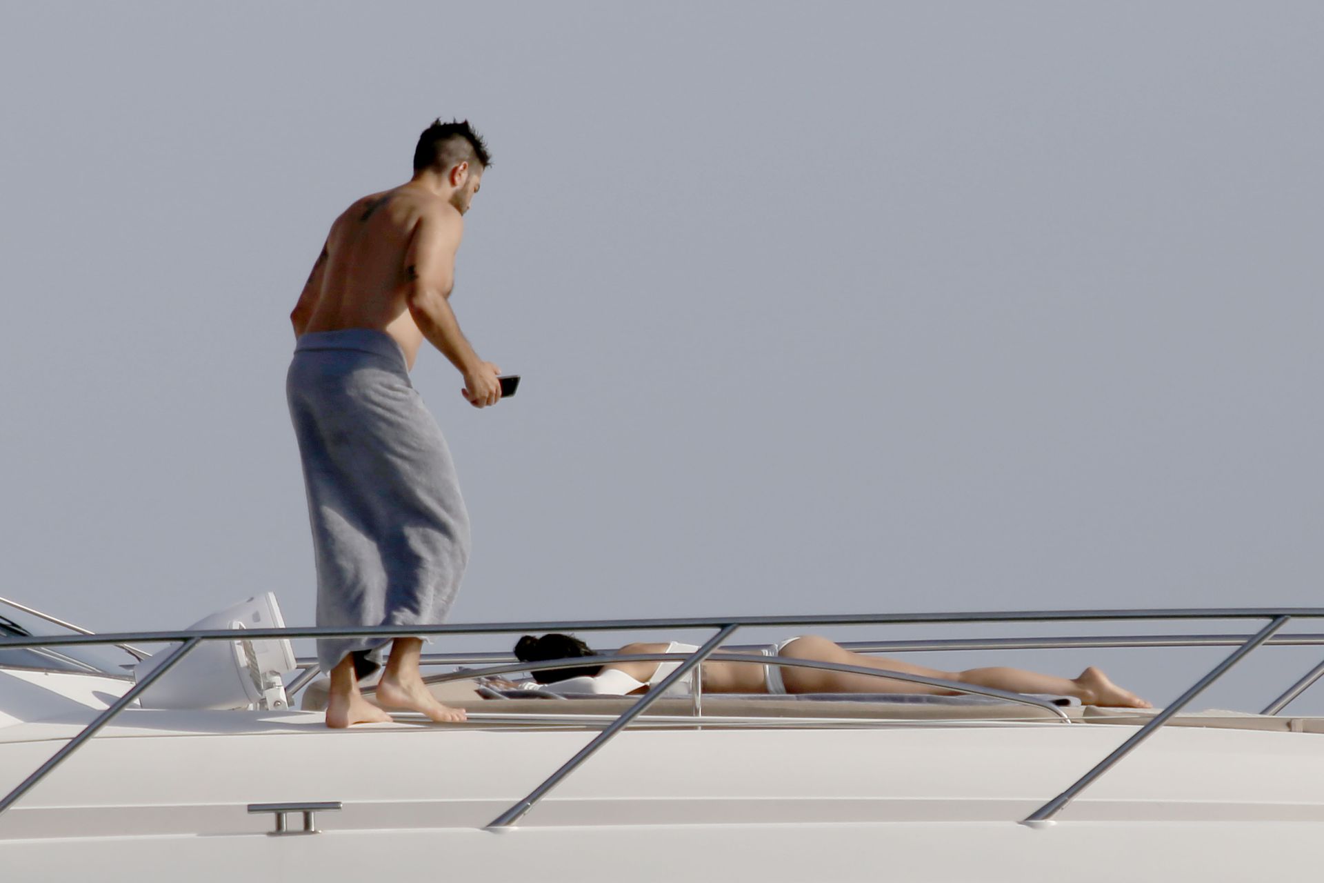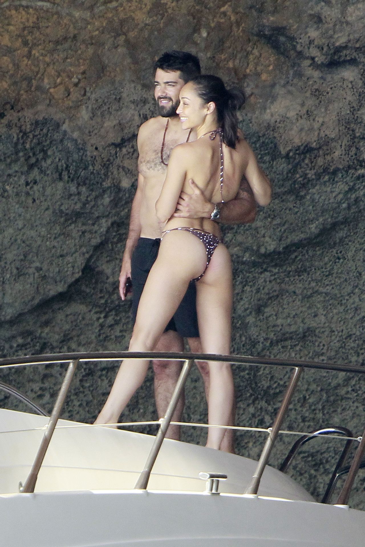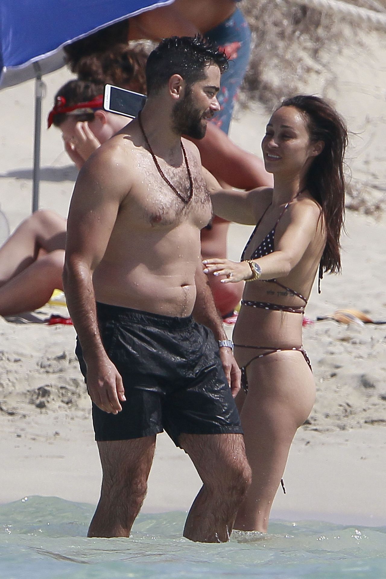 Movie actress Cara Santana and Jesse Metcalfe go paddle-boarding together at the end of a long and relaxed beach day in Formentera, Spain, 07/21/2019.