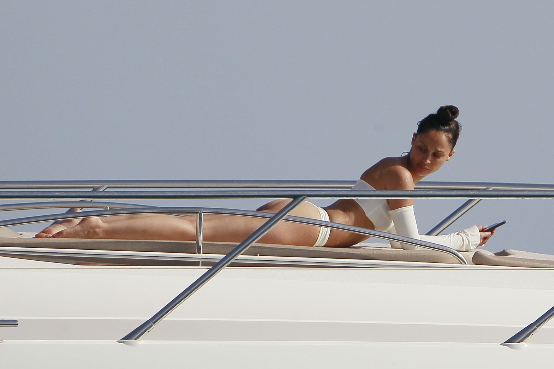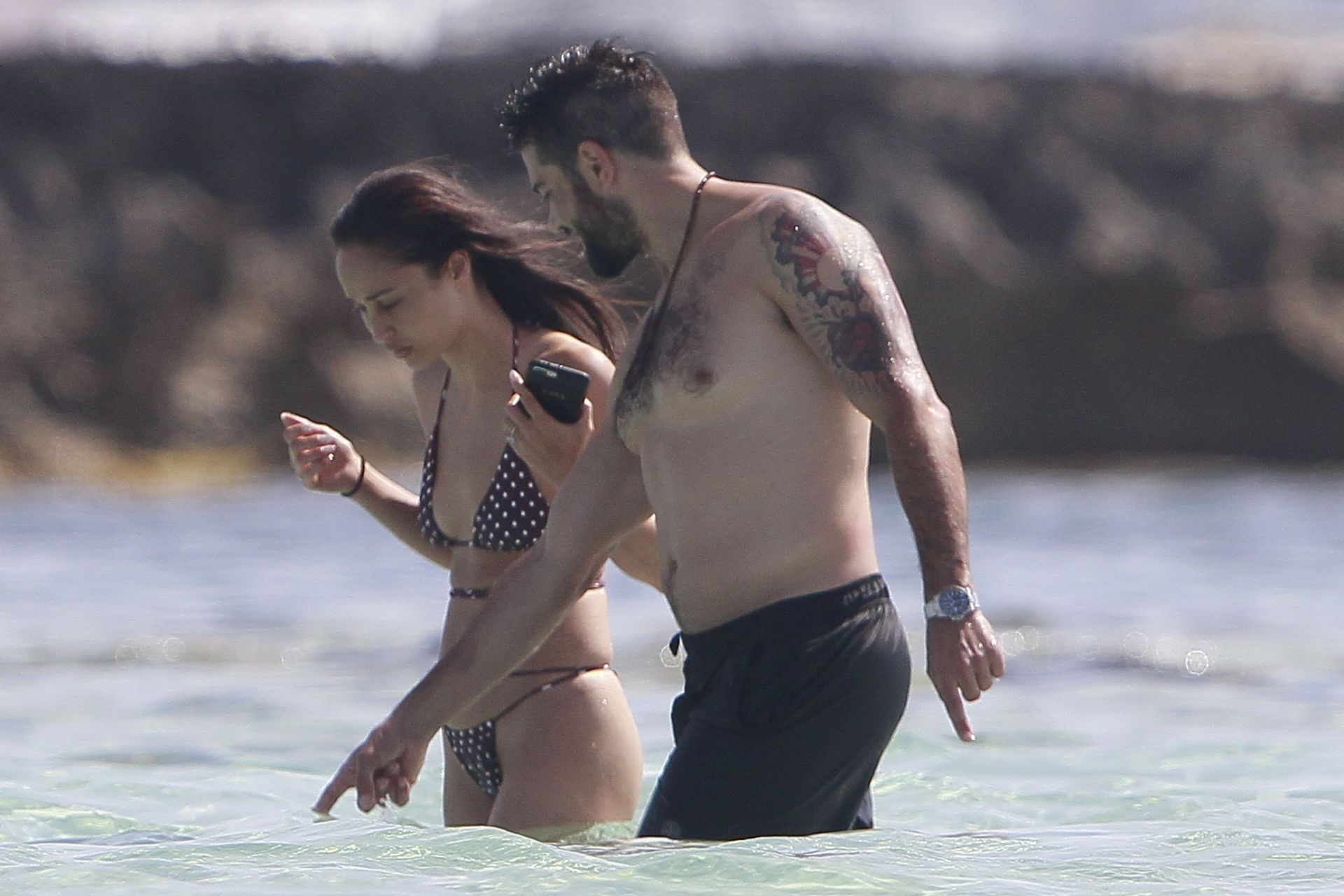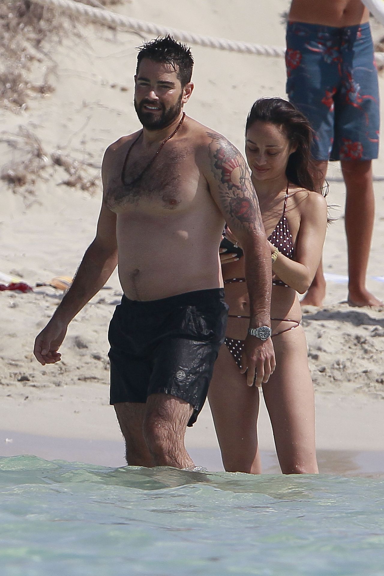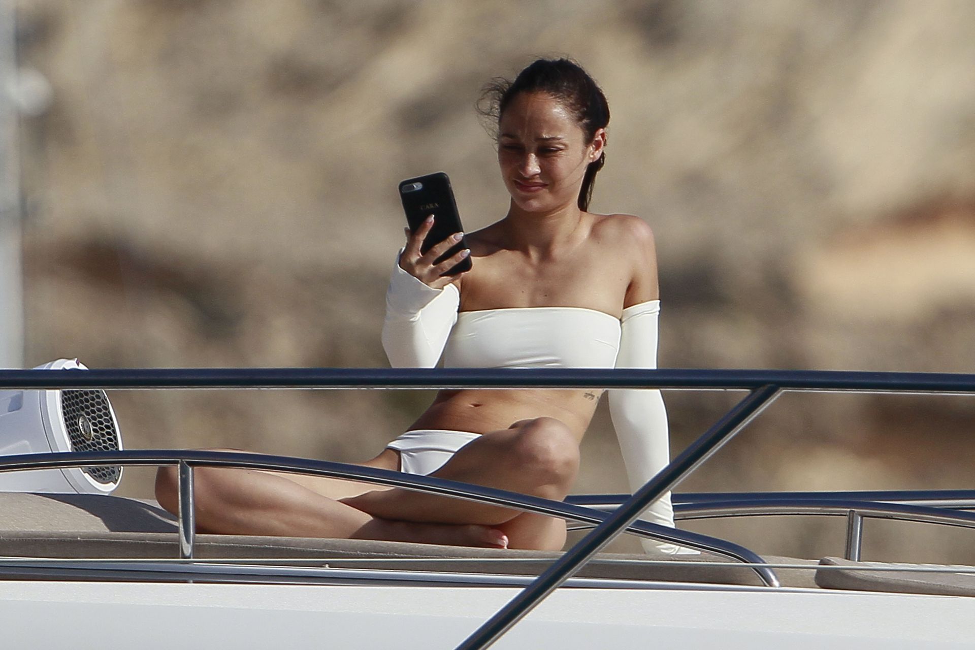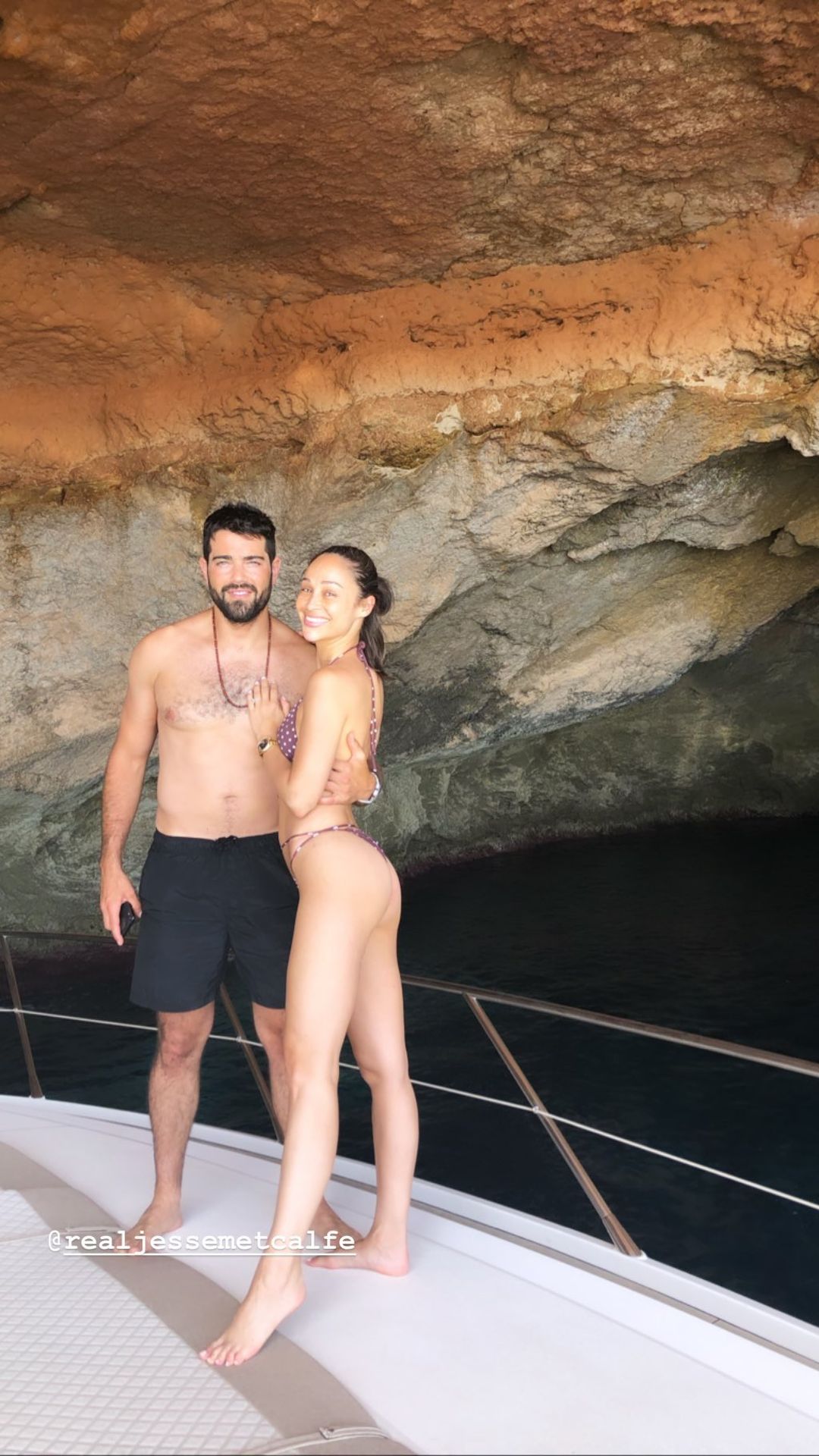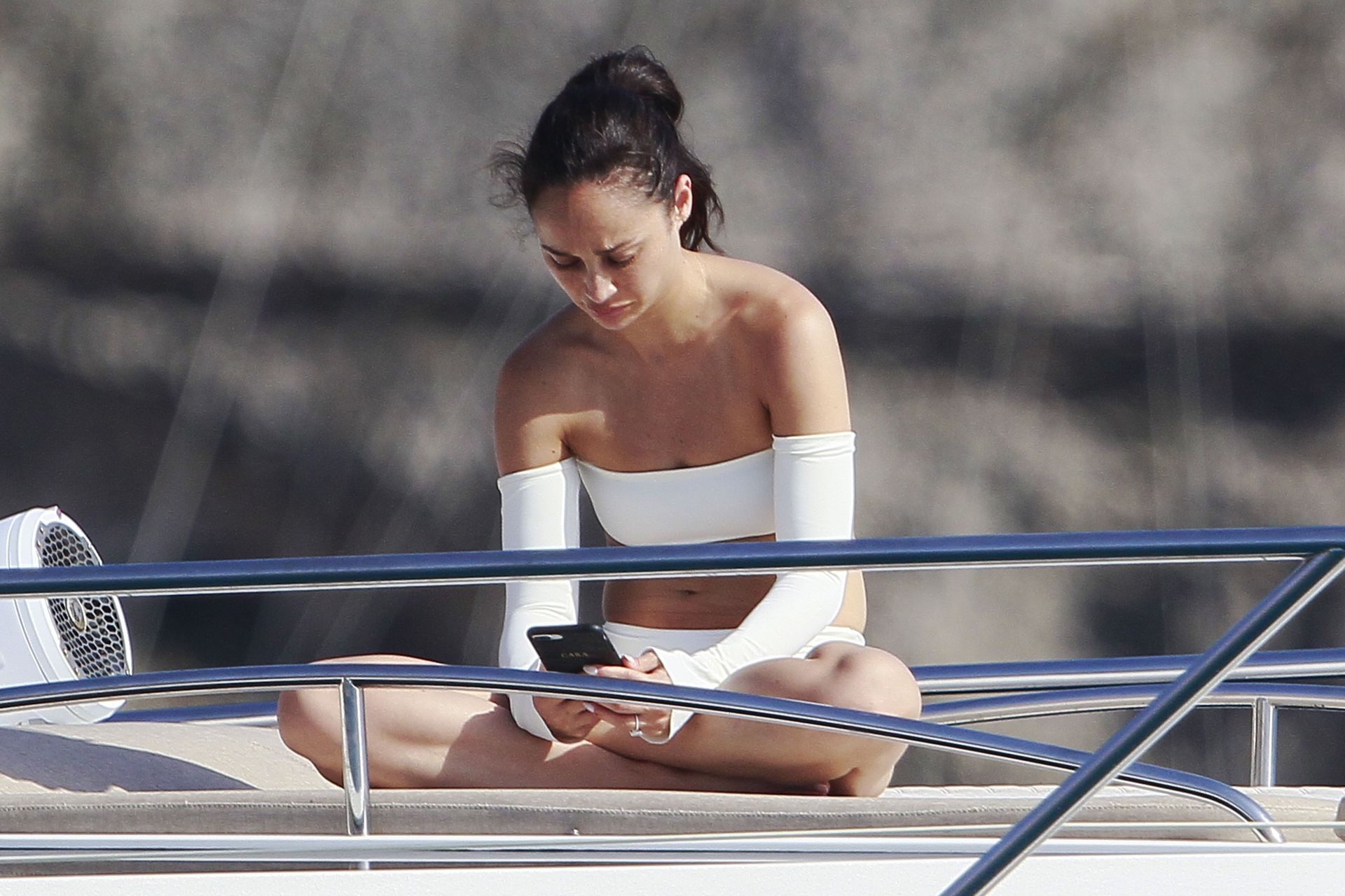 Movie actress Cara Santana and Jesse Metcalfe go paddle-boarding together at the end of a long and relaxed beach day in Formentera, Spain, 07/21/2019.